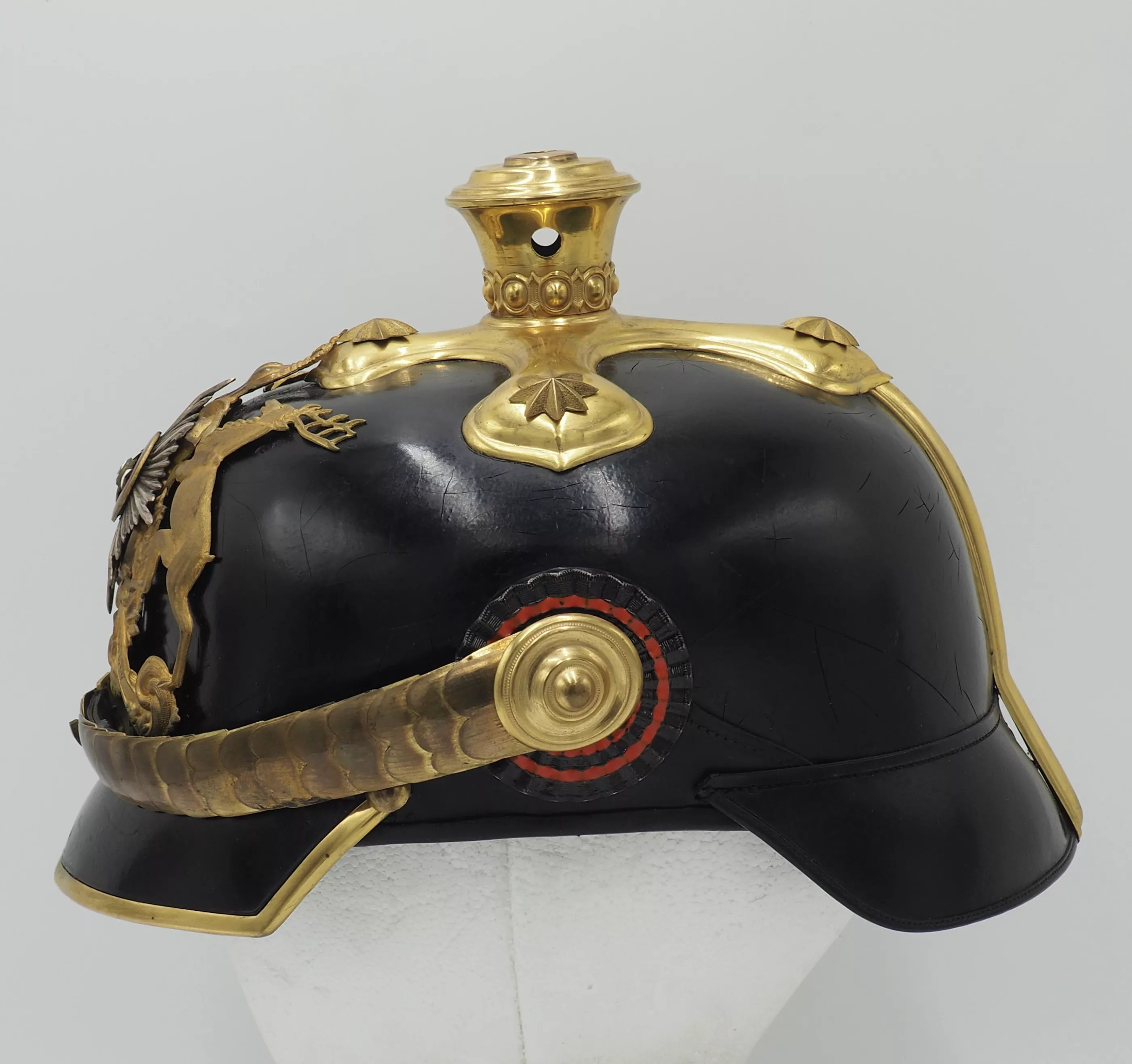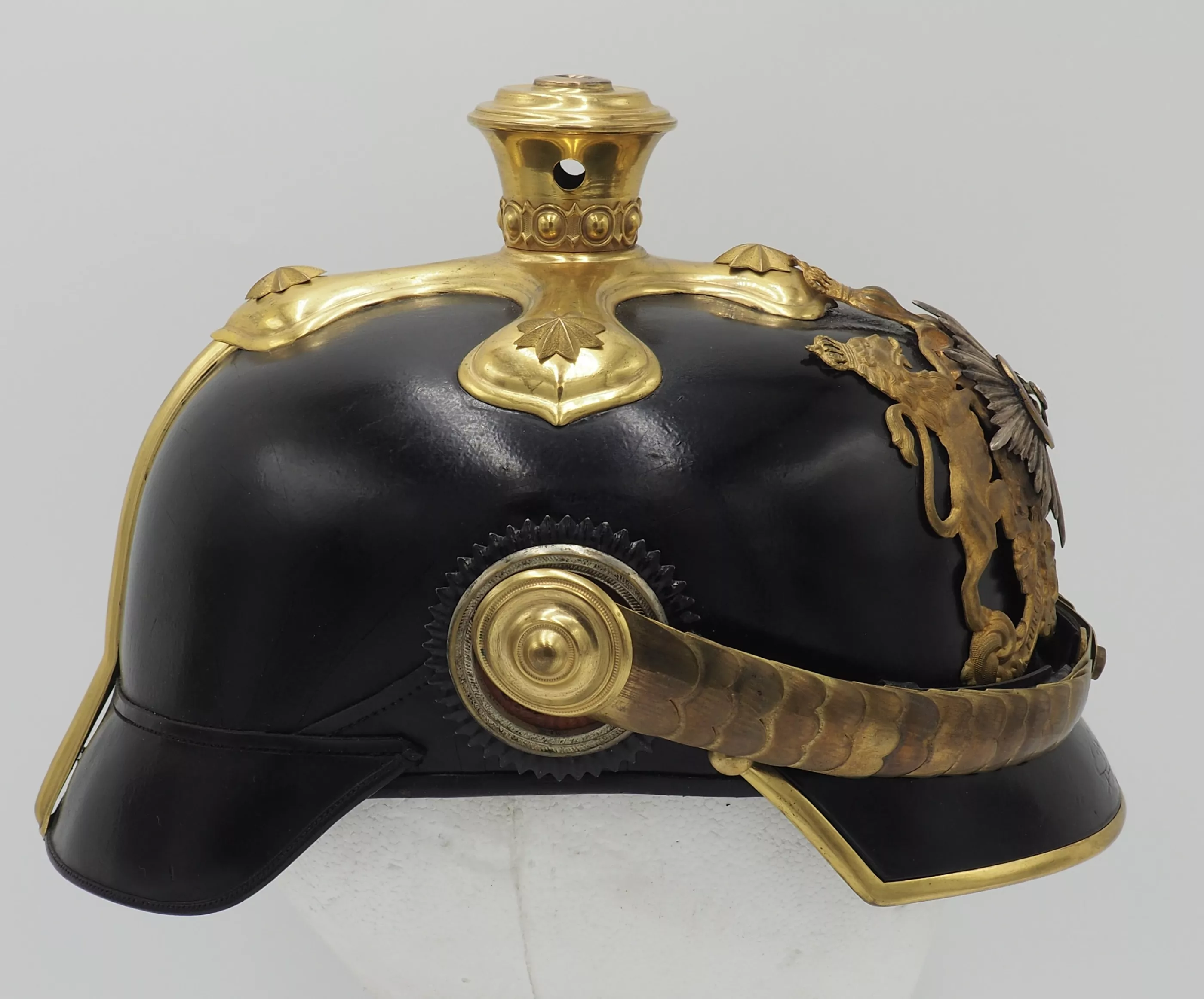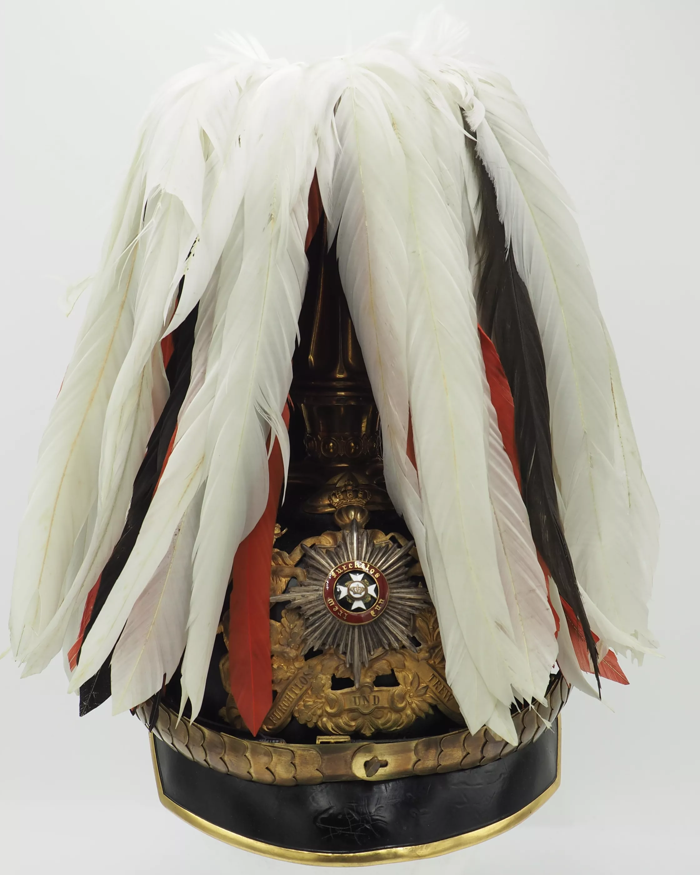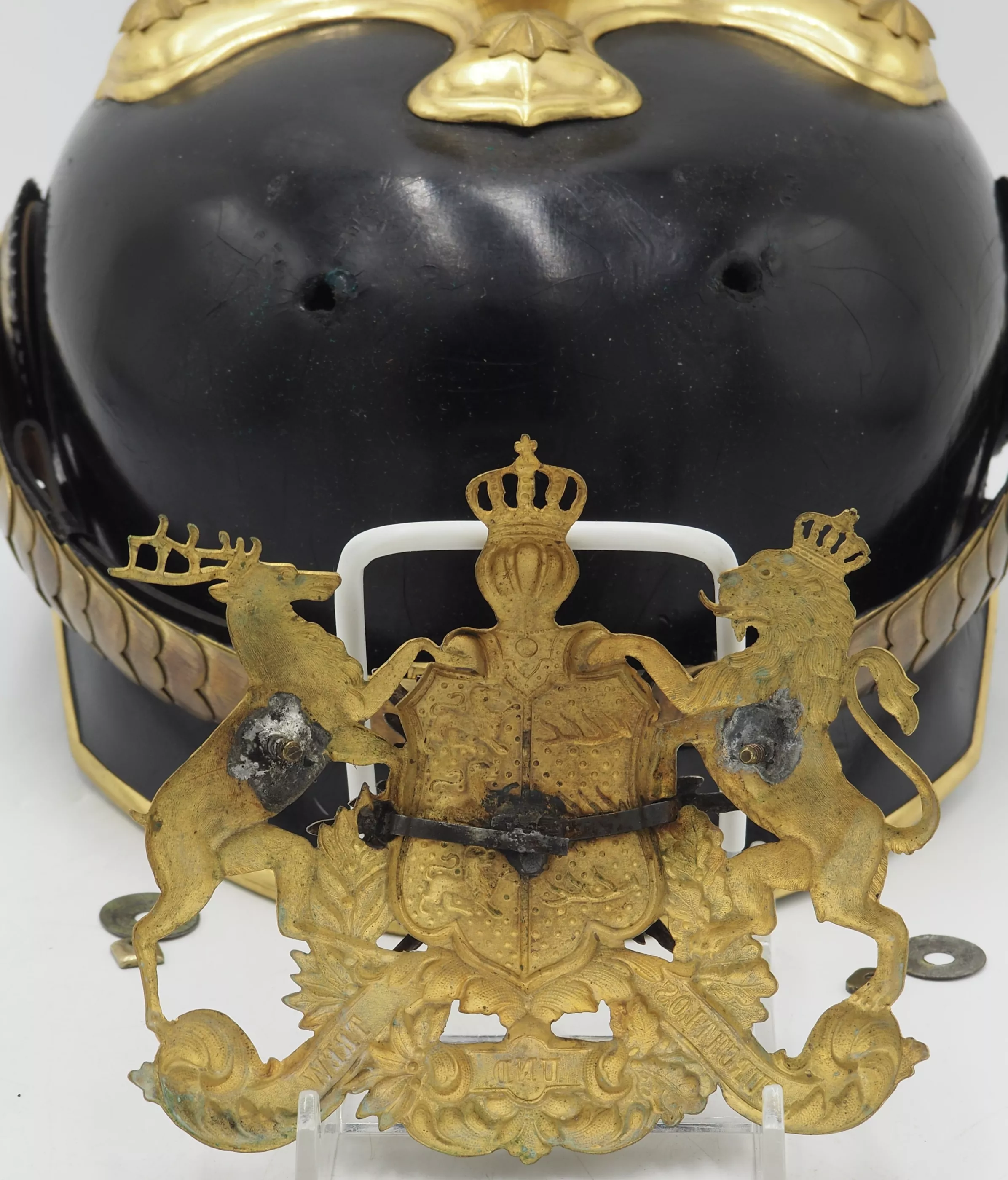 Wurttemberg General Officer helmet Model 1897 with feathered parade bush. Beautiful black lacquered leather helmet body with highly gilded brass trim. The helmet body has excellent form and firm stitching. Exterior lacquer in near Mint condition. The interior of the helmet has officer sweat leather and silk headliner that is in very good to excellent condition. No extra holes in the helmet body. The inner visors of helmet are red and green as is common for officers.