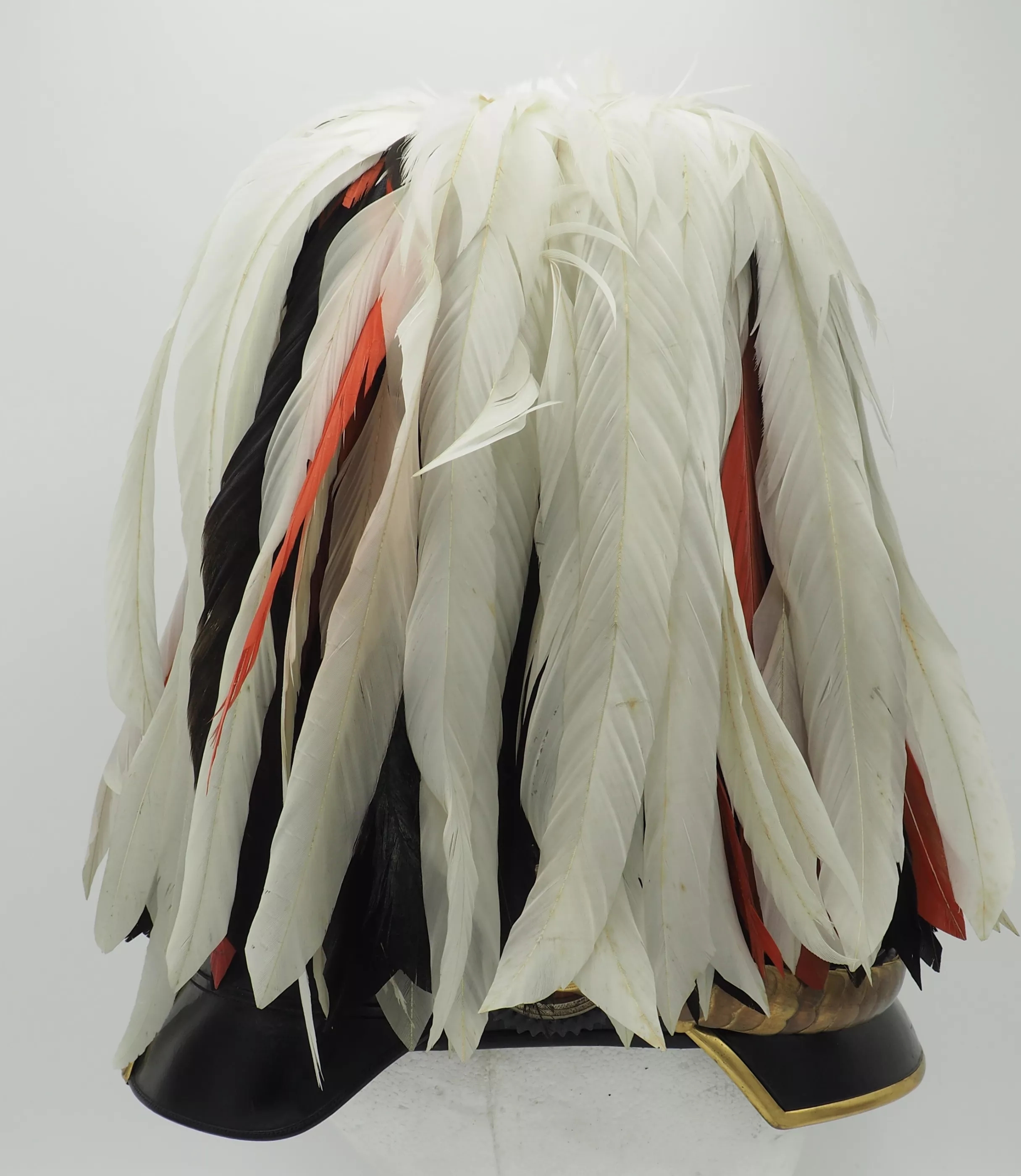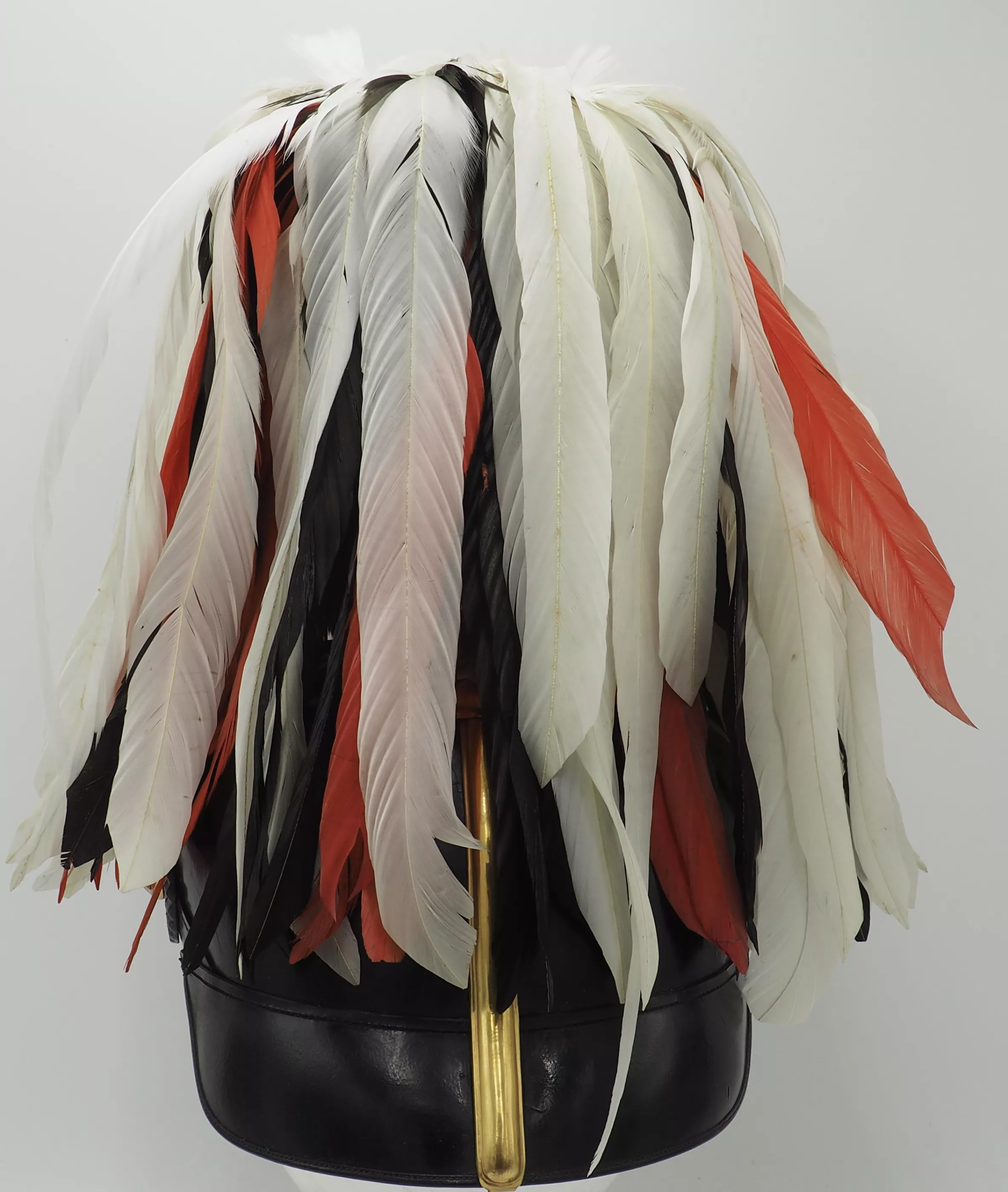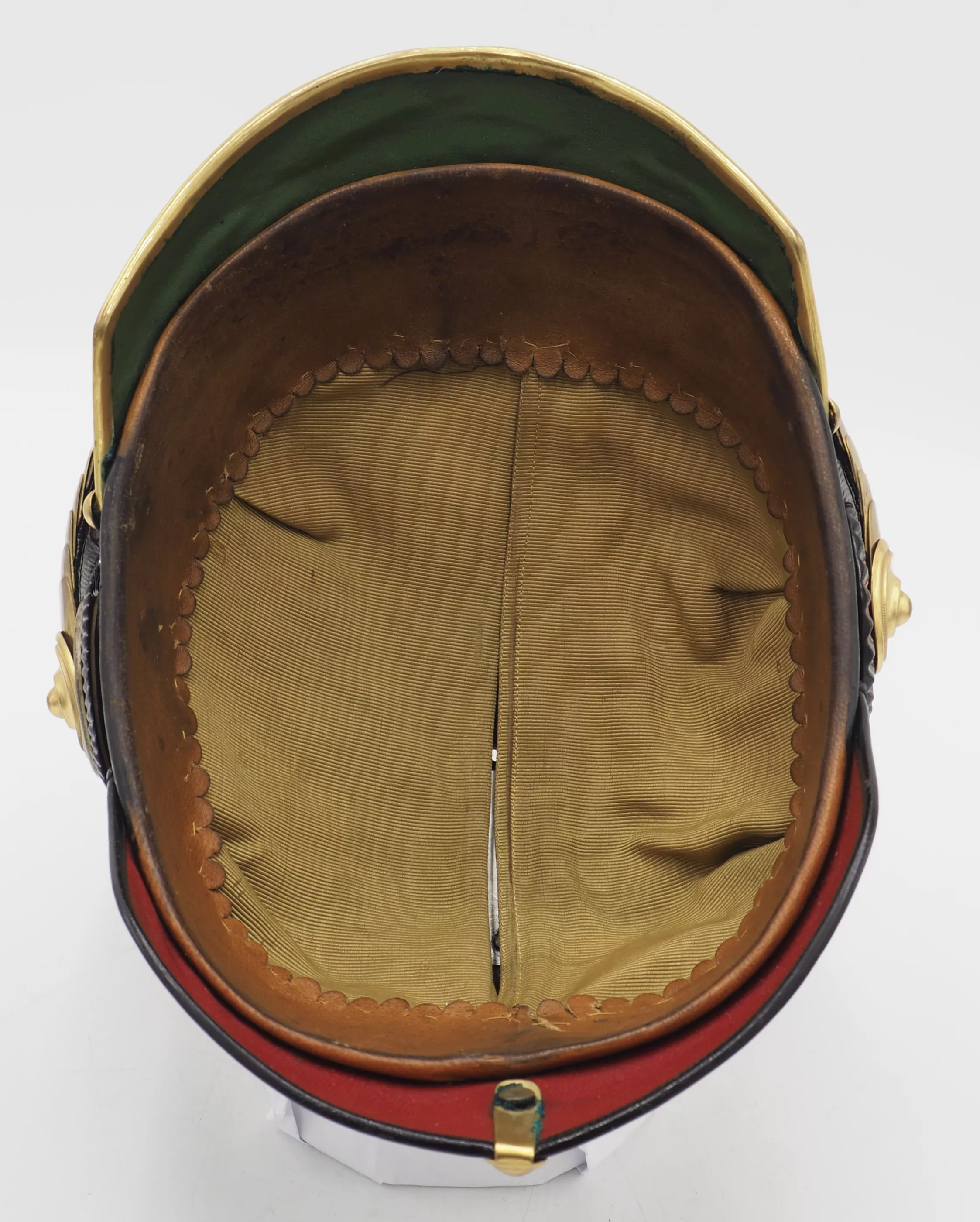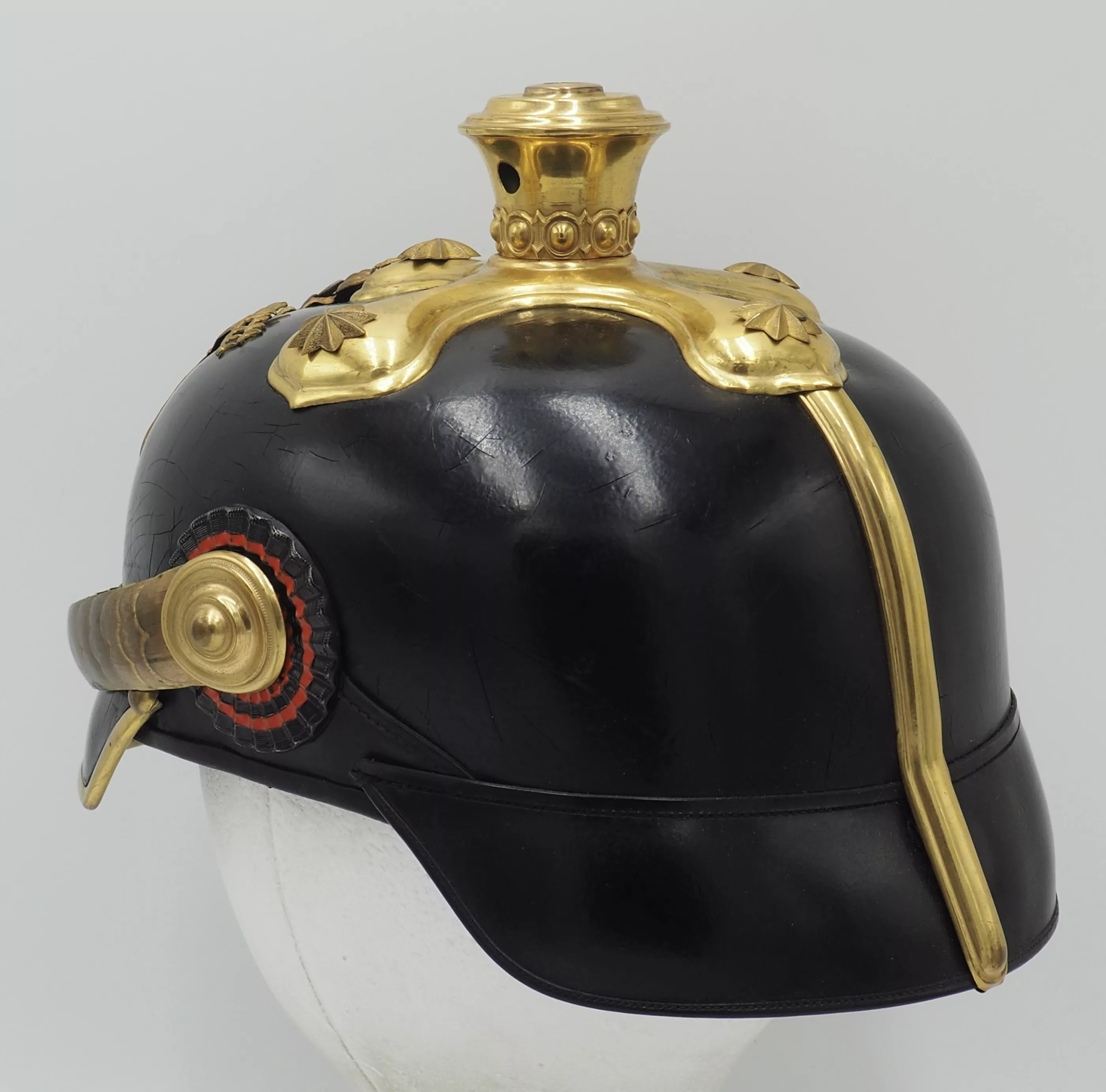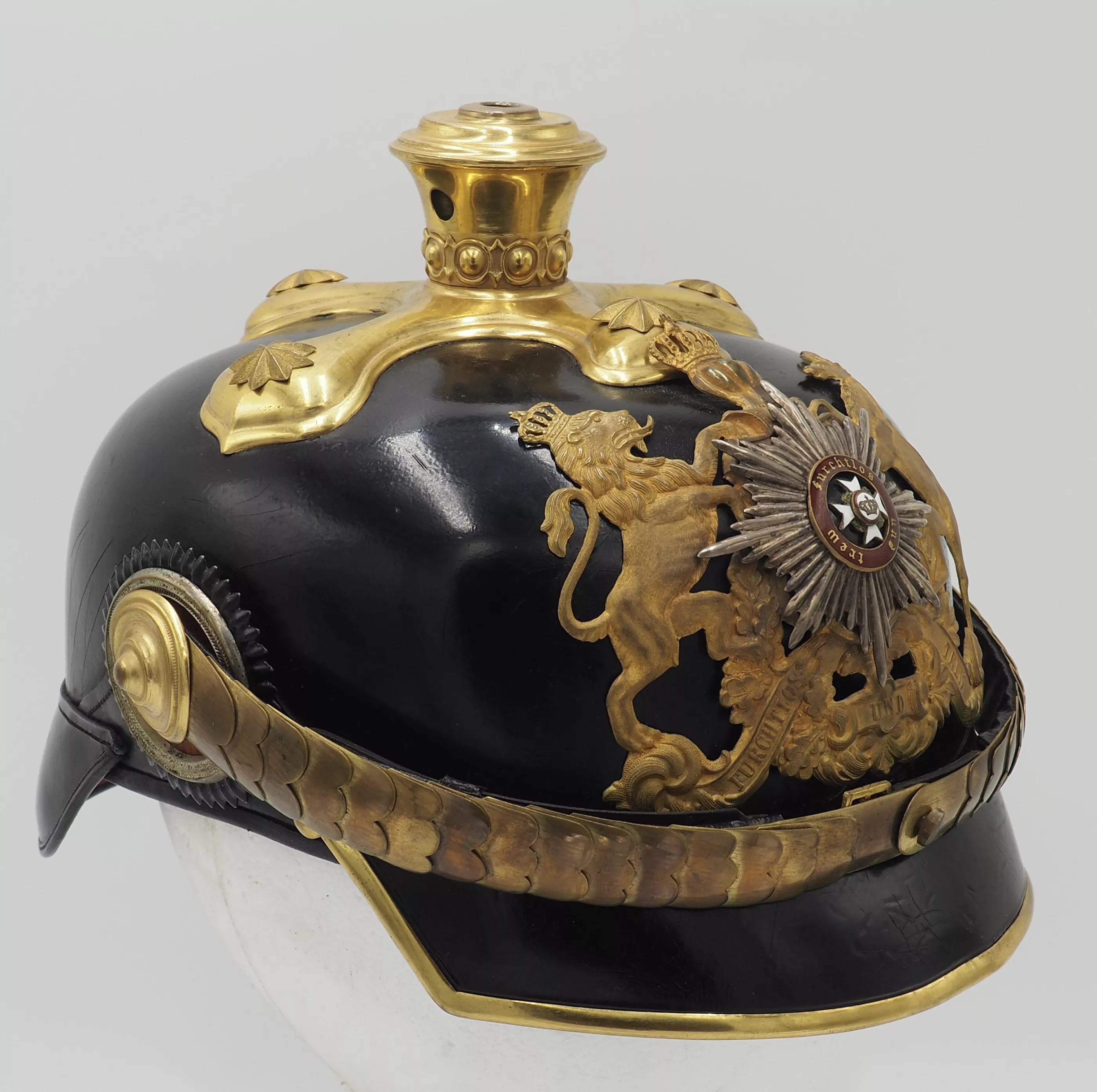 Wurttemberg General Officer helmet Model 1897 with feathered parade bush. Beautiful black lacquered leather helmet body with highly gilded brass trim. The helmet body has excellent form and firm stitching. Exterior lacquer in near Mint condition. The interior of the helmet has officer sweat leather and silk headliner that is in very good to excellent condition. No extra holes in the helmet body. The inner visors of helmet are red and green as is common for officers.
