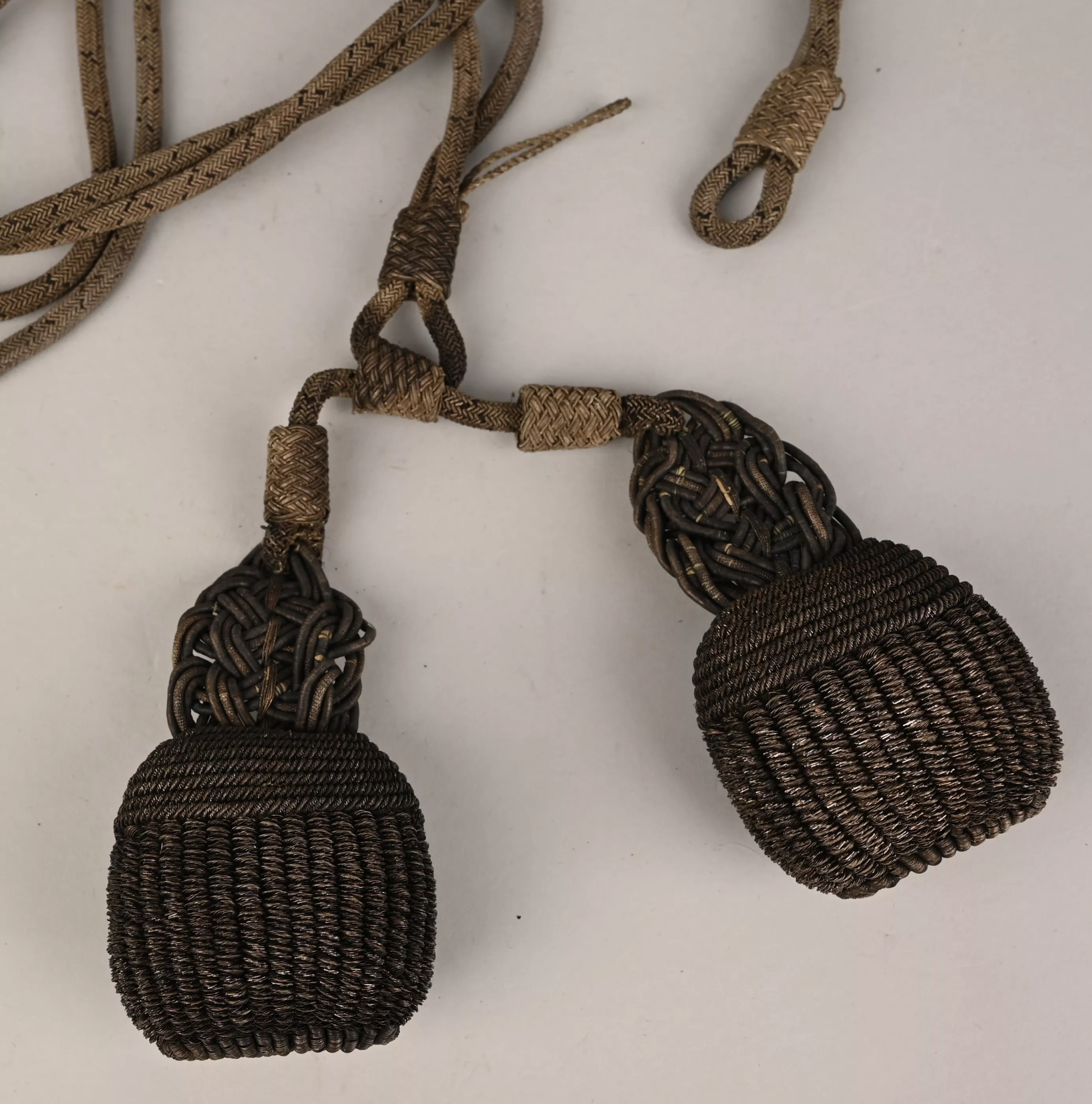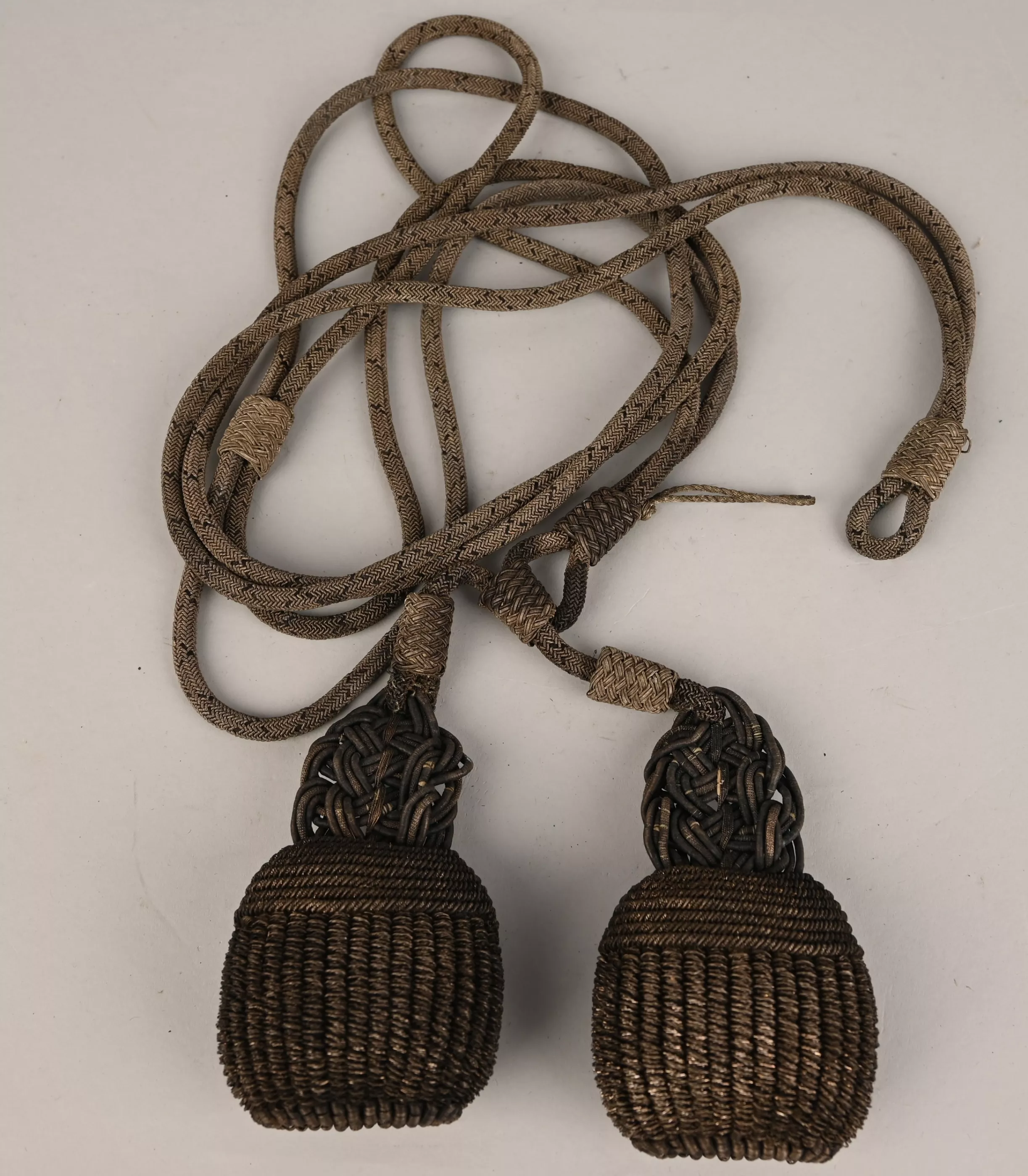 Made in Silver Bullion interlaced with the Prussian black color. The end of the cords are decorated with elaborated knots and tassels with the Prussian black colors in bullion inside the tassels. Overall condition shows some darkened tarnish to the silver but no damage or fraying.
