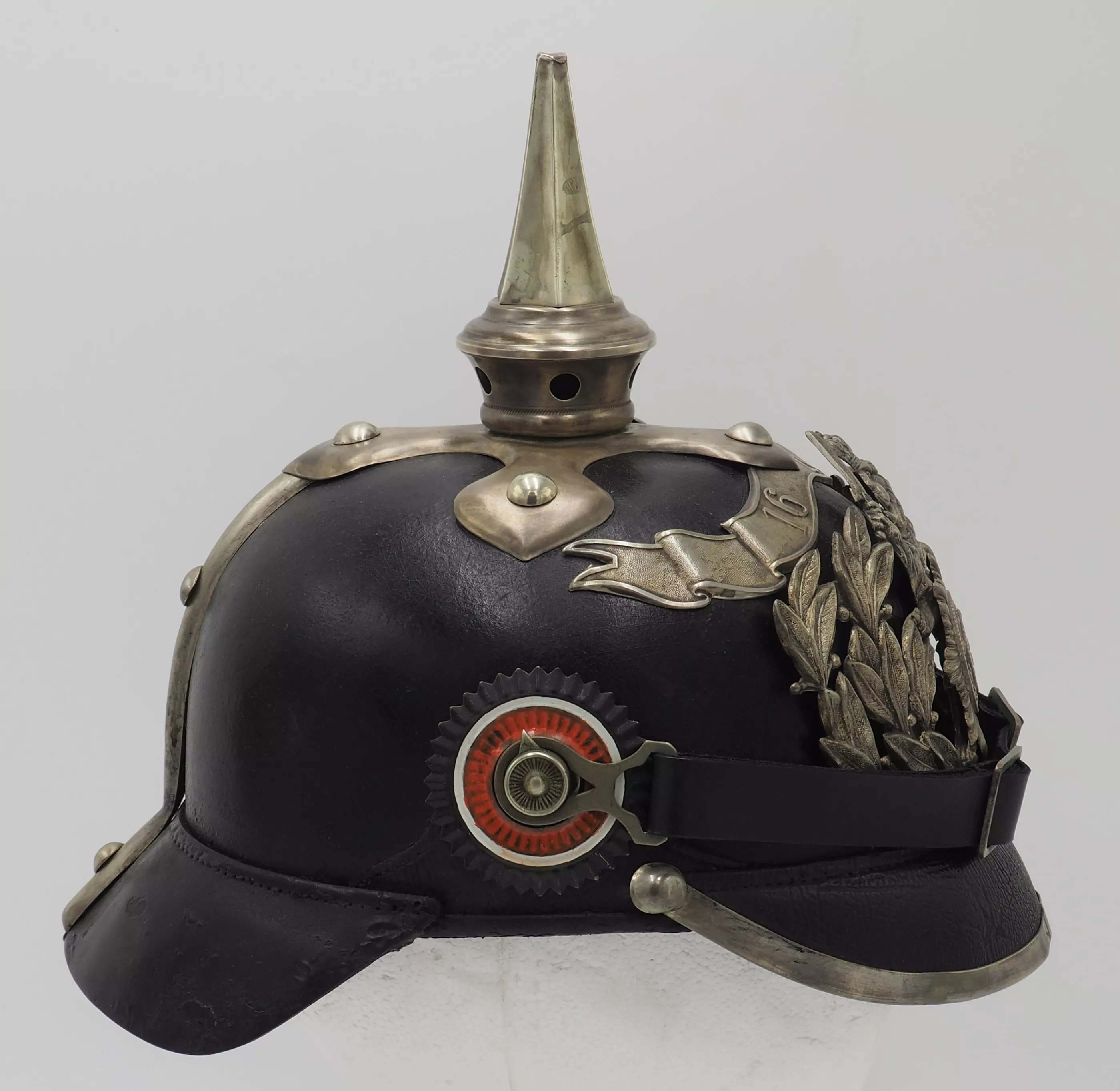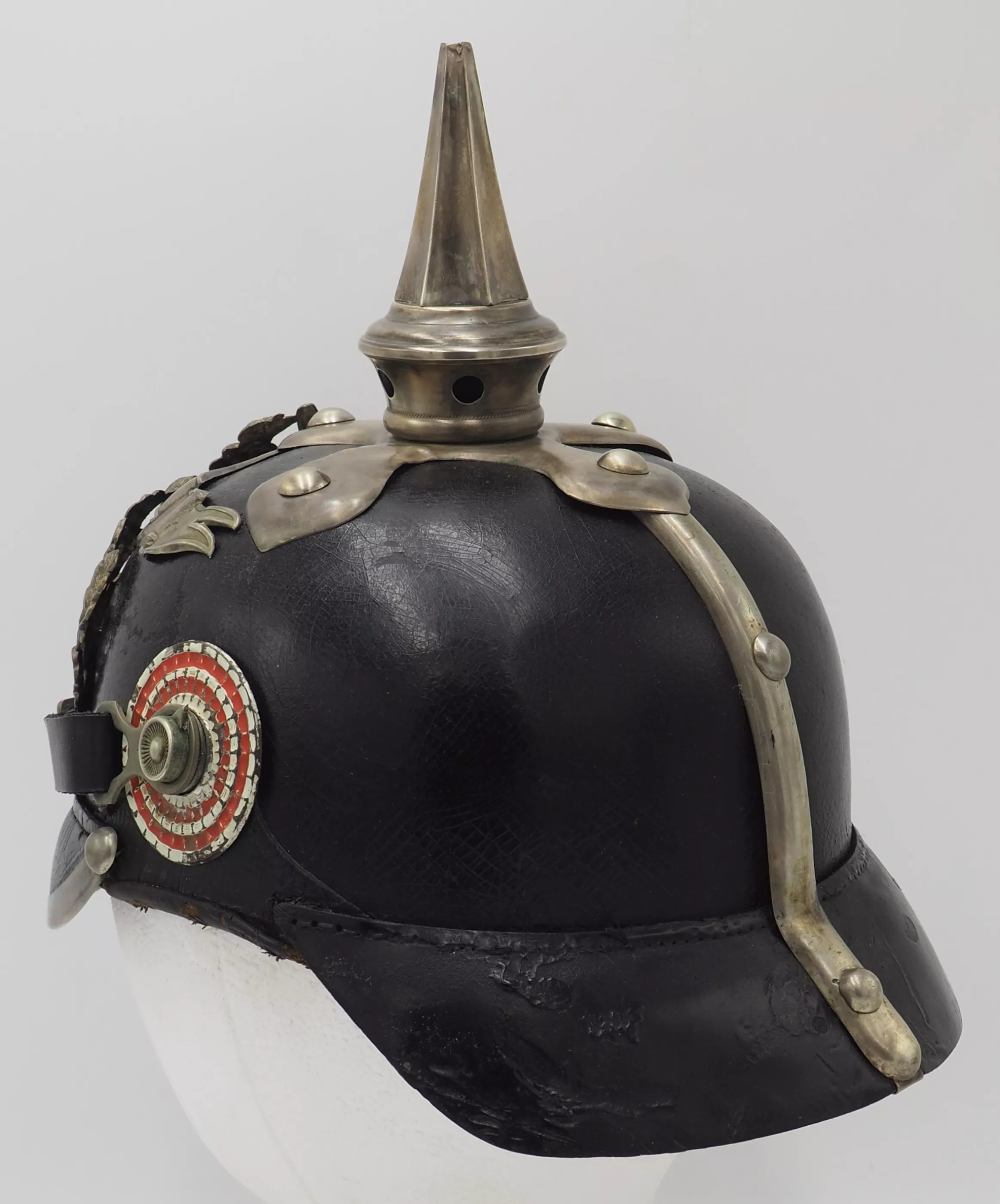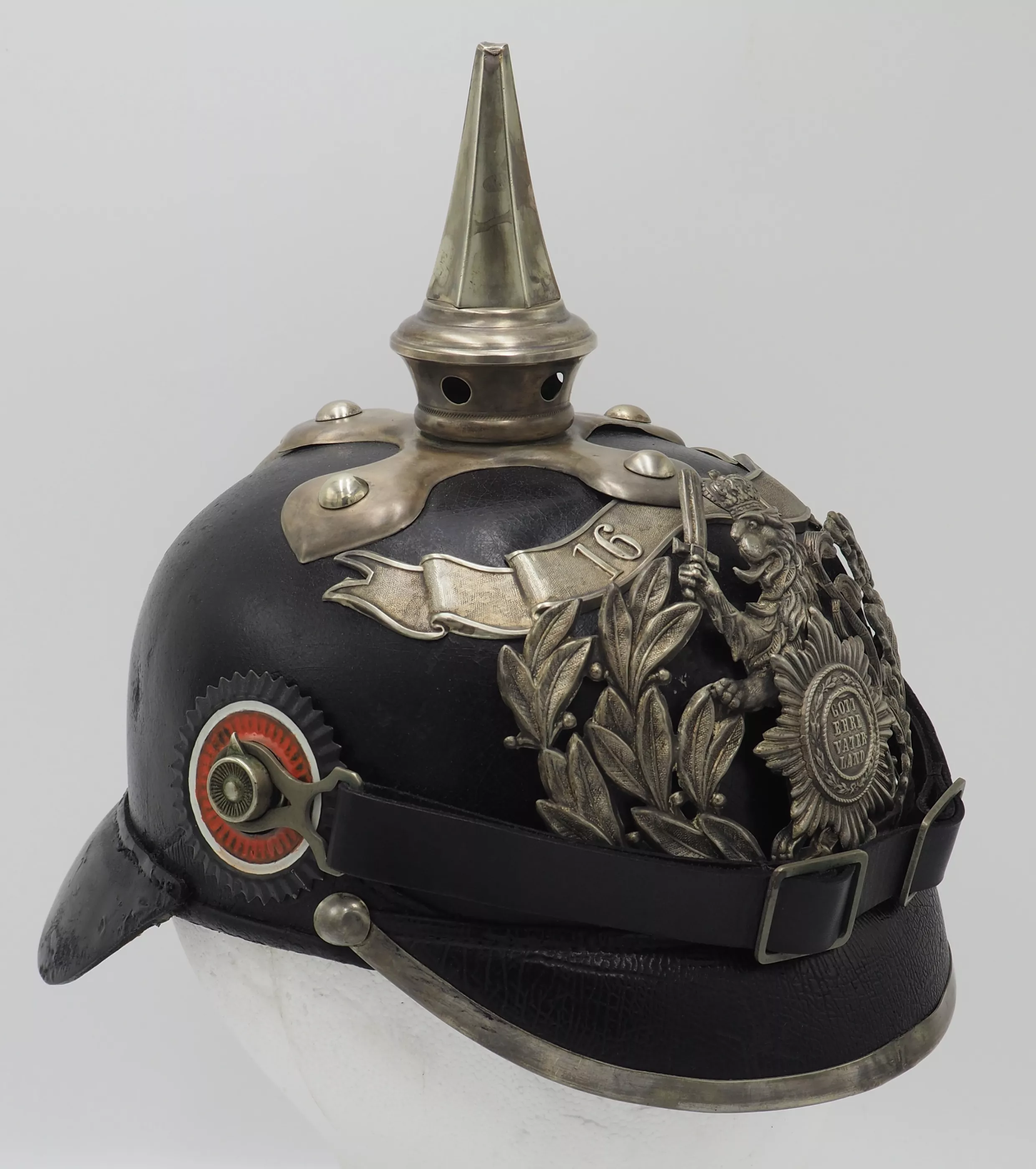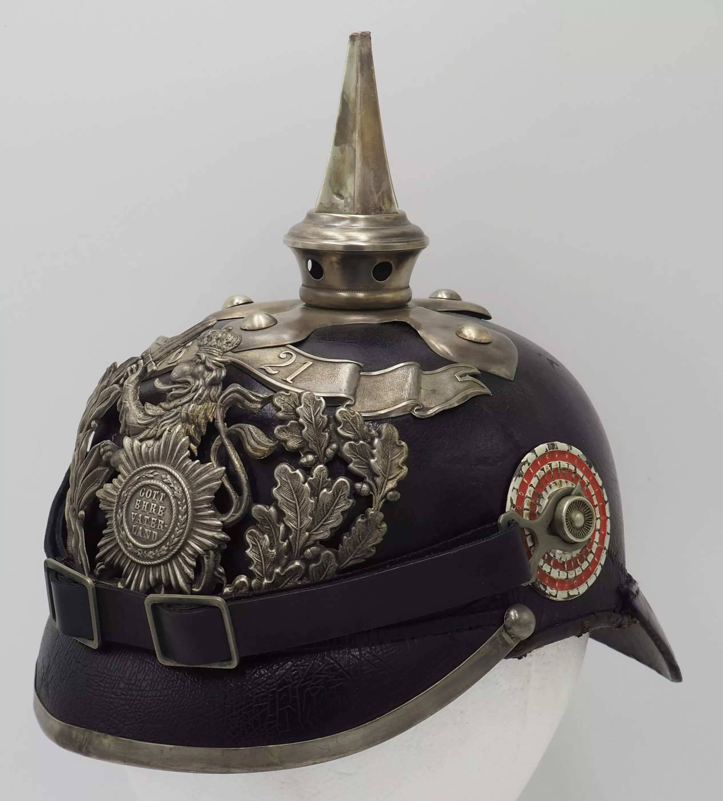 The frontplate is the double wreathed Hessen Lion with the guard star of Hessen on the lion’s breast. Above the frontplate the special silver commemoration bandeau with "1621"indicating the founding year of the Regiment. Hessen style cross base mounted with silver brad retainers. The special Hessen style fluted spike is removable. Leather chinstrap with silver metal fittings. Stamped metal serrated Reichs cockade and non-serrated EM. Beautiful helmet from an elite regiment