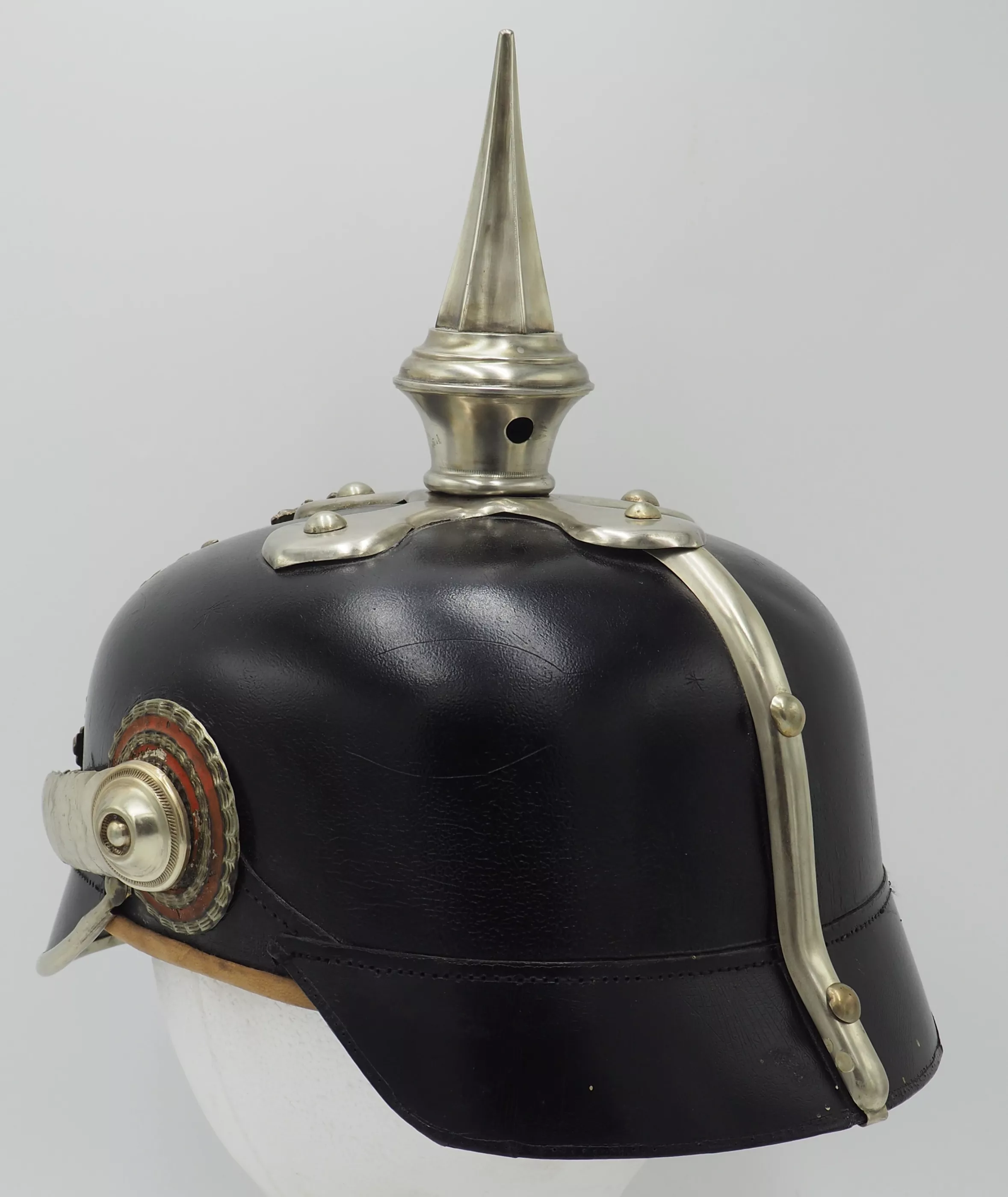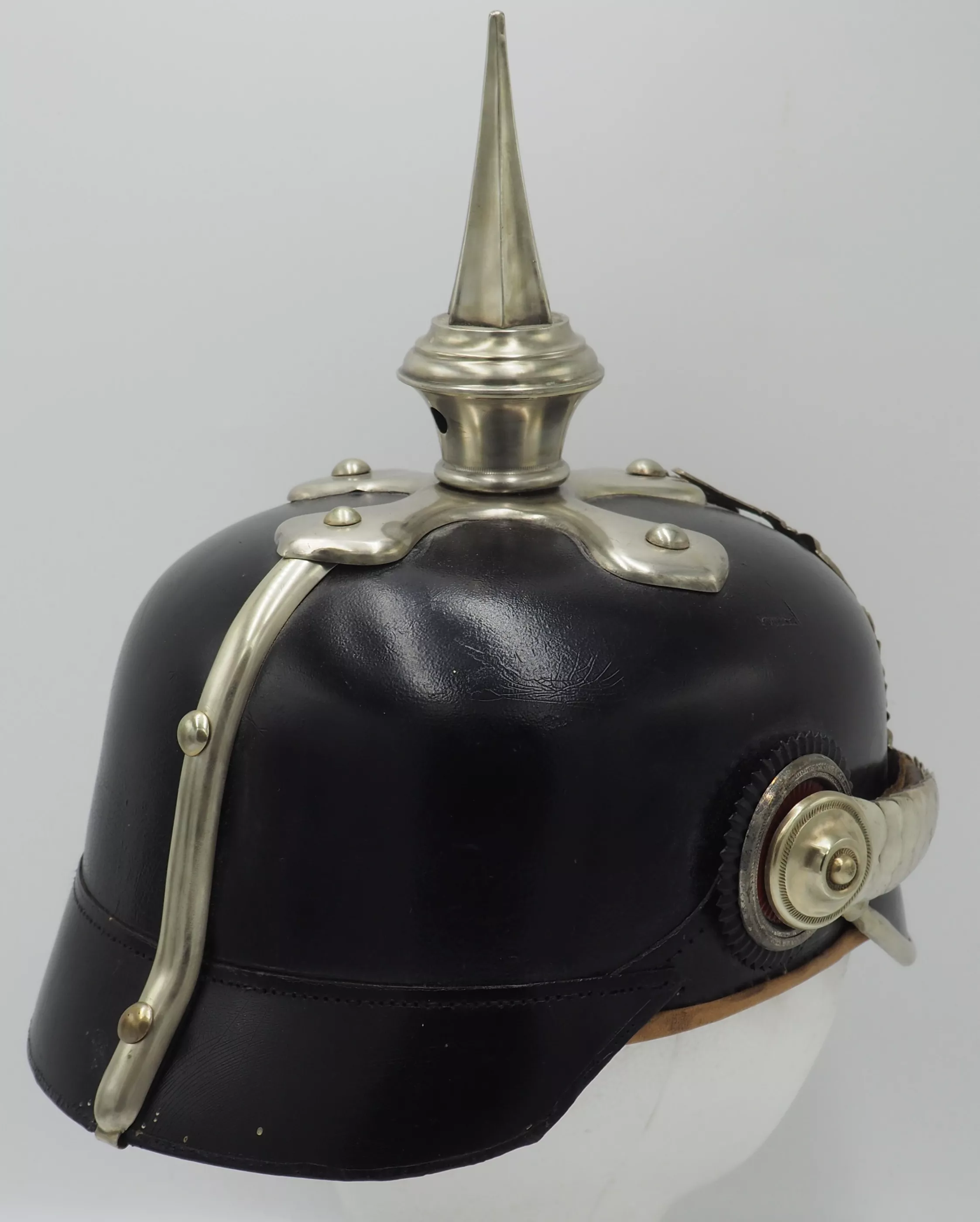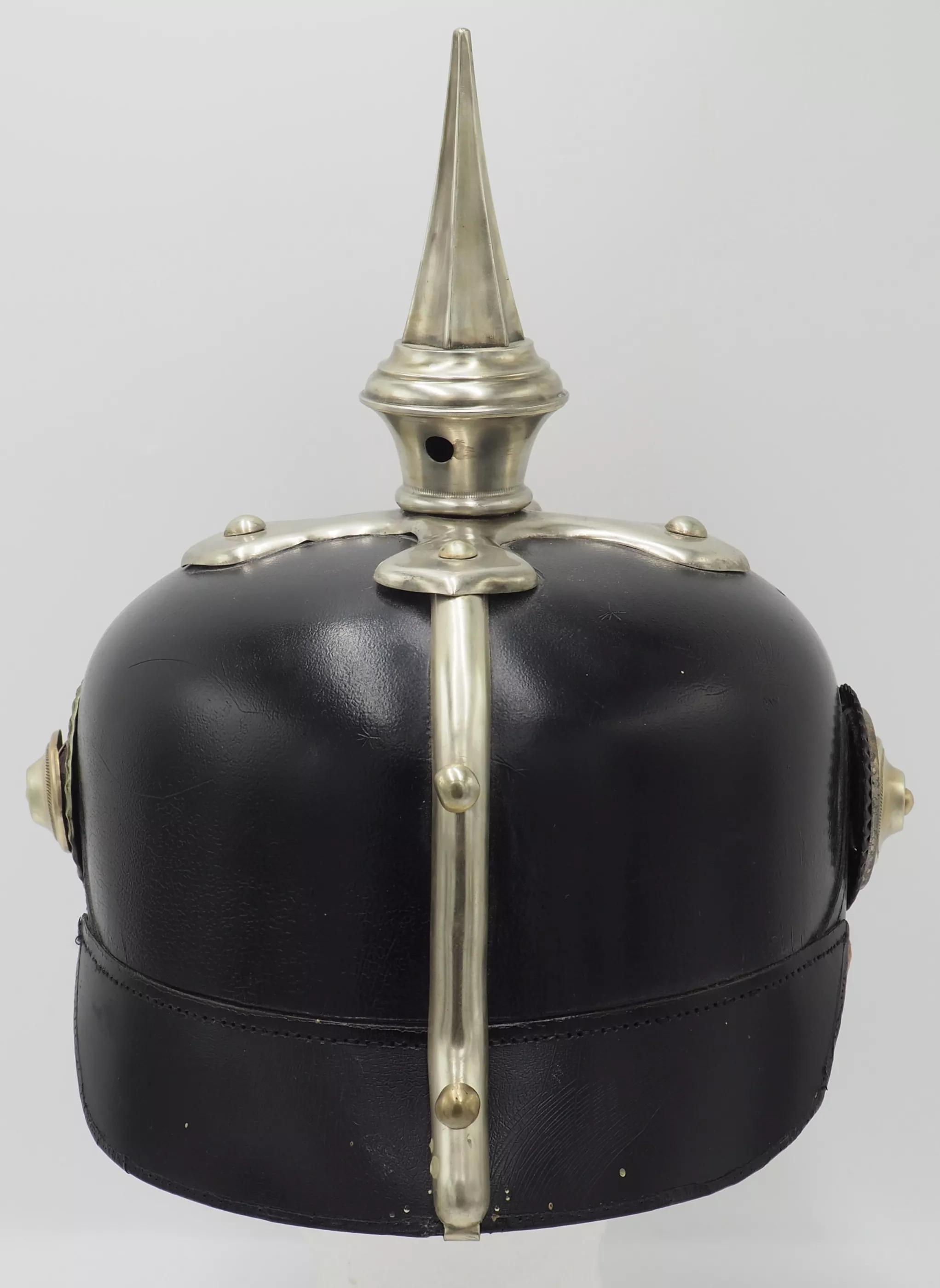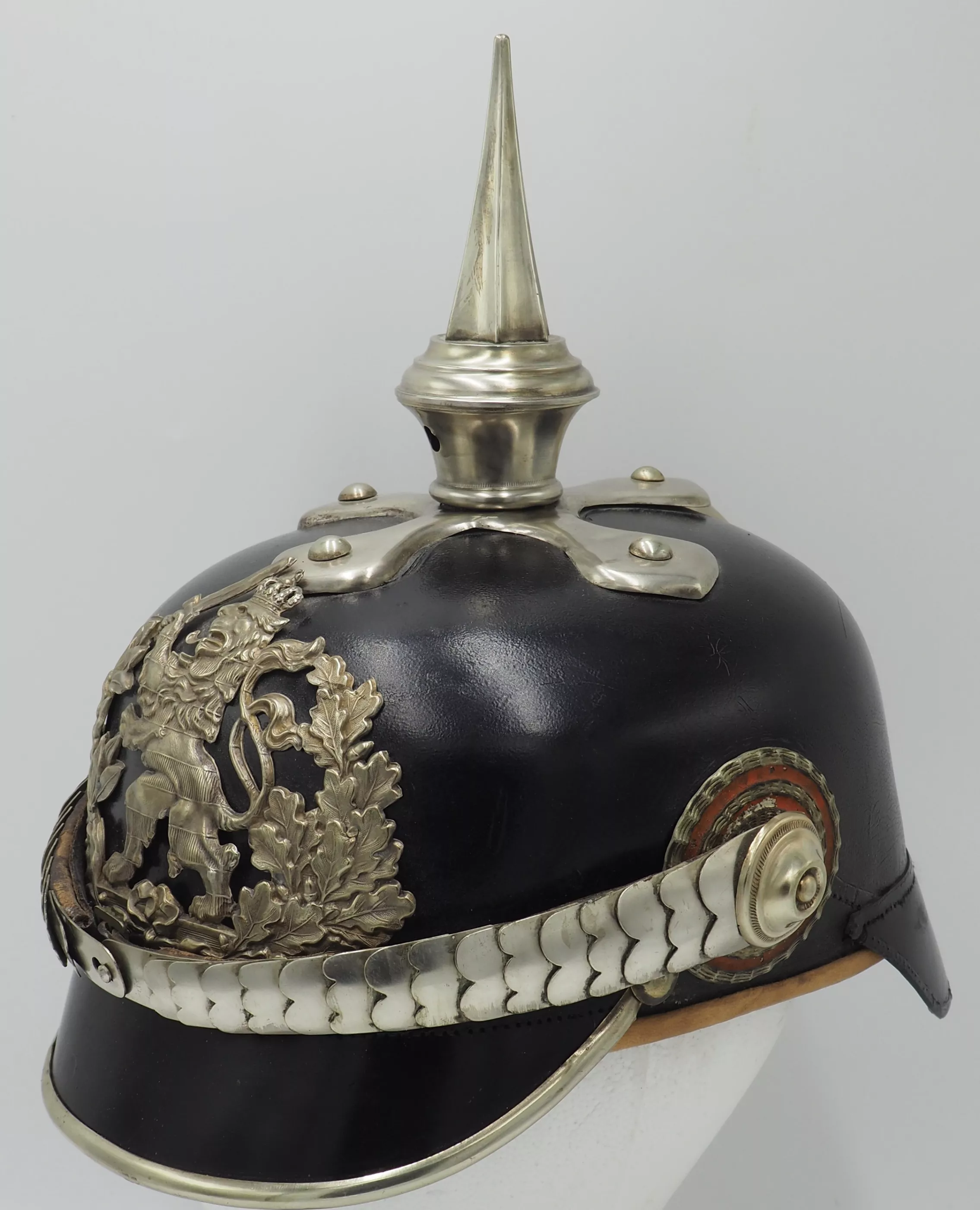 Silver metal trim is very shiny but has been left uncleaned. The frontplate is the wreathed Hessen Lion in silver metal wreath. Hessen style cross base mounted with silver domed retainers. Unique tall Hessen style fluted spike. Rounded silver chinscales on silver rosettes. Impressive and Rare Elite regimental helmet. This helmet will be nearly impossible to upgrade.