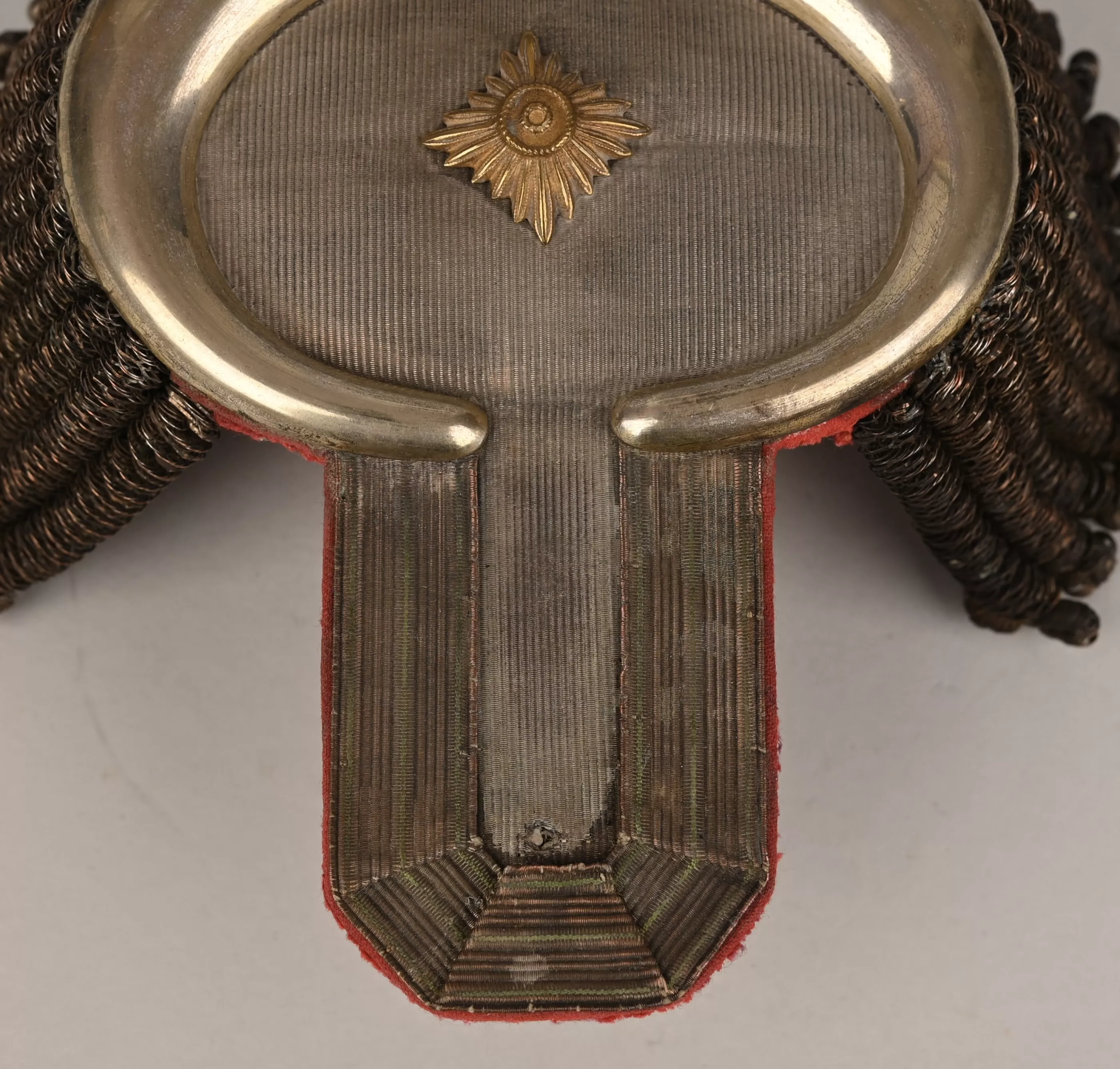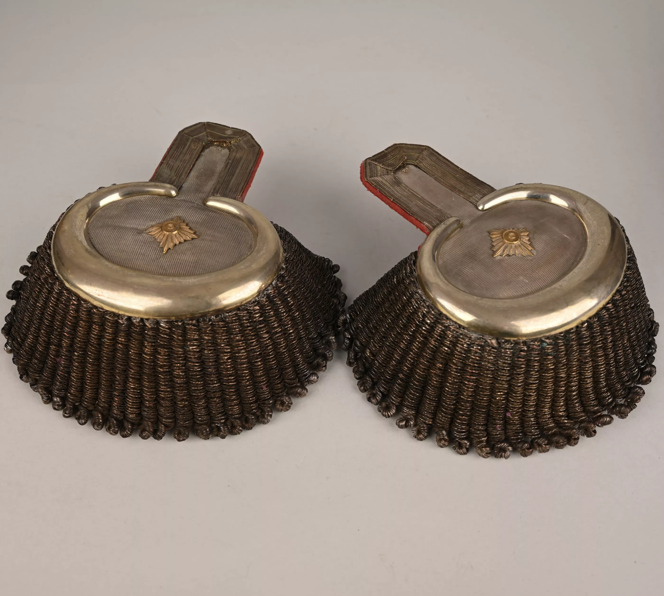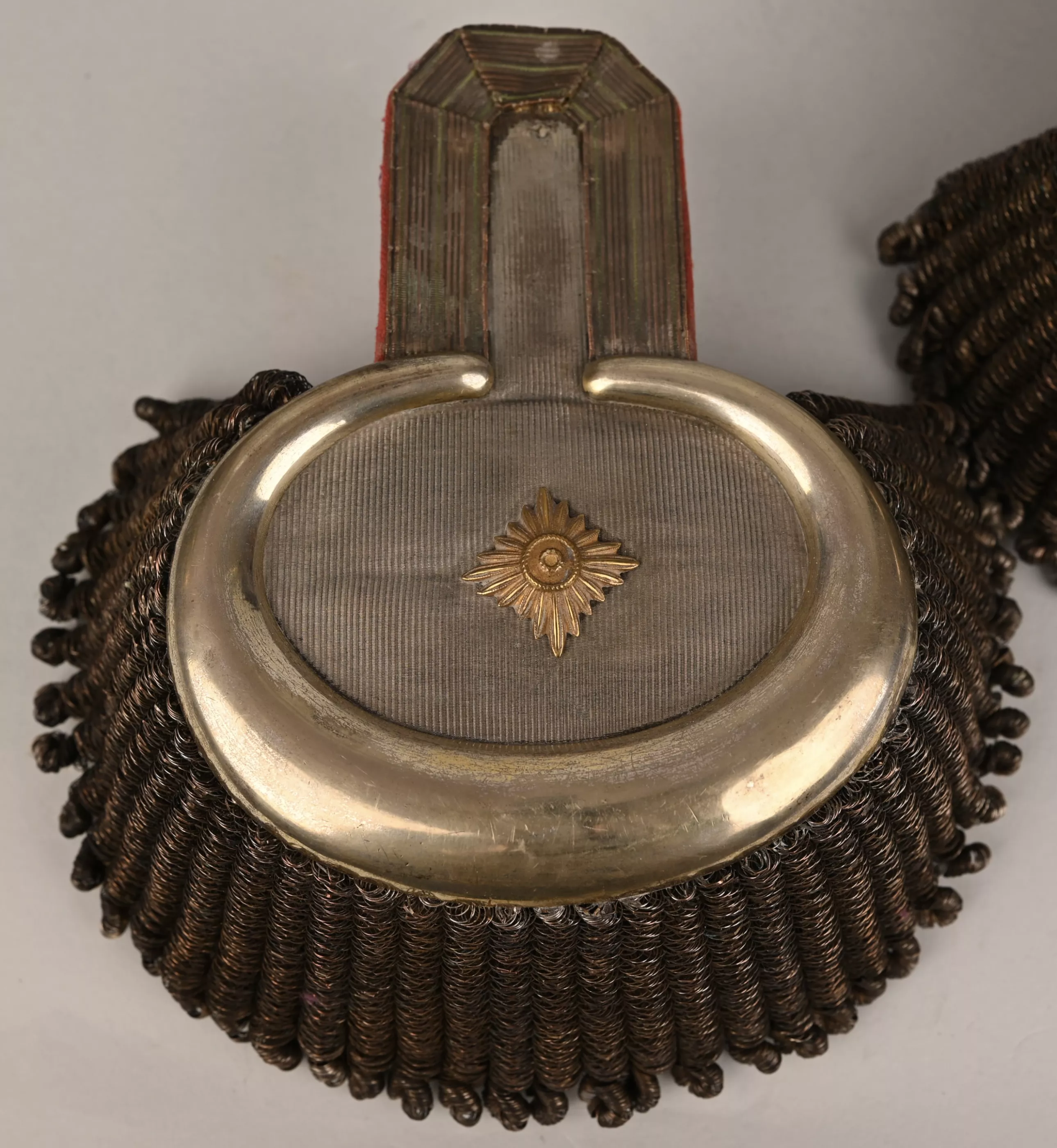 Superb Saxon Generals pair of parade Epaulets. Again these are always extremely rare. Plain Silver mesh bases with silvered half moon metal ends. Padded Generals bright red underlay below with typical Black and Purple Velvet leather stiffener and support, showing light wear. Maker marked "CA. Westmann Dresden". One gold Pip for the Rank. These epaulettes are in good / very good condition. A rare pair of Lieutnant General Officers rank of parade epaulets.