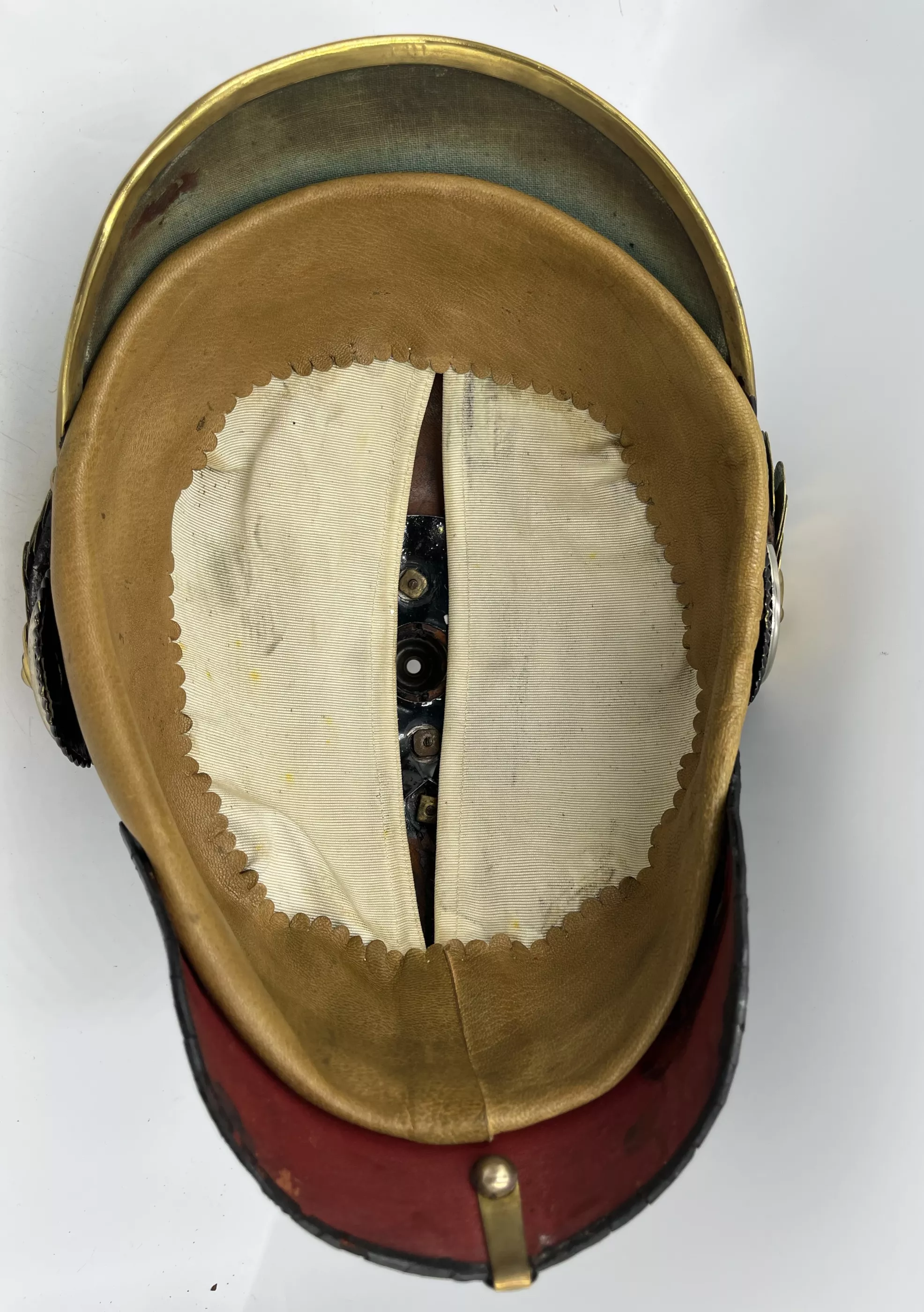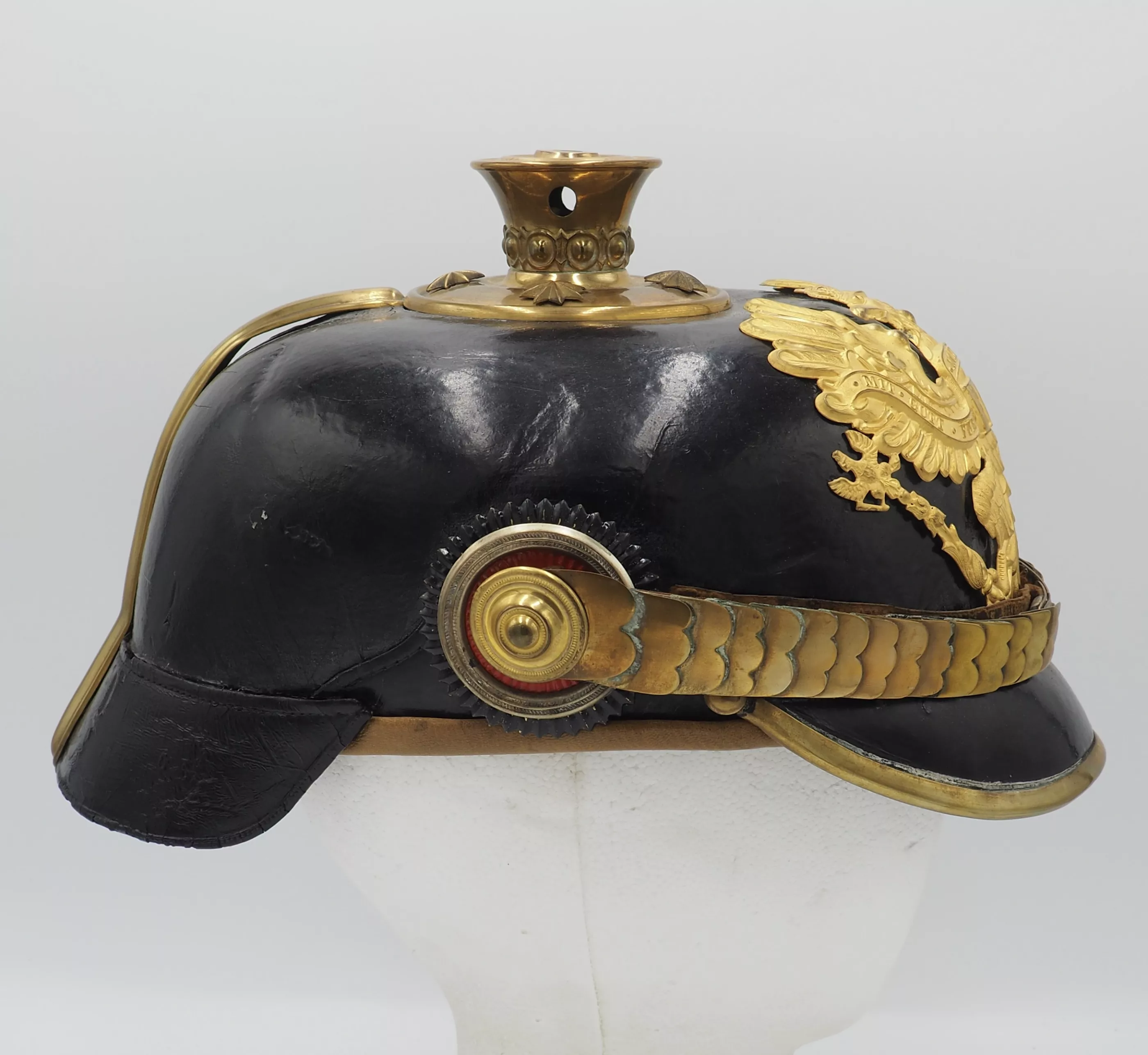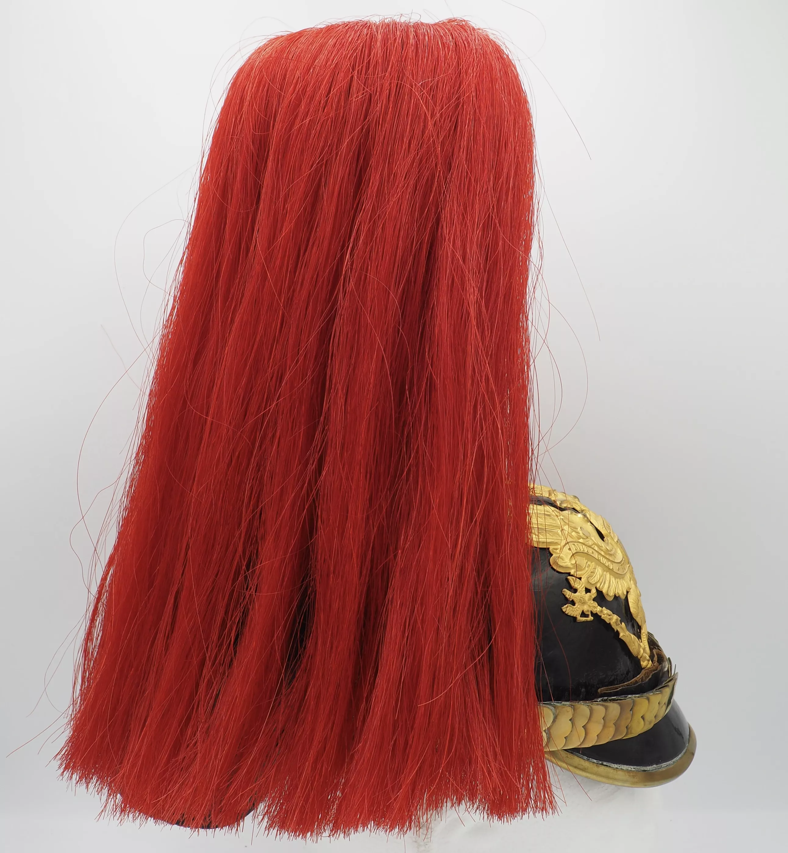The frontplate for the helmet is the Line Prussian Eagle fixed to the helmet shell with screws/nuts. The helmet has a Standard Officer spike base with a tall smooth trichter on which is mounted a red horse hair plume. The base is secured to the helmet body with 4 split brads stars. The red plume indicated the wearer was a musician and as it is an officer helmet we conclude he was a Bandmaster for his unit. Flat gilt chinscales on rosettes. Officer Reichs and Prussian cockades. Beautiful helmet in near pristine condition. Great regimental Bandmaster.