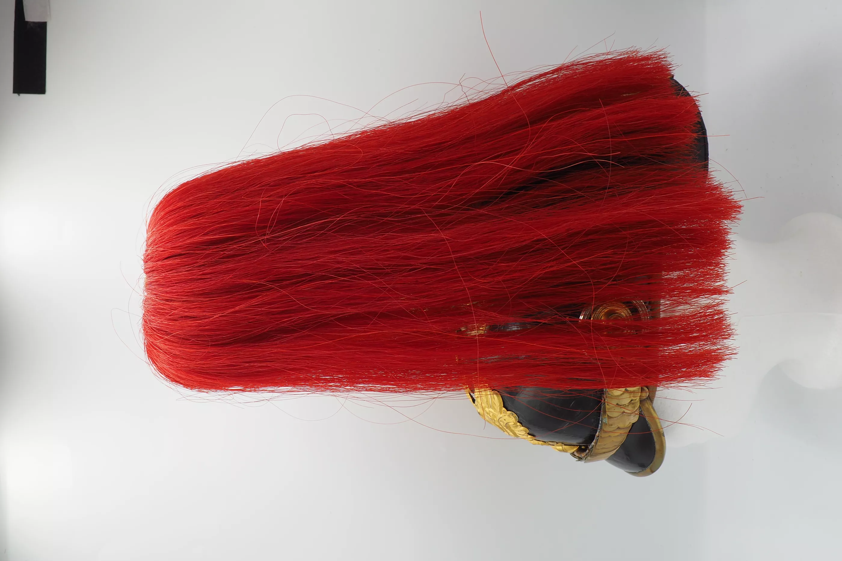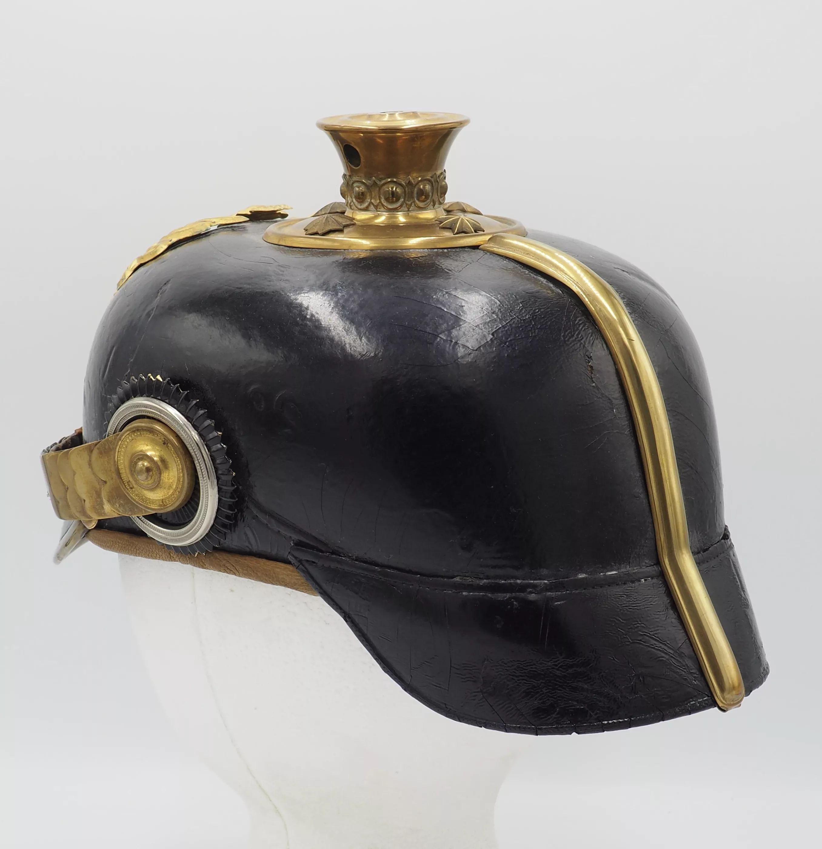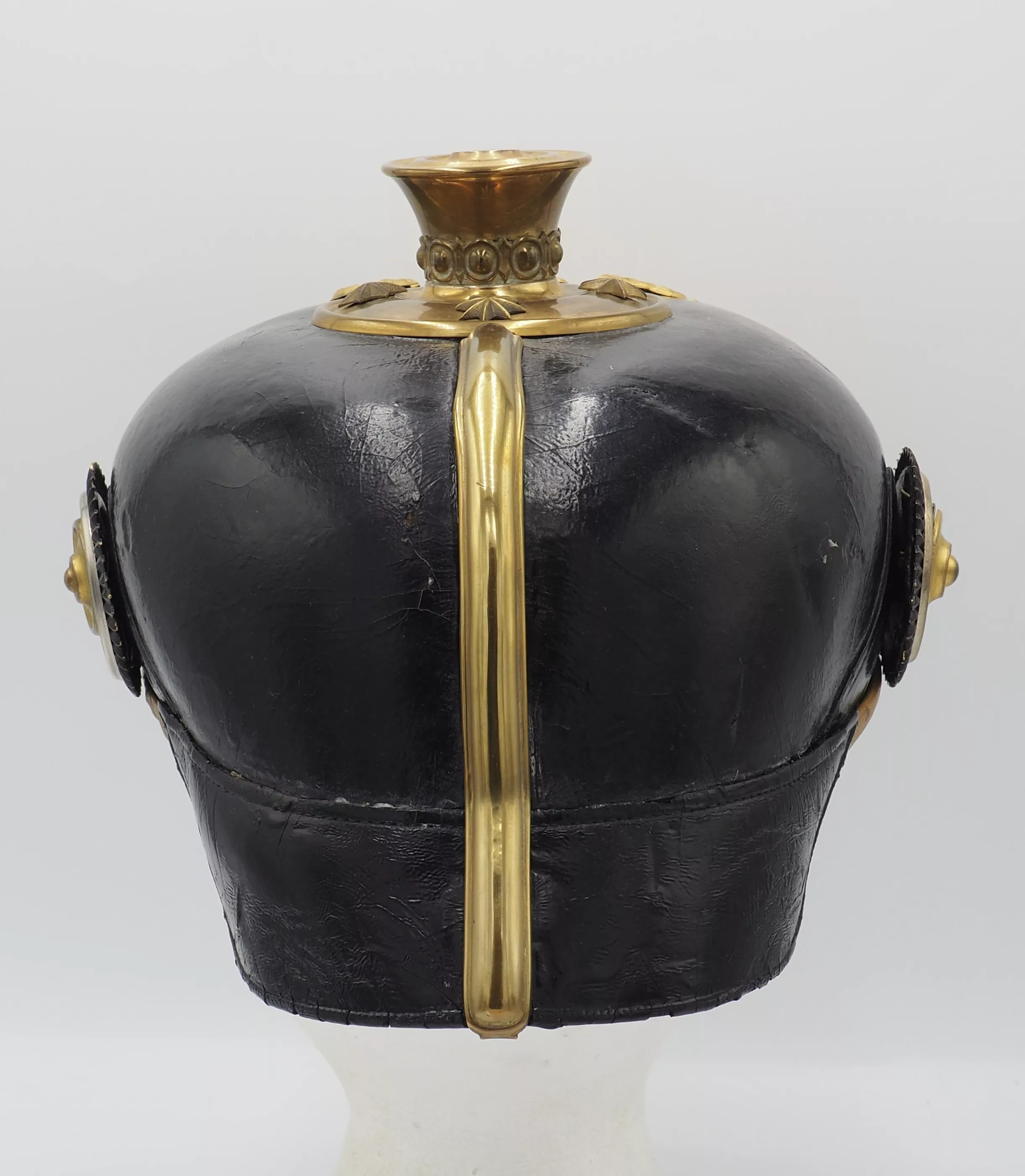 The frontplate for the helmet is the Line Prussian Eagle fixed to the helmet shell with screws/nuts. The helmet has a Standard Officer spike base with a tall smooth trichter on which is mounted a red horse hair plume. The base is secured to the helmet body with 4 split brads stars. The red plume indicated the wearer was a musician and as it is an officer helmet we conclude he was a Bandmaster for his unit. Flat gilt chinscales on rosettes. Officer Reichs and Prussian cockades. Beautiful helmet in near pristine condition. Great regimental Bandmaster.