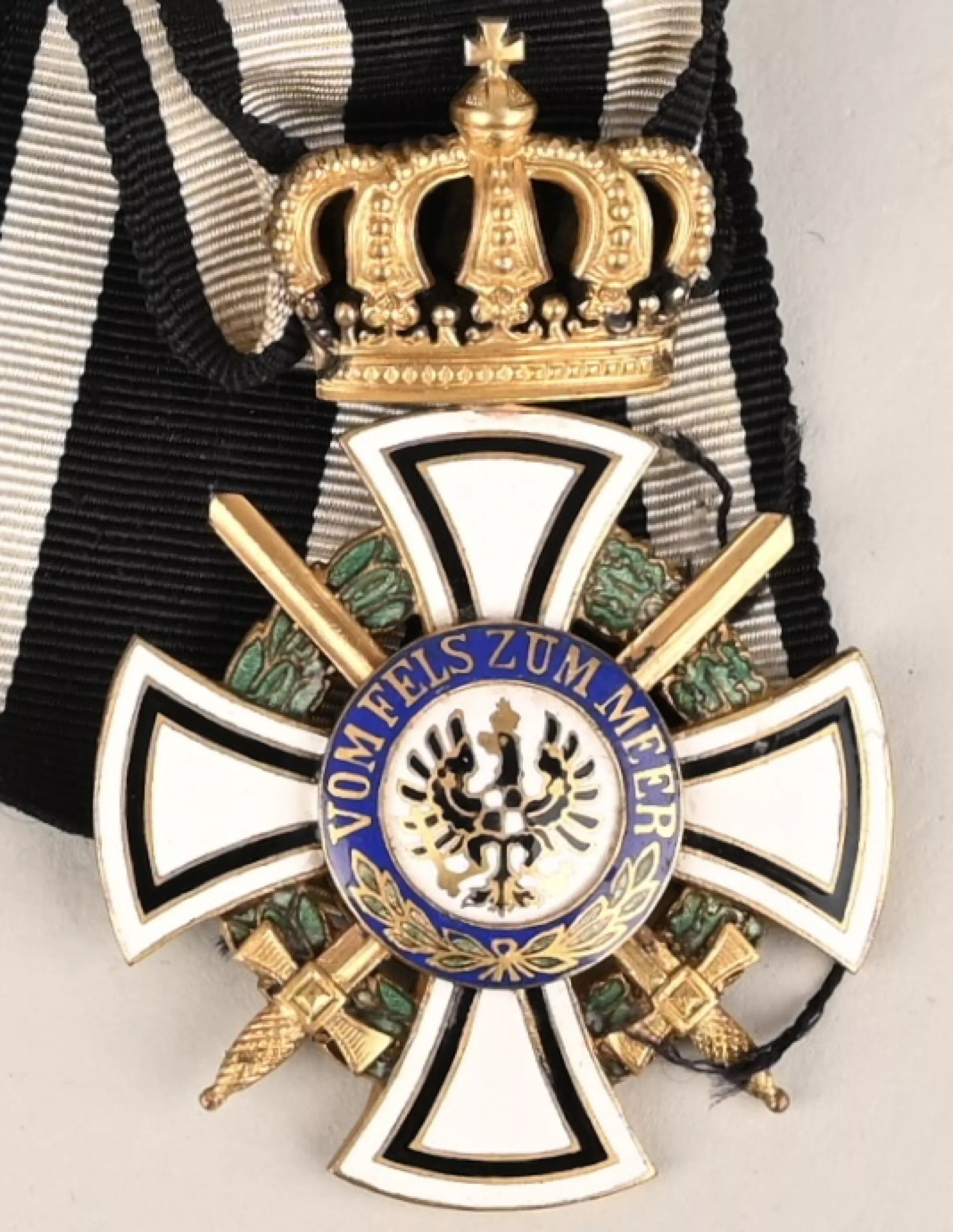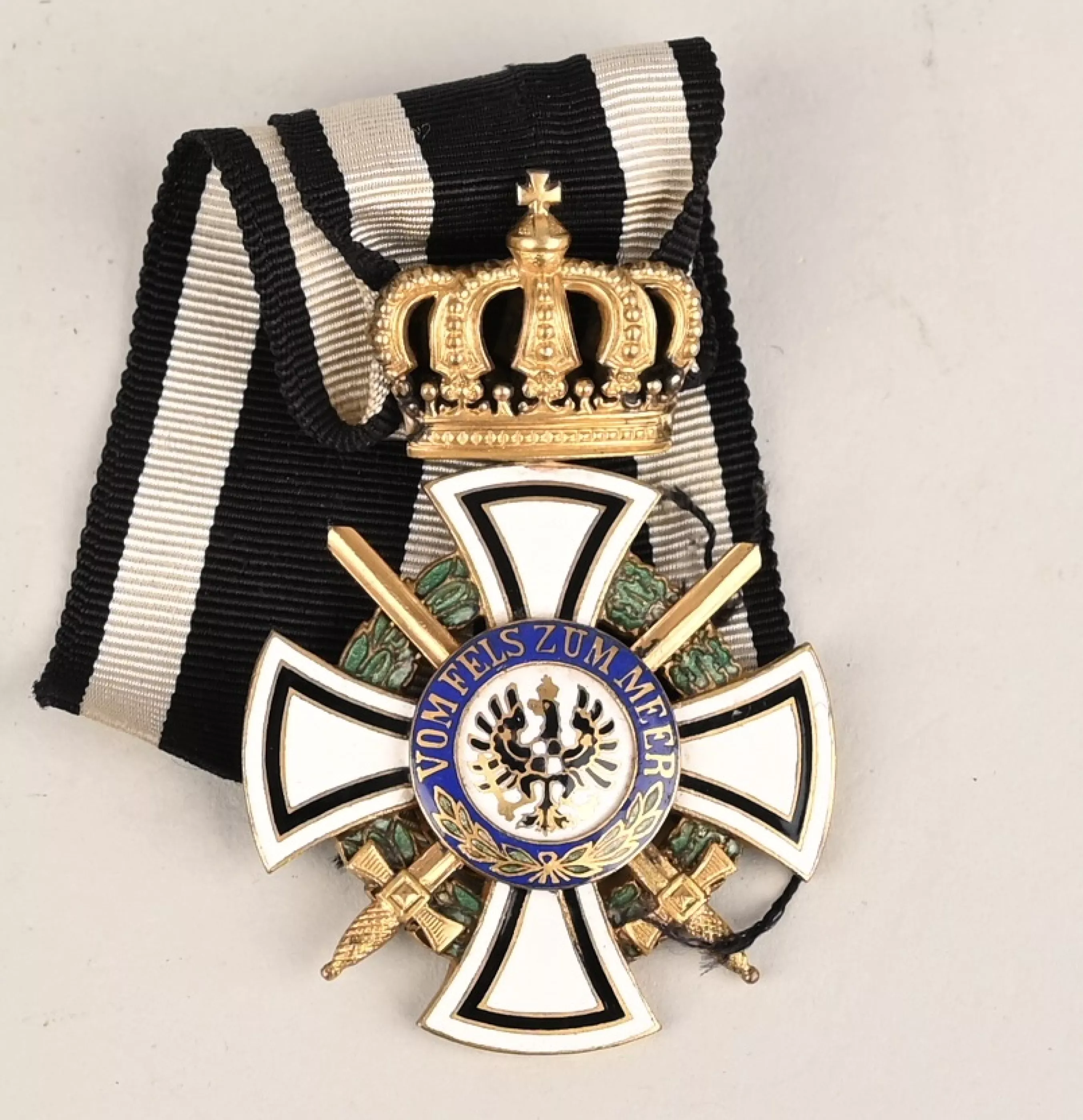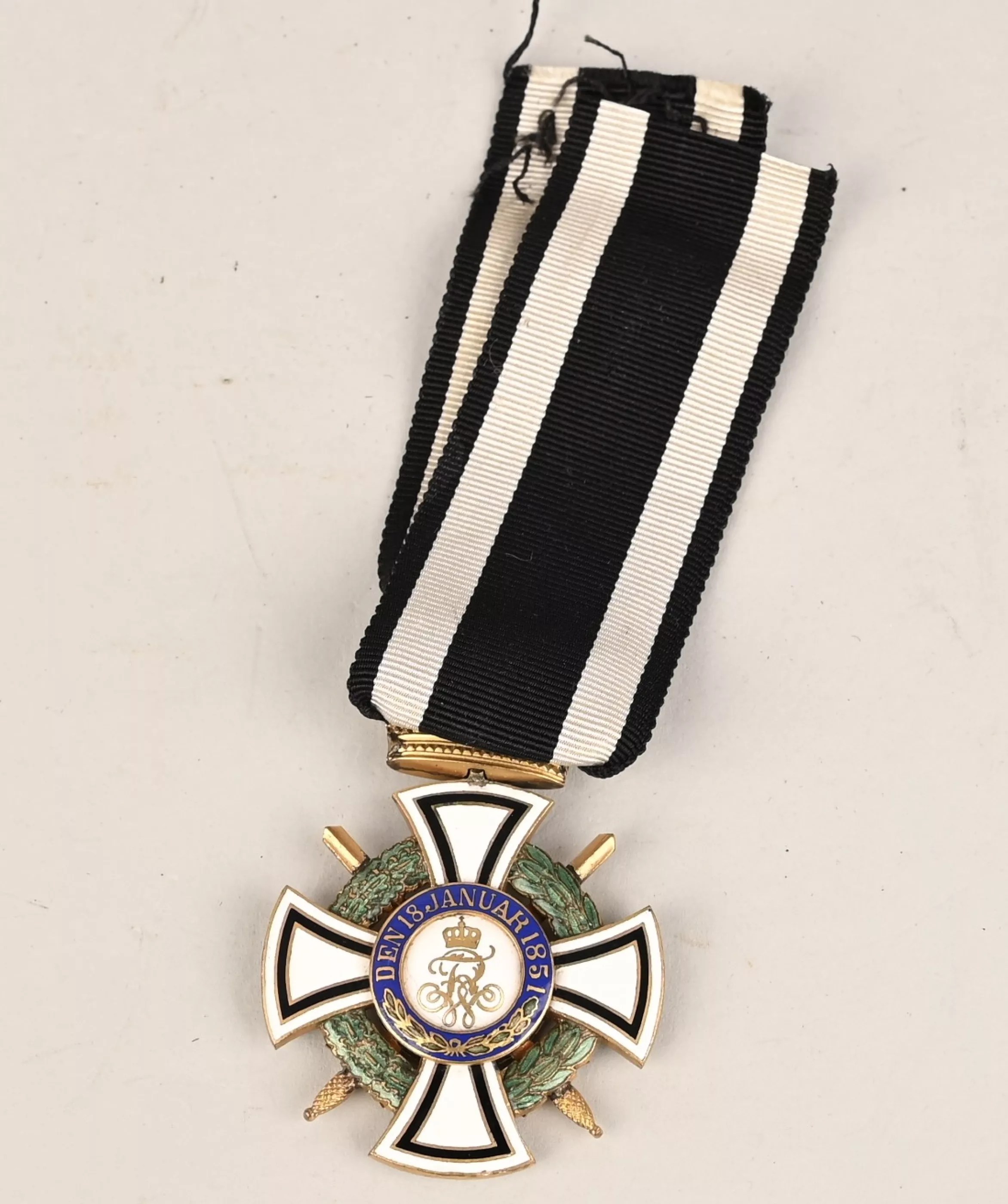 Prussian Hohenzollern Knight Cross in Gilt Silver. Instituted 18 January 1851 by King Friedrich Wilhelm IV. (1851-1918 issue). Constructed of silver with multi-coloured enamels, consisting of a Cross Pattée with white enameled arms highlighted with black enameled borders, joined through the quadrants by a green enameled laurel and oak leaf wreath, with crossed swords piercing the centre, the obverse with a central white enameled medallion bearing a hand-painted Hohenzollern imperial eagle, within a ring of blue enamel bearing a gilt inscription of “VOM FELS ZUM MEER” (“FROM THE CLIFFS TO THE SEA”) with laurel branches, the reverse with a central white enameled medallion bearing a gilt monogram of King Friedrich Wilhelm IV, within a ring of blue enamel bearing a gilt institution date of “DEN 18. JANUAR 1851” with laurel and oak leaf branches, topped by a crown suspension with a Black White and Black Ribbon. No Makers Marks on this example but the Gilding is absolutely terrific and guarranted 100% to period. We assume the medal was made to complete a "Spange" at some point. In overall near mint to MINT condition.