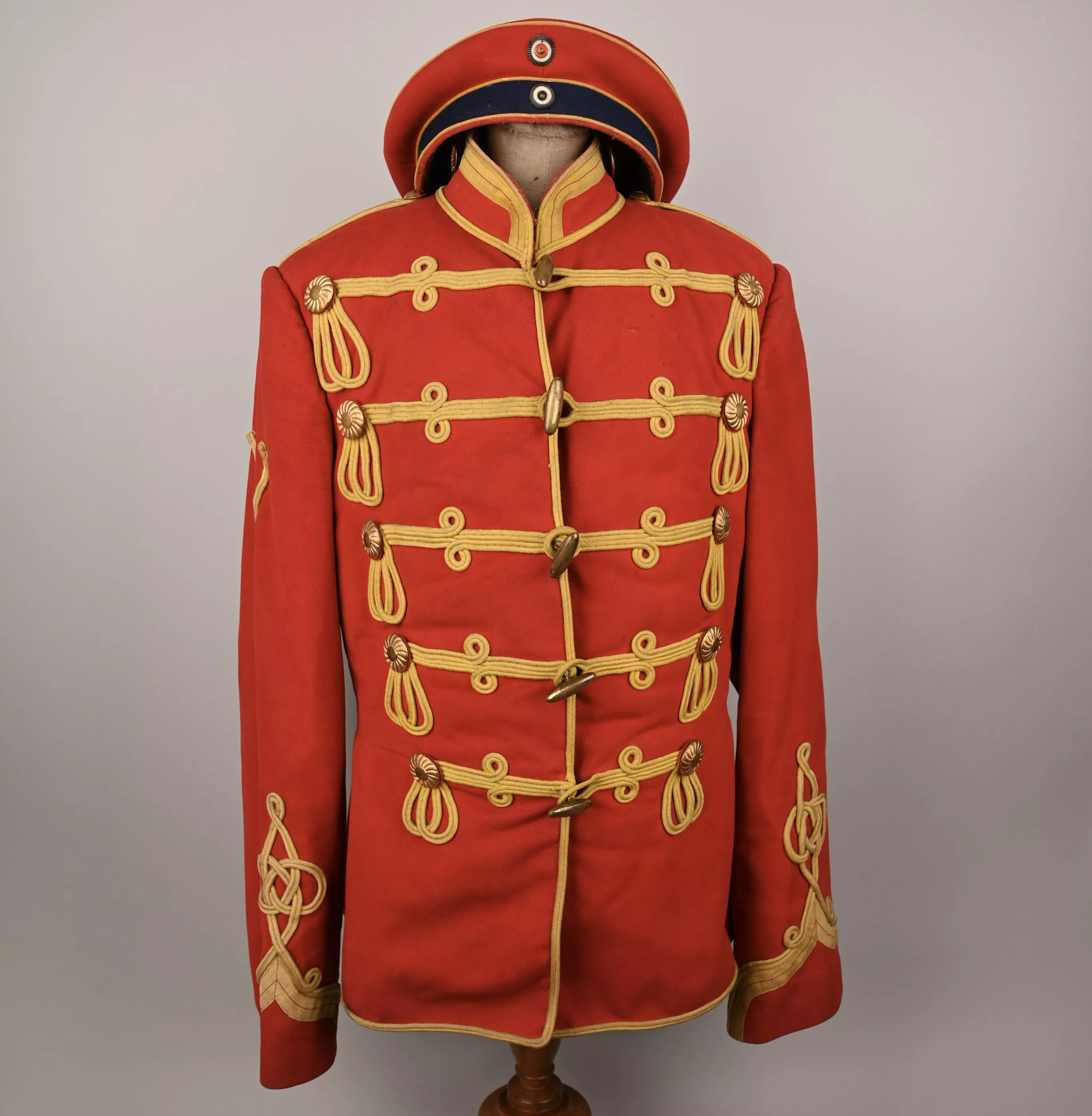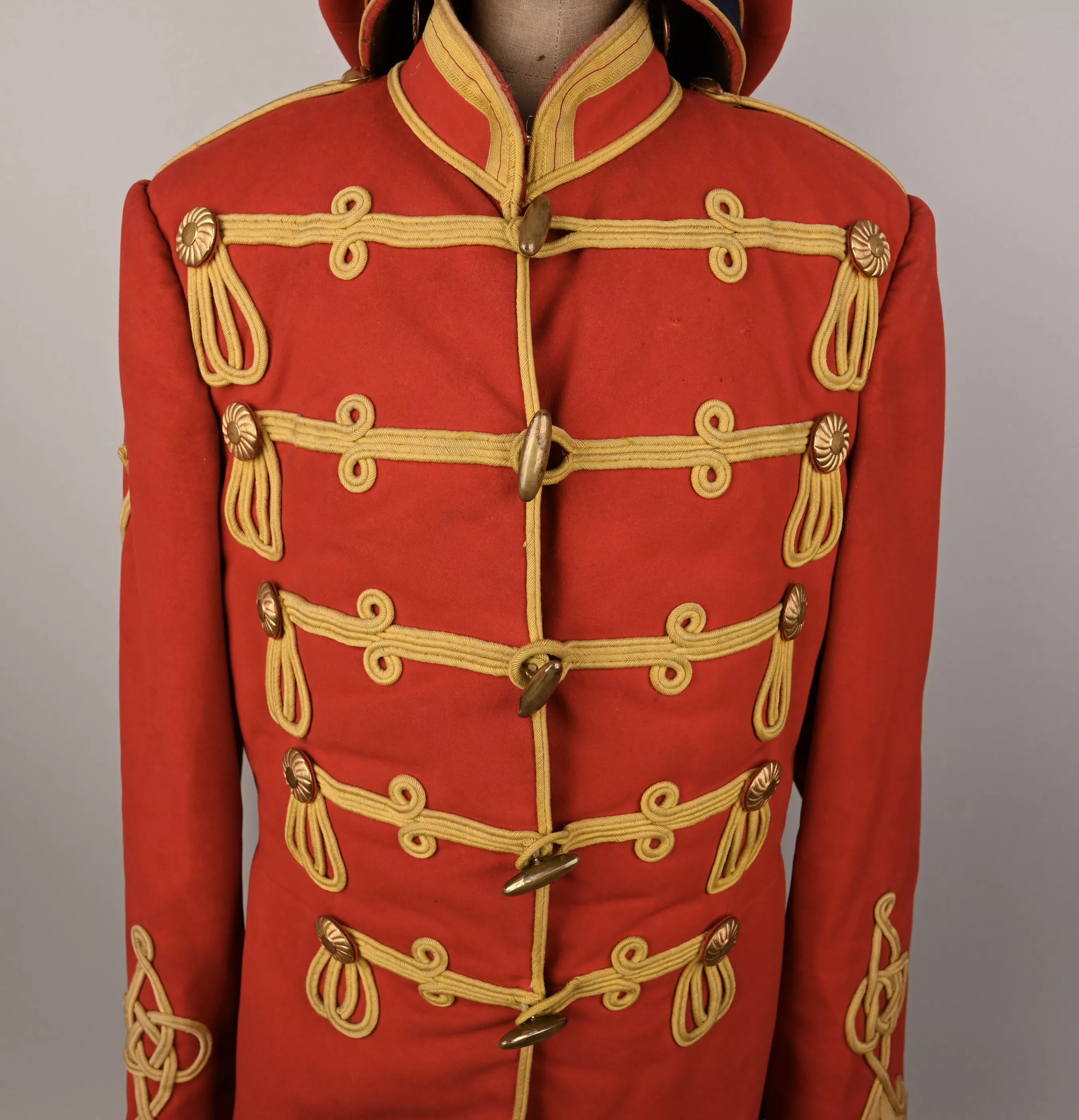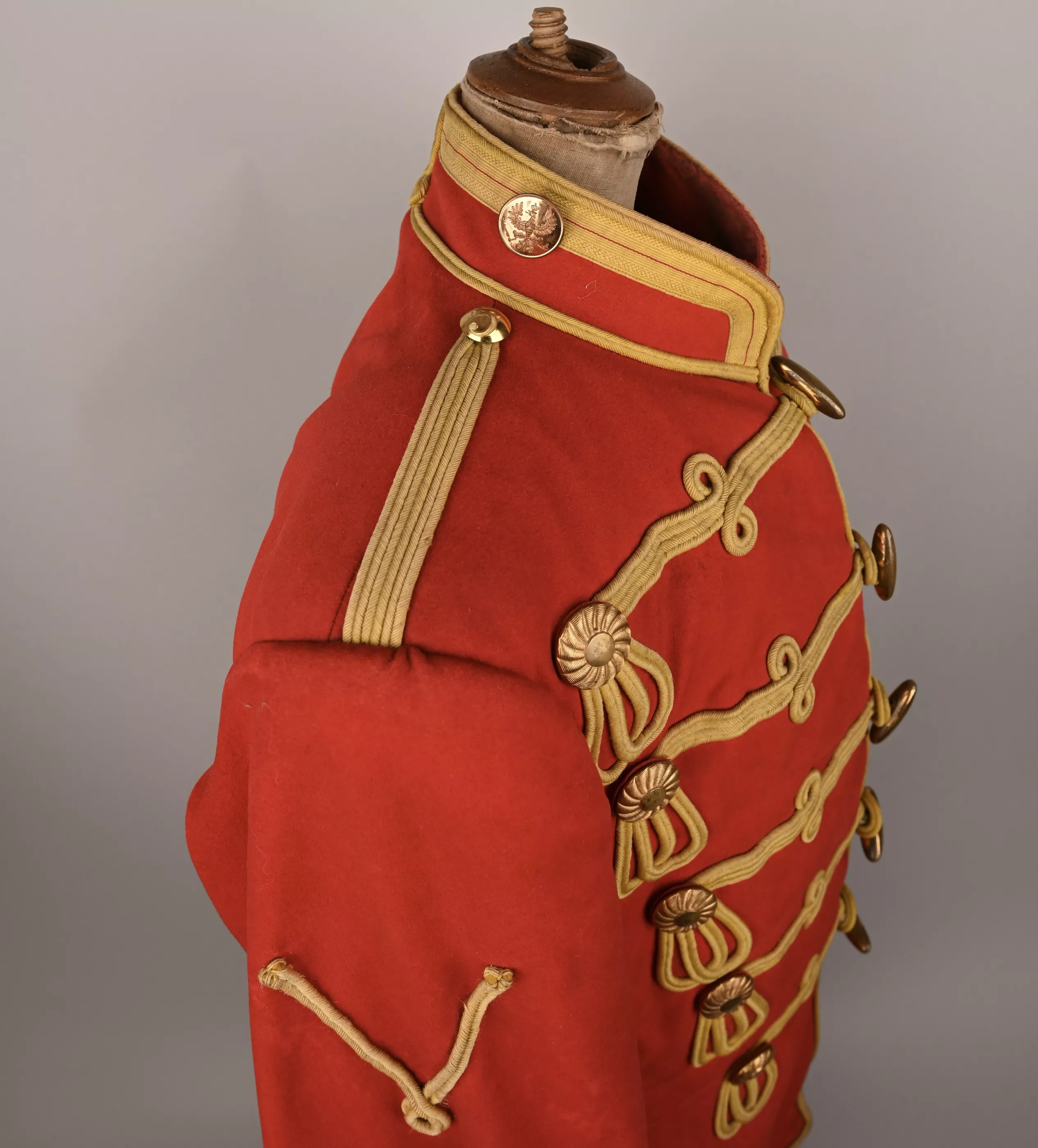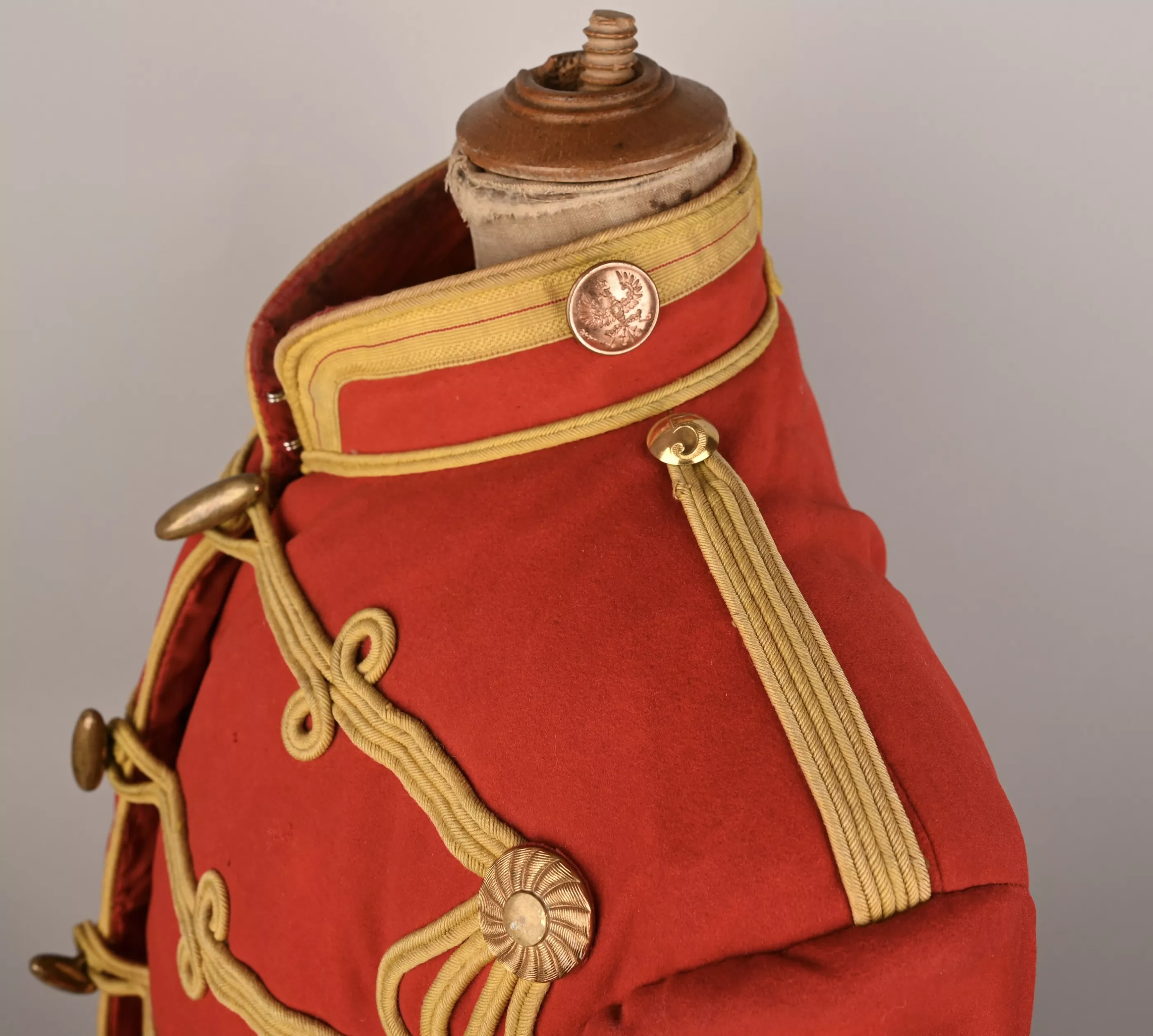 Leib Garde Hussar Attila (Tunic) - Hussar tunic composed of tightly woven poppy red wool decorated with flat yellow woolen braid to the five chest rows of 'frogging', rear trim, collar, Hungarian style cuffs and shoulder straps. The cuffs feature the special yellow trim with red centerline unique to this regiment. Each row of chest frogging features two gilt brass rosettes at each end and a center brass lozenge-shaped fastening toggle. A yellow braid first class lance / sword proficiency award is present on the upper right sleeve. The interior is lined with bright red linen cloth. Tunic shows some minor wear and dirt spot but no mooth damage (see pictures).