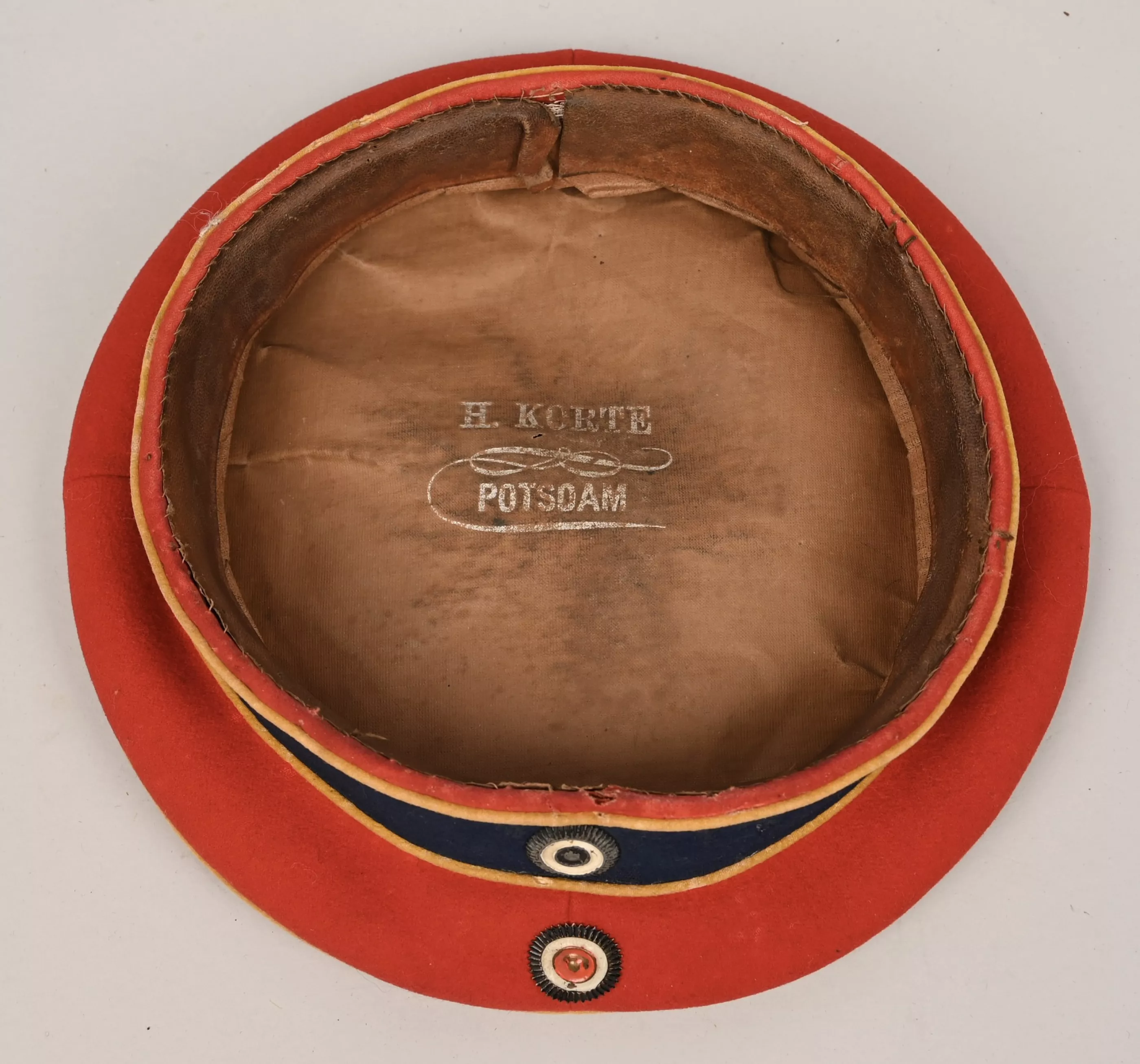 Leib Garde Hussar Cap (Kratzchen) - Peakless cap with a red body, dark blue band and yellow piping around the crown and band edges. National and Prussian cockades to the front. Interior linen lining with makers name from Potsdam.