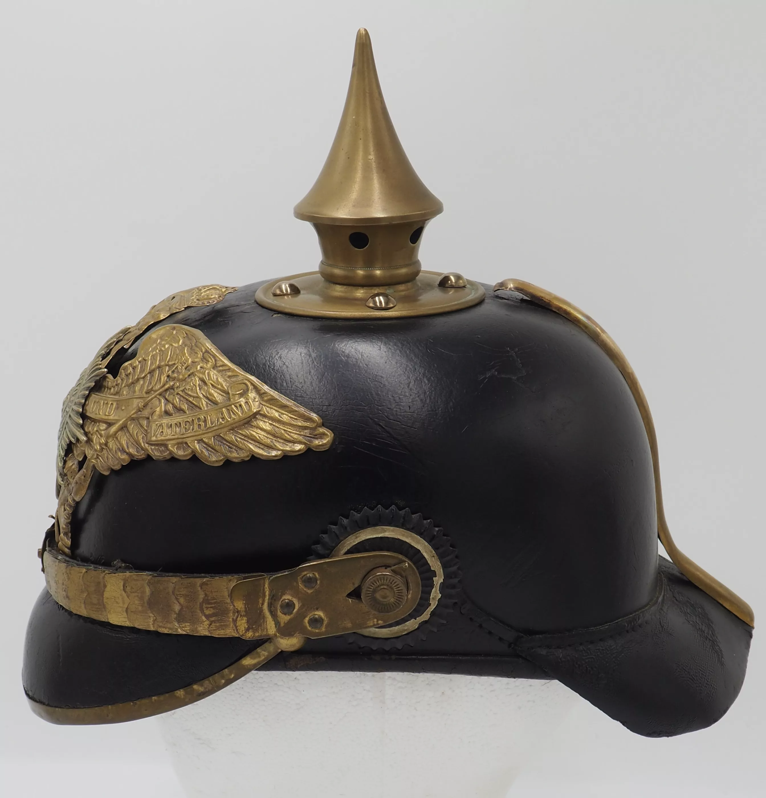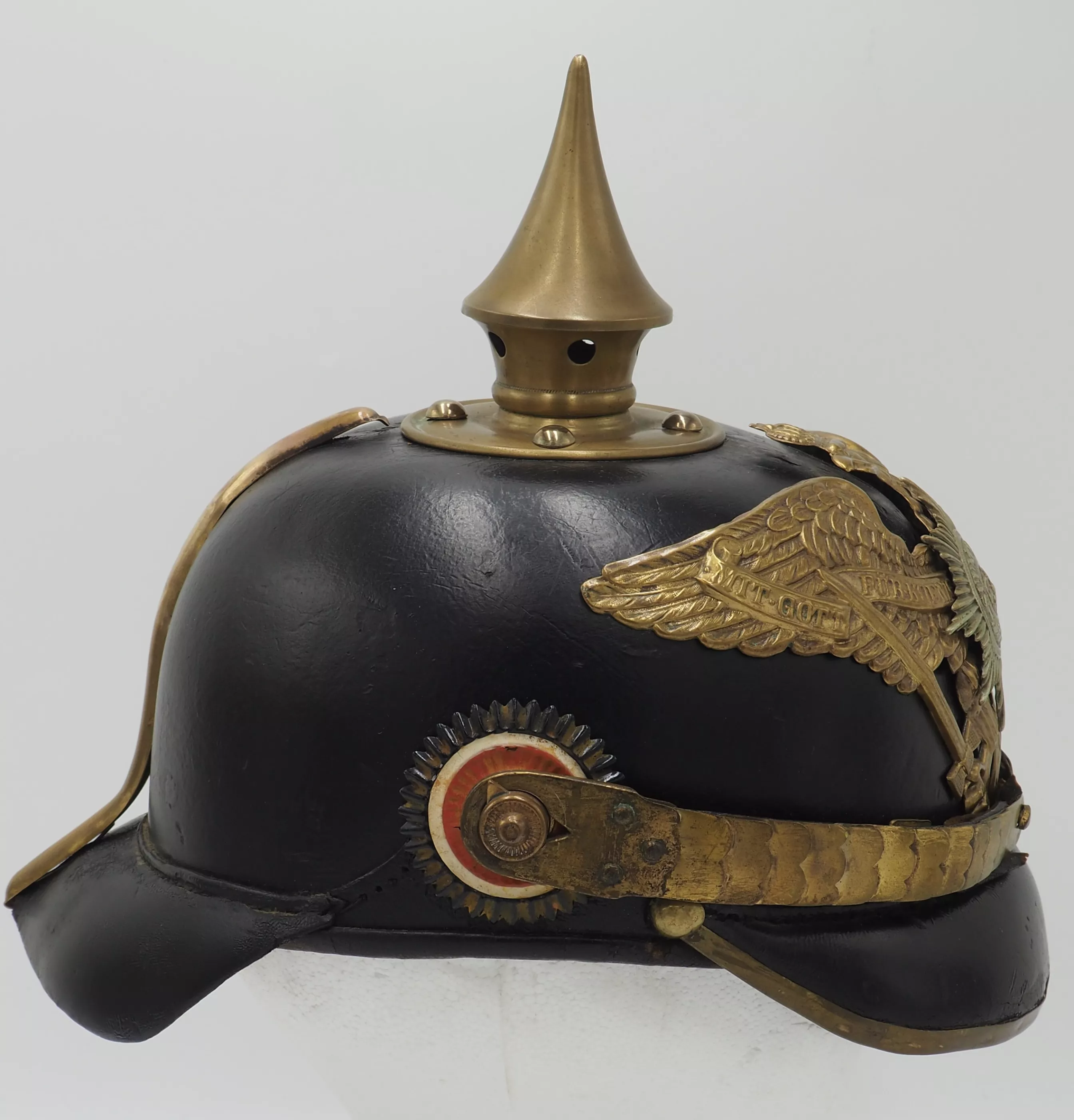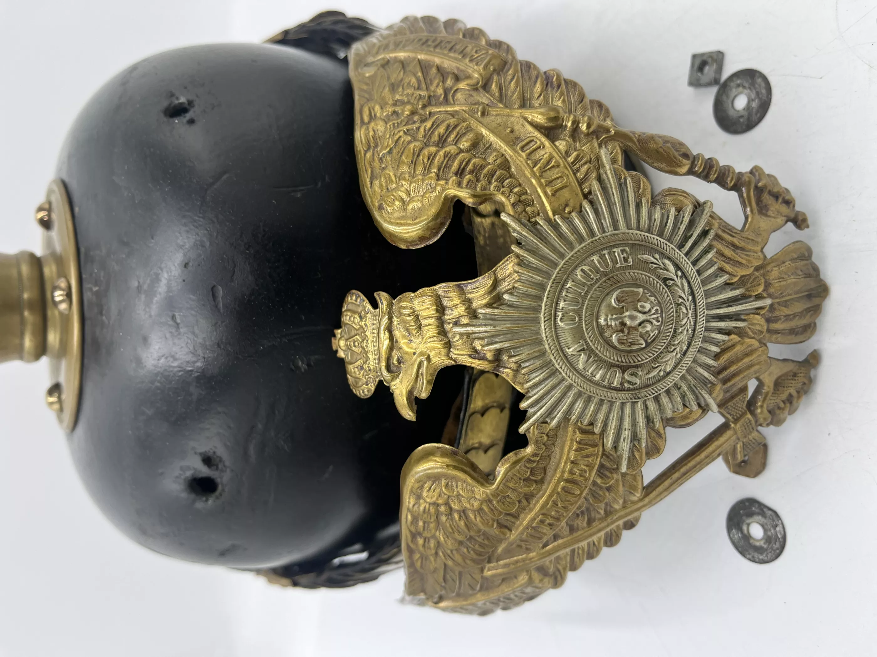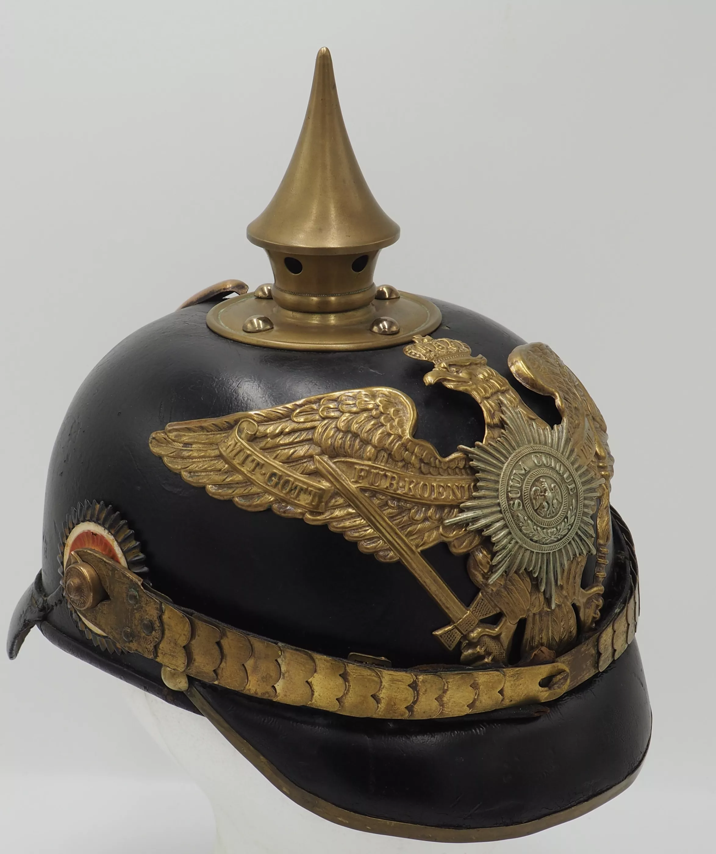 The helmet interior has standard tongued leather headliner that shows use and wear but is in very good condition. Inner visors are plain leather with not visible markings. Round spike base with round screw back retainers. The screw studs also are indicative of the early M1891 pattern. The spike is removable for placement of a plume for parade. The back spine has no slide vent as was used after 1895. The frontplate is the larger standard Guard Eagle with the silver Guard star in the center. Flat gilt chinscales on M1891 side lugs. Original Prussian EM and Reichs (added in 1897) cockades. This helmet is the Classic M1891 helmet pattern that was used through the World War.