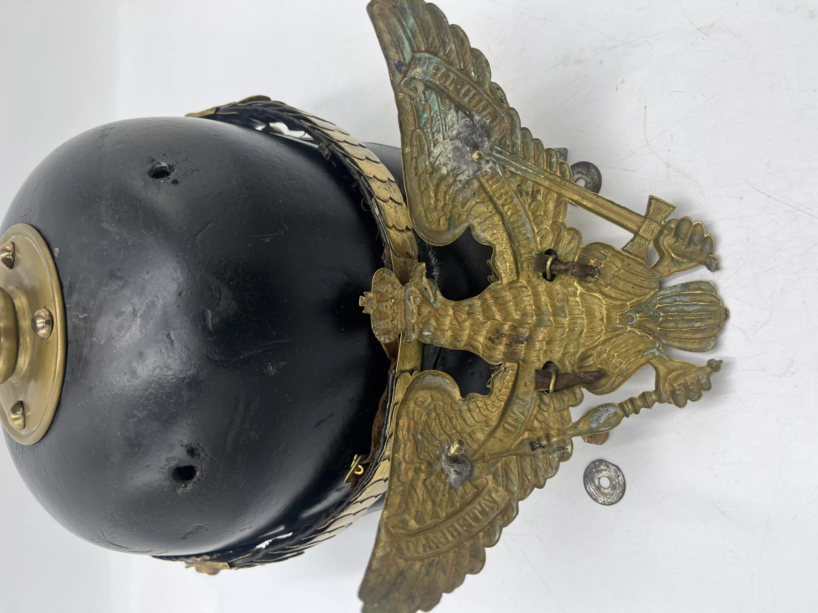 Prussian Guard Infantry and Grenadier Regiments Enlisted Man - Model 1891*. Heavy black leather helmet body with brass metal trim. The leather helmet body in fine condition with firm stitching. The exterior lacquer in excellent condition with a dulled age related finish and no lacquer loss. The helmet body has the pre-1895 "punched" holes (In 1895 the looped retainer and grommeted holes was introduced) for the screw back helmet front plate. There is a small extra hole beside one of the retaining holes that appears never to have been use (see photo).