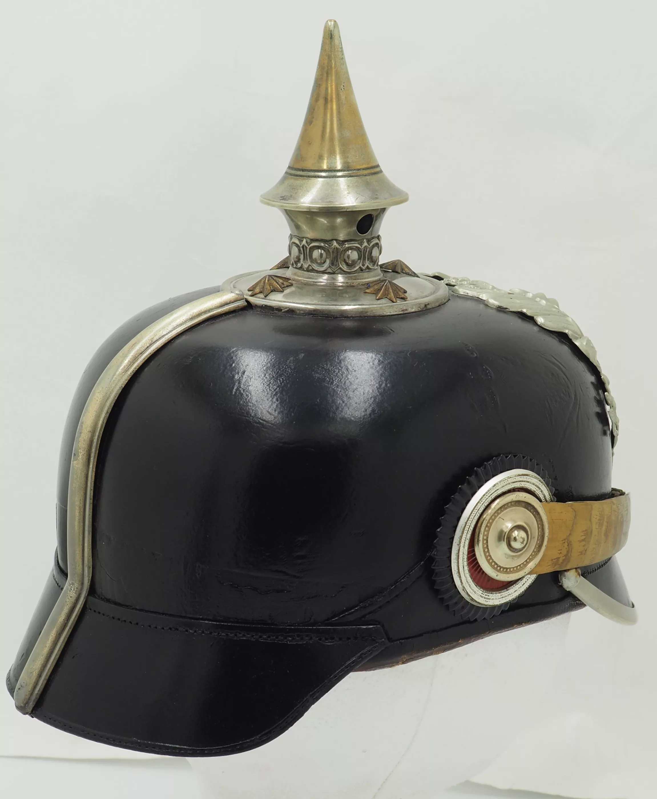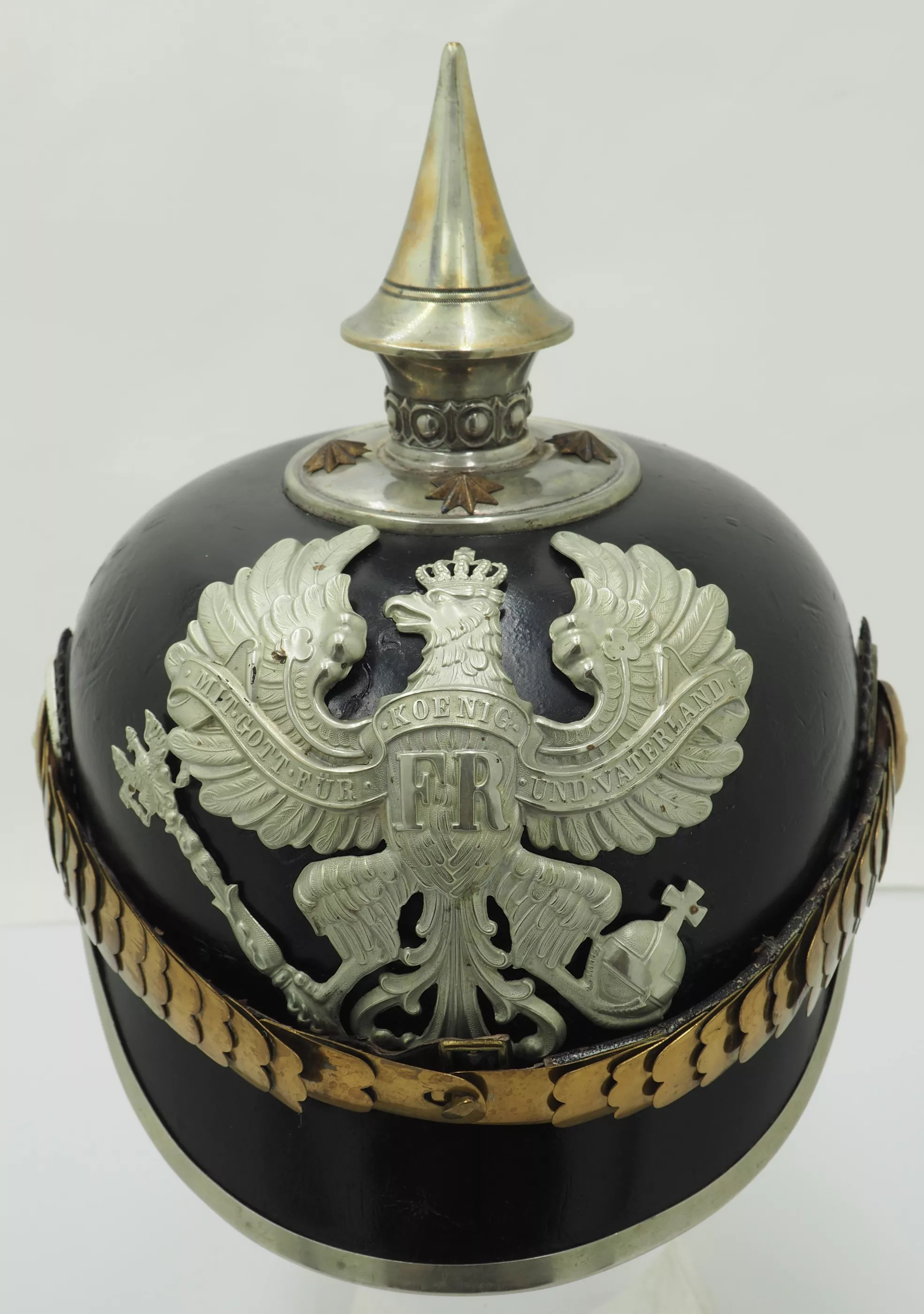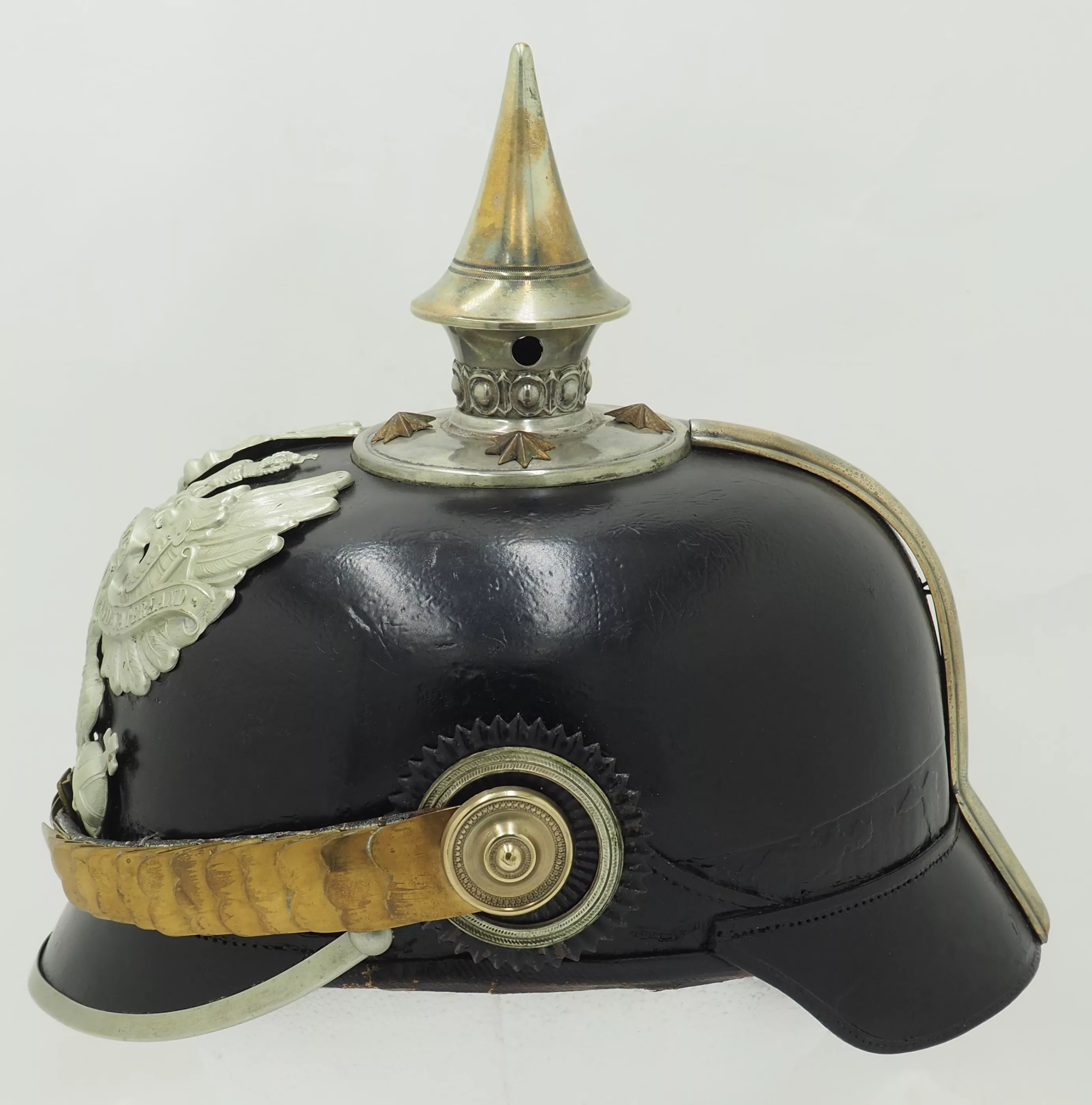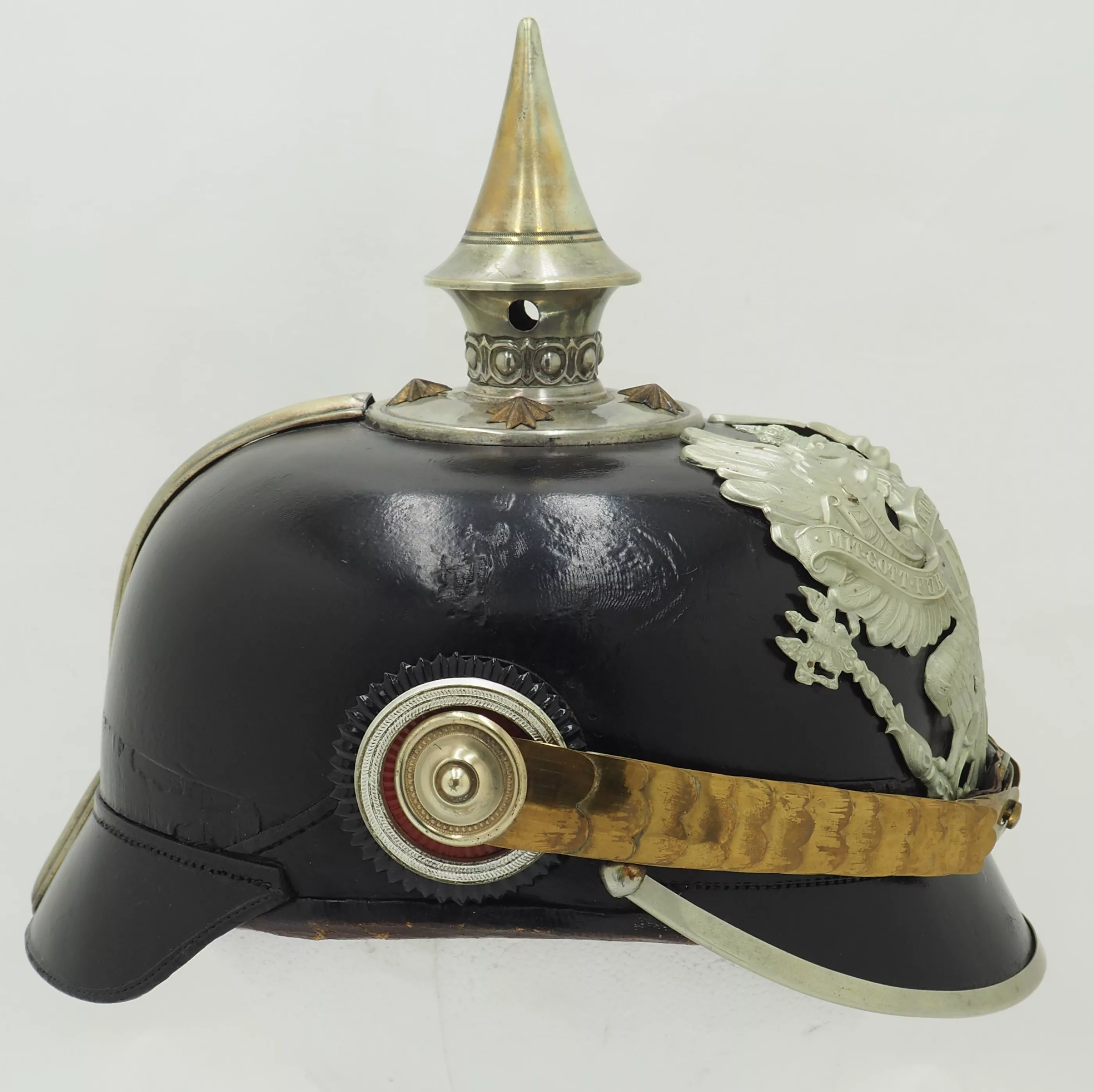 Prussian Pioneer Line Battalions - Officer Model 1897. From the Rich Ames Collection. Black lacquered fiber helmet body with silver metal trim. The helmet body has excellent form and firm stitching. The exterior lacquer has bright and near perfect finish. No extra holes in the helmet body. Green and Red lined front and back visors respectively. The helmet has officer style sweat leather and silk headliner. The frontplate is the Prussian Line Officers Eagle with silver frosting. Round silver Officers base held by 4 gilt stars. The spike does not unscrew. Flat gilt chinscales held by Silver rosettes. Office rs Prussian and Reichs Cockades. Beautiful and outstanding conditioned fiber helmet from the wartime era.