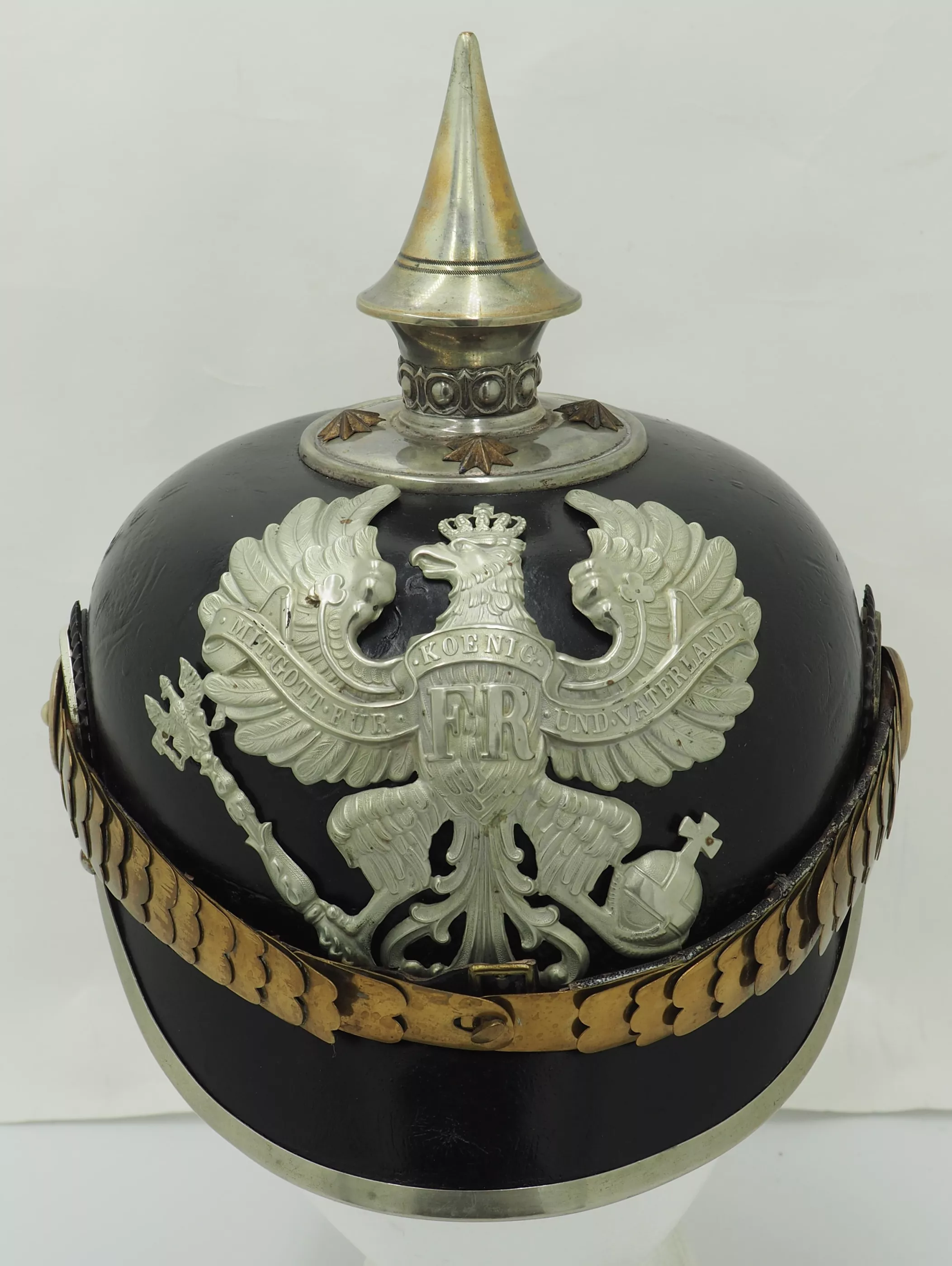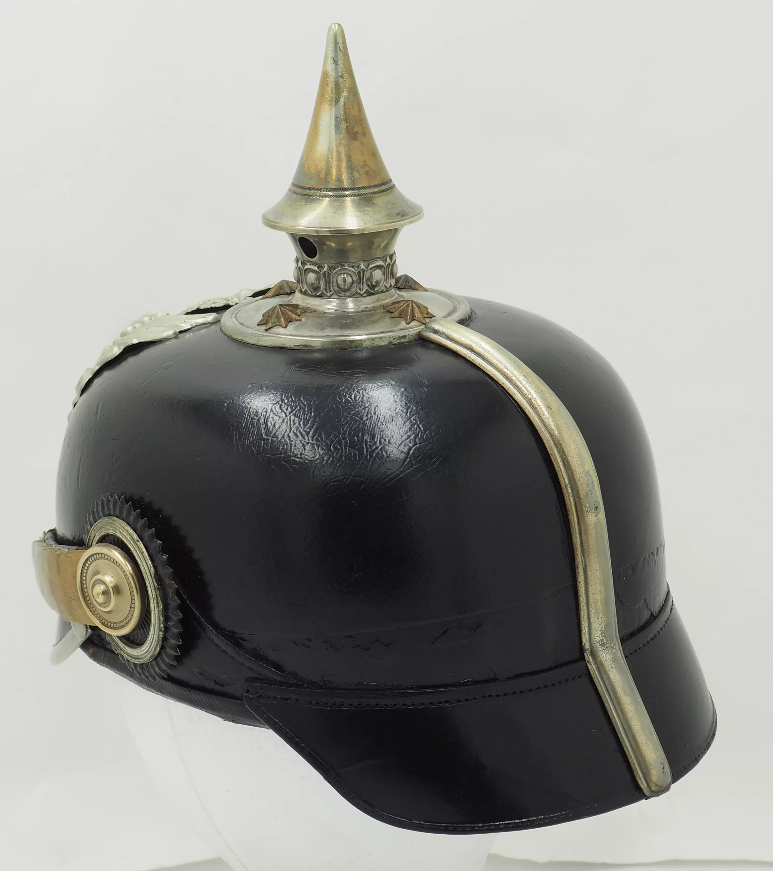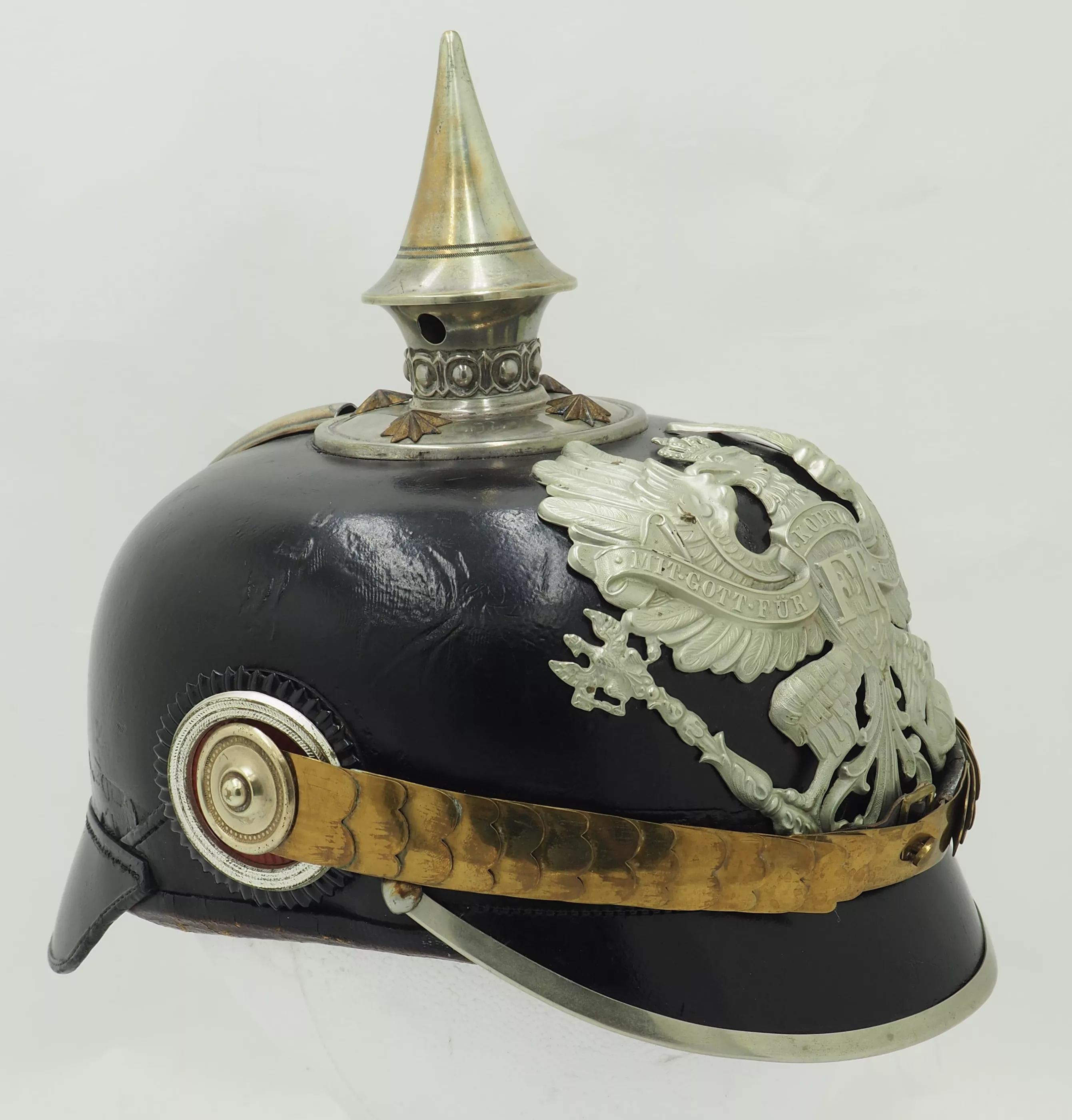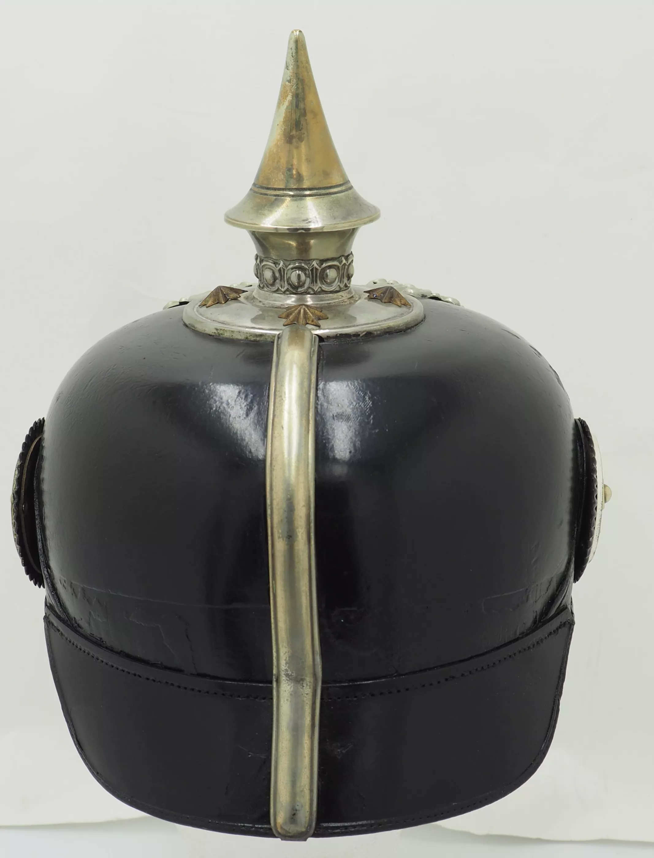 Prussian Pioneer Line Battalions - Officer Model 1897. From the Rich Ames Collection. Black lacquered fiber helmet body with silver metal trim. The helmet body has excellent form and firm stitching. The exterior lacquer has bright and near perfect finish. No extra holes in the helmet body. Green and Red lined front and back visors respectively. The helmet has officer style sweat leather and silk headliner. The frontplate is the Prussian Line Officers Eagle with silver frosting. Round silver Officers base held by 4 gilt stars. The spike does not unscrew. Flat gilt chinscales held by Silver rosettes. Office rs Prussian and Reichs Cockades. Beautiful and outstanding conditioned fiber helmet from the wartime era.