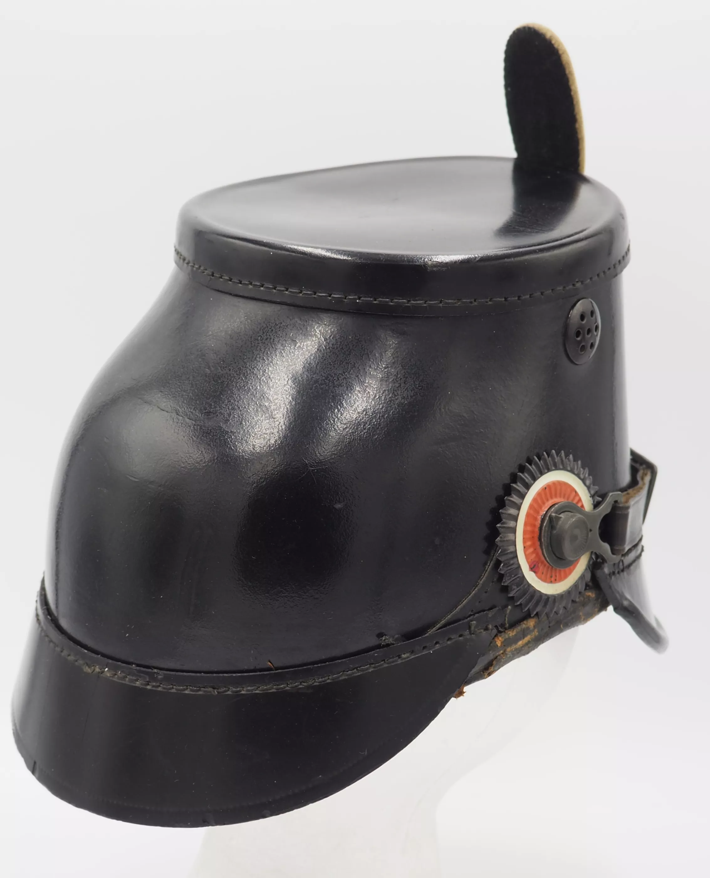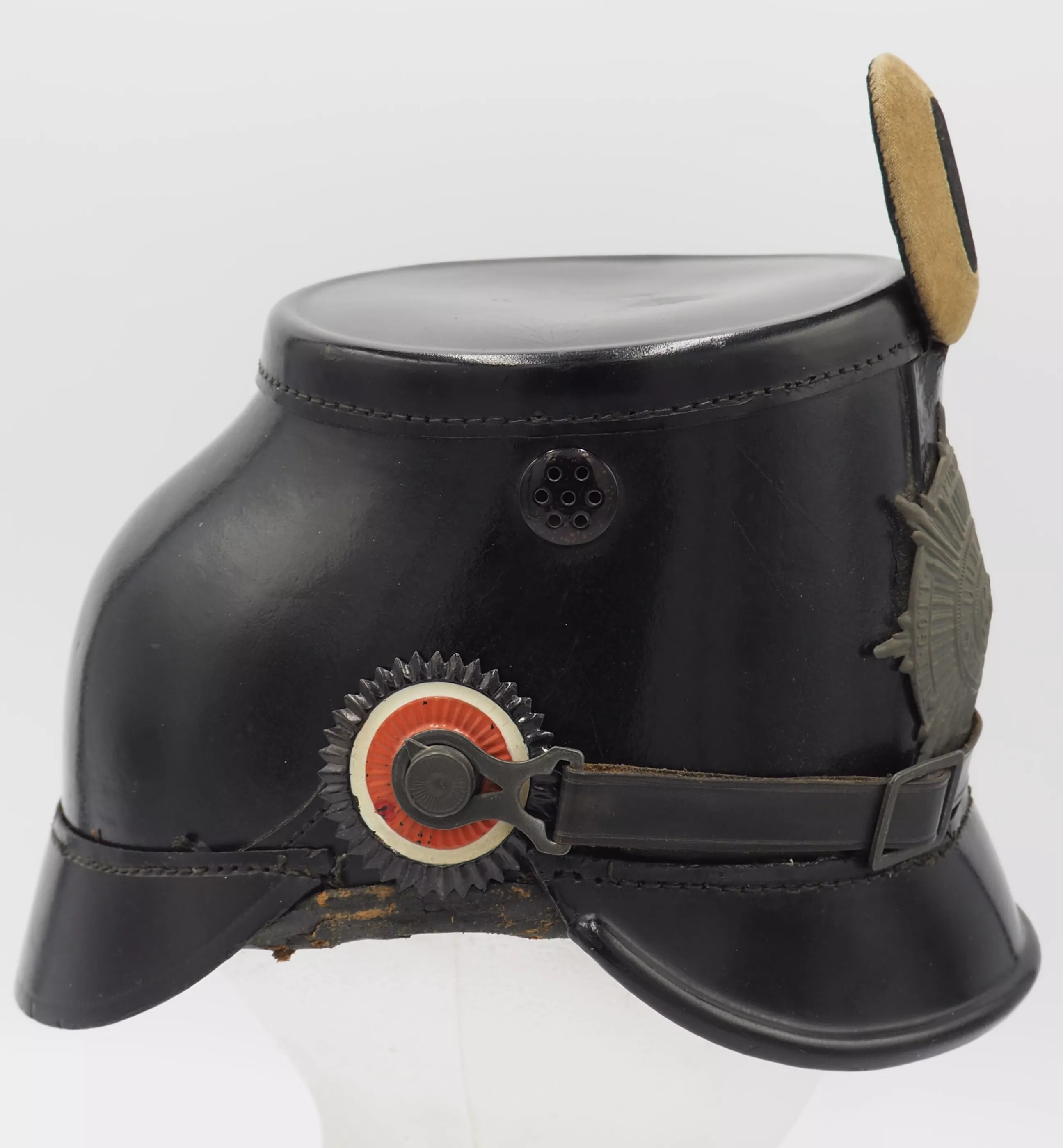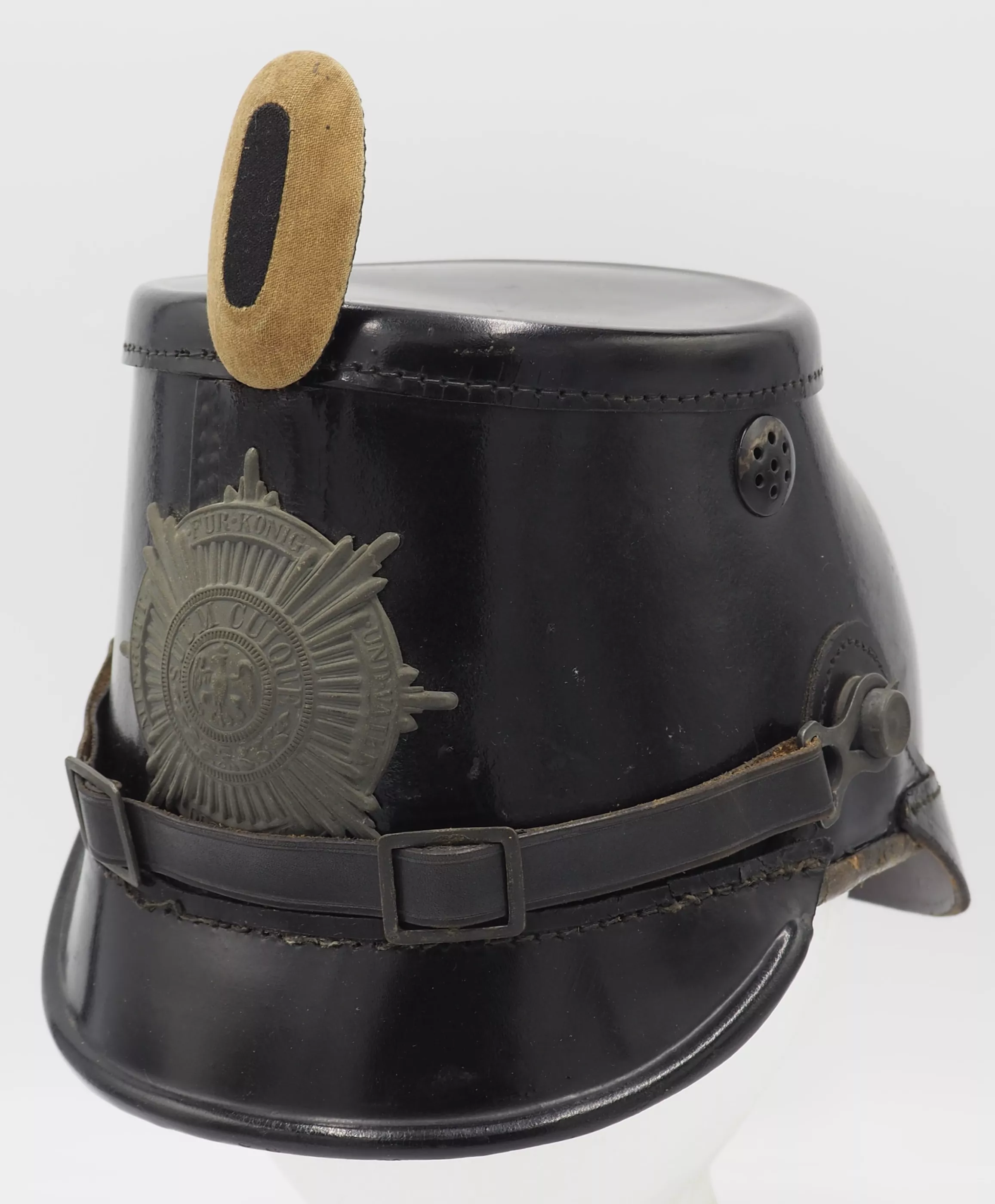 Prussian Guard Jaeger Enlisted man Model 1915. Black leather Shako body with field gray metal trim. The leather body has perfect form and firm stitching. Exterior finish is almost mirror finish. No extra holes. The Prussian Guard Star frontplate has the original leather wedges fixed to it. Leather EM style liner. There are numerous marks inside the helmet bell with a 1915 darwe. Original chinstrap & Reichs cockade. Original Prussian field badge. Beautiful wartime near MINT conditioned Jaeger shako.