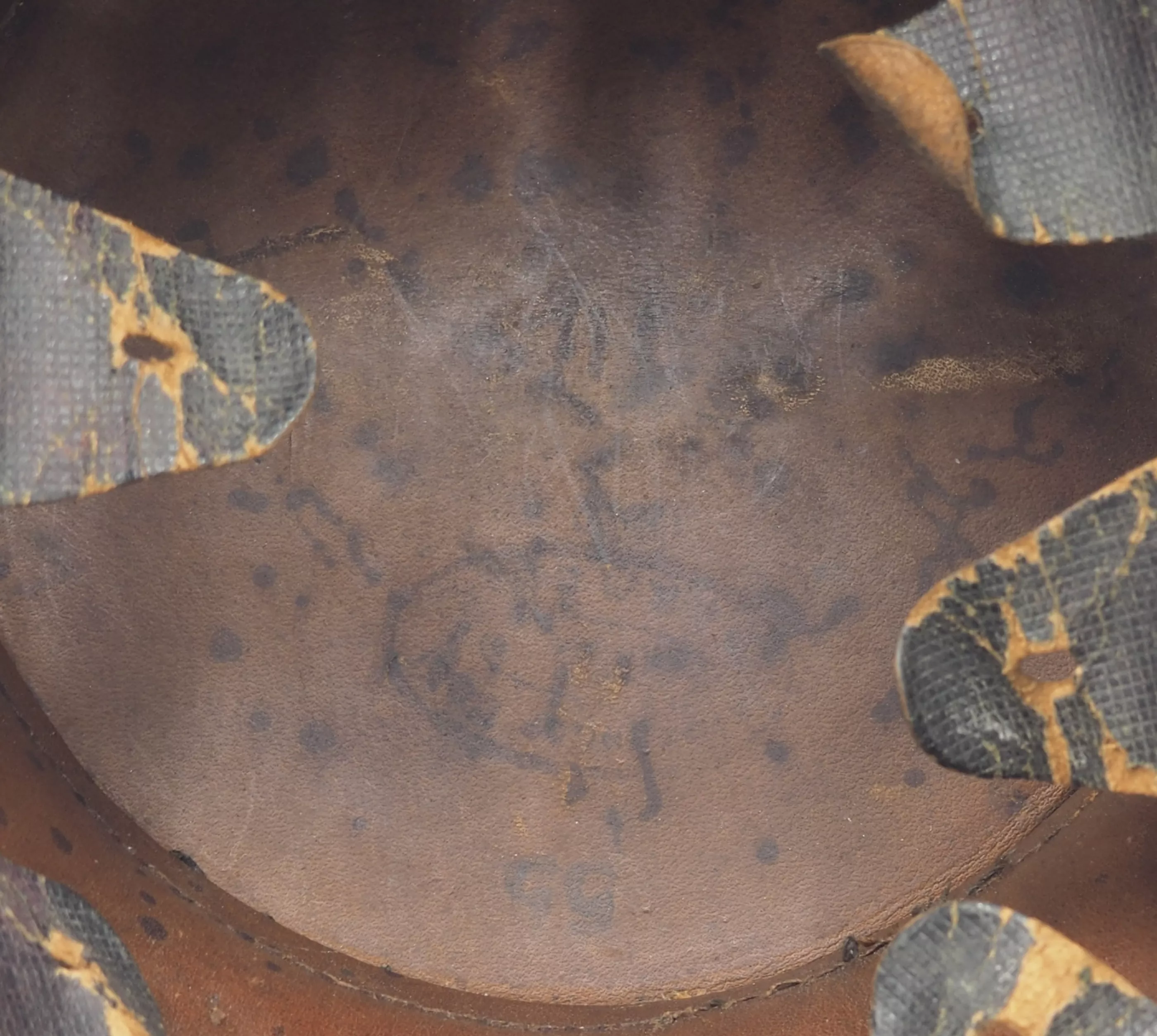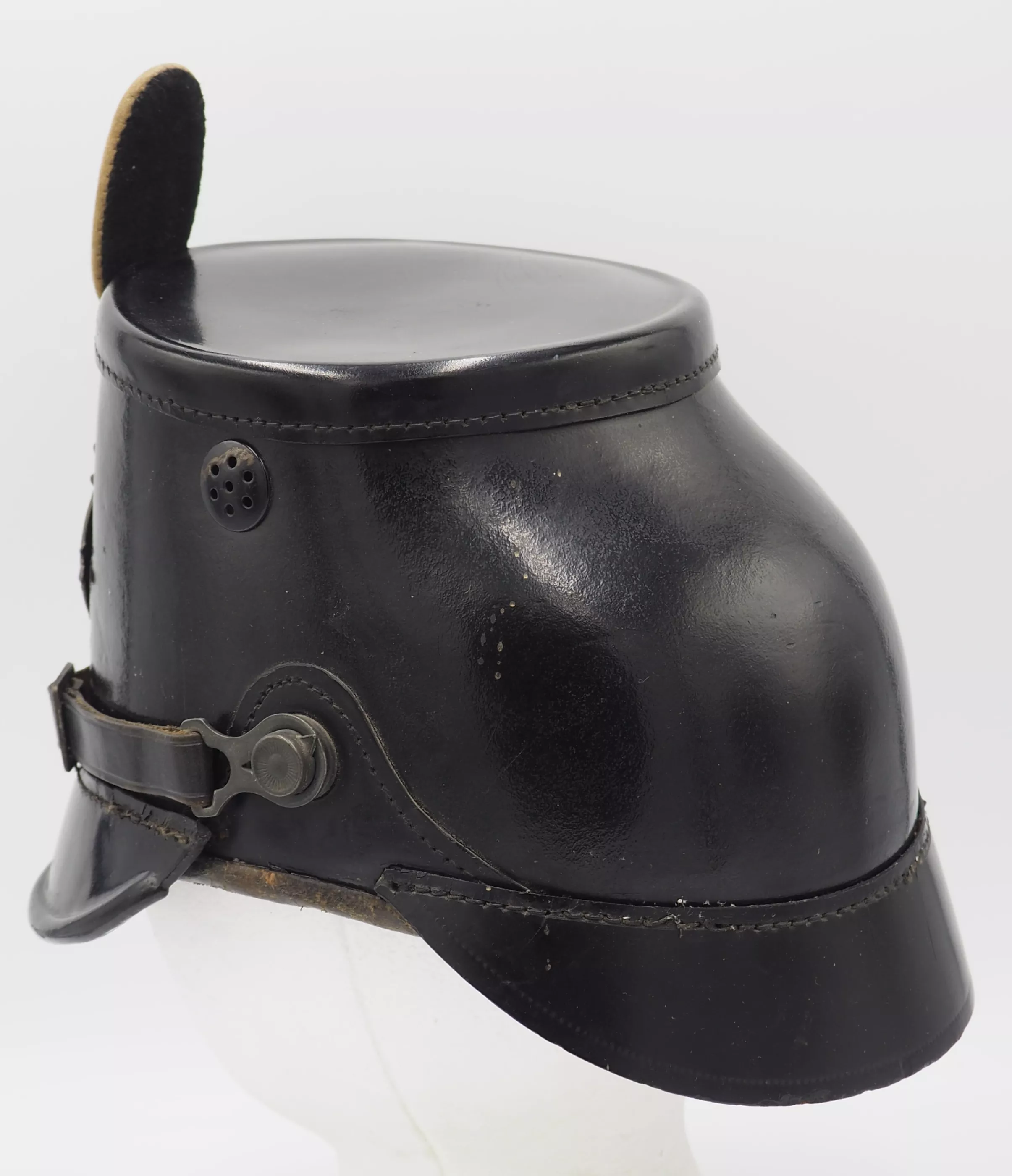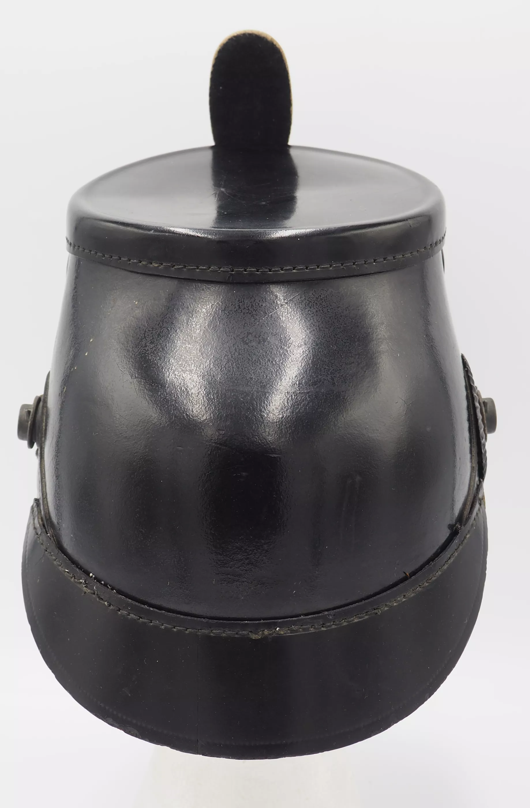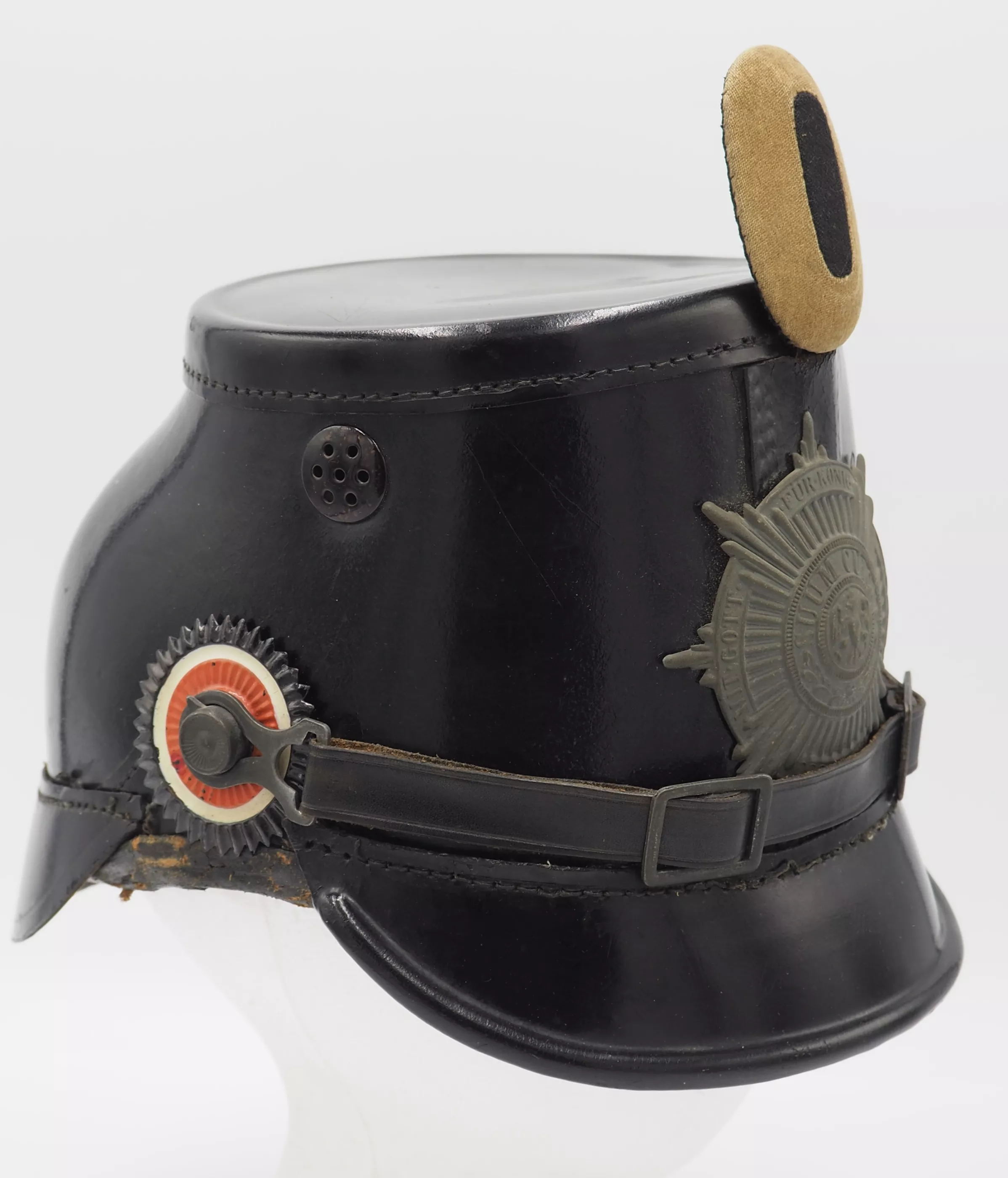 Prussian Guard Jaeger Enlisted man Model 1915. Black leather Shako body with field gray metal trim. The leather body has perfect form and firm stitching. Exterior finish is almost mirror finish. No extra holes. The Prussian Guard Star frontplate has the original leather wedges fixed to it. Leather EM style liner. There are numerous marks inside the helmet bell with a 1915 darwe. Original chinstrap & Reichs cockade. Original Prussian field badge. Beautiful wartime near MINT conditioned Jaeger shako.