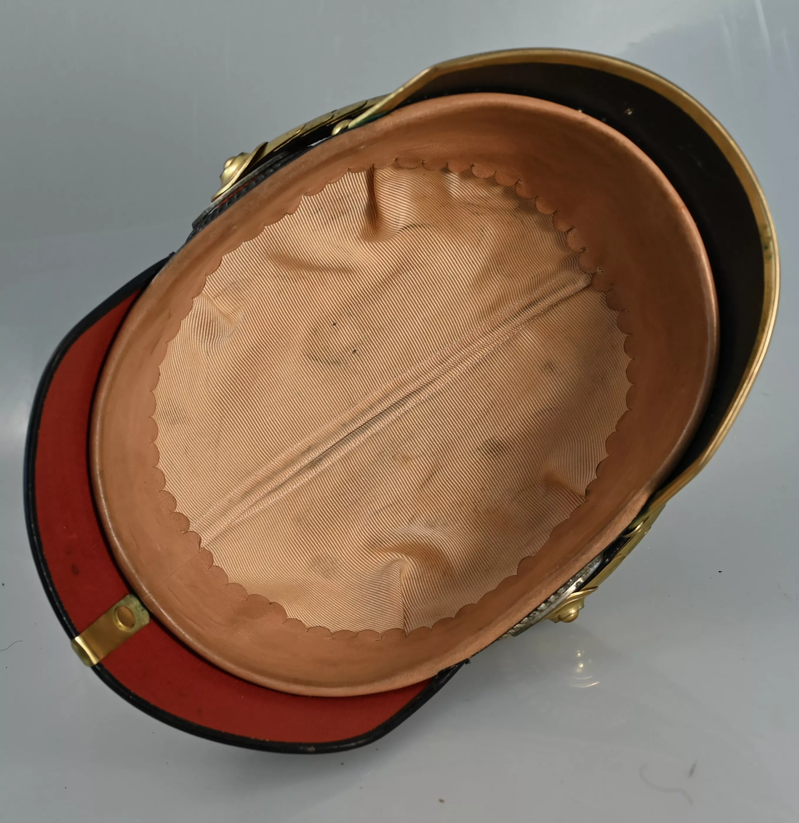 Bavarian Cavalry Officer Model 1897 Pickelhaube. Beautiful and absolutely virgin and untouched. Black lacquered leather helmet body with fire gilt trim. Helmet body has excellent form and firm stitching. Exterior lacquer still has its polished sheen in MINT condition. Interior has the officer sweat leather and beige colored silk headliner in absolute MINT condition. Square front visor lined in green, back visor lined red. No extra holes in helmet body.