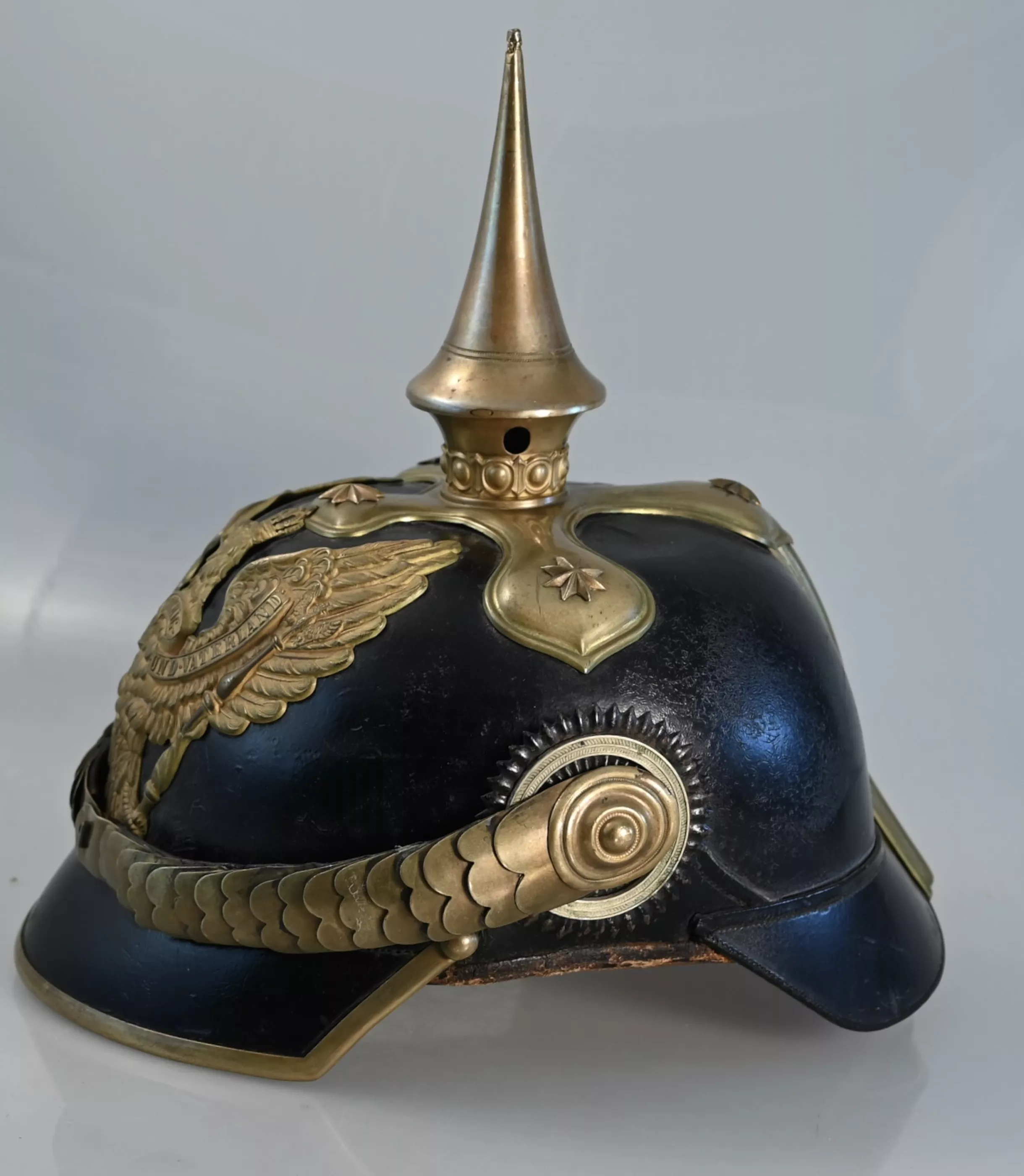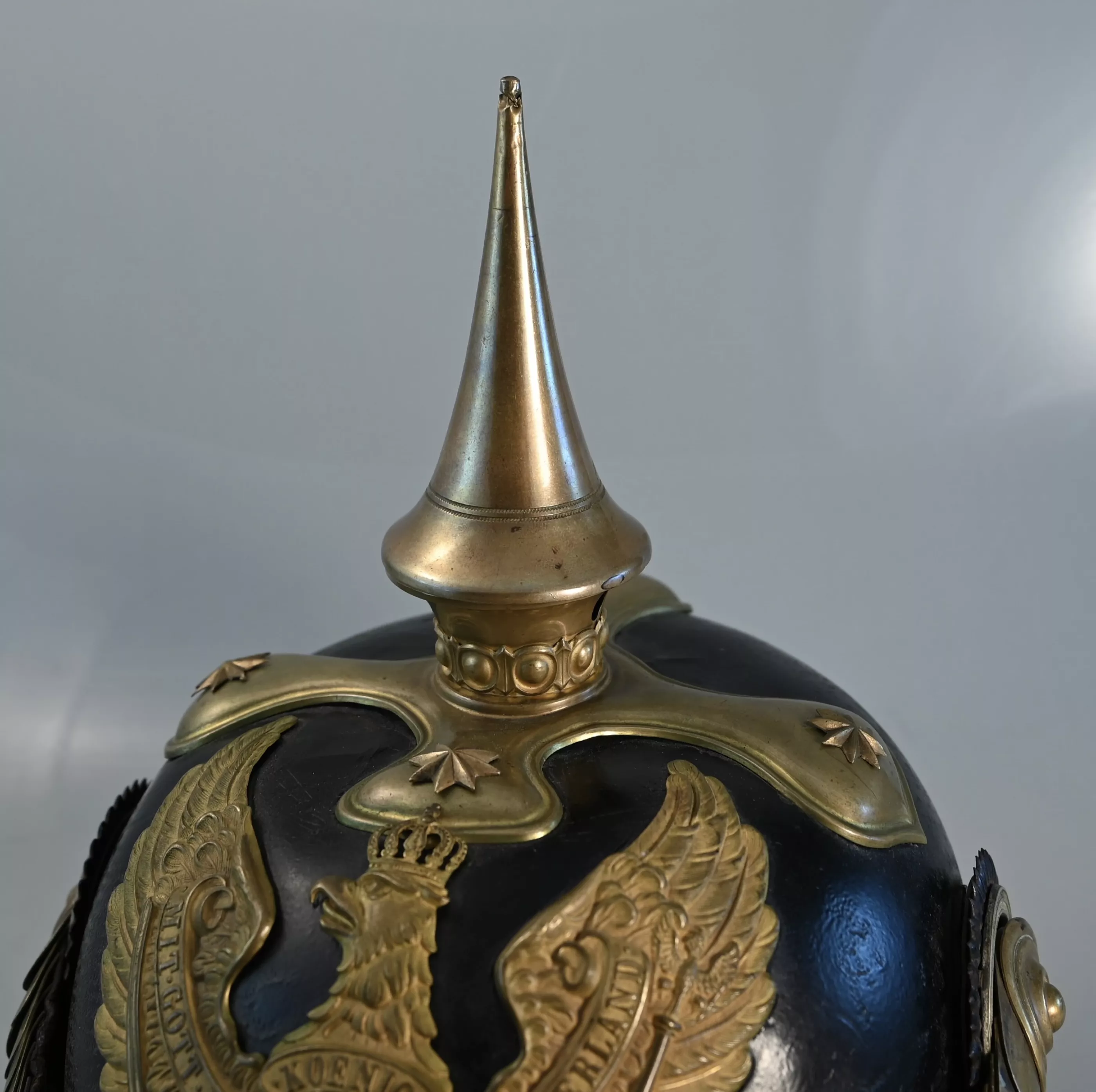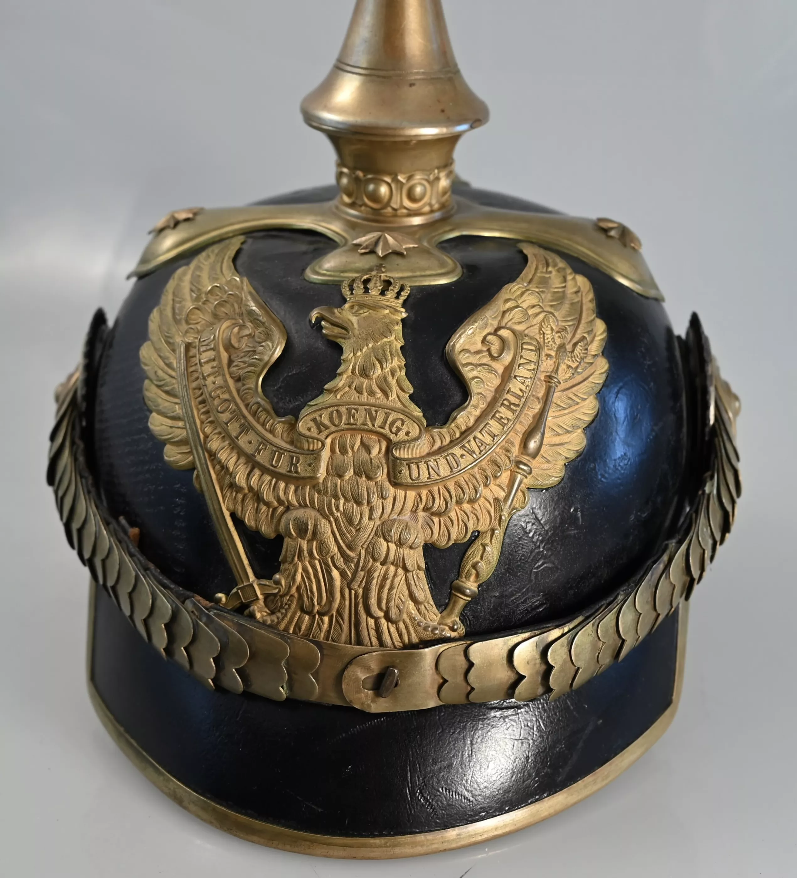 No extra holes in helmet body. The frontplate is the standard gilded Prussian Dragoon style Eagle with its original fire gilt frosting. The front plate fits the helmet to a perfect fit and left deep marks in lacquered leather. Fine brass crossed spike base fiited with a smooth spike that unscrews for parade. Heavy rounded chinscales on rosettes. Both Prussian and Reichs Officer cockade. Beautiful fine quality Dragoon Officer Pickelhaube.