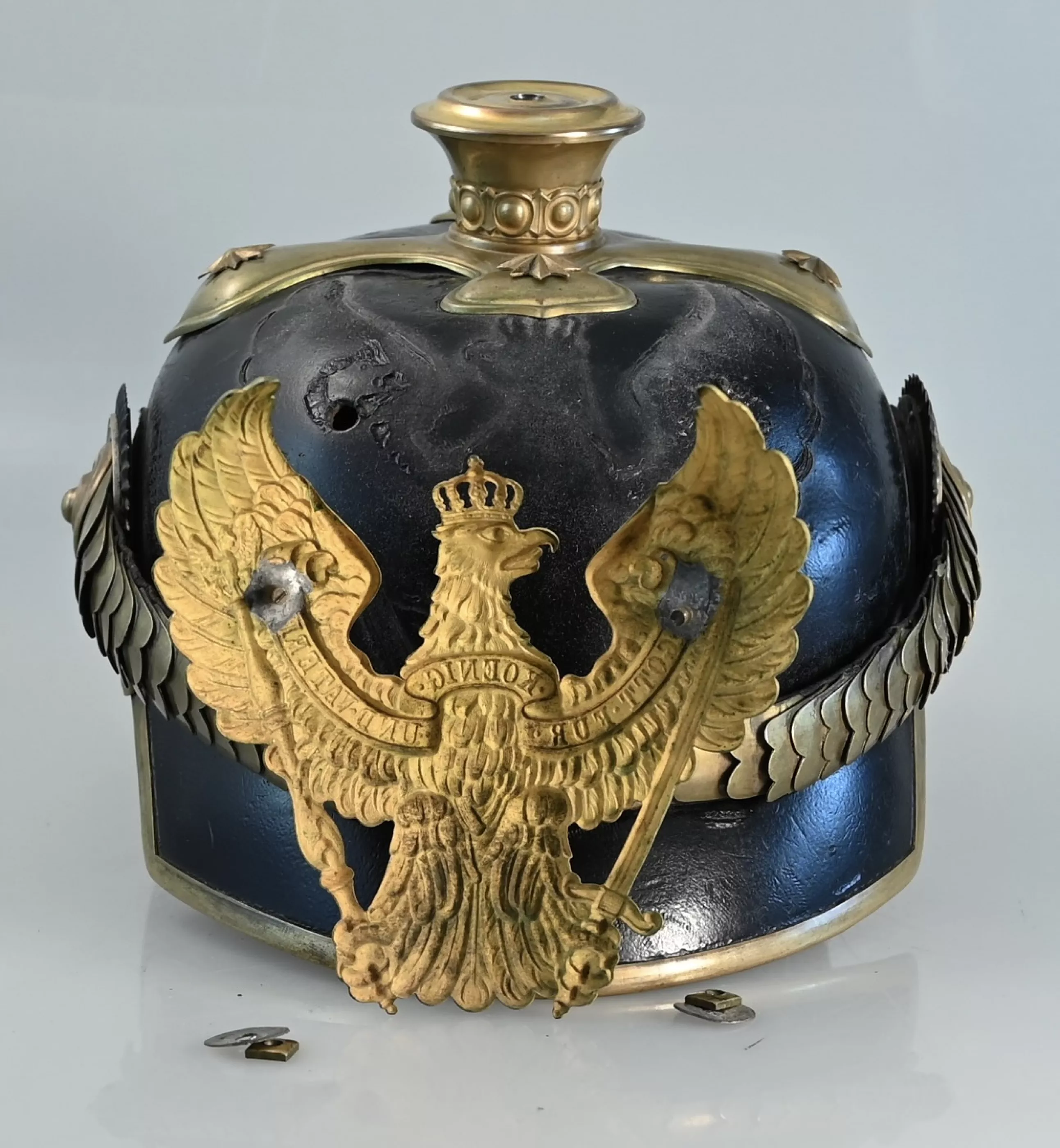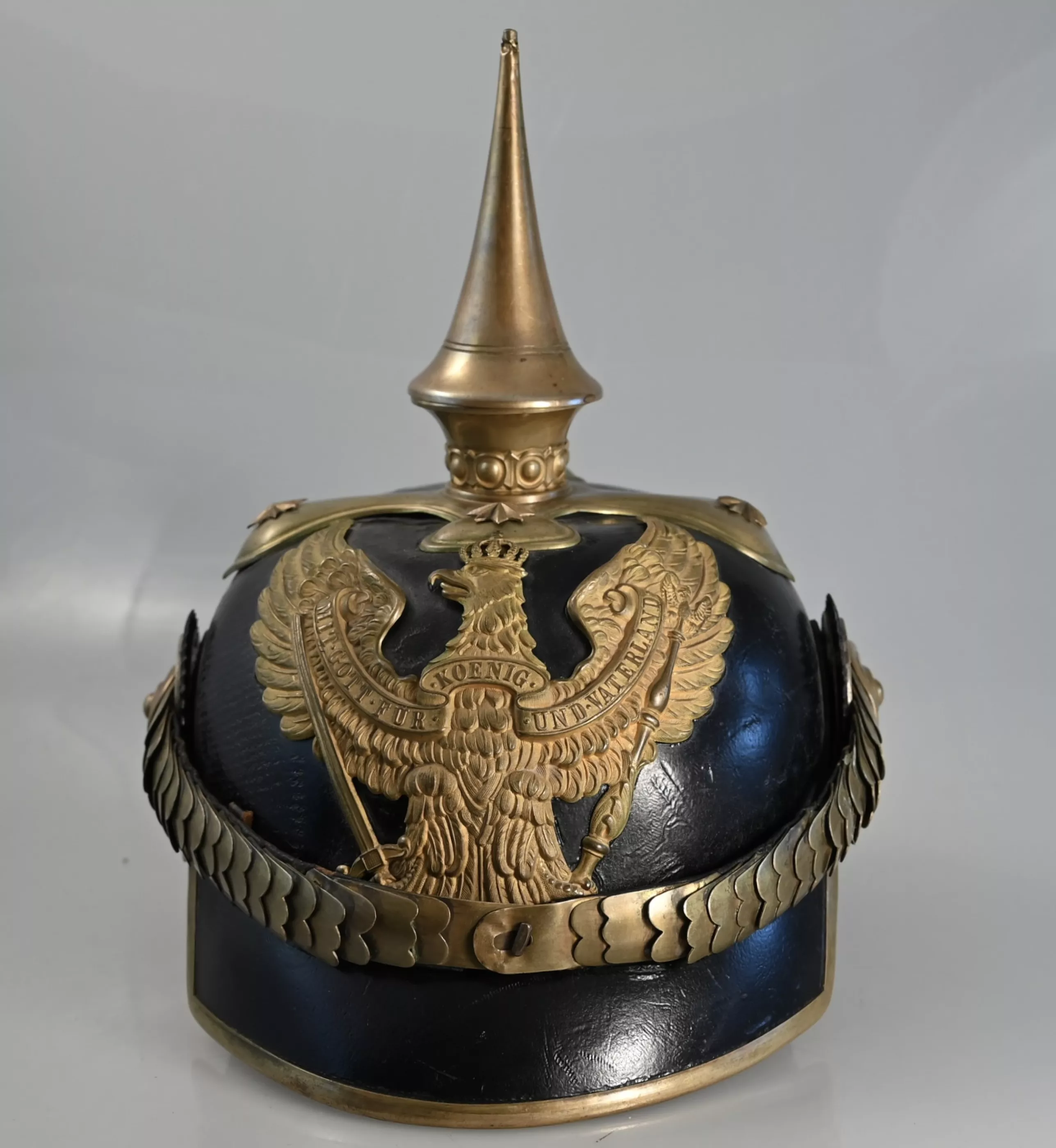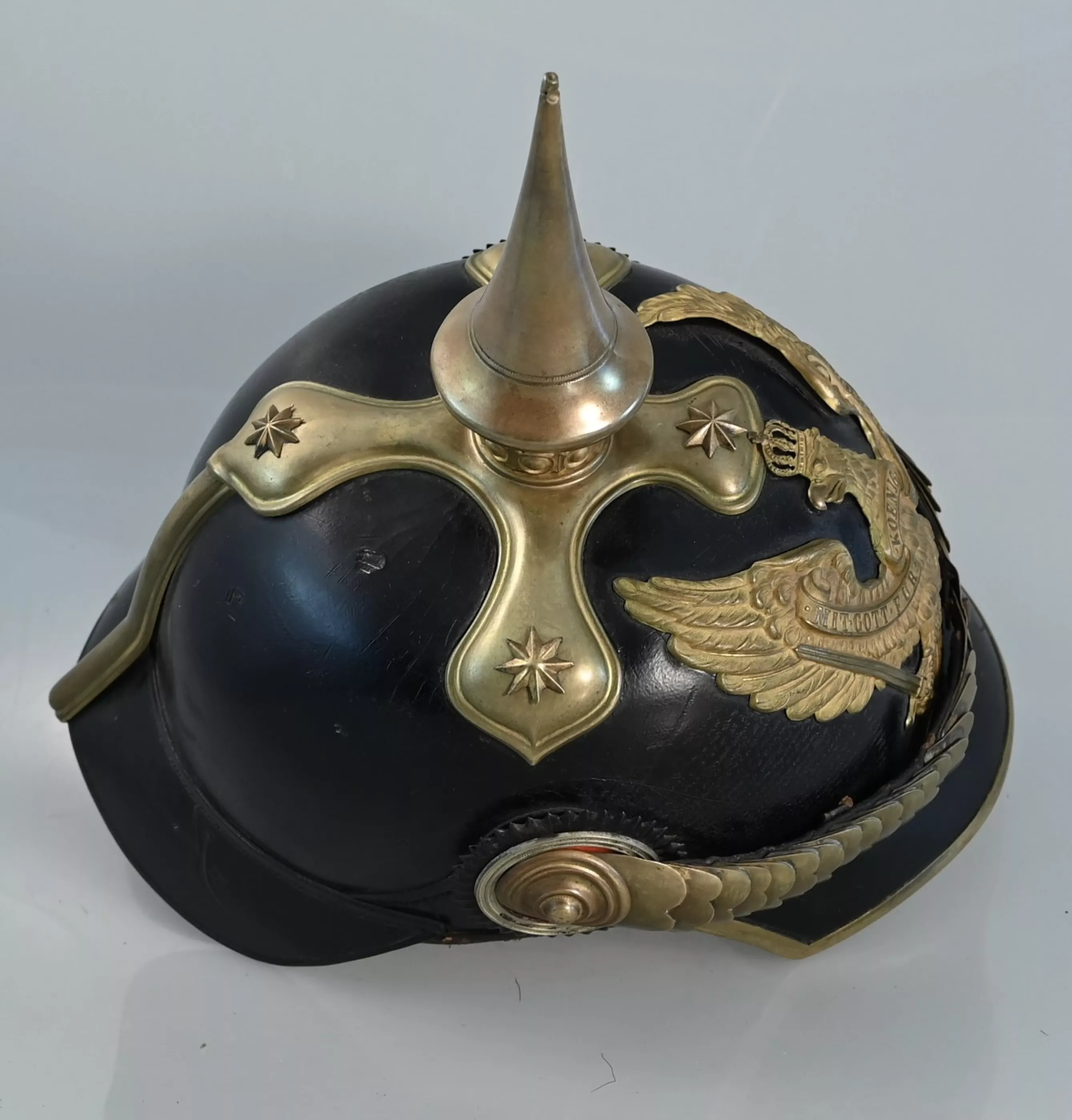 No extra holes in helmet body. The frontplate is the standard gilded Prussian Dragoon style Eagle with its original fire gilt frosting. The front plate fits the helmet to a perfect fit and left deep marks in lacquered leather. Fine brass crossed spike base fiited with a smooth spike that unscrews for parade. Heavy rounded chinscales on rosettes. Both Prussian and Reichs Officer cockade. Beautiful fine quality Dragoon Officer Pickelhaube.