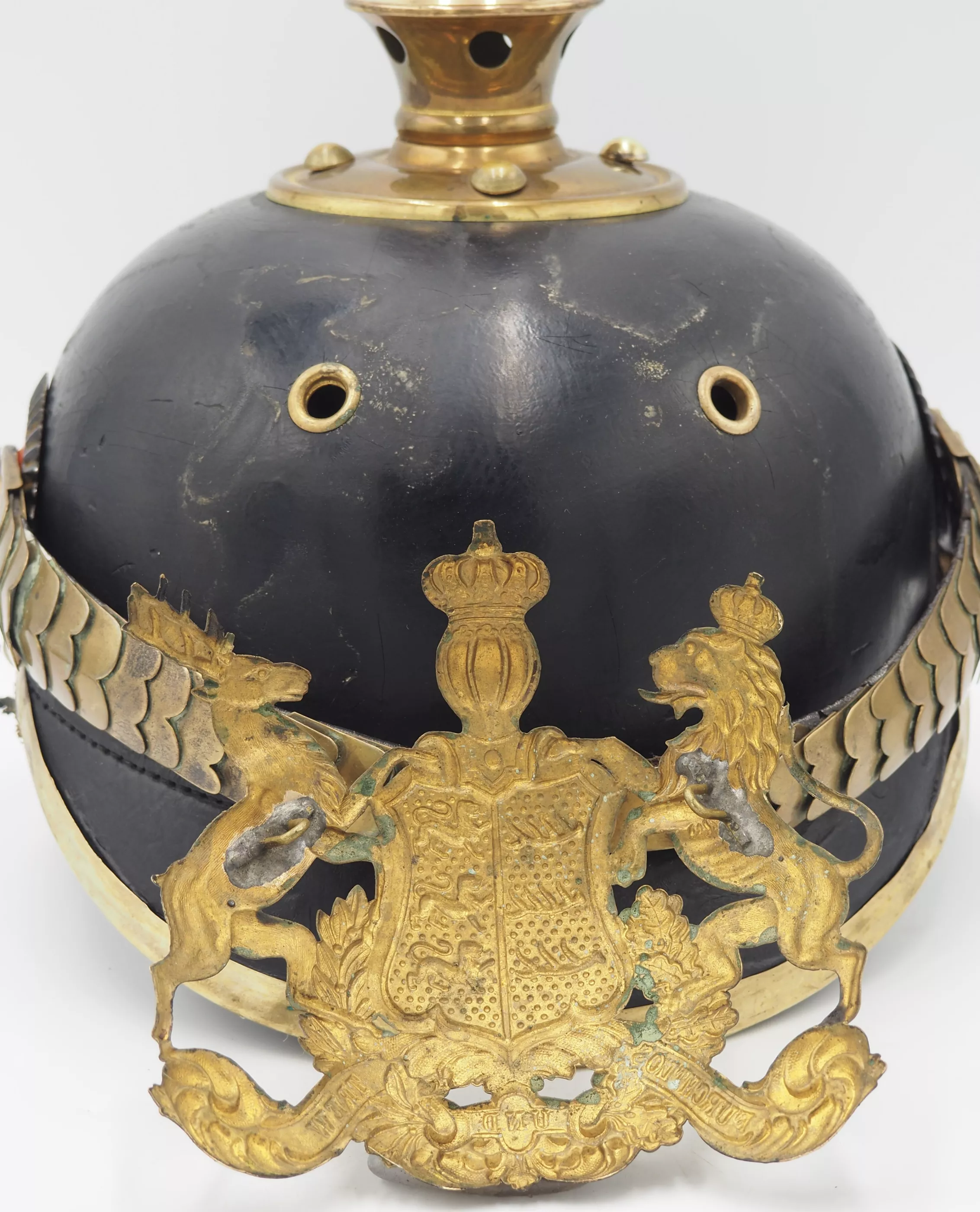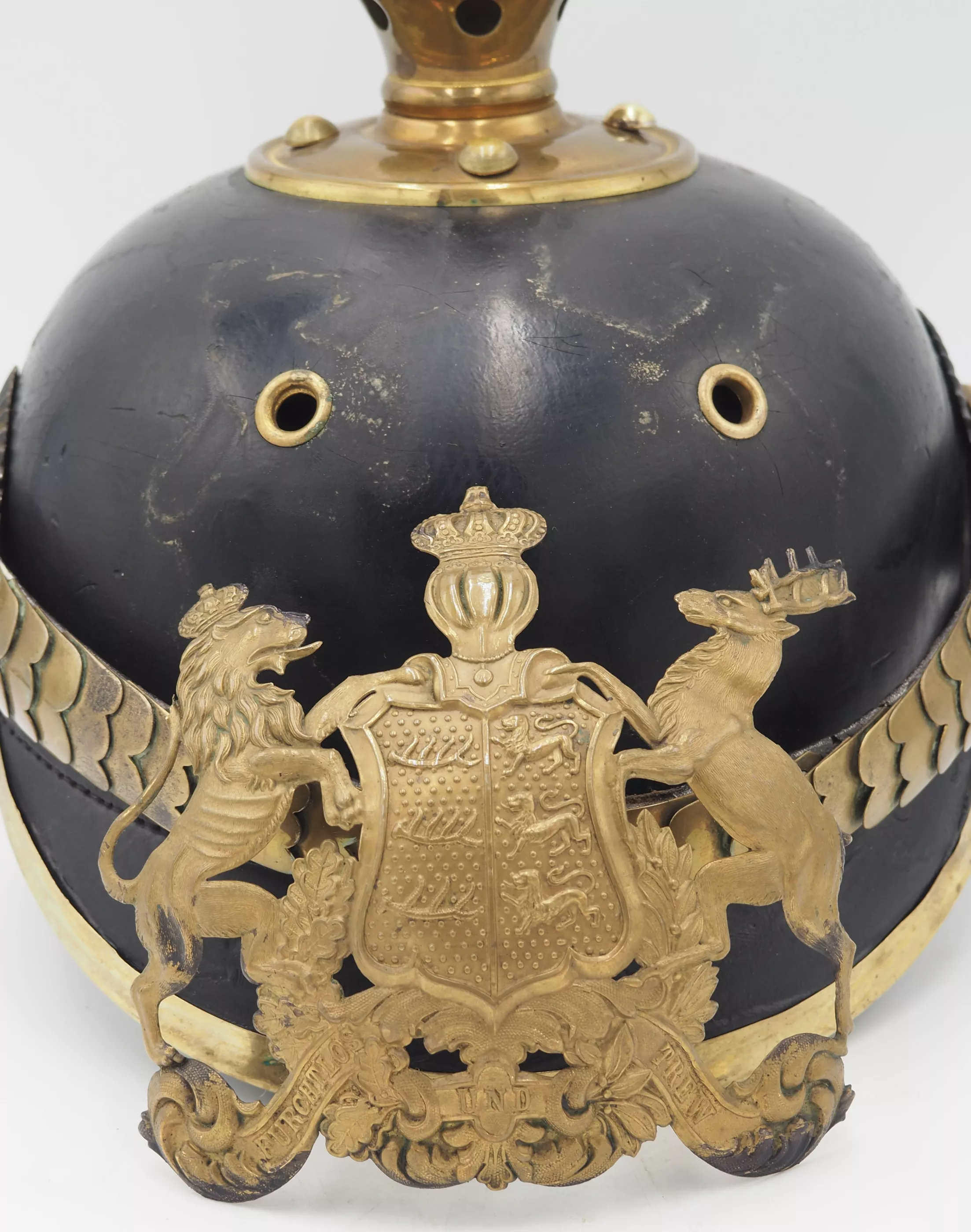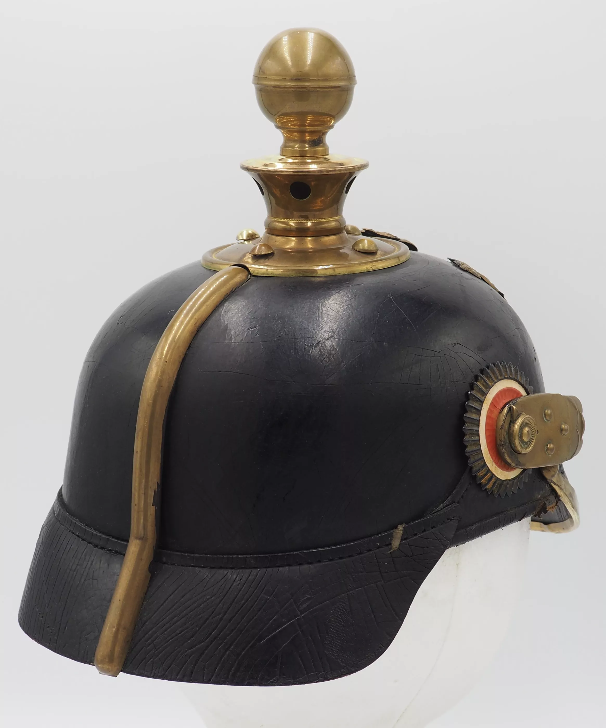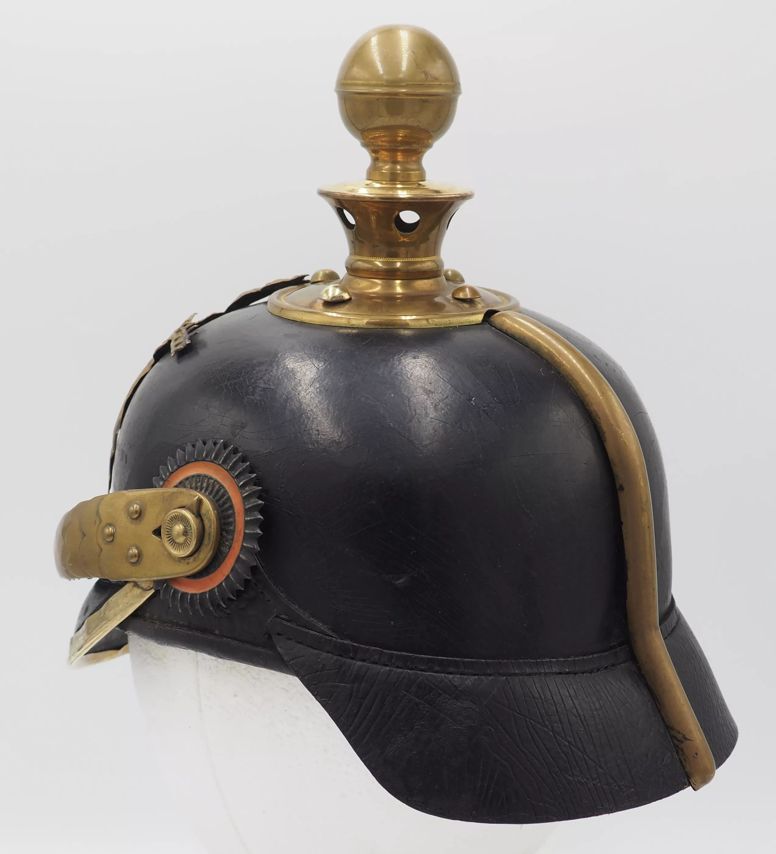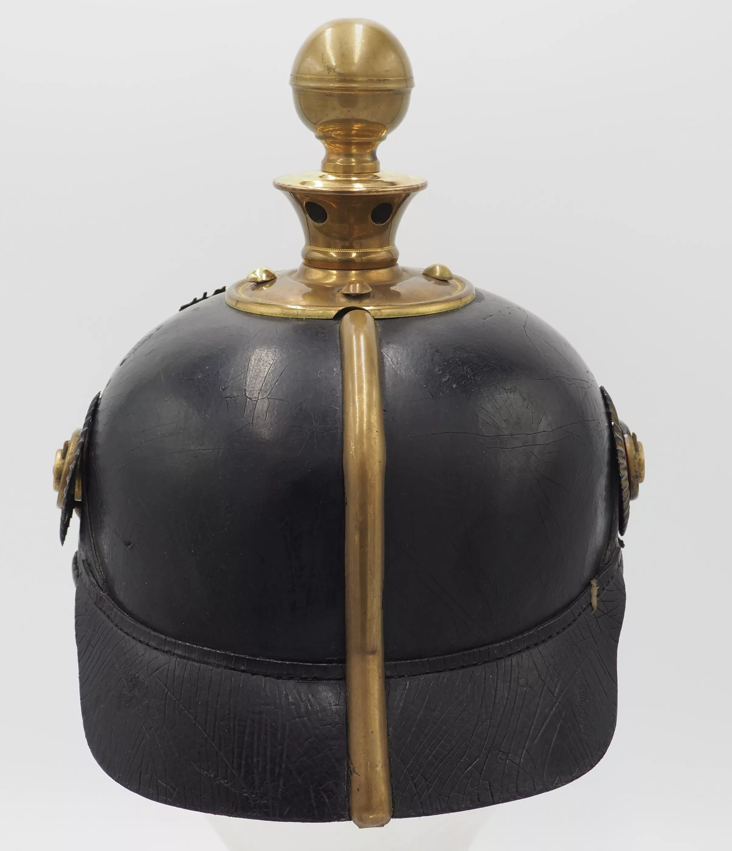 Wuerttemberg Field Artillery EM (Private Purchase) Model 1895. Black lacquered leather helmet body with fine quality brass trim. Helmet has perfect form and firm stitching. Leather helmet body has fine exterior lacquer. Interior liner is the classic EM black tongue liner that is still supple with age. Interior visors are plain leather with no markings. No extra holes in the helmet body.