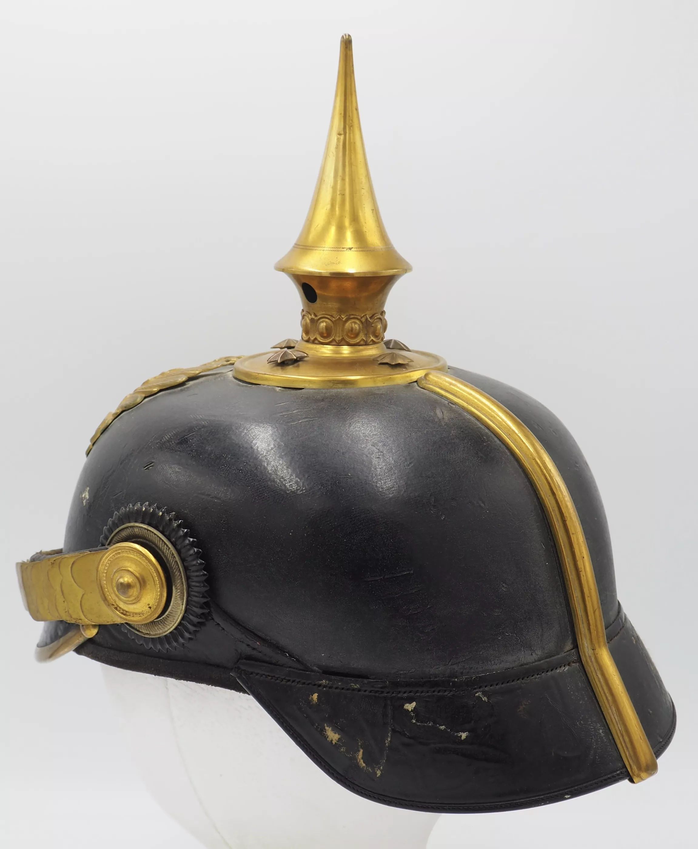 Prussian Line Infantry Officer model 1897. This helmet was recently found at a militaria show in the US. Black lacquered leather helmet body with gilded trim. Trim is an absolut perfect match of a high redish gold colour. The helmet body has excellent form and firm stitching. No extra holes in the helmet body. The interior has sweat leather and silk headliner. Interior visors colored read and green.