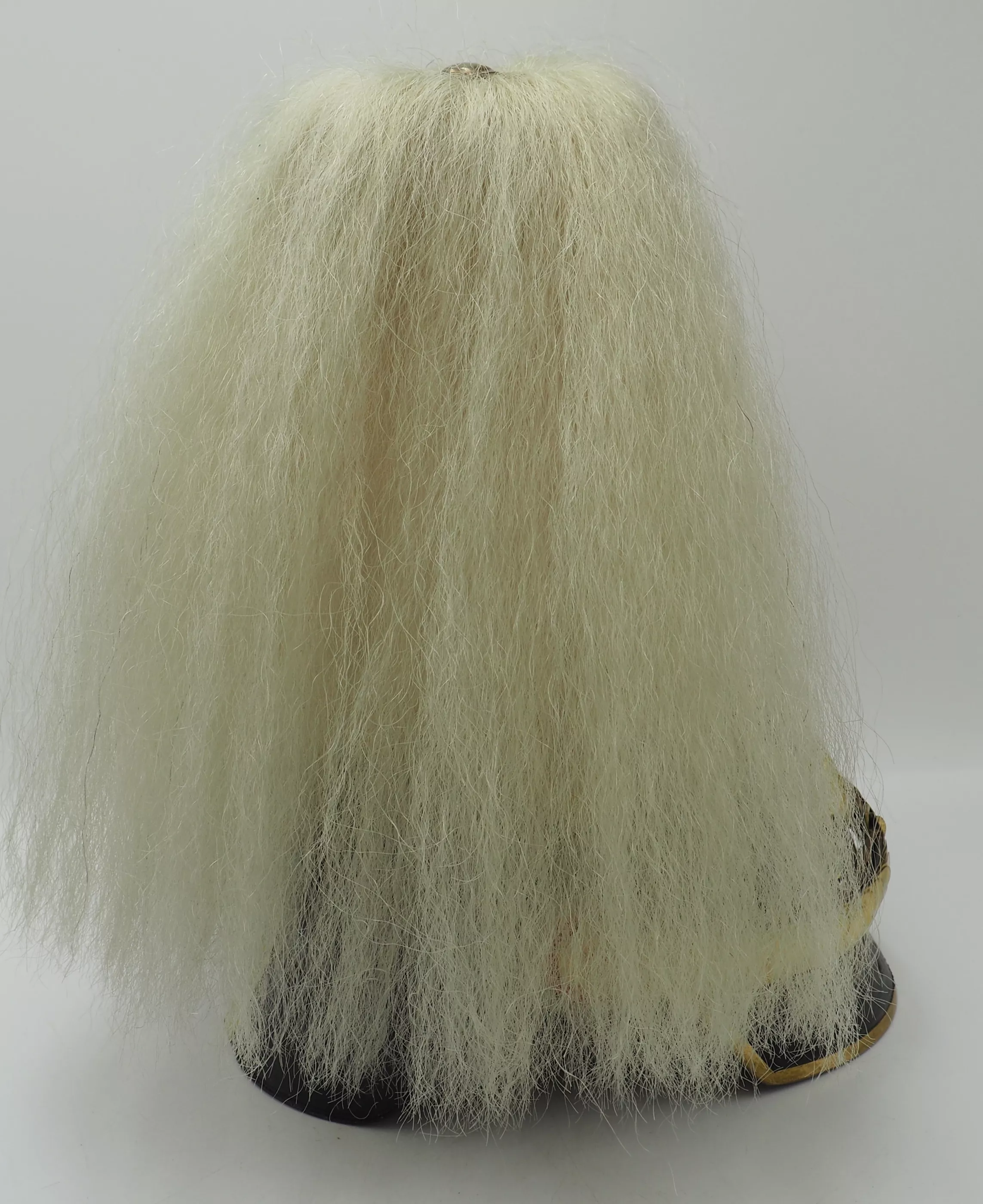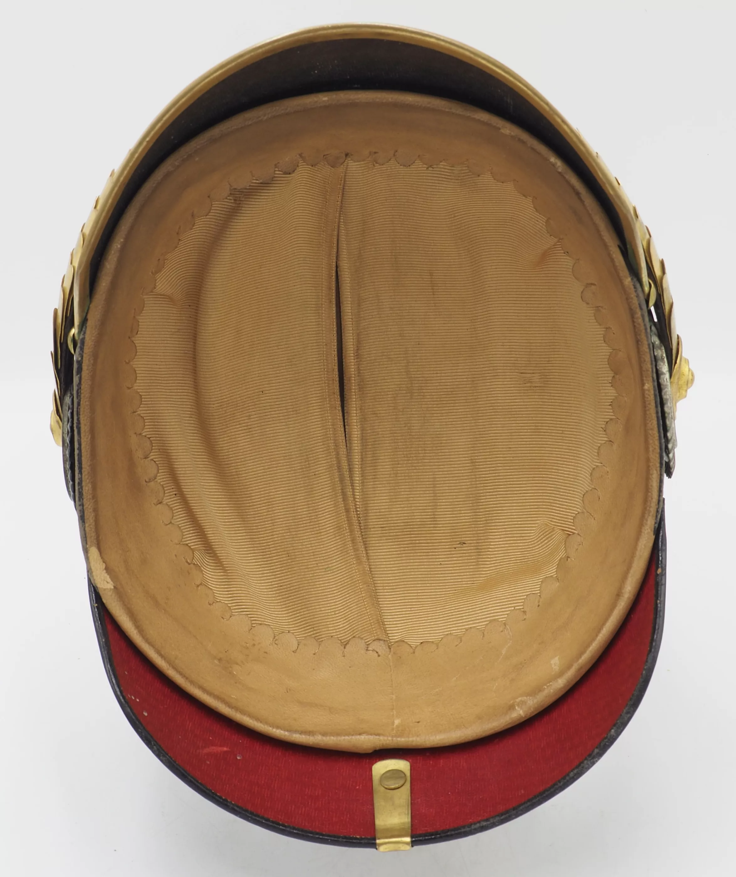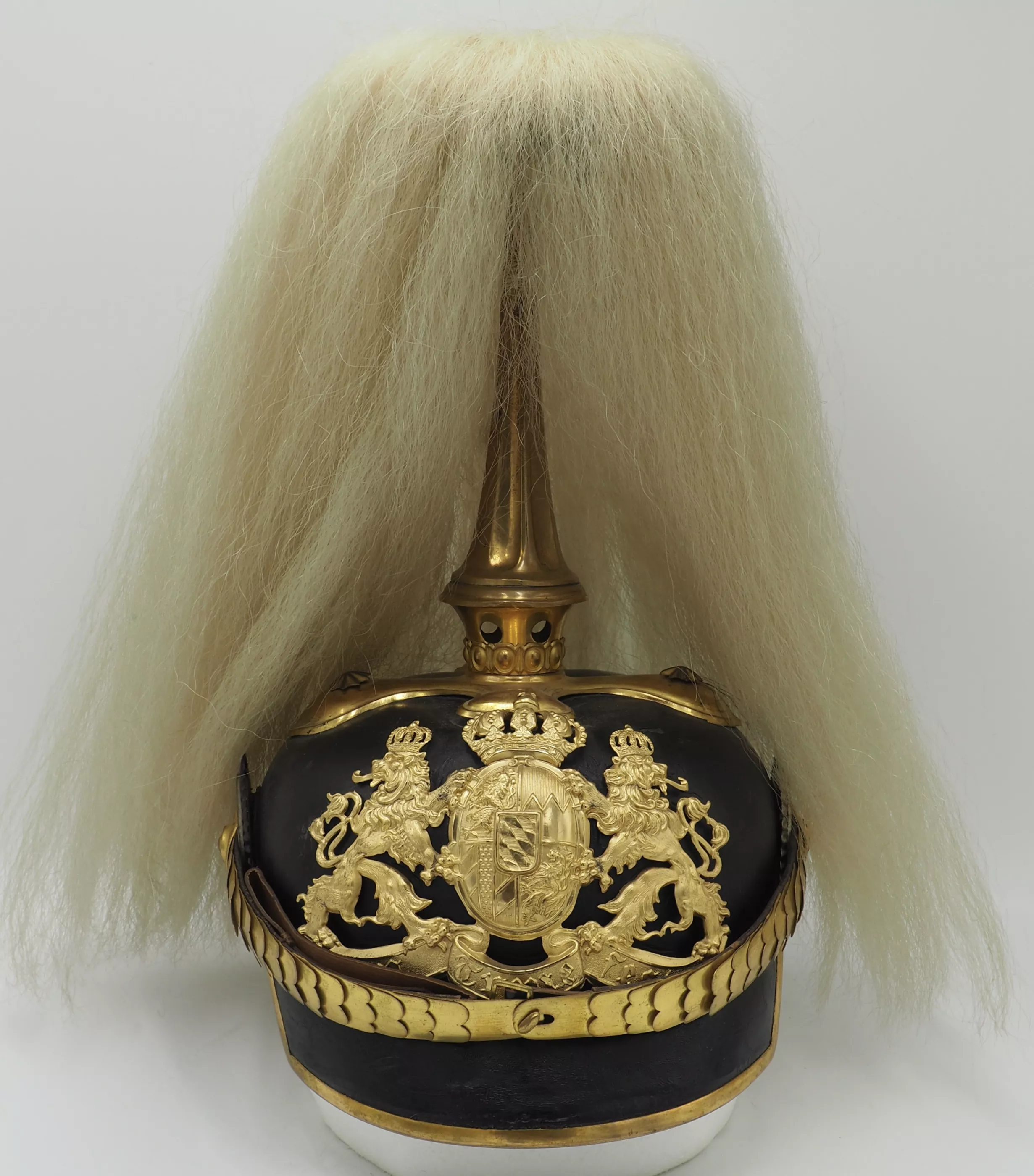Bavarian Chevauxleger (Light Cavalry) Regiments 1,3,5 and 7 - Officer Model with white Yak hair parade plume – Model 1897. Fine leather helmet body and with squared front visor and gold metal trim. Black lacquered leather helmet body with gilded trim. No extra holes in helmet body. Helmet exterior lacquer in near mint condition. The helmet interior has mint sweat leather and silk headliner.