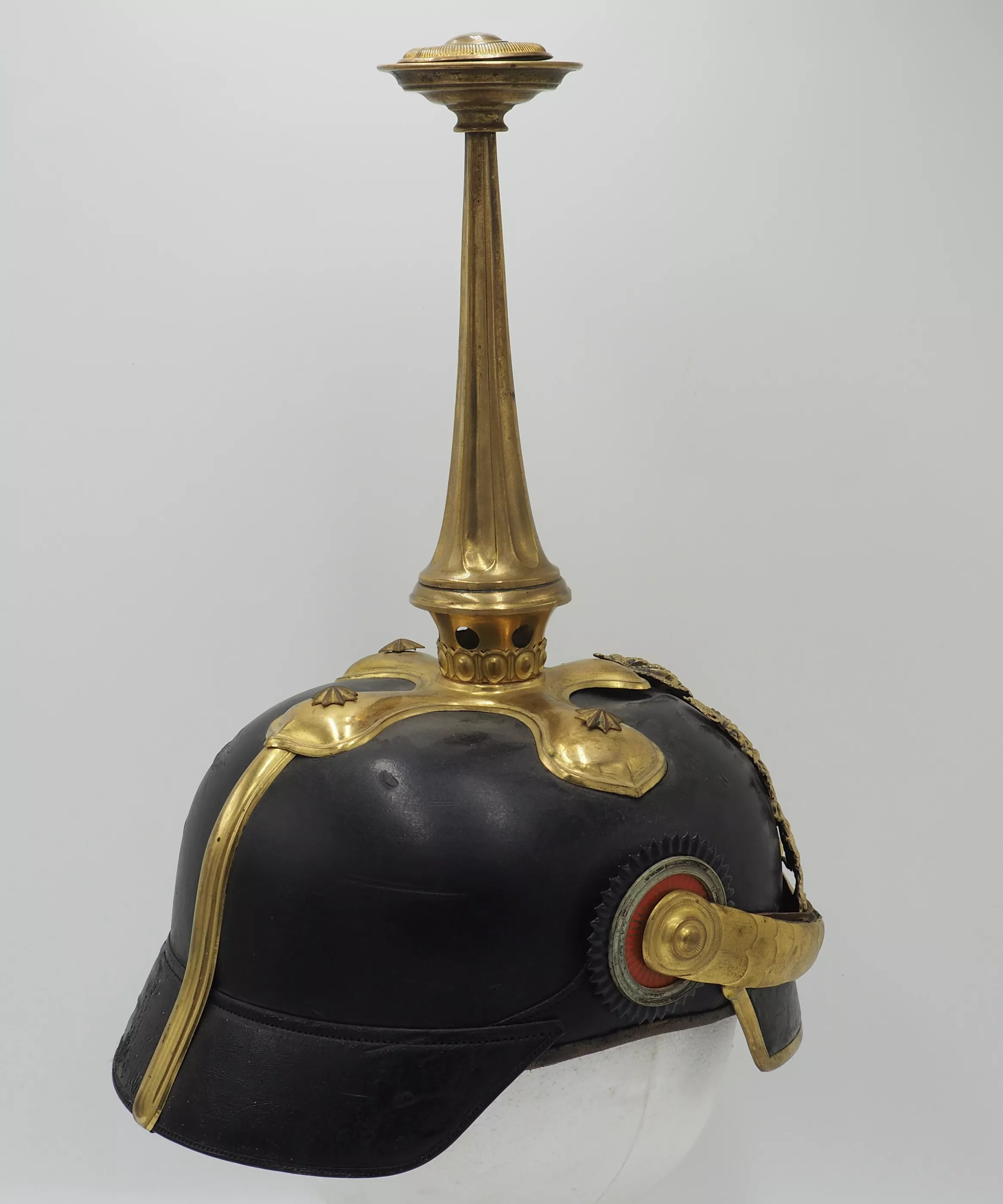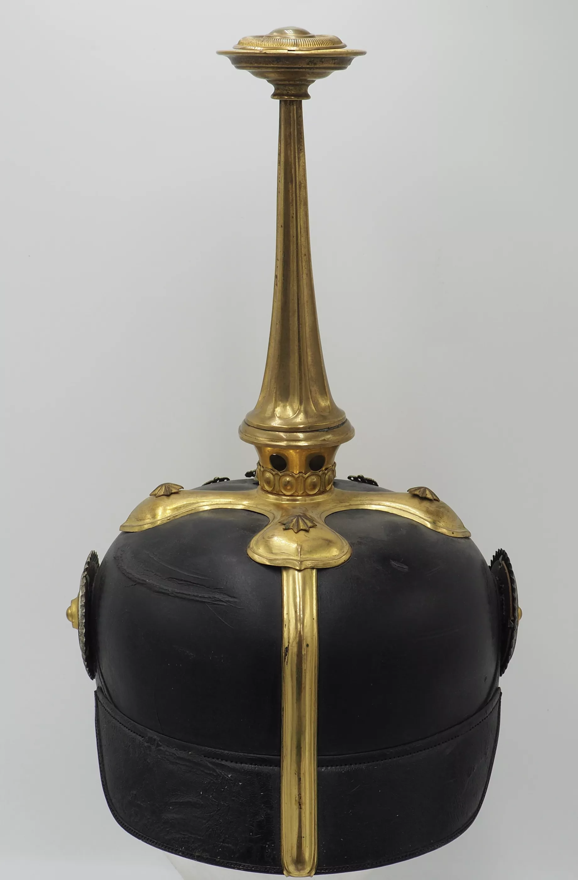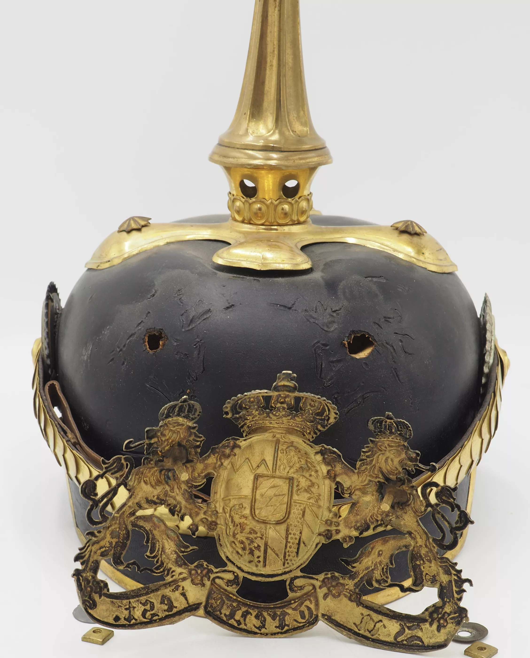 Gold crossed spike base with officer pearl/diamond ornamentation at base of spike. Fluted and tall removable plume that is mounted with a fine Yak hair parade plume. Large gold stars retain cross base to helmet. The Frontplate is the large gold Bavarian crest. The frontplate is beautifully fire gild. Original set of convex rounded gold chinscales with a gold officer rosette. Original officers Reichs and Bavarian cockades. Beautiful and impressive helmet.