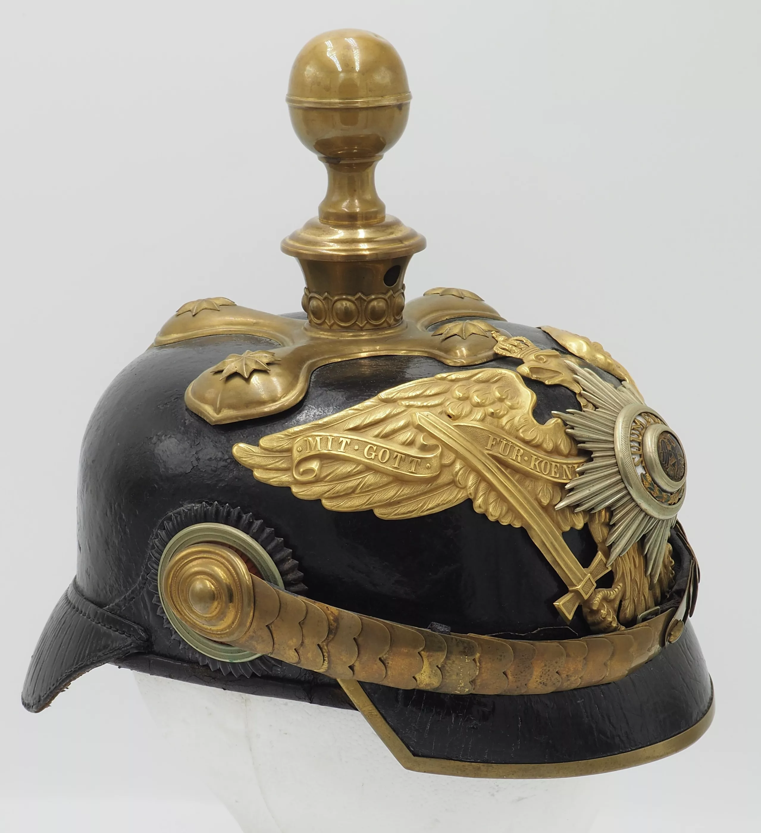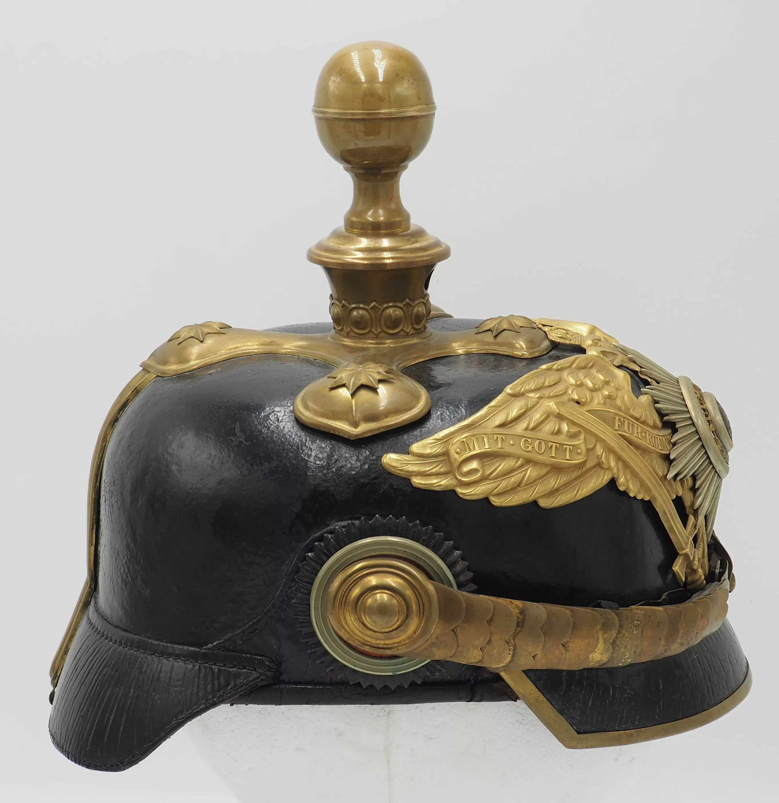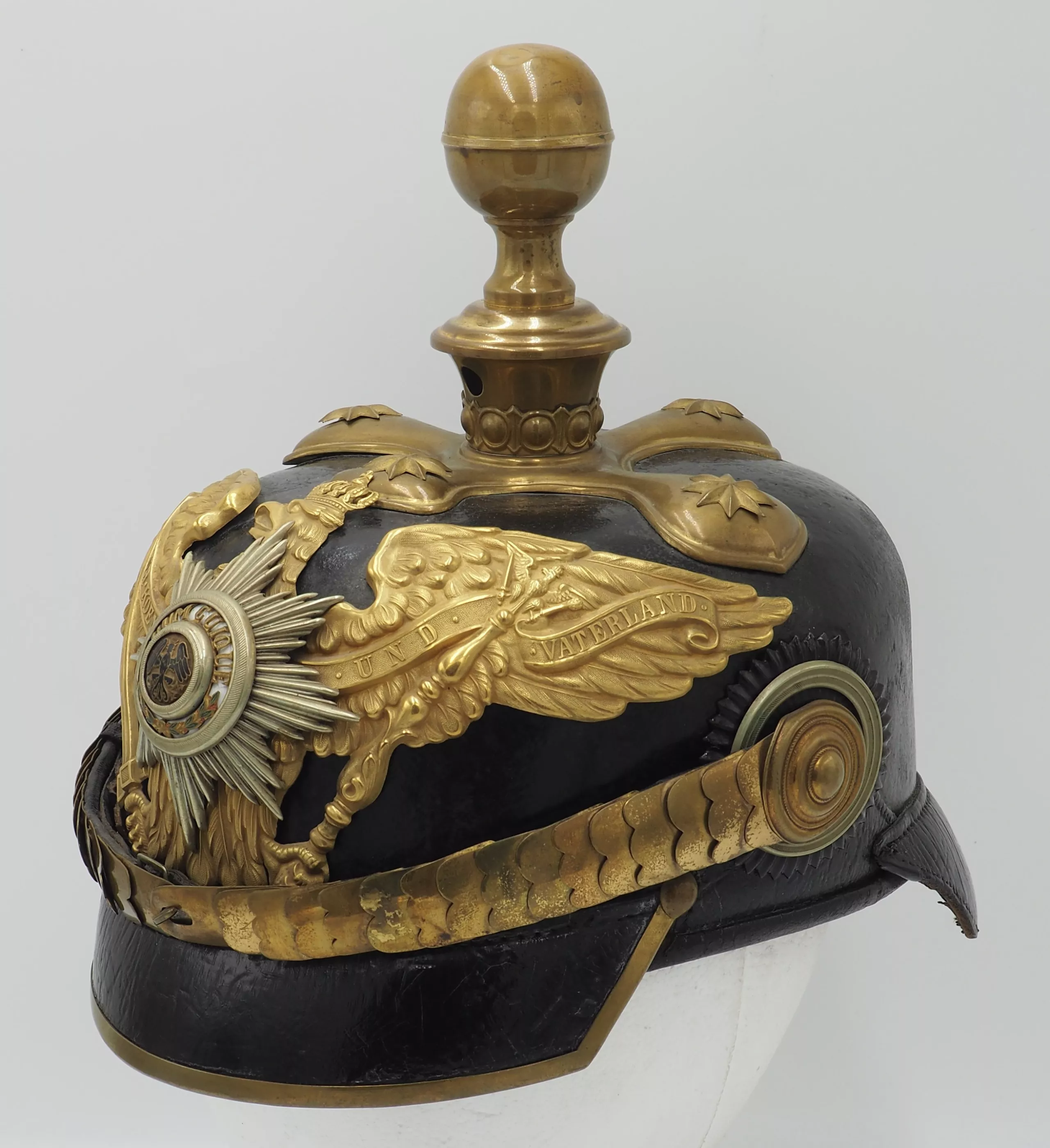 Inner visors color red on back but white on front. Inside the helmet bell is the makers label "WSH Marke" with an Imperial 3 color flag and the size 59 1/2. Crossed spike base with artillery ball top (see photos). The base has gold star retainers. The frontplate is the massive, fired gilded Prussian Guard eagle with enameled Guard star on the breast of the eagle. Rounded gold chinscales on rosettes. Officer Prussian and Reichs cockades. Outstanding Prussian Artillery General.