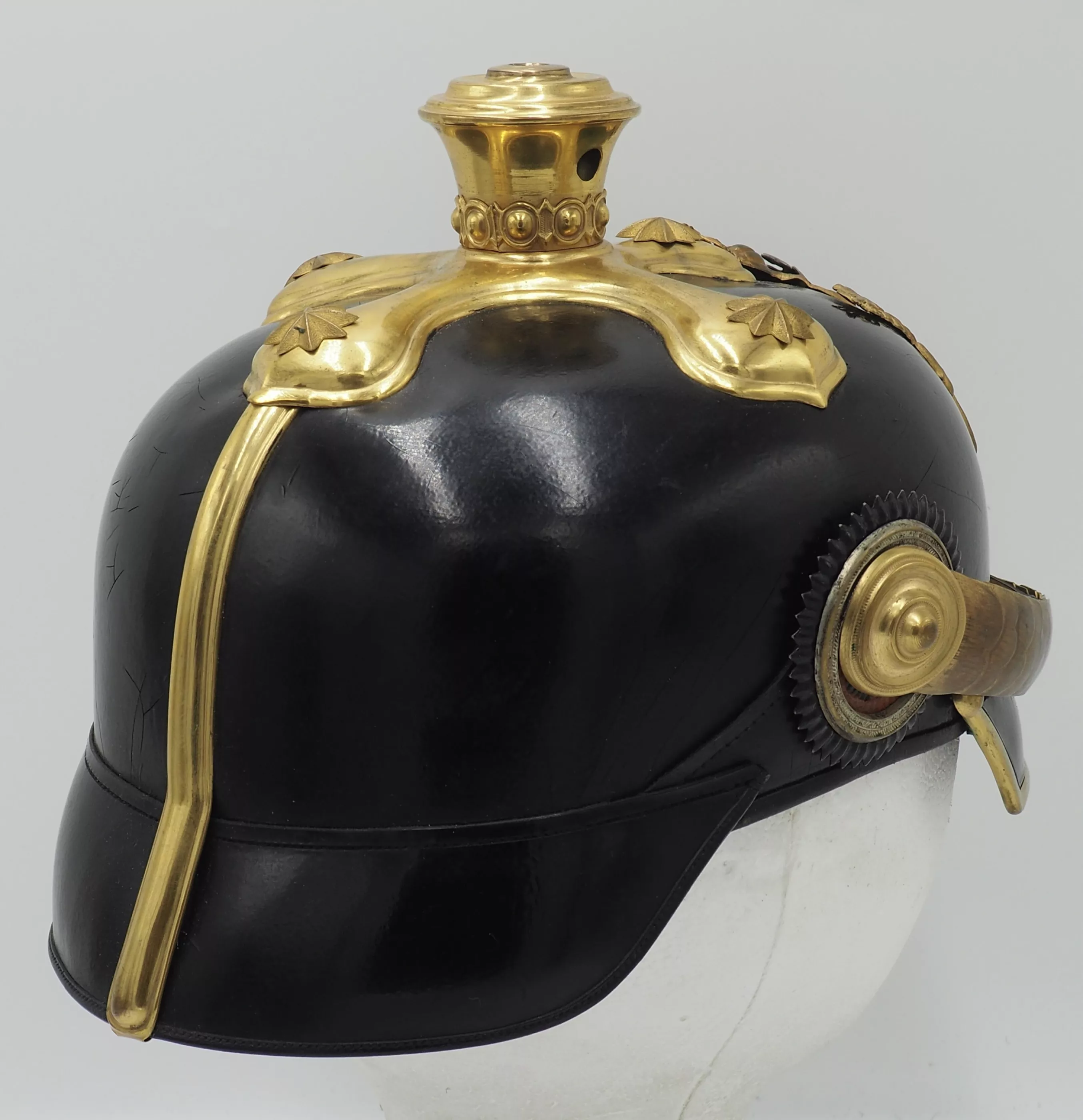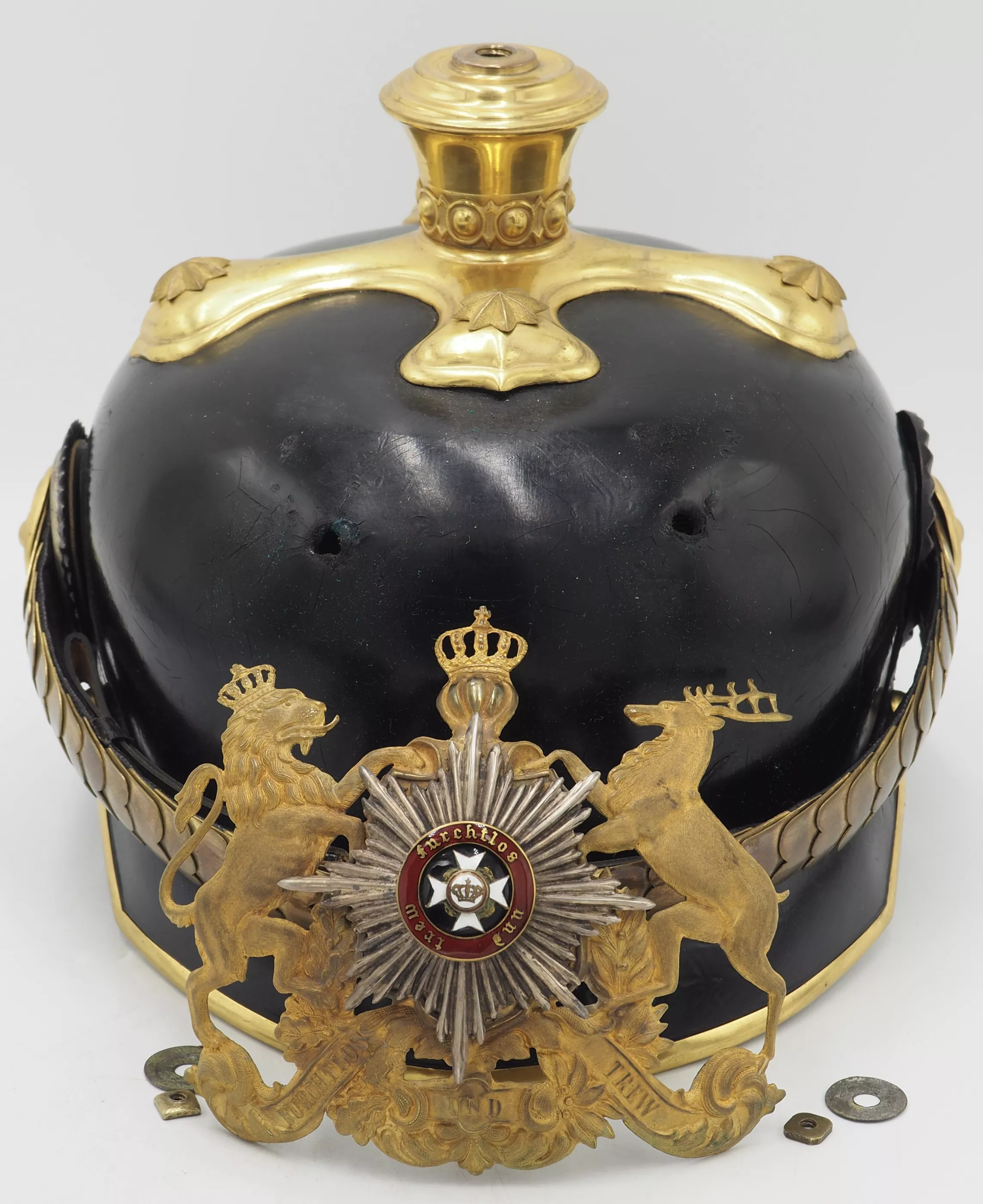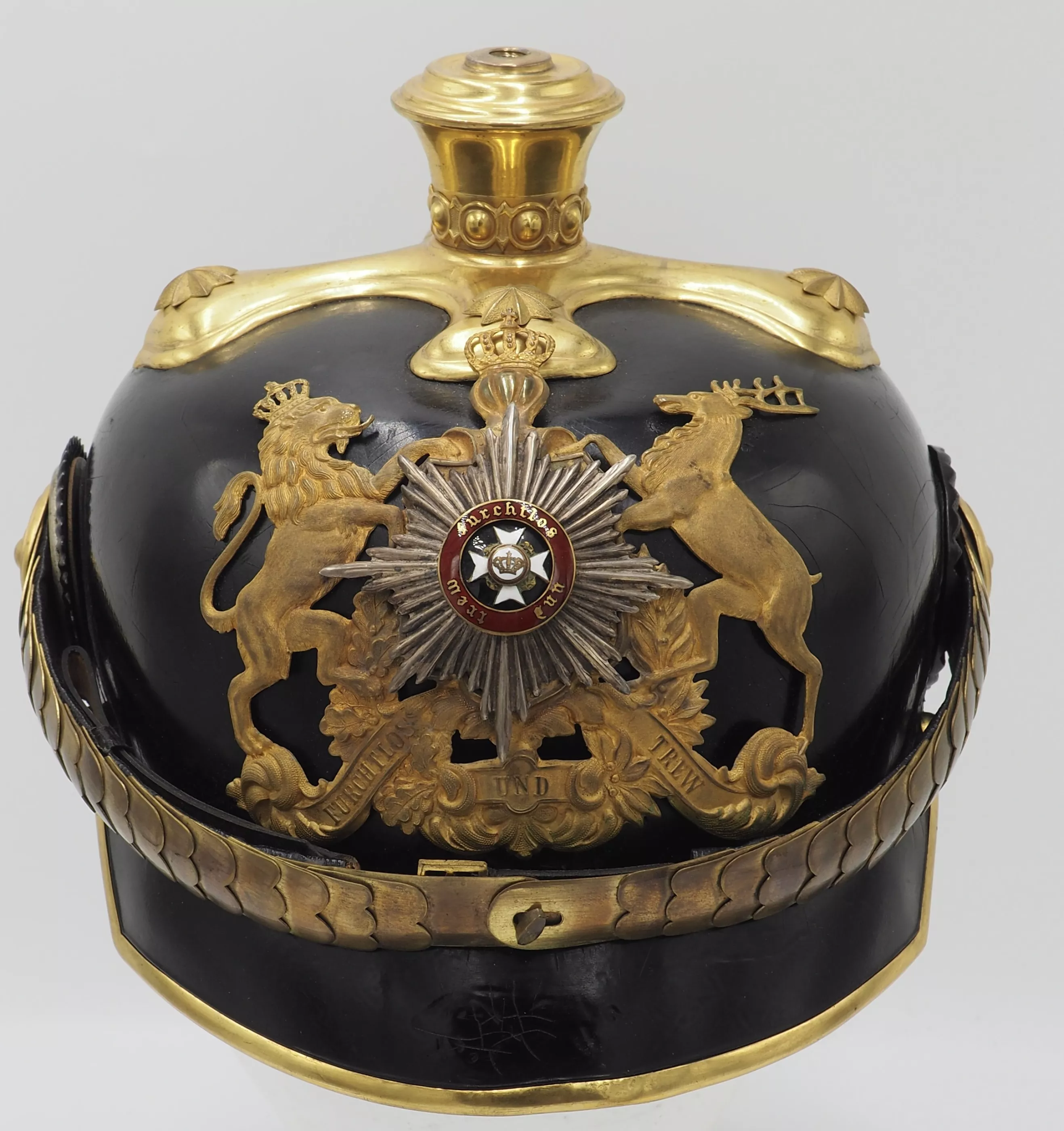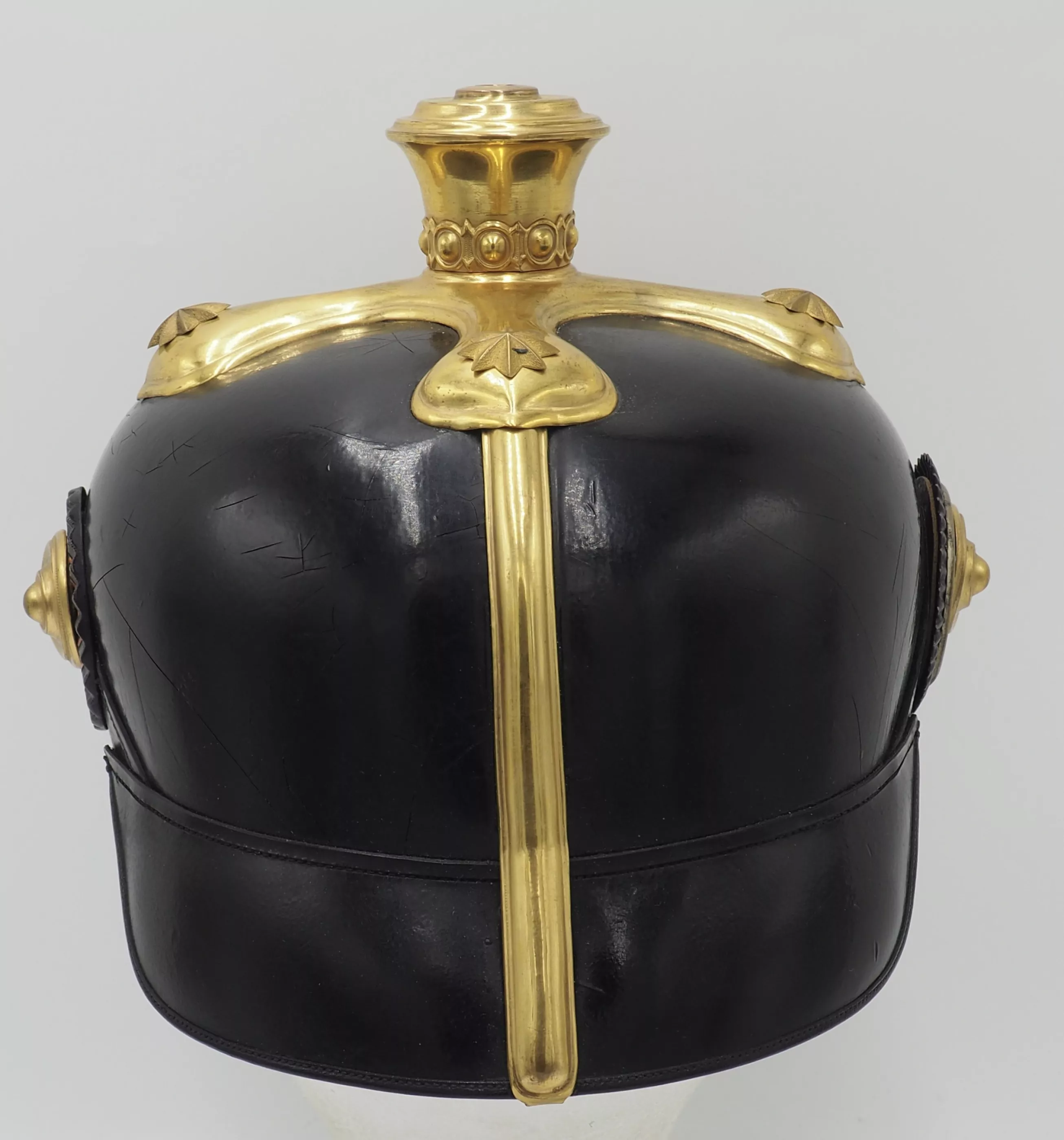 Wurttemberg General Officer helmet Model 1897 with feathered parade bush. Beautiful black lacquered leather helmet body with highly gilded brass trim. The helmet body has excellent form and firm stitching. Exterior lacquer in near Mint condition. The interior of the helmet has officer sweat leather and silk headliner that is in very good to excellent condition. No extra holes in the helmet body. The inner visors of helmet are red and green as is common for officers.