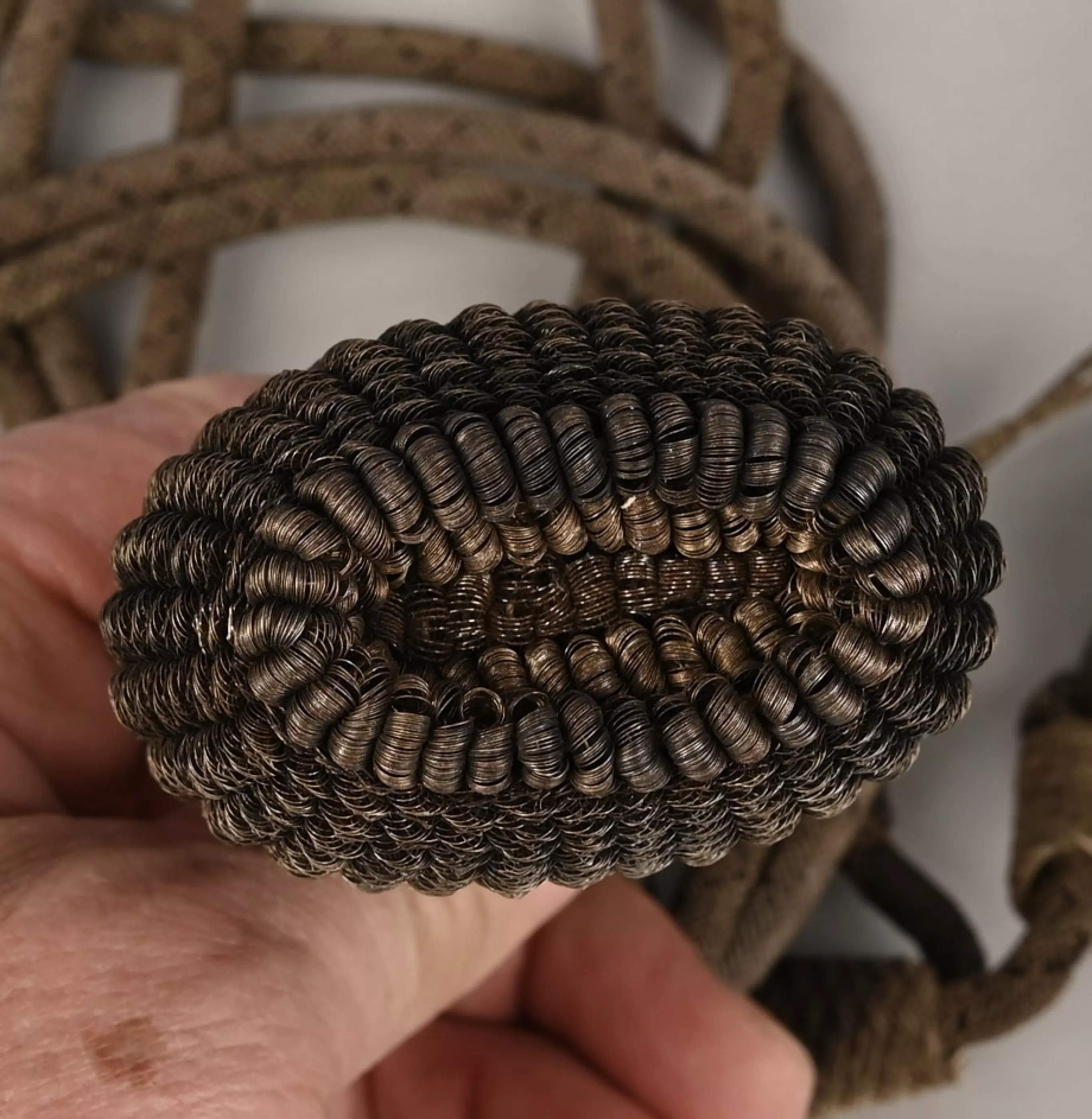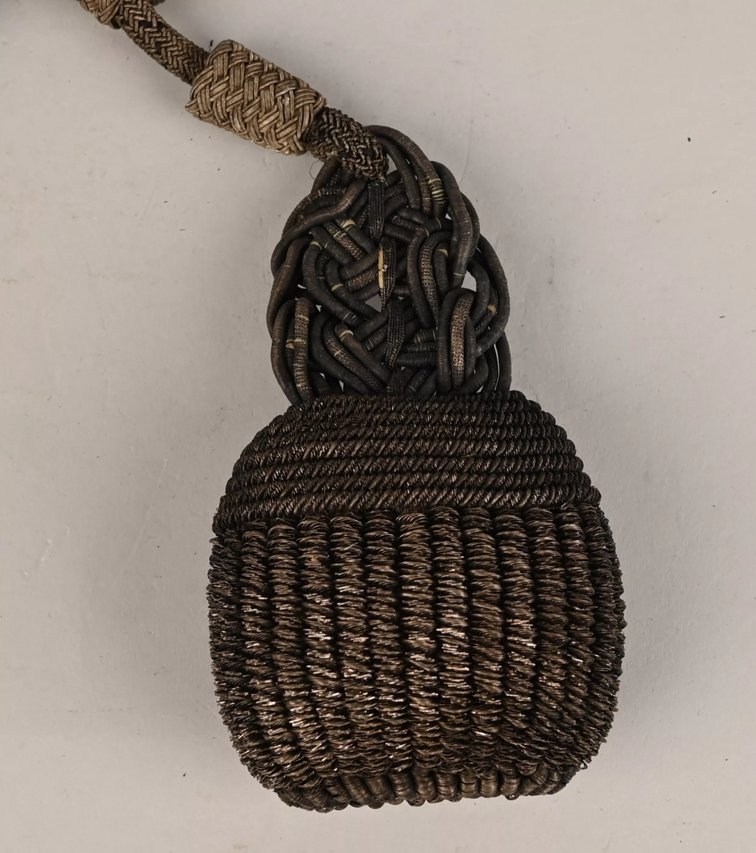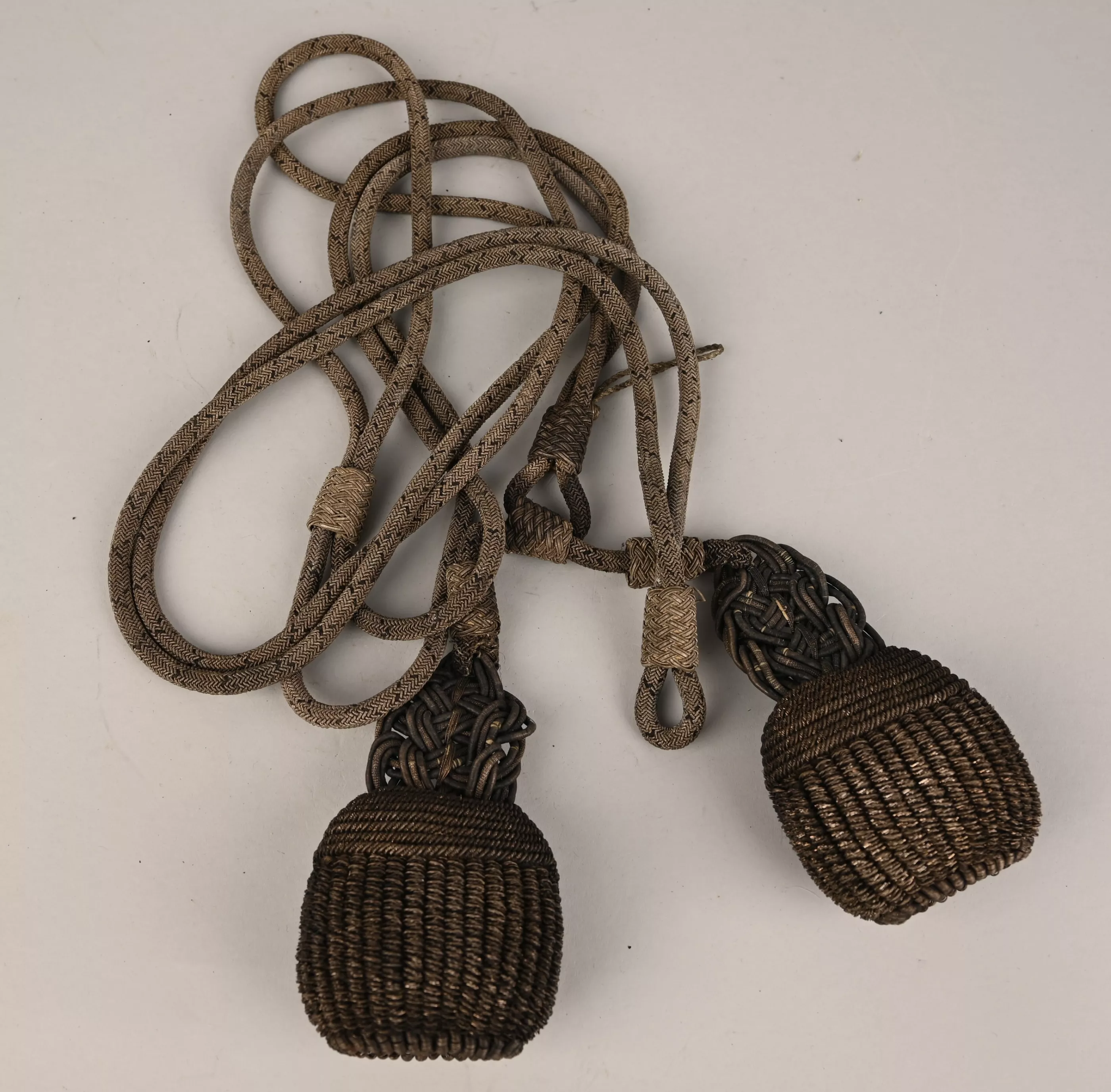 Made in Silver Bullion interlaced with the Prussian black color. The end of the cords are decorated with elaborated knots and tassels with the Prussian black colors in bullion inside the tassels. Overall condition shows some darkened tarnish to the silver but no damage or fraying.