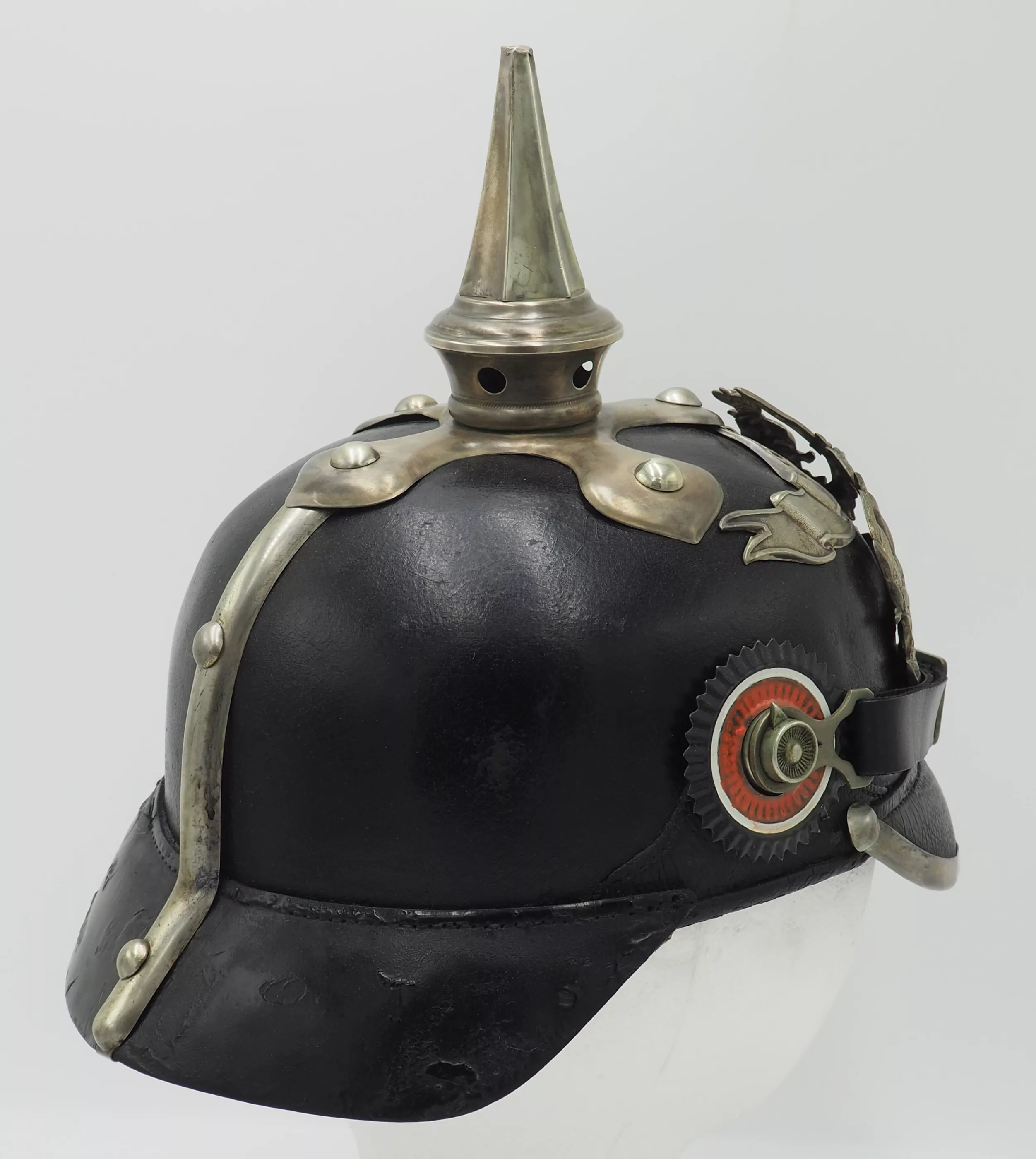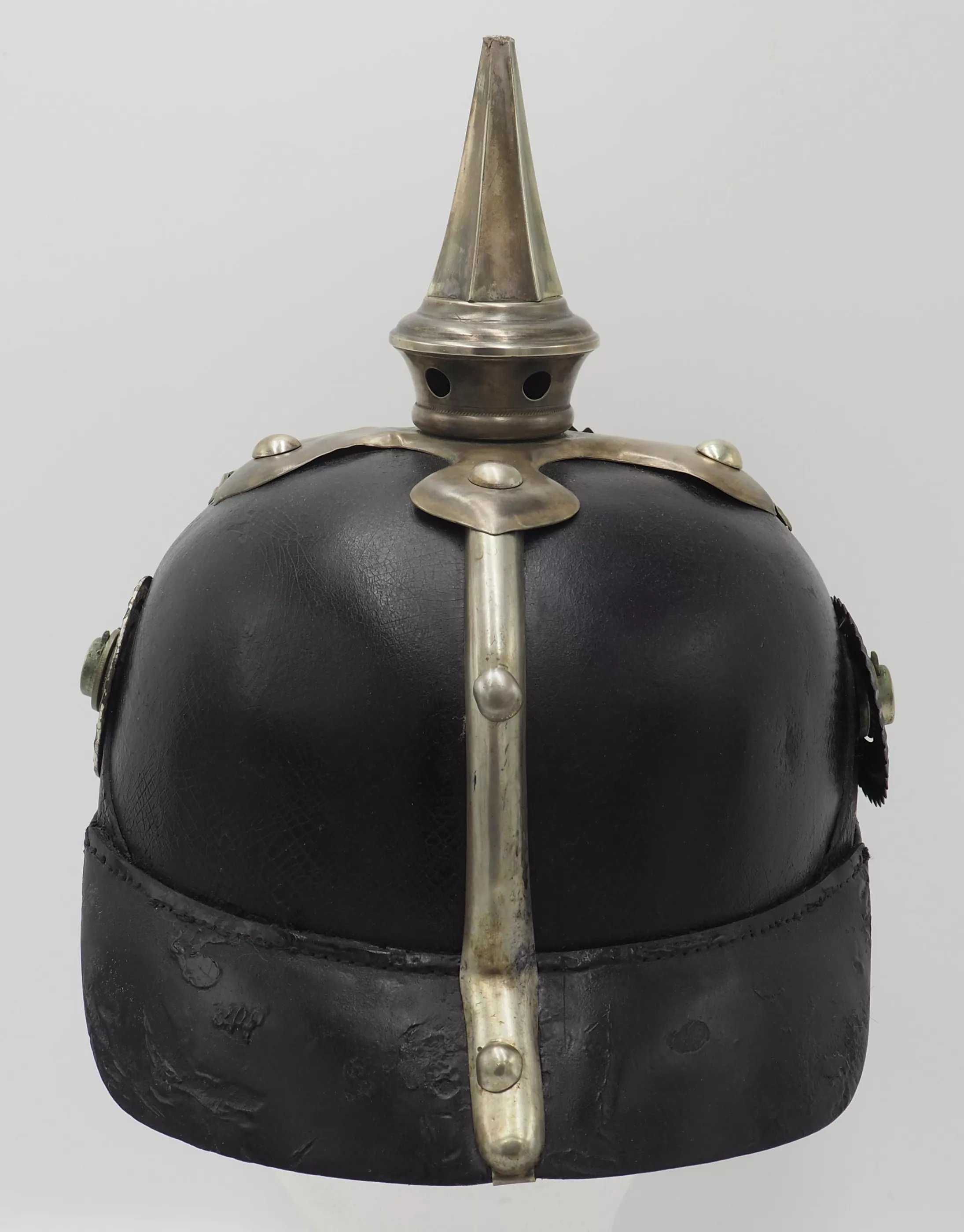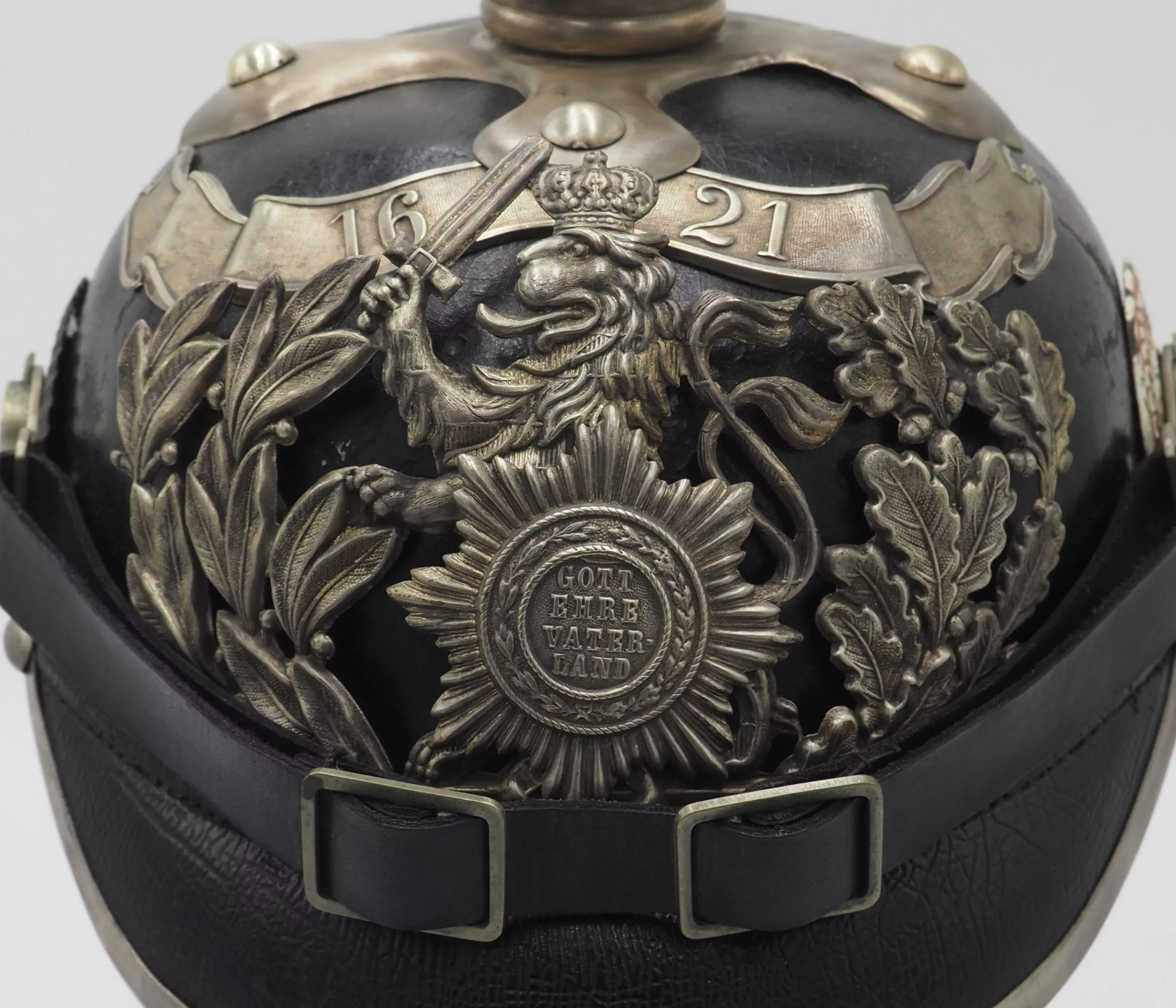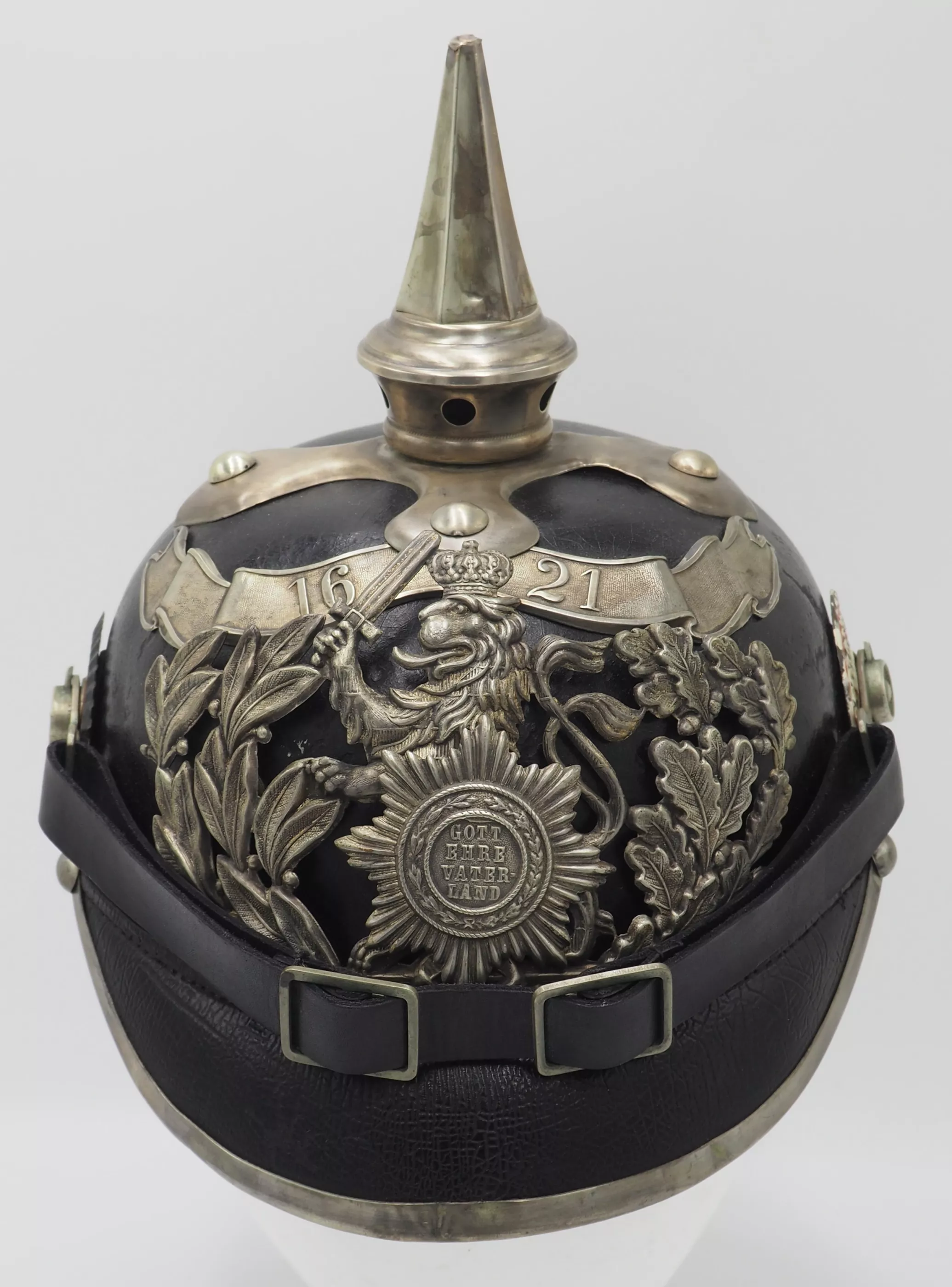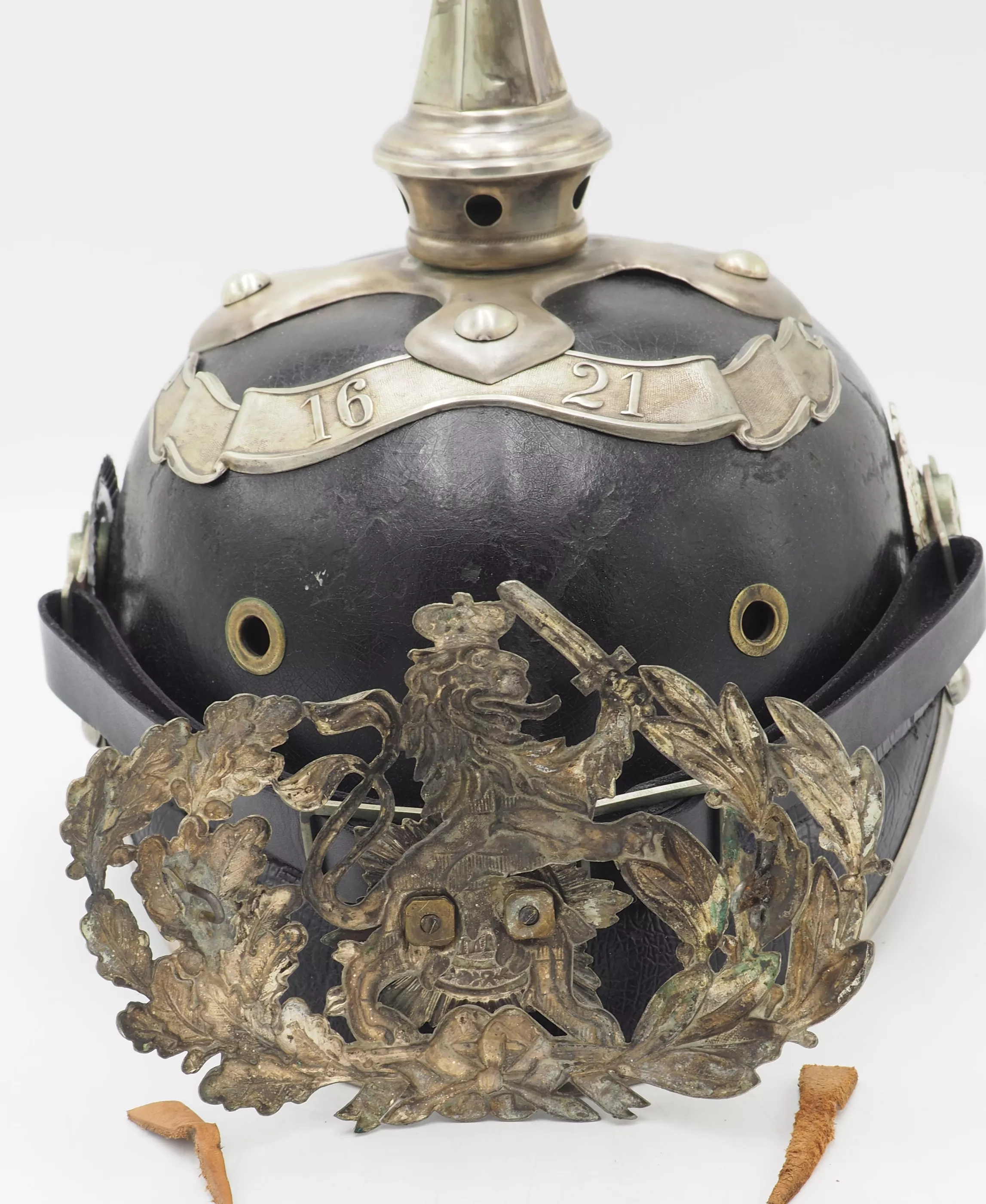 The frontplate is the double wreathed Hessen Lion with the guard star of Hessen on the lion’s breast. Above the frontplate the special silver commemoration bandeau with "1621"indicating the founding year of the Regiment. Hessen style cross base mounted with silver brad retainers. The special Hessen style fluted spike is removable. Leather chinstrap with silver metal fittings. Stamped metal serrated Reichs cockade and non-serrated EM. Beautiful helmet from an elite regiment