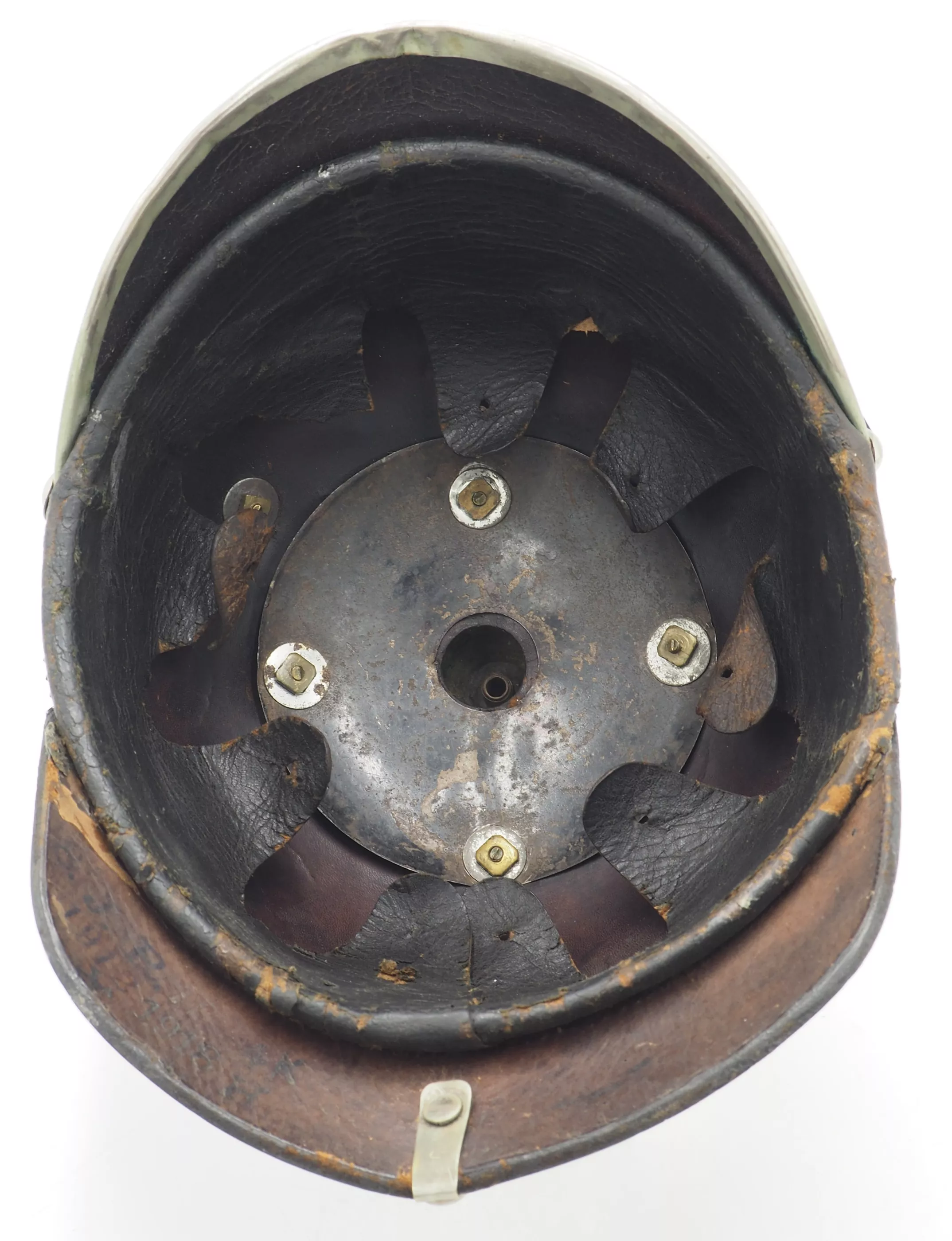 Hessen 115th Lifeguard Infantry Regiment (The Grand Duke of Hessen Regiment) – Enlisted Man – Model 1897. Recently acquired from a US Collector. Black lacquered leather with silver metal trim. The helmet body is in excellent condition with firm stitching and no extra holes in helmet body. Inside black EM style liner that is in excellent condition. Inside leather visors have illegible markings (see photo). German Silver metal trim that was left untouched/uncleaned as found.