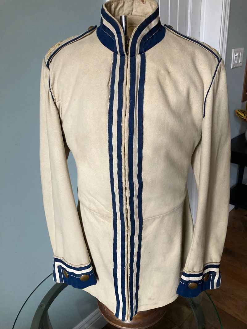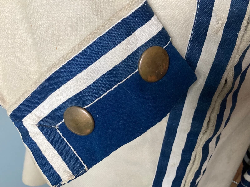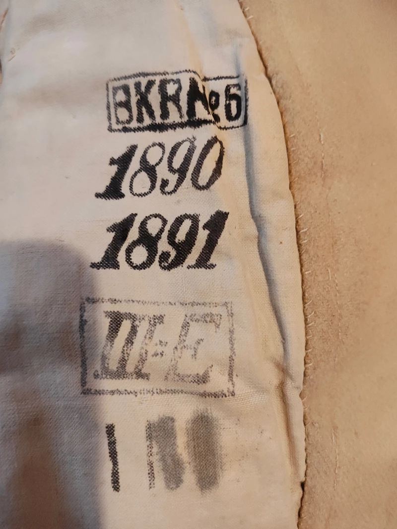 Now to this wonderful Koller for Kürassier-Regt. Kaiser Nikolas I. von Rußland. It is Kammer issued and dated 1890 officially making it my earliest Kammer issued uniform. A Kammer is a clothing depot, or in English, a Quarter-Master. The high collar with its distinctive curve, the cuffs, seams, and piping on the front opening and rear skirt of the Koller were piped in the regimental facing color. Note the bottom is just cut without him. This is a distinctive Preussen characteristic. Shoulder straps were white and also piped in the Regimental color, while officers wore epaulettes. For KR6 the Regimental colour was Russian Blue with the cypher of Kaiser Nikolas I in yellow cord. The Koller border (Kollerborte) was white fabric edged in Regimental facing colors, and ran the entire length of the front, collar, and cuffs The front is closed with sixteen alternating hook and eyes the entire length of the front, plus two on the collar.