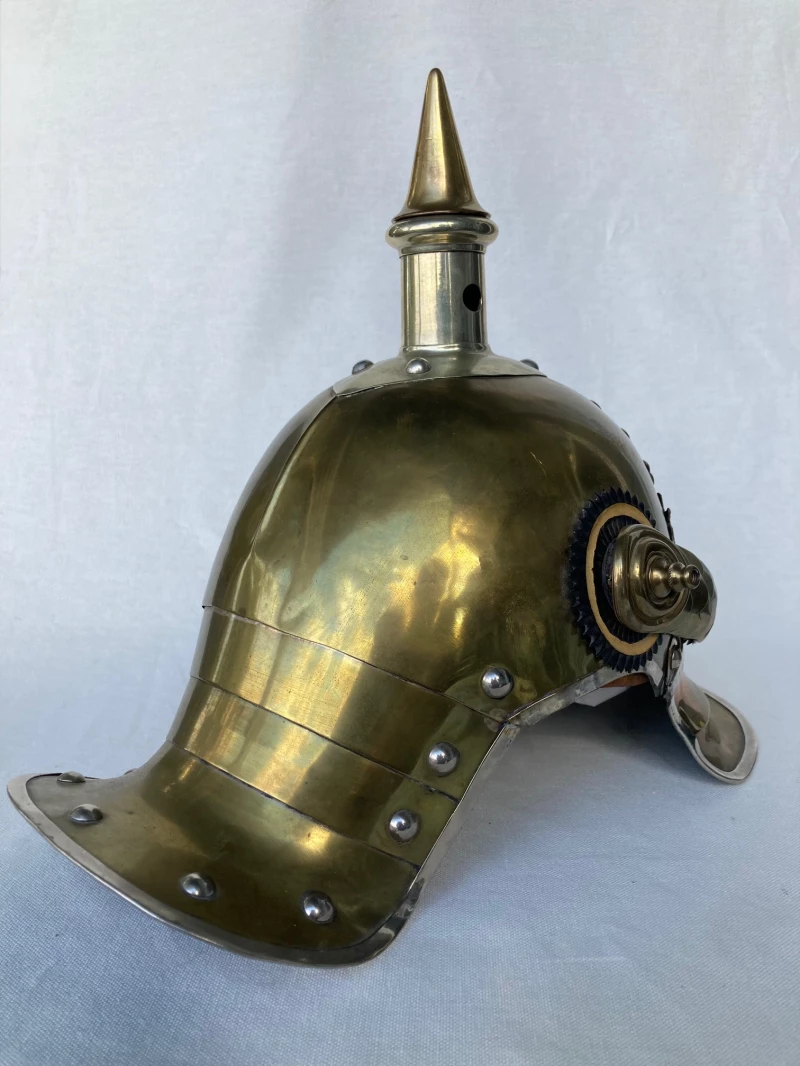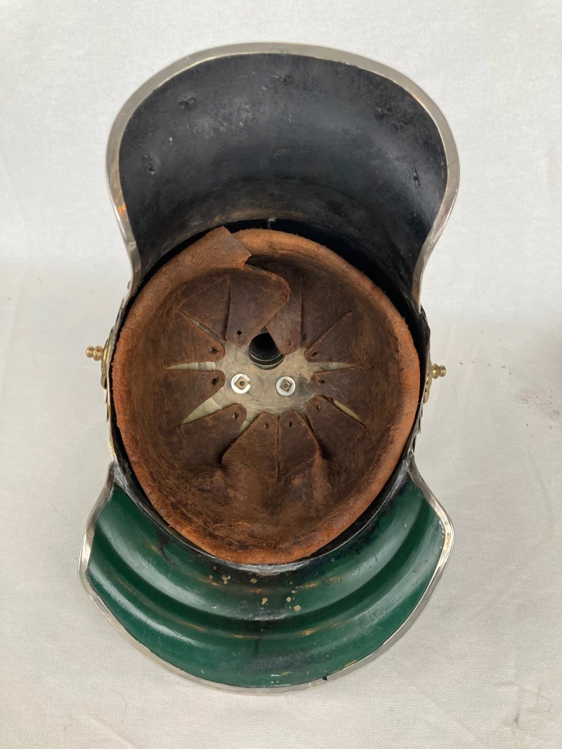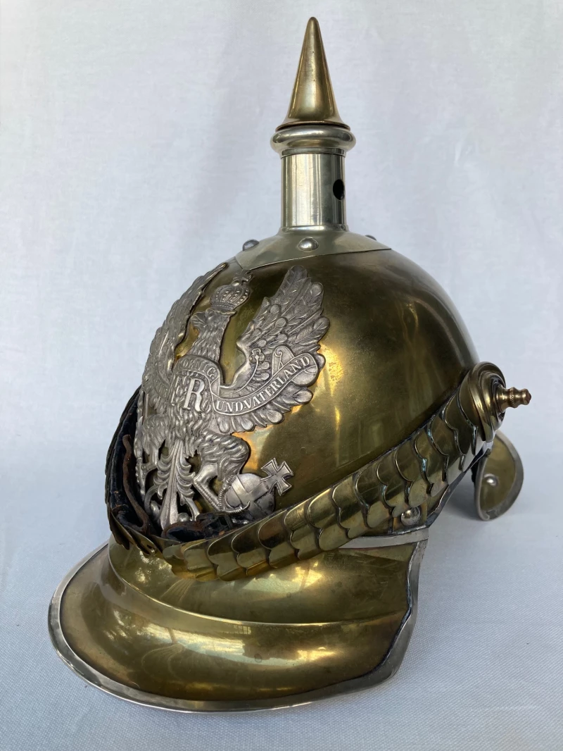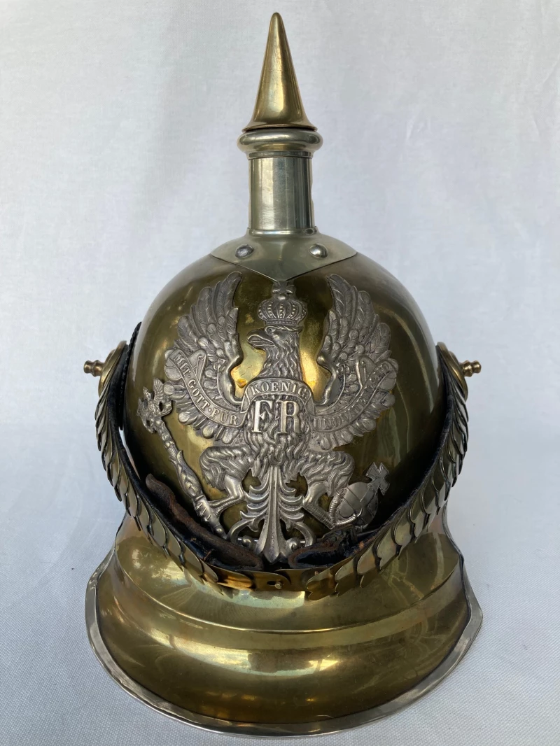 The helmet spike is the very tall first version which immediately makes the helmet appealing. It also has the distinctive “ovoid” egg shape to the shell. The eagle is the 1842 eagle shape (Schwarzenegger arms) adopted in 1842. However, it has the mandatory 1860 Fatherland Bandeau. That makes this eagle a very scarce pattern, as it is a one piece stamping. Usually after 1860 the 1842 eagle had an FATHERLAND Bandeau soldered on top of it. Note: Preussen did not adopt the Metalheme until 1843, but the eagle was the 1842 pattern.