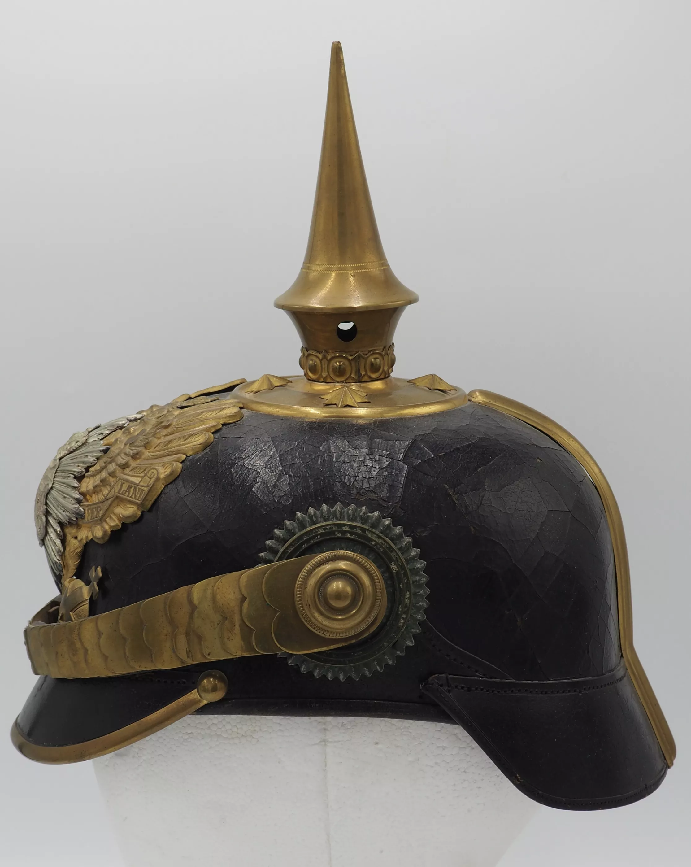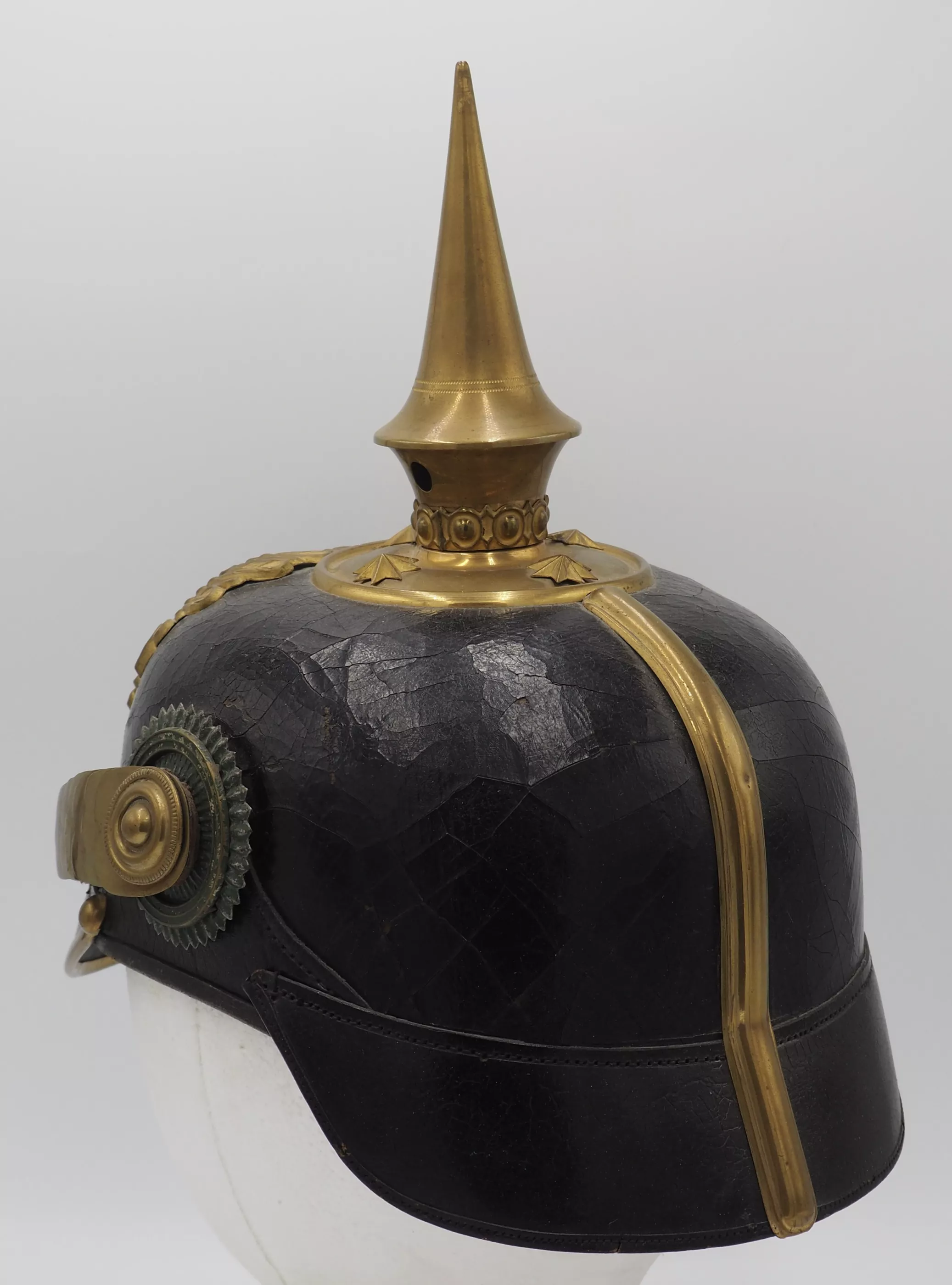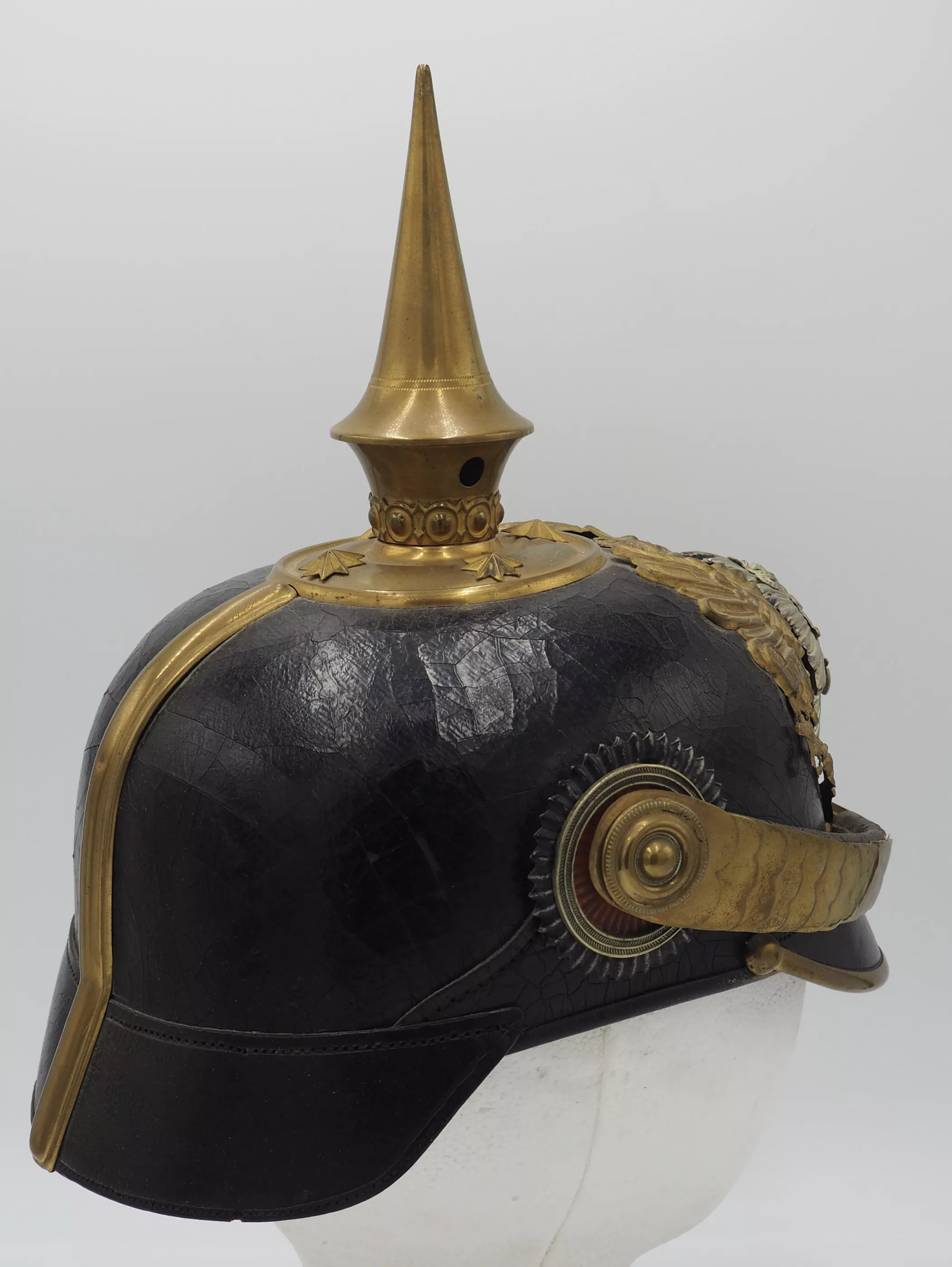 Anhalt 93rd Infantry Regiment for an Officer - Model 1897. This helmet has not been cleaned or polished. Black lacquered leather helmet body with fire gilded brass metal trim. Helmet body has excellent form and firm stitching. The exterior lacquer is uneven but has no lacquer loss (see photos). No extra holes in the helmet body. Interior has sweat leather and silk headliner. The liner shows use and age but is in good condition.