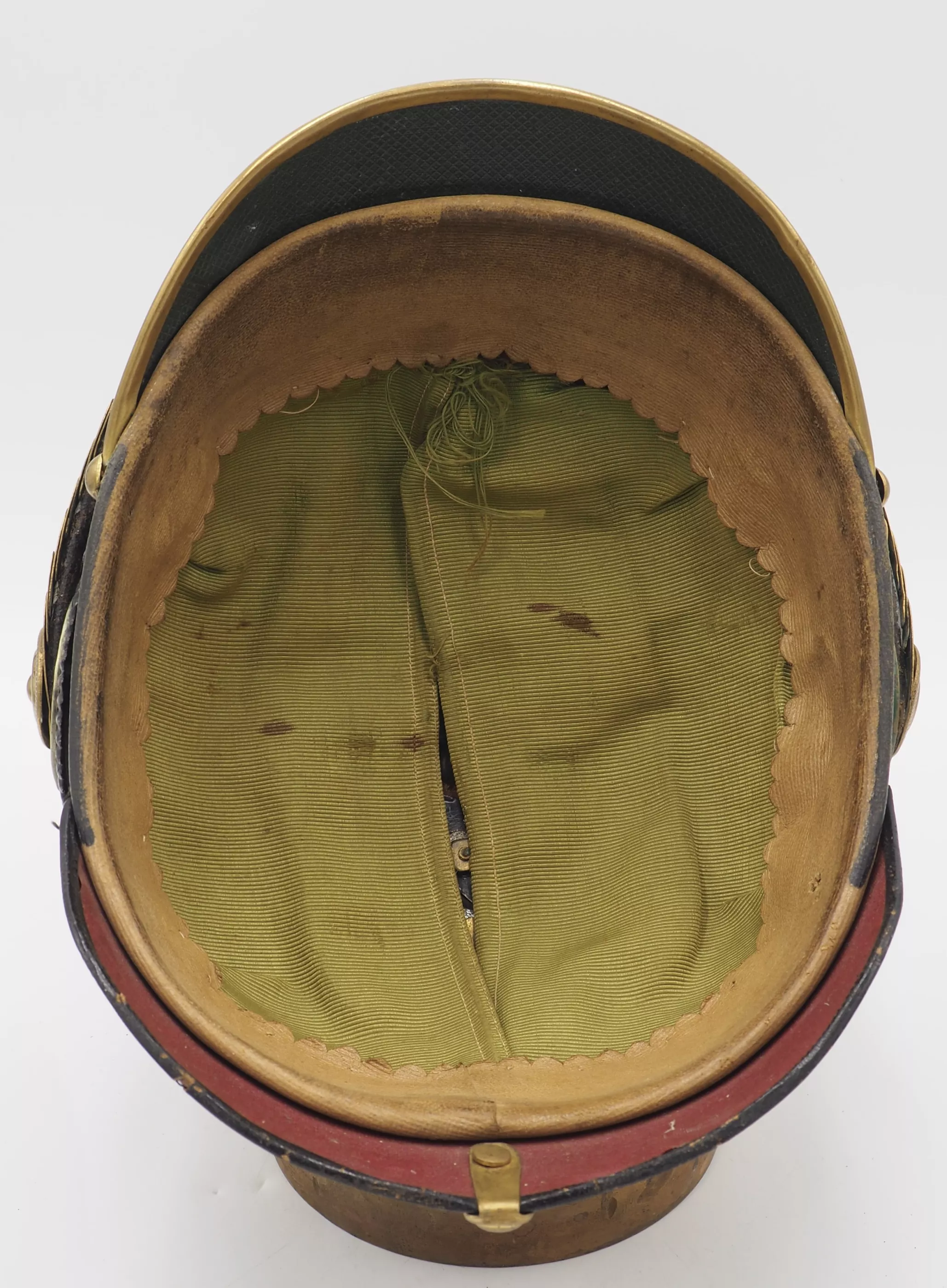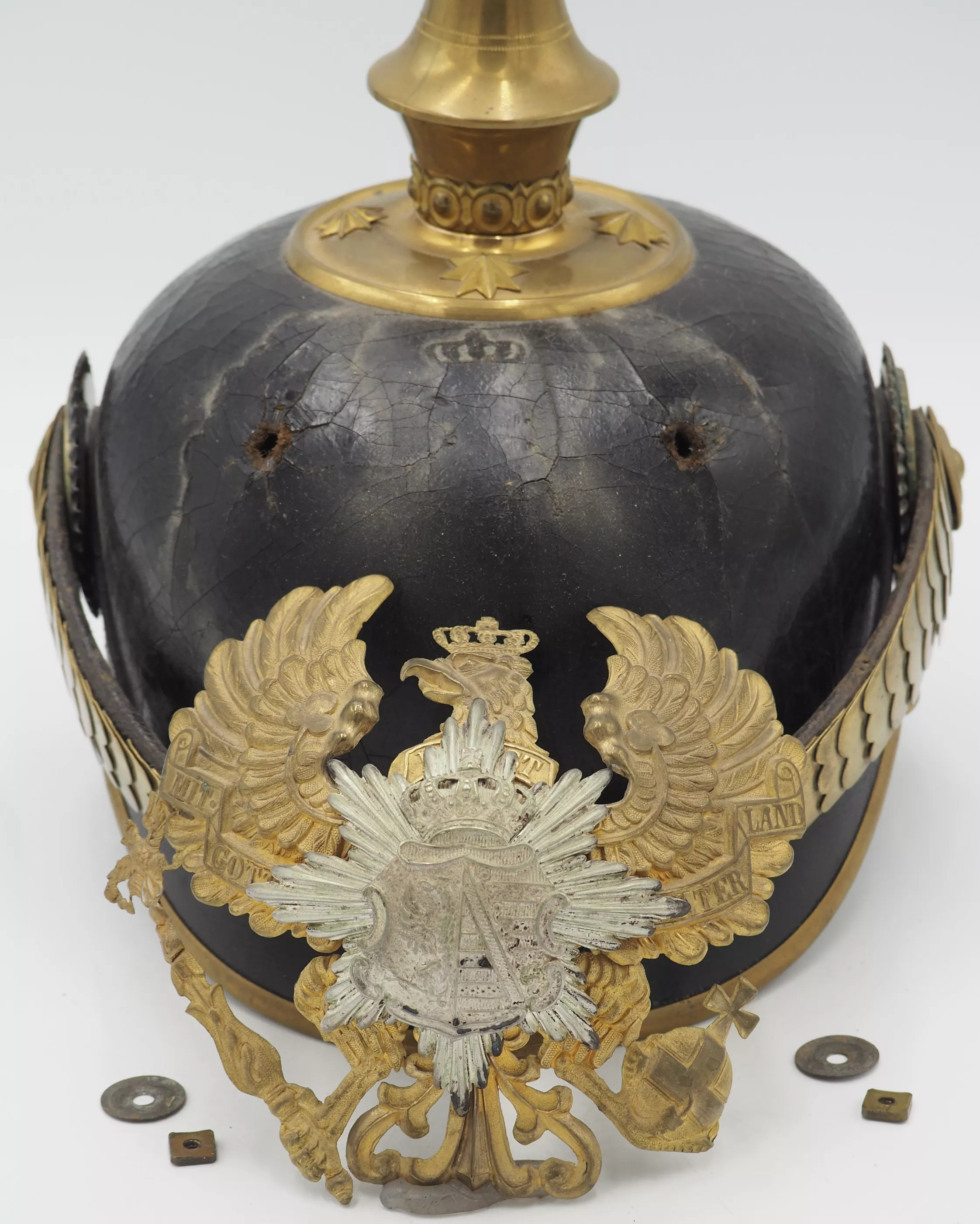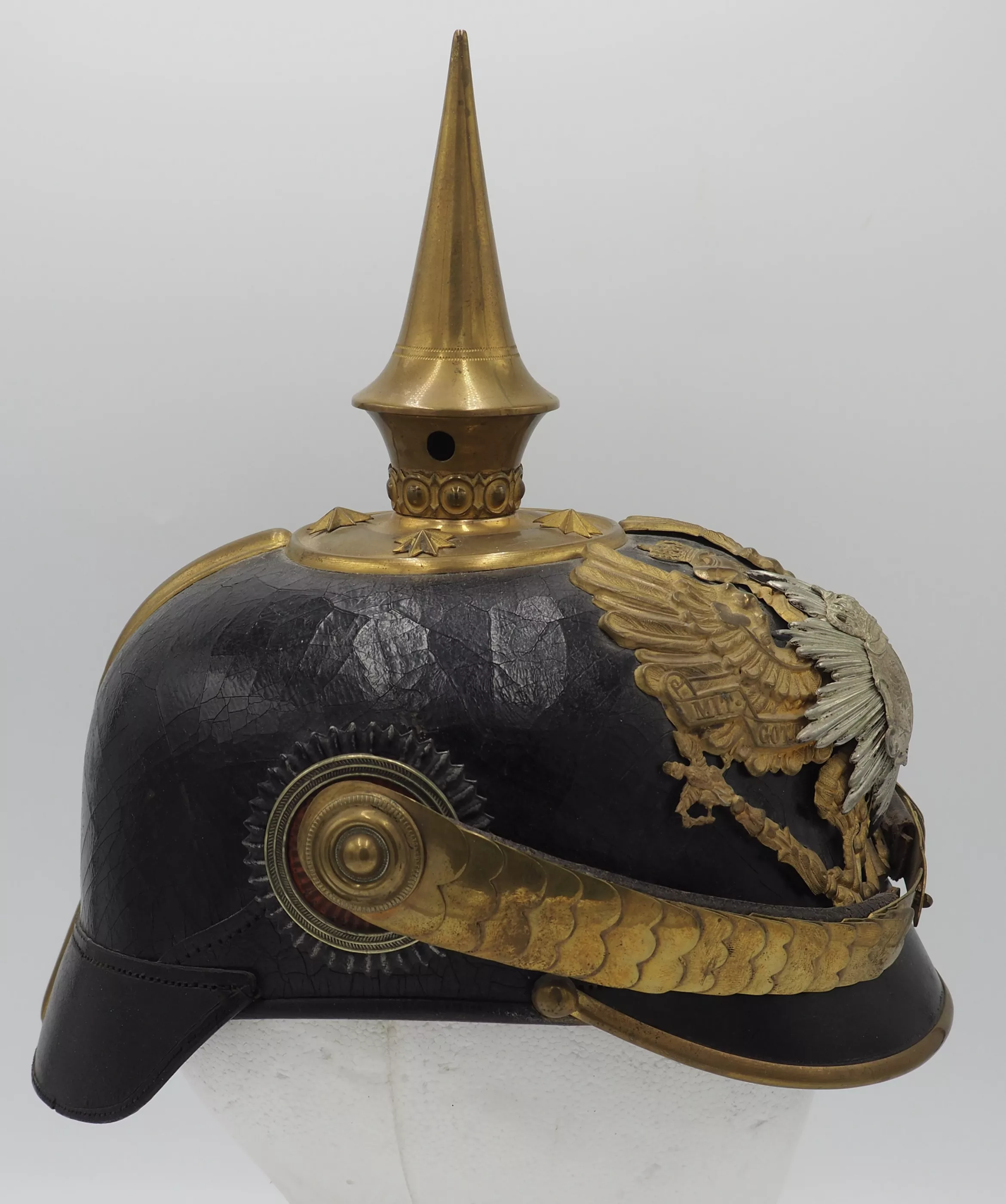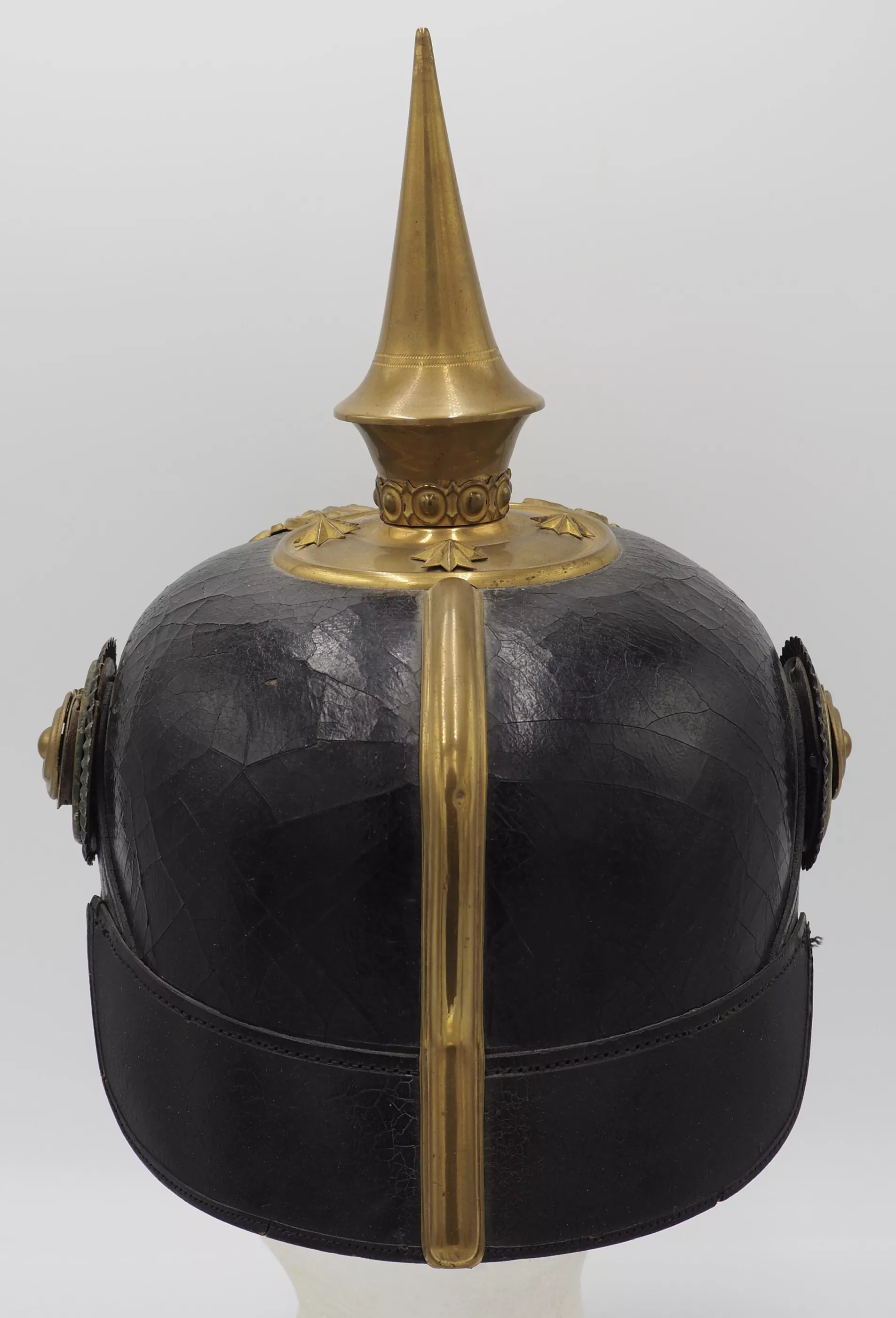 Anhalt 93rd Infantry Regiment for an Officer - Model 1897. This helmet has not been cleaned or polished. Black lacquered leather helmet body with fire gilded brass metal trim. Helmet body has excellent form and firm stitching. The exterior lacquer is uneven but has no lacquer loss (see photos). No extra holes in the helmet body. Interior has sweat leather and silk headliner. The liner shows use and age but is in good condition.