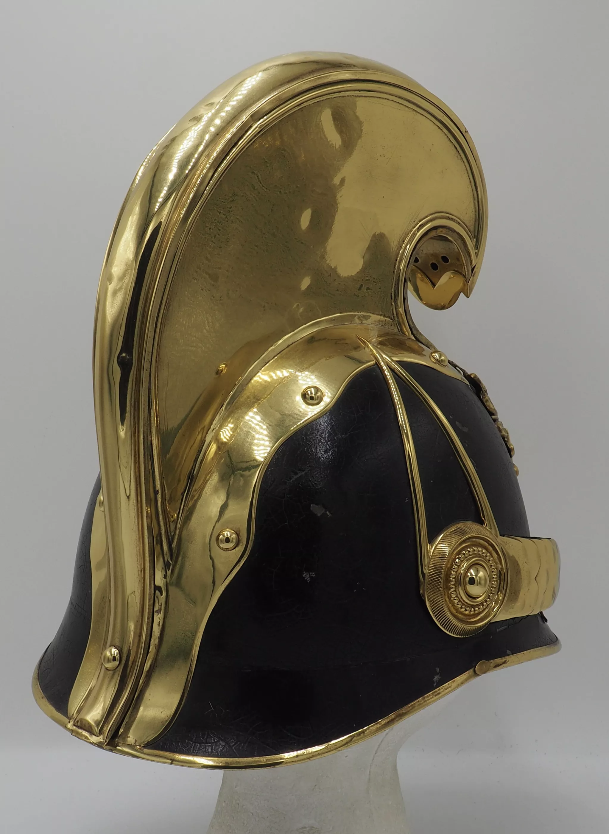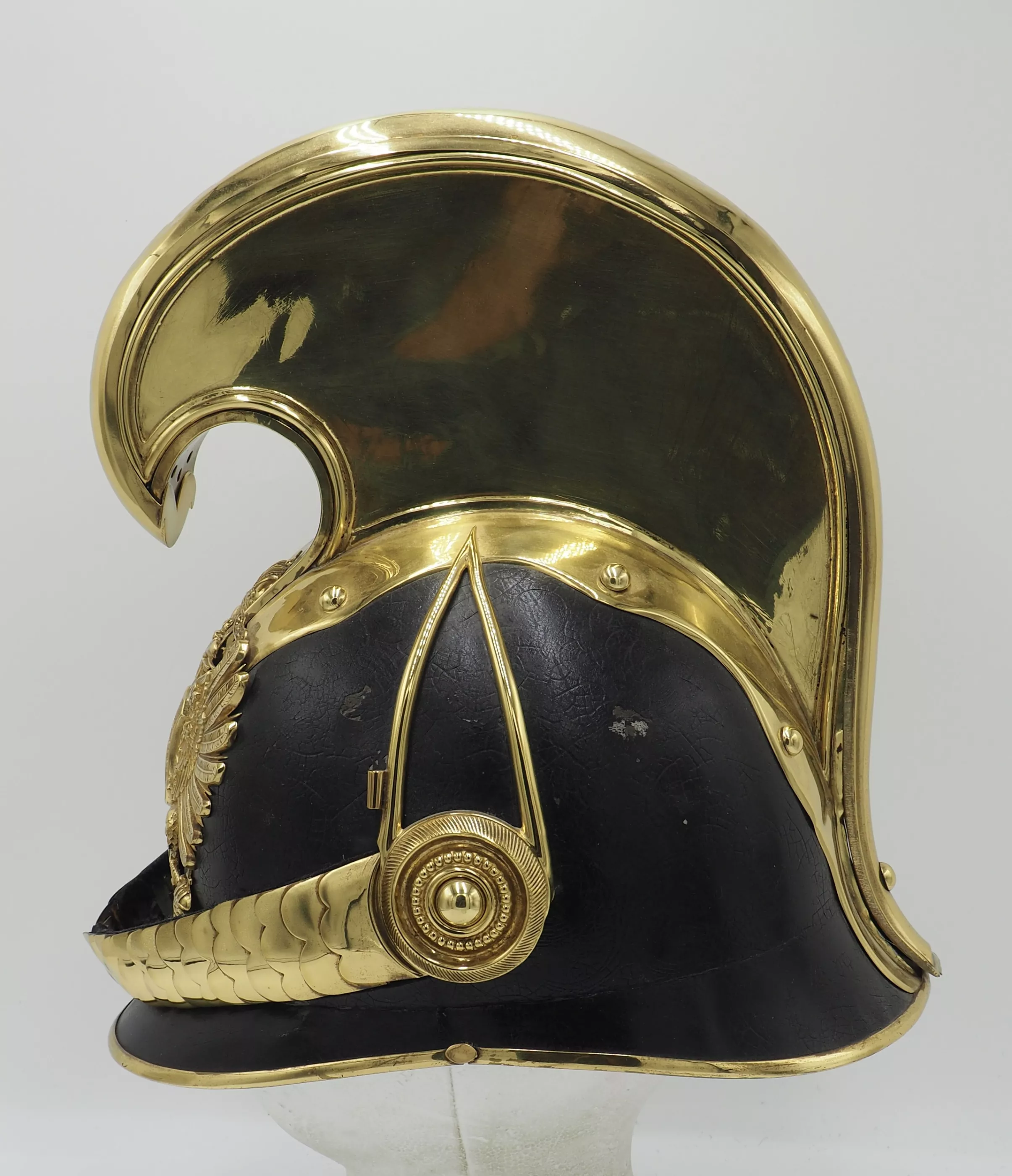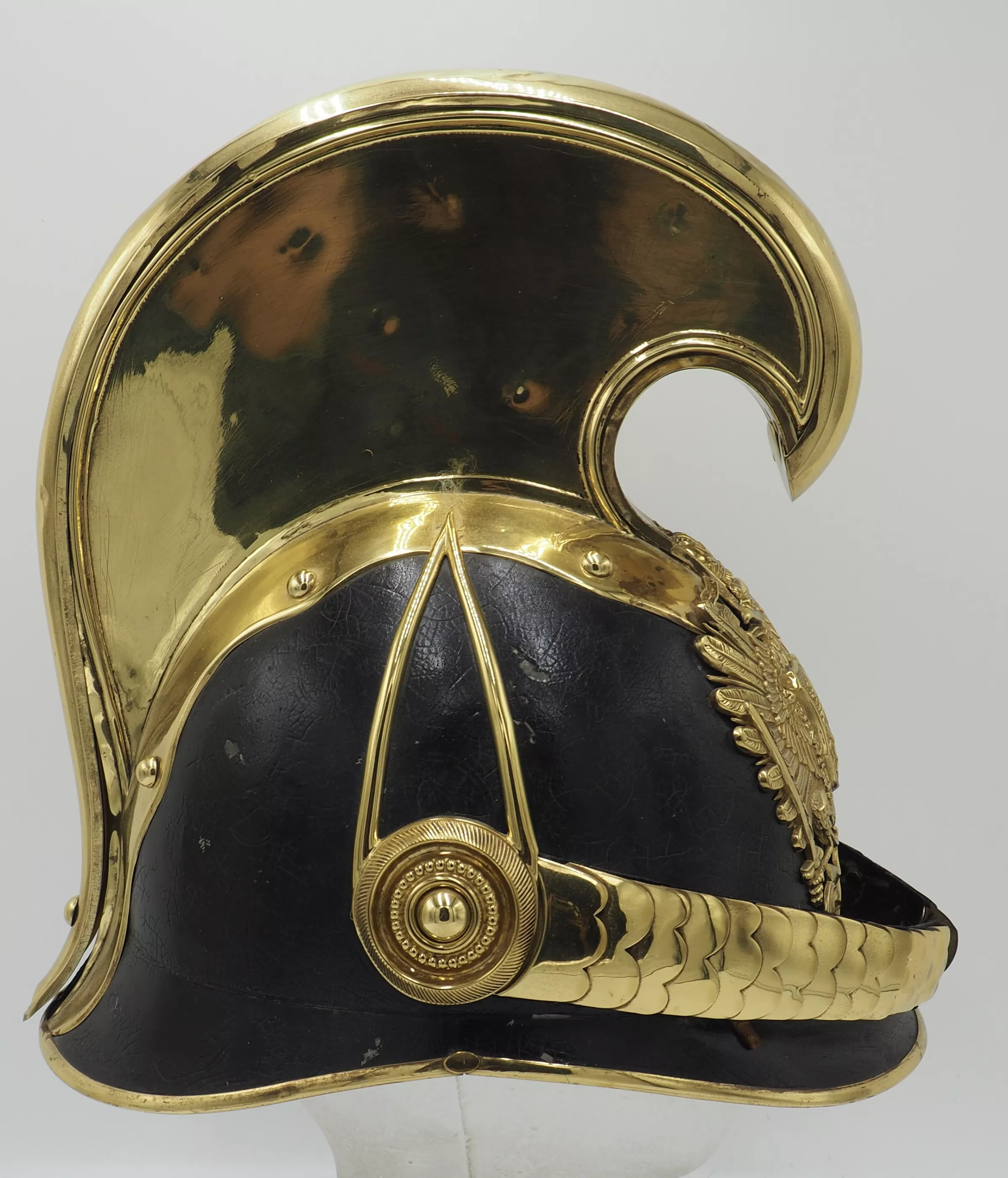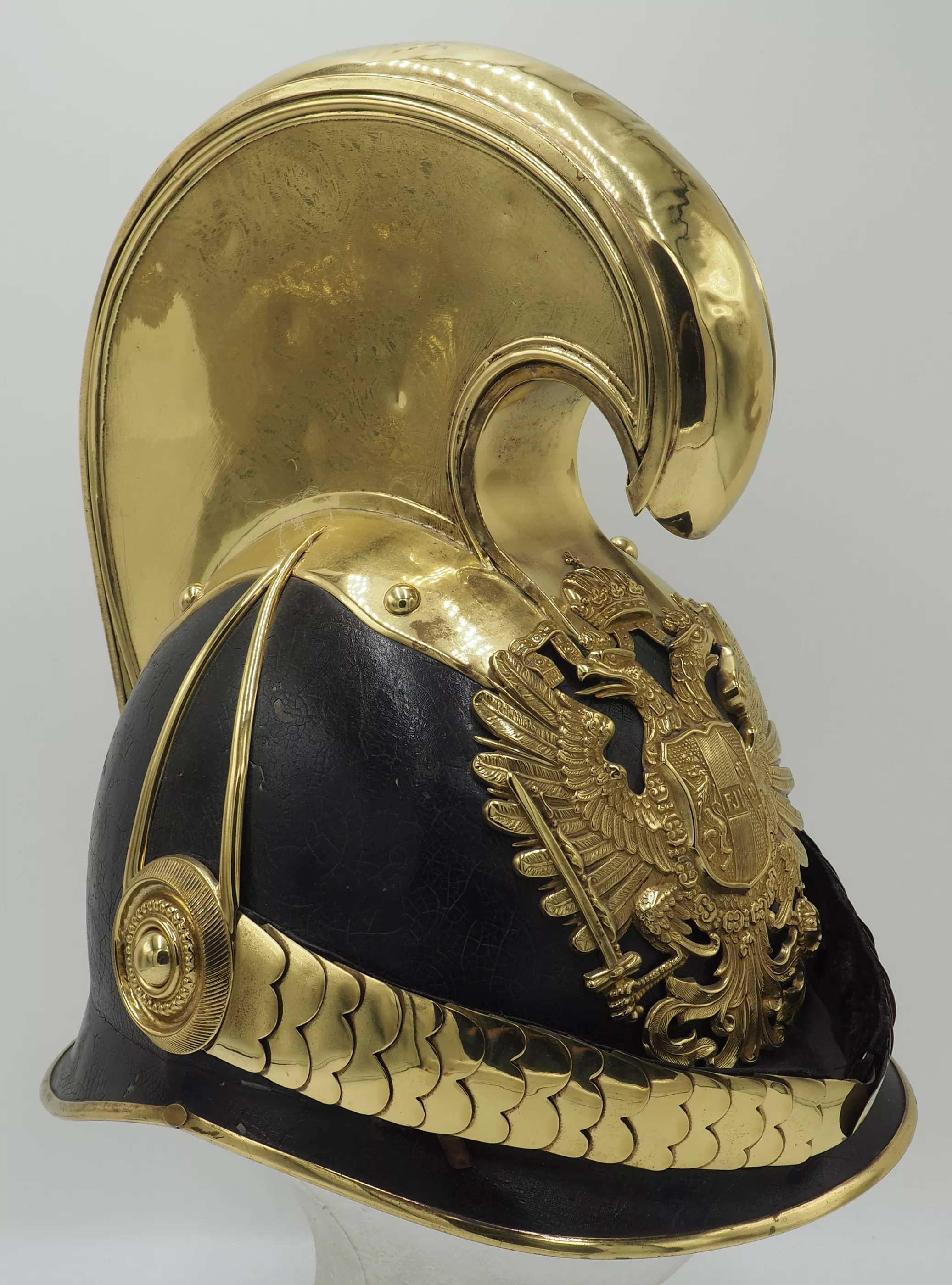 Black lacquered metal helmet shell in excellent overall condition with only minor flaws. Tall Brass Cimier held to helmet with split brads. All brass trim including side protectors and visor trims. The Austro-Hungarian double headed eagle with the JFI on its breast for Franz Joseph 1st.. Beautiful set of original convex chinscales attached by a fancy NCO rosette. No liner. We have often encountered Manschafts or Officers helmet form this Unit...but this is our first NCO dragoon.