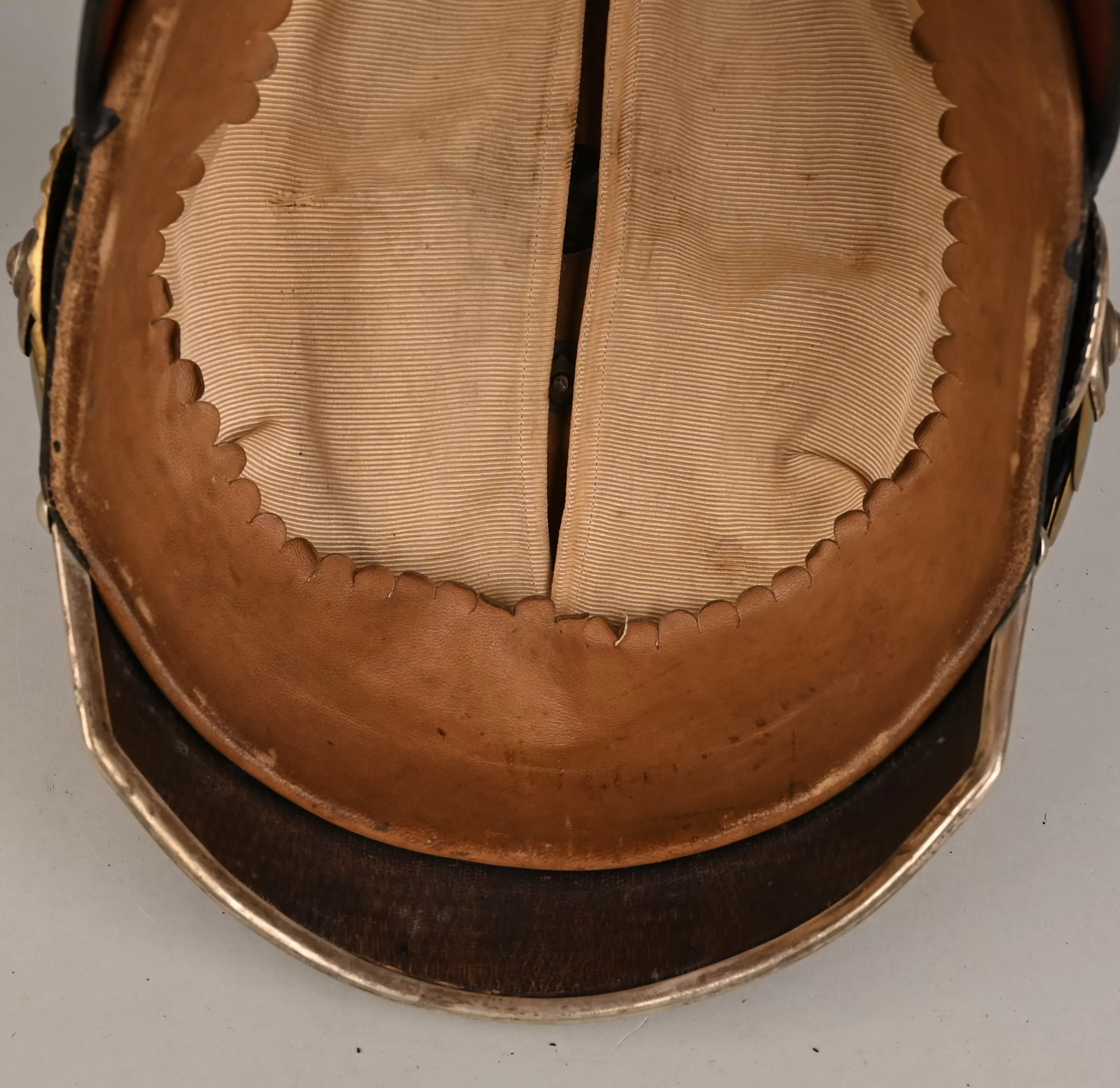 Baden Dragoon Regiments (20,21 and 22) Officer Model 1897. Black lacquered leather helmet body with silver trim. MINT Helmet body has excellent form and firm stitching. Exterior lacquer still smooth with beautiful finish and absoluteley no flaws or cracks. Interior has officer sweat leather and silk headliner in perfect condition with no tears. Silk headliner is near prefect. Interior visors are red and green as appropriate for officer. No extra holes in helmet body.