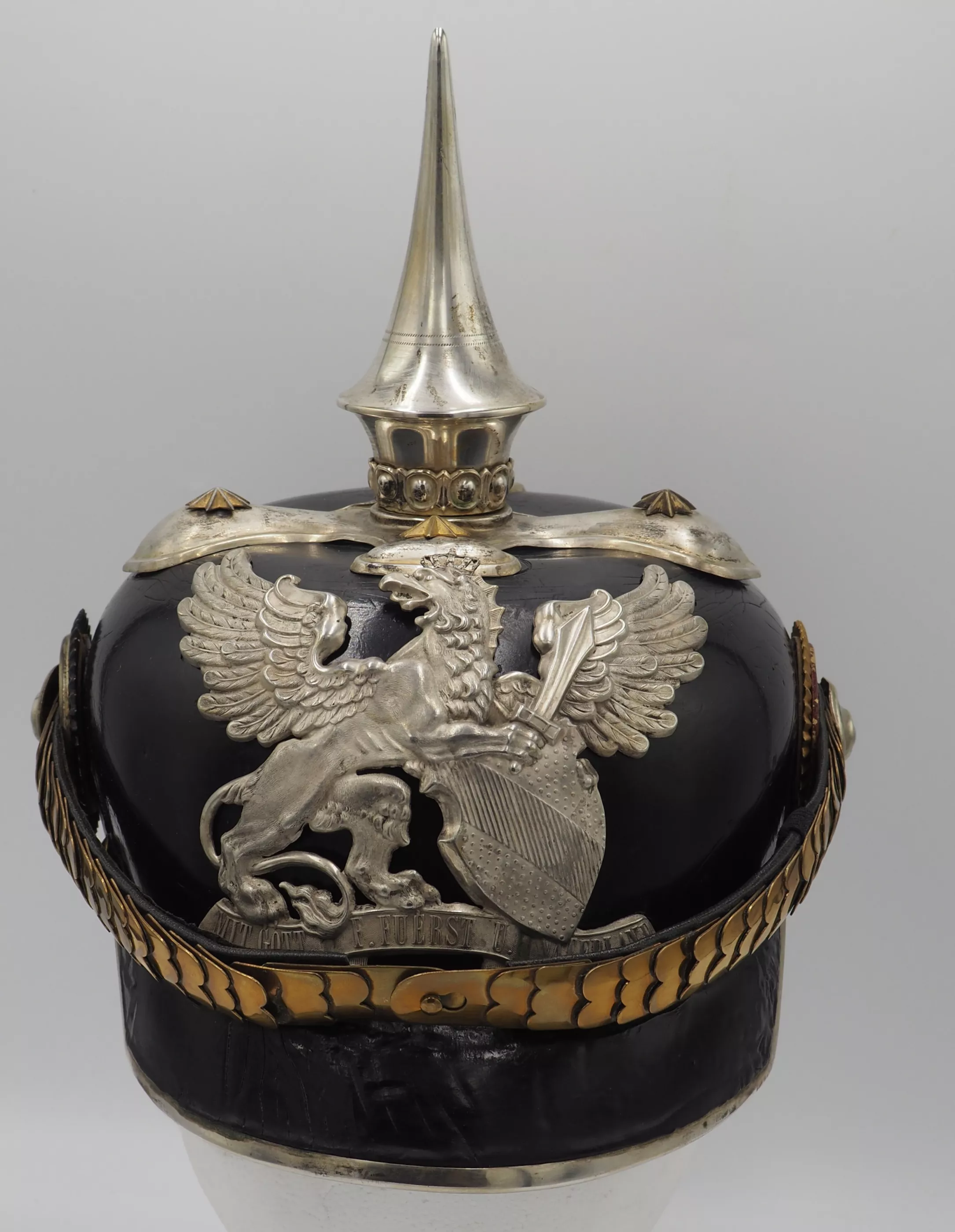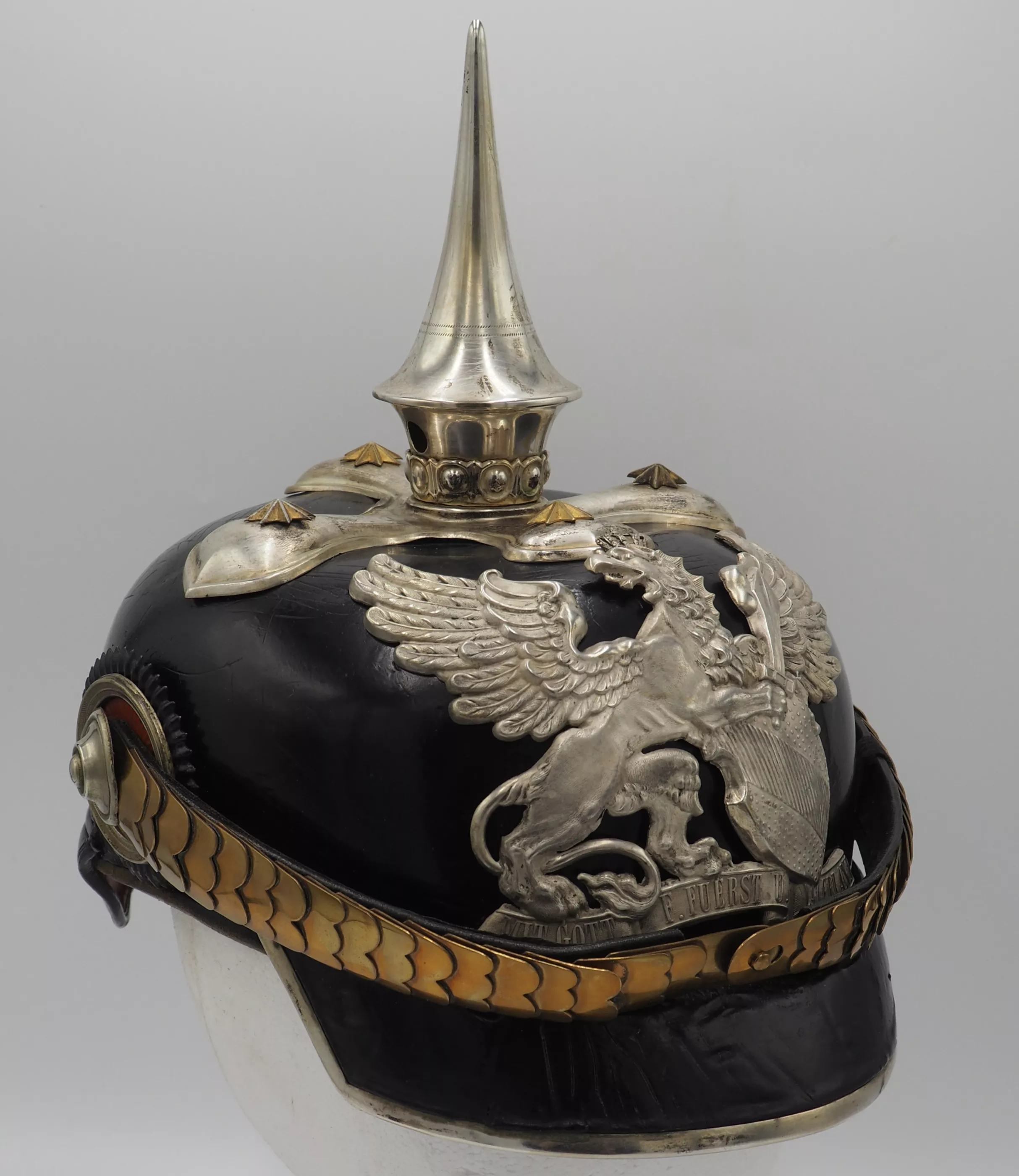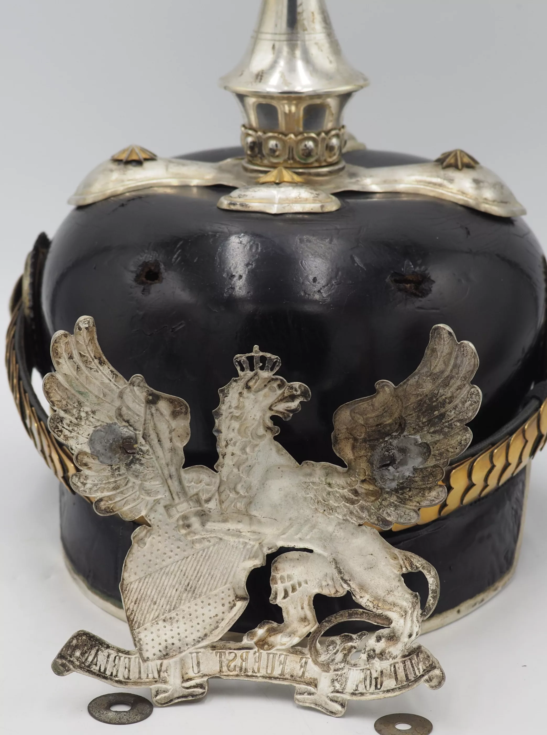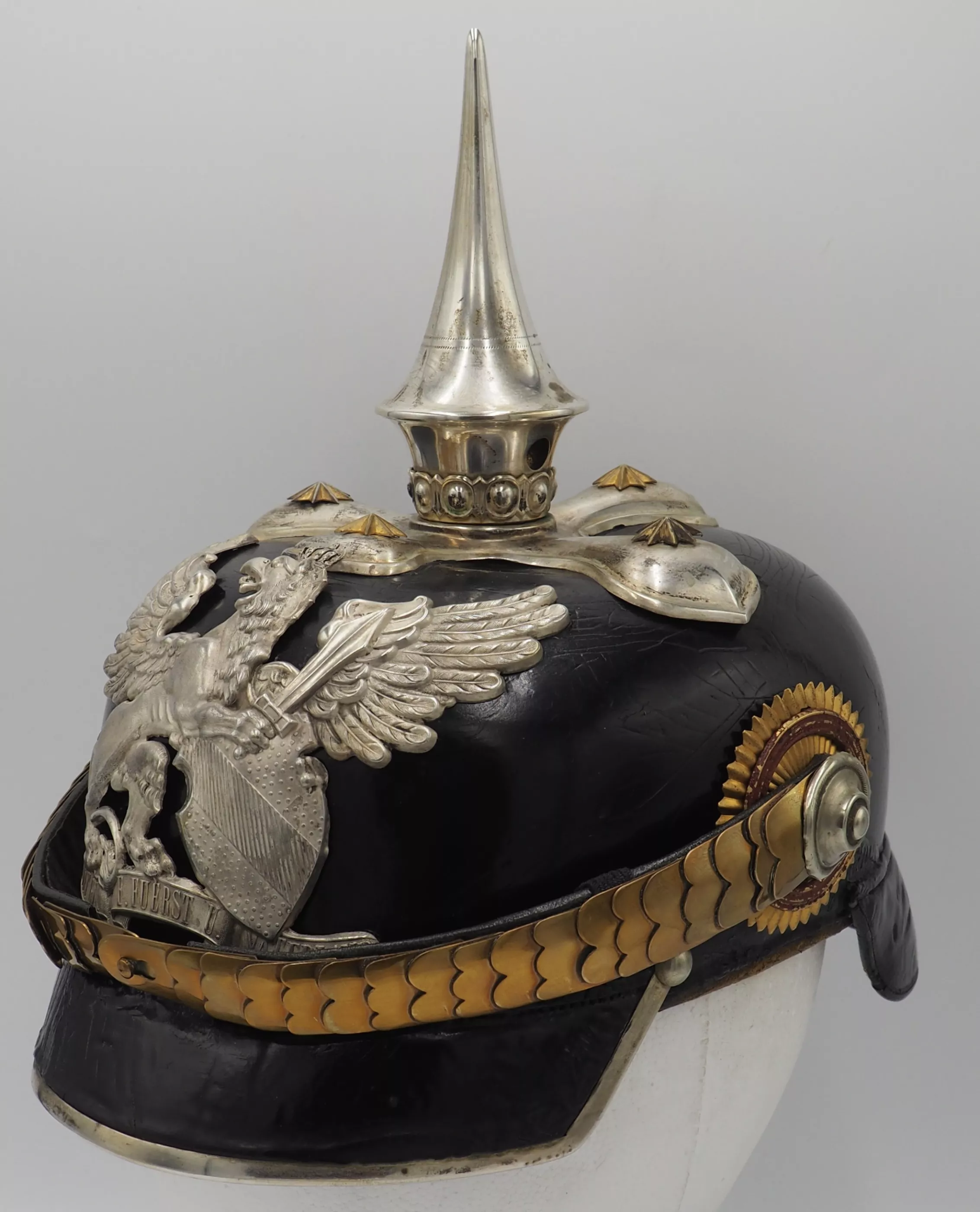 Interior visors are lined with Green and Red for Officers. The polished silver trim is high-quality. All the metal trim matches in color 100%. The spike base has crossed base and officer pearl ring with a removable tall spike. The base is held to helmet body with brass/gilt stars retainers that are split brads. The frontplate is the silver frosted Baden Griffin that has split brads retainers. Rounded gilt chinscales on silver rosettes. Officer style 2-piece Reichs cockade and furled non-serrated Baden cockade. The helmet retains its original fire gilding.