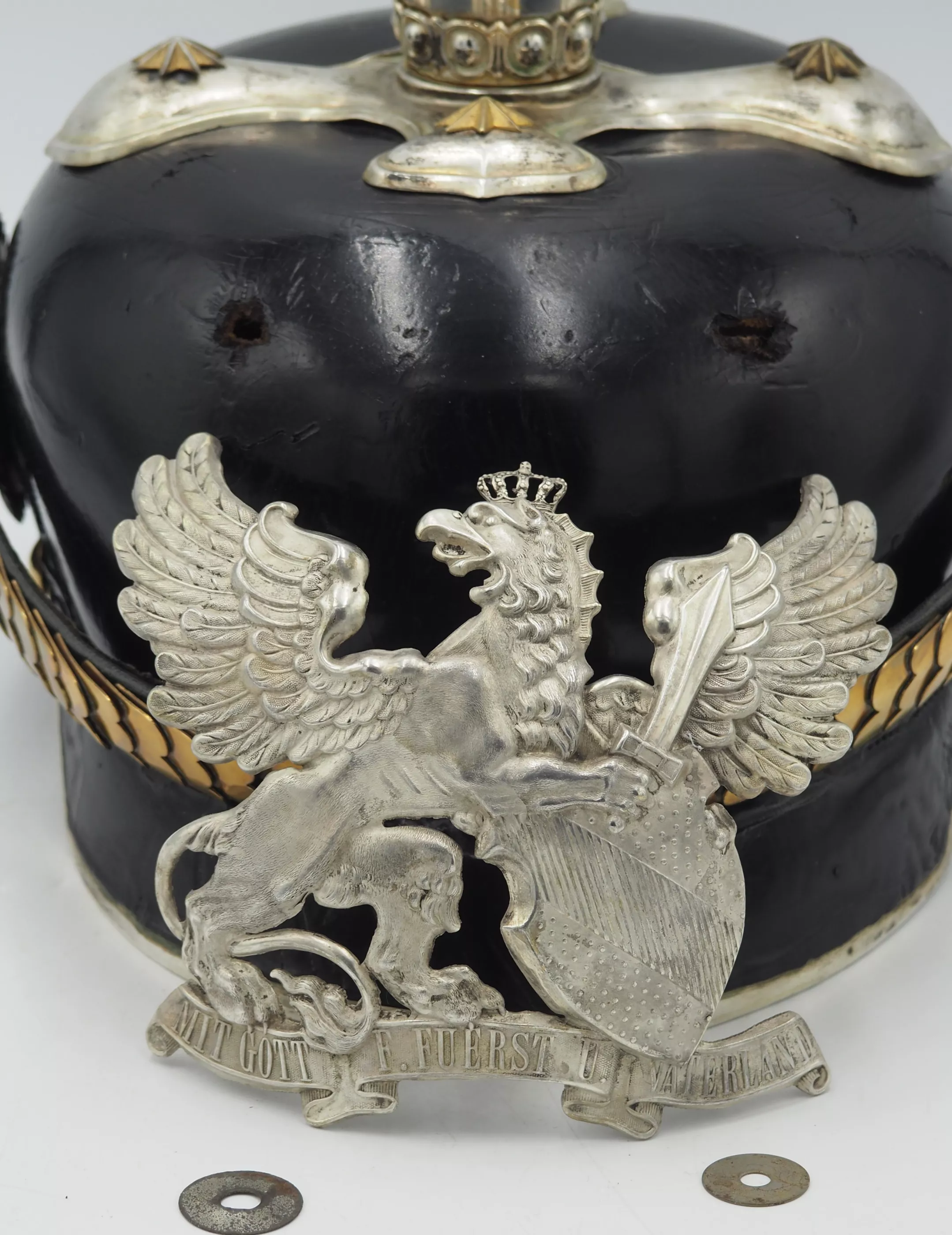 Baden Dragoon Officer from Regiments 20, 21 or 22, Model 1897. From the Rich Ames Collection. All officer high quality construction. Black lacquered leather helmet body with squared front visor and silver metal trim. All metal parts are held to helmet by split brad retainers. The helmet body has nice form and firm stitching. Exterior lacquer is complete with some minor crazing. No extra holes in the helmet body. The interior has officer quality soft sweat leather and silk headliner. The sweat leather is embossed with the manufacturer “Awes Marke”.
