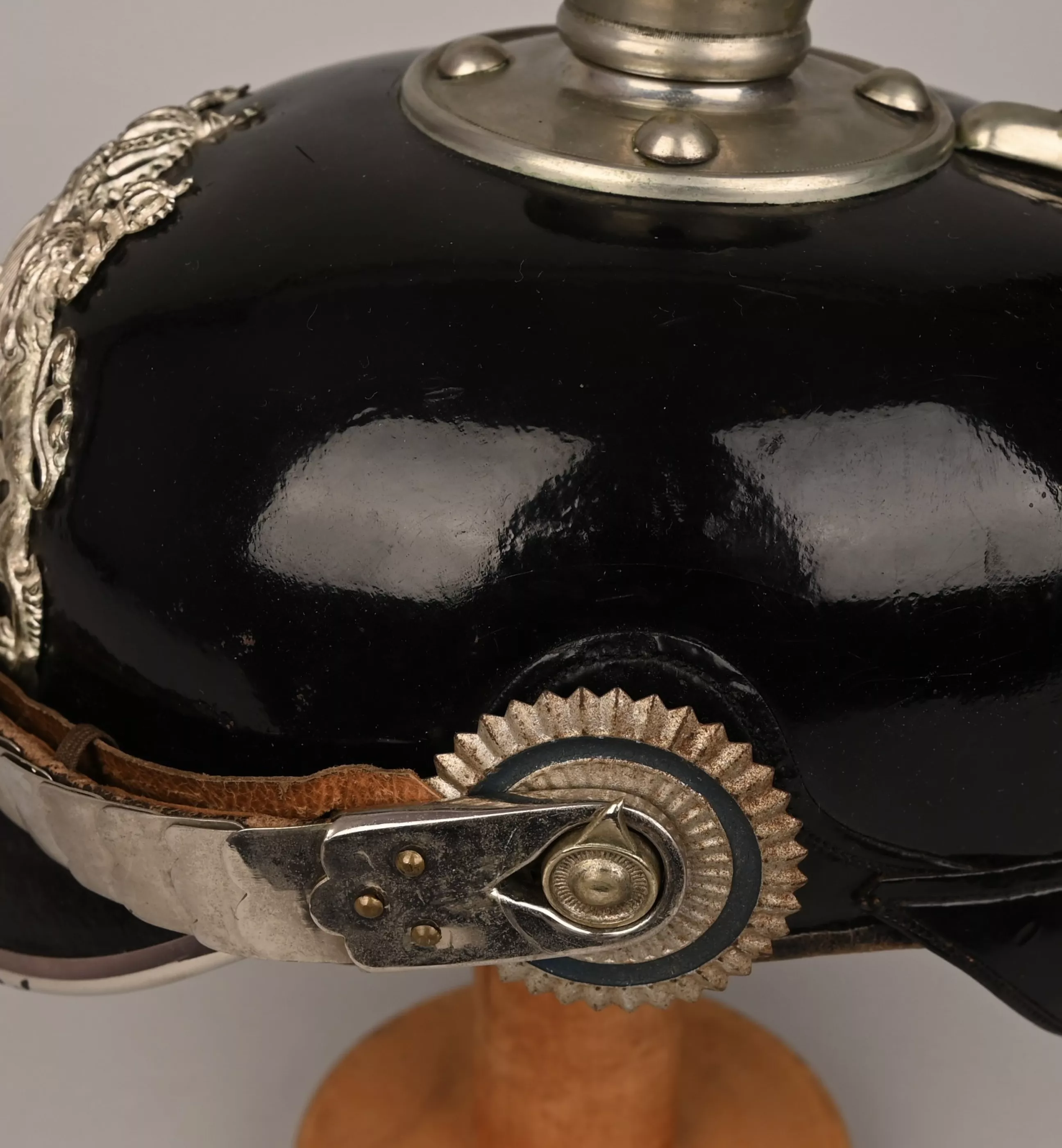 Bavarian Leib Infantry NCO Model 1897 Pickelhaube. Beautiful and absolutely virgin and untouched. Black lacquered leather helmet body with silver trim. Helmet body has excellent form and firm stitching. Exterior lacquer still has its polished sheen in immaculate condition. Interior has the officer sweat leather and brown colored silk headliner in absolute MINT condition. Round front visor lined in green, back visor lined red. No extra holes in helmet body.