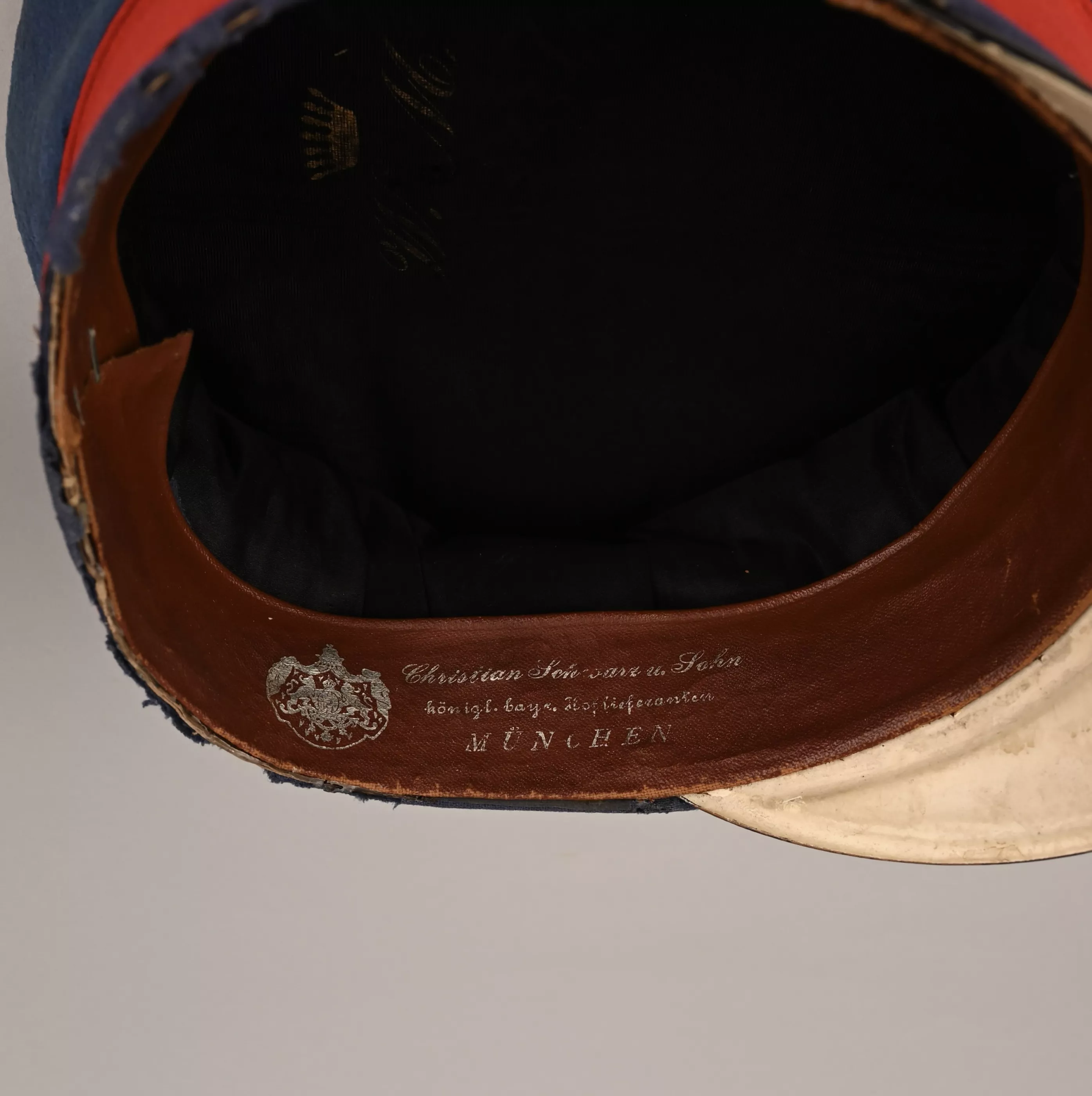 Inside Lining with the brown simi-leather sweat band marked from the famous Munich Makers "Christian Schwarz", who was the provider of most of the Royal families Uniforms and accoutrements. Sweat band has unfortunately been repaired in some places (mainly towards the back) and "stupidely" stapeled twice in the rear (see pics). We did not try to remove any and will leave this to the futur owner, but we believe it can be easily made better by a Pro. Black silk lining in excellent original condition.