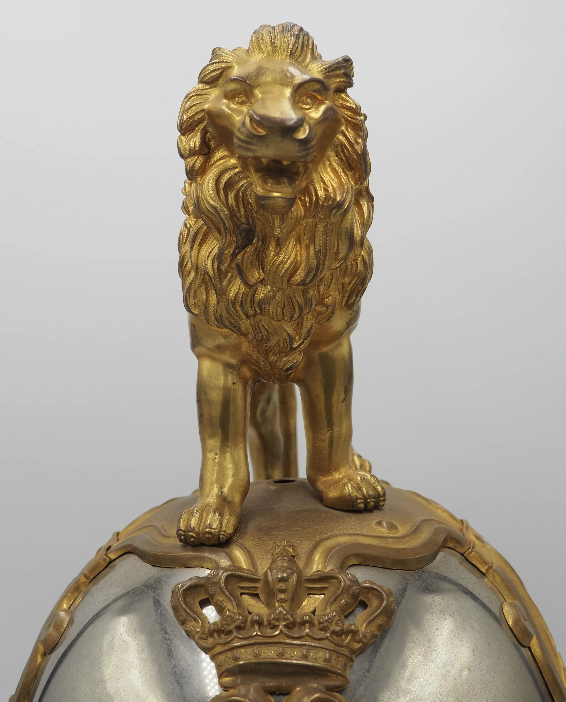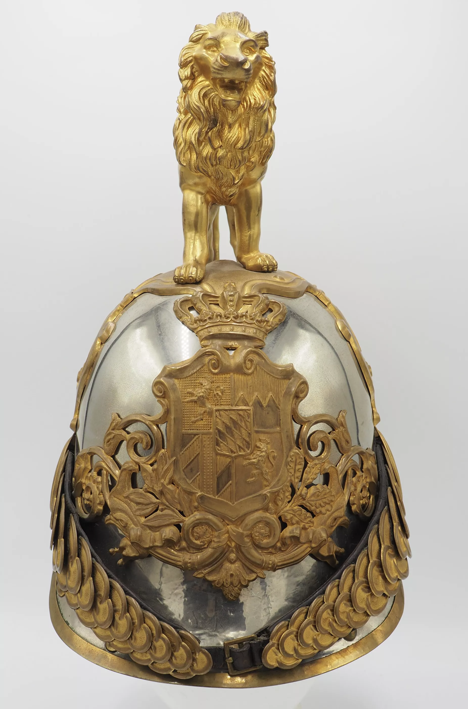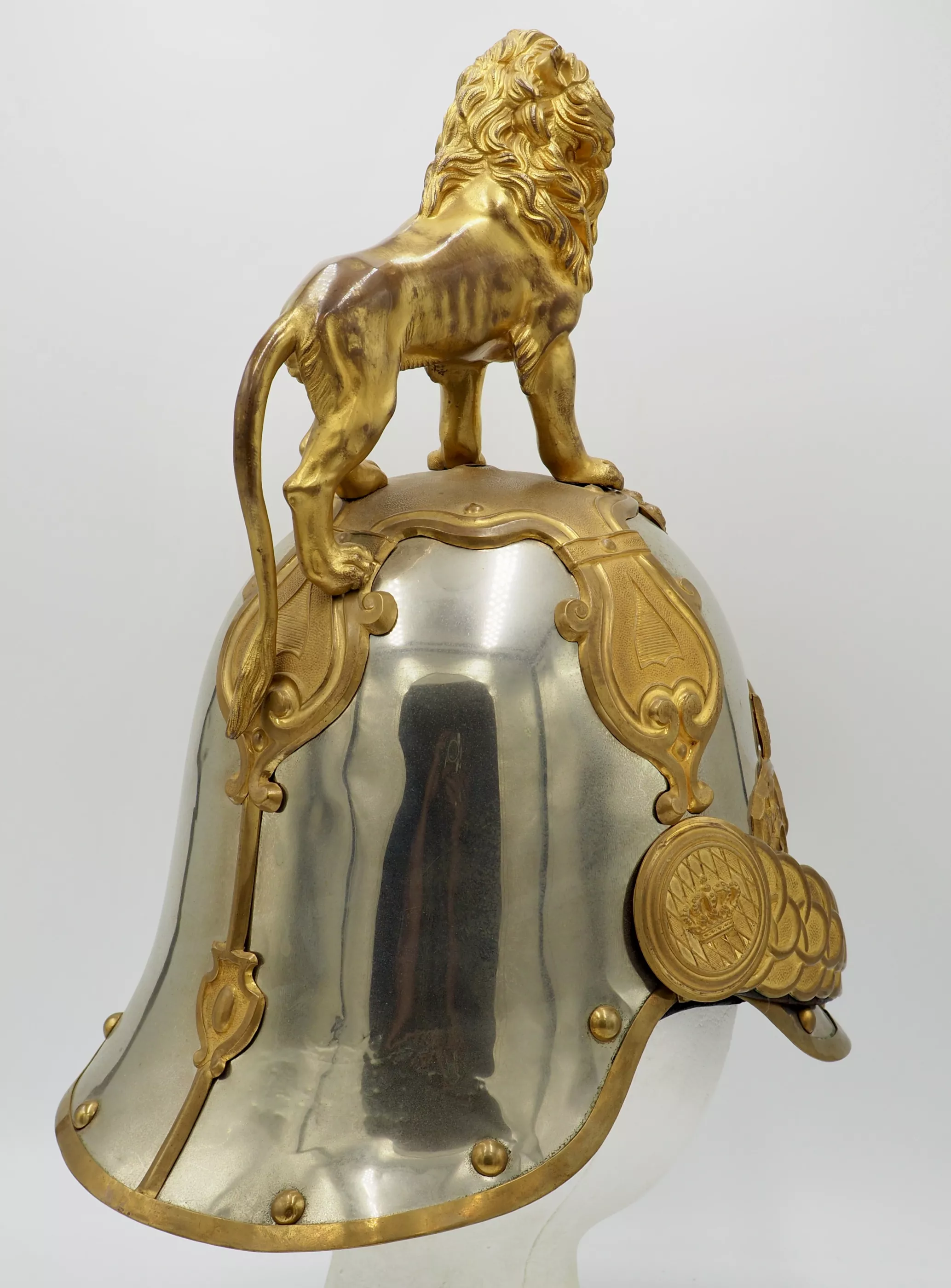 Bavarian Hartschiere Officer helmet Model 1852 with Parade Lion. Original and untouched helmet from a noted US collection. Nickeled metal helmet body with attached visors. The front visor with painted green underlay (only traces left on this helmet) and the rear visor with painted black underlay. Gilded cross base, lion, rivets and trim. Gilded officer front plate of Bavarian shield and crown attached by three screw posts. Gilded ornate interwoven chin scales with large Bavarian crown rosette side posts. The gilded Parade Lion is separately attached to the helmet with screws. Complete with original fancy leather liner with velvet inner trim. The helmet is all original and has never been cleaned or polished. The condition is excellent with fine gilding intact. Extremely rare helmet.