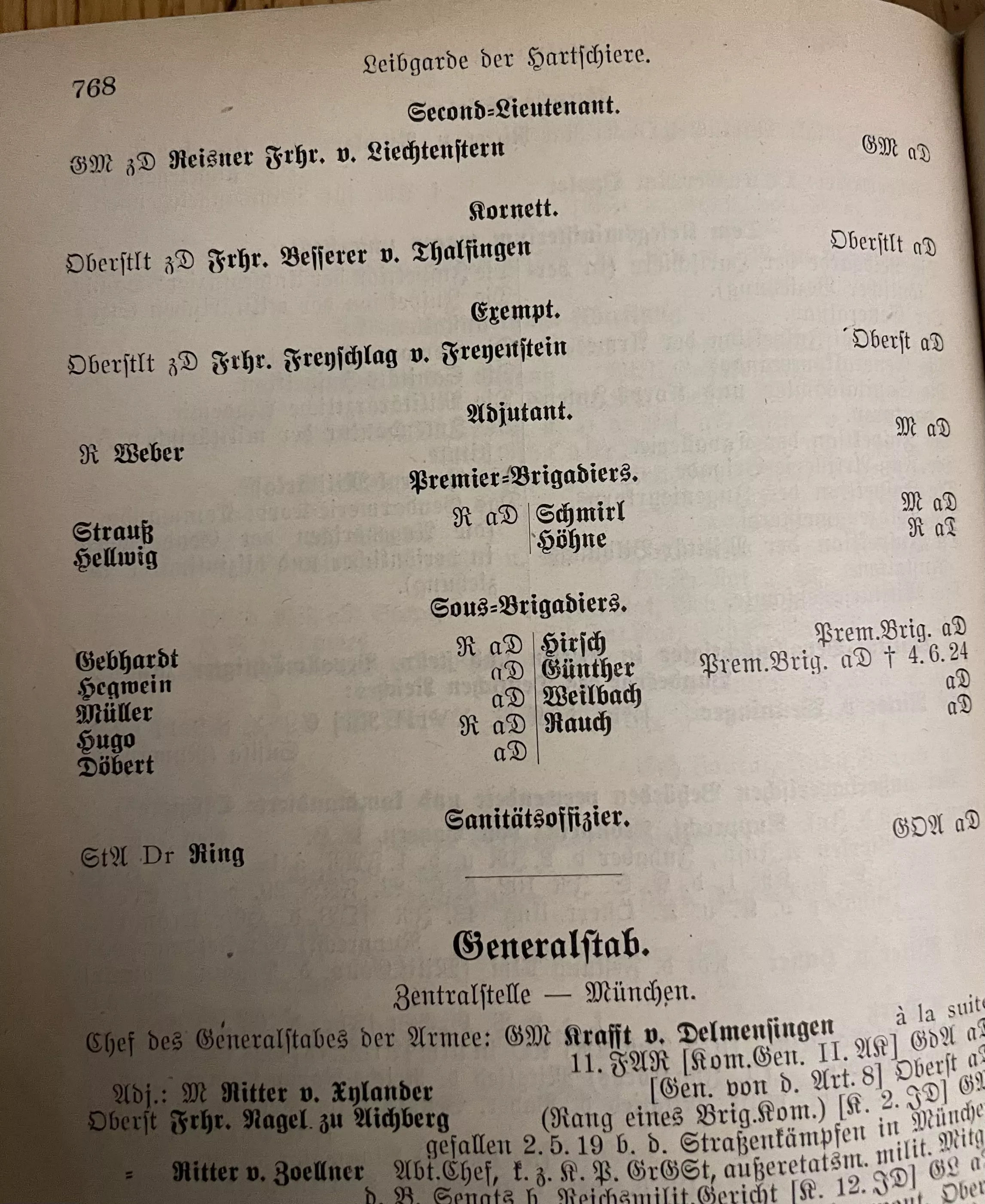 **Note that the pictures associated with this posting are NOT part of the sale. The first picture shows a Hartschier (Eduard Bash) in "Waffenrock" , the two later picture where taken in 1929 with the GeneralKapitän Felix Graf von Bothmer (1852-1937) in presence of Prinz Alfons of Bavaria..... Yes, they still wore these helmets then! Two more copies of the Ranglisten with the names of the officers.