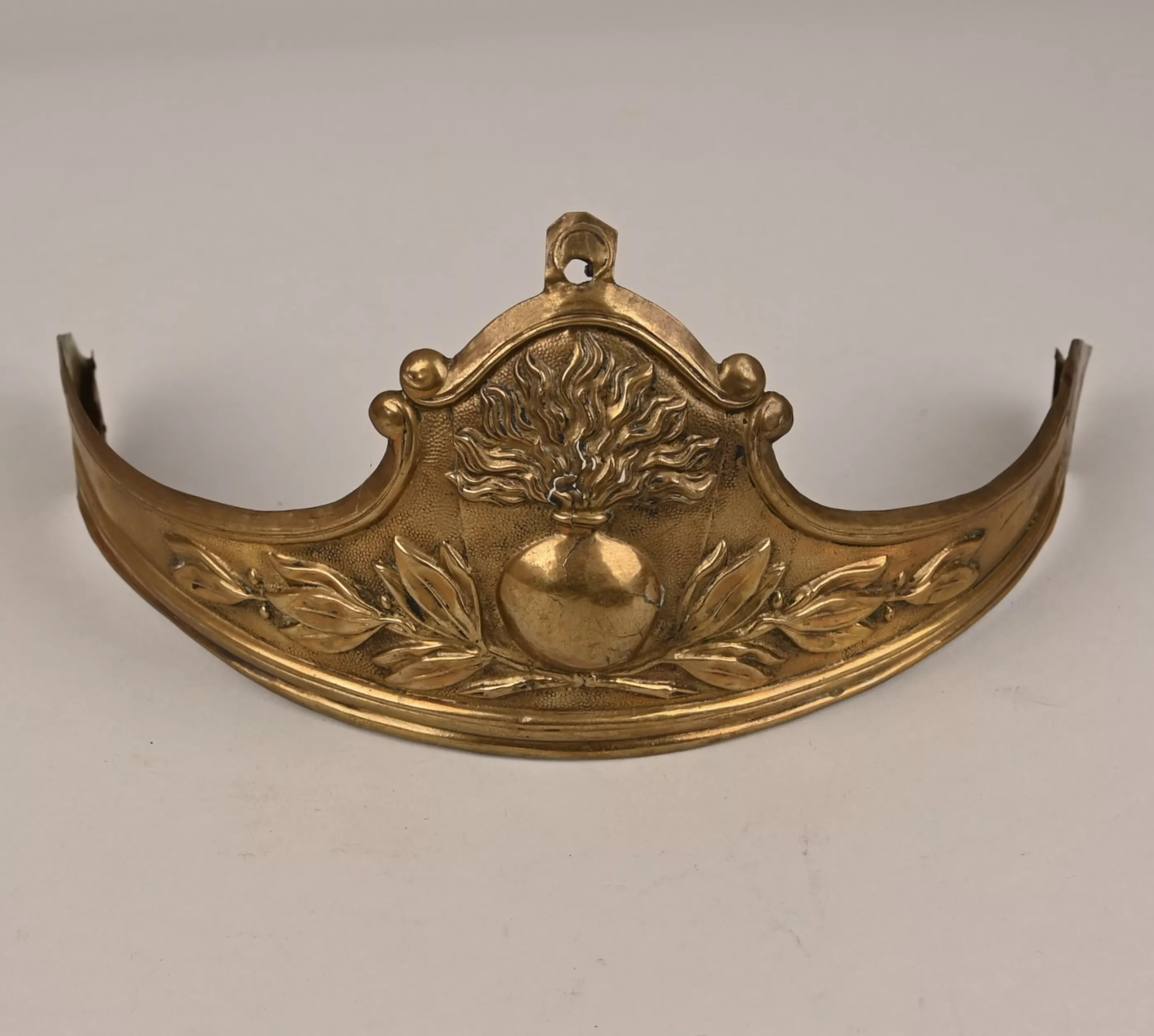 French III Empire Model 1854 Cuirassier de la Garde Helmet Bandeau - Modified after the fall of the Empire - adapted with a "Flaming Bomb or Grenade" instead of the typical "N" used on these helmets. This one is complete an 100% original. Notice that the "N" was cut-out and replaced with the New Emblem. It was then "Cast" and ALL models that we have seen have the same configuration, hence the solder mark of the repair is still visible on the newly pressed plate! RARE as only a few helmets made it through this transition.
