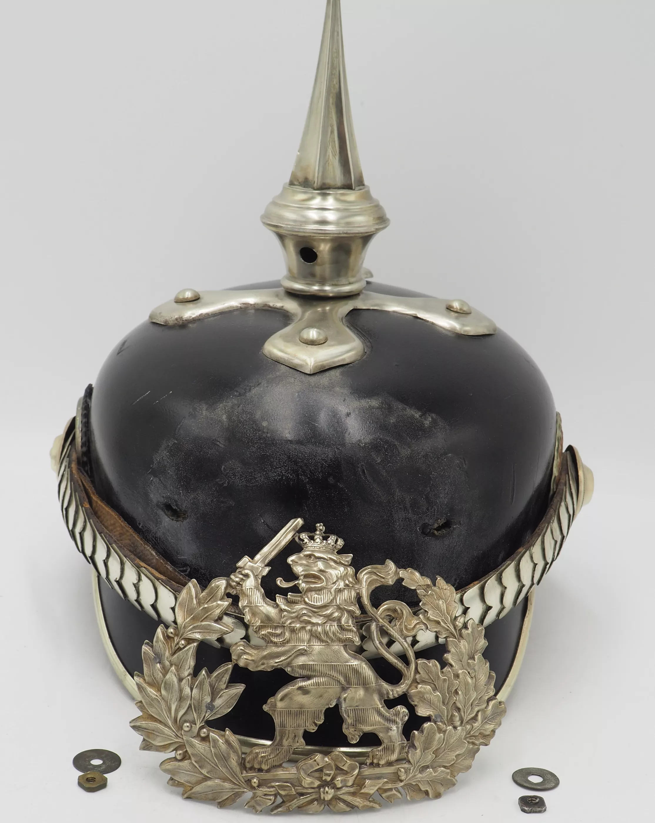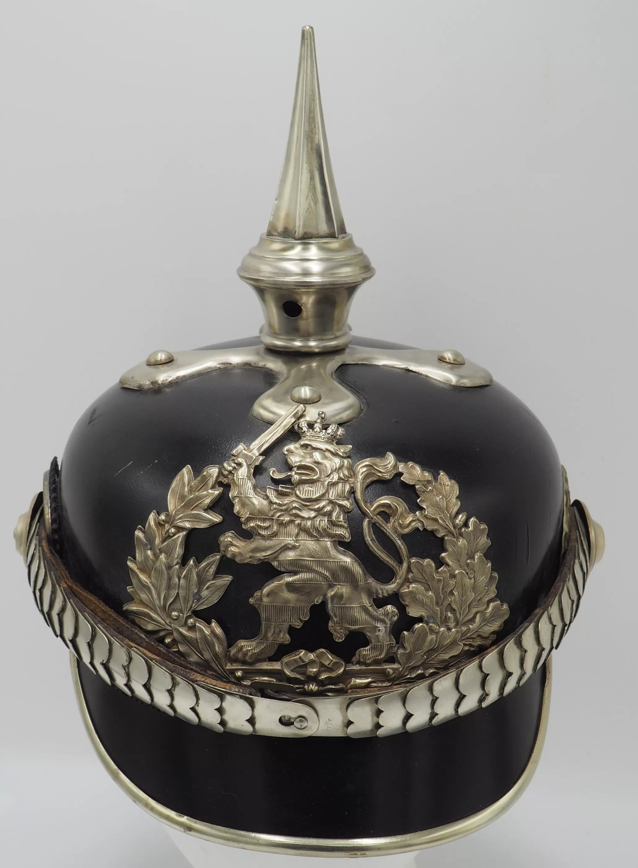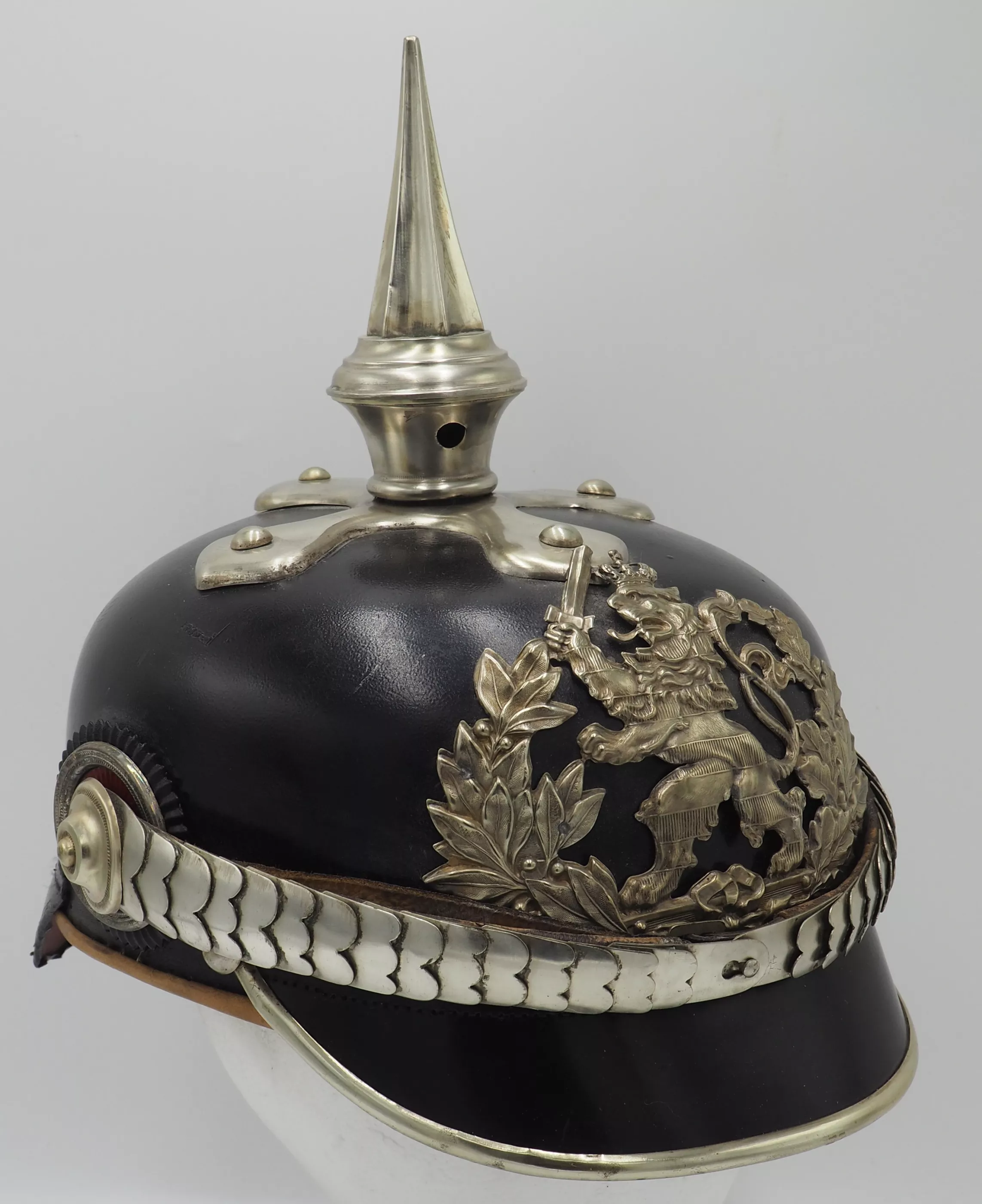 Silver metal trim is very shiny but has been left uncleaned. The frontplate is the wreathed Hessen Lion in silver metal wreath. Hessen style cross base mounted with silver domed retainers. Unique tall Hessen style fluted spike. Rounded silver chinscales on silver rosettes. Impressive and Rare Elite regimental helmet. This helmet will be nearly impossible to upgrade.