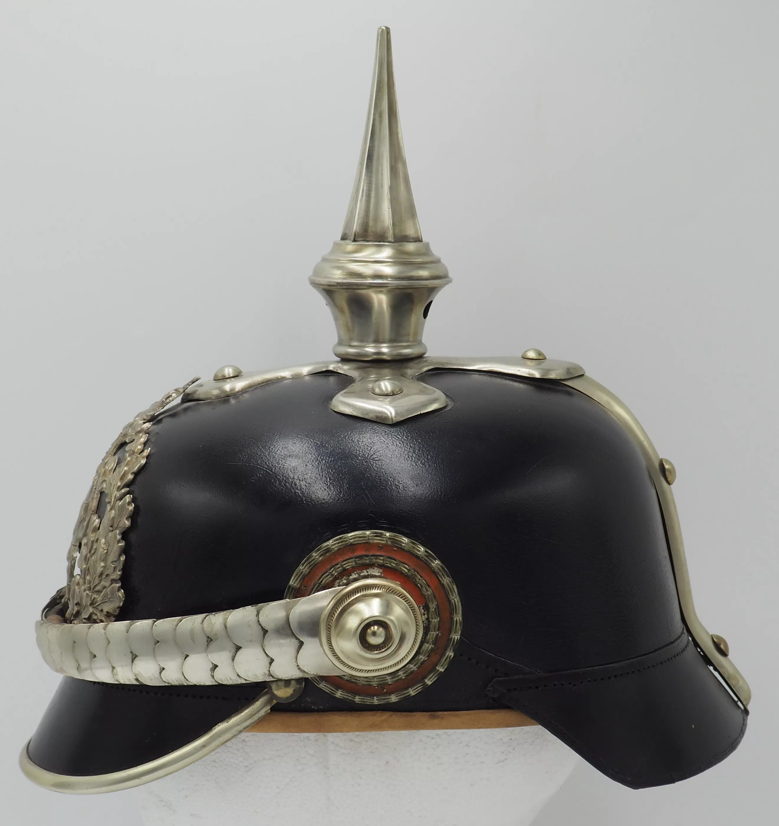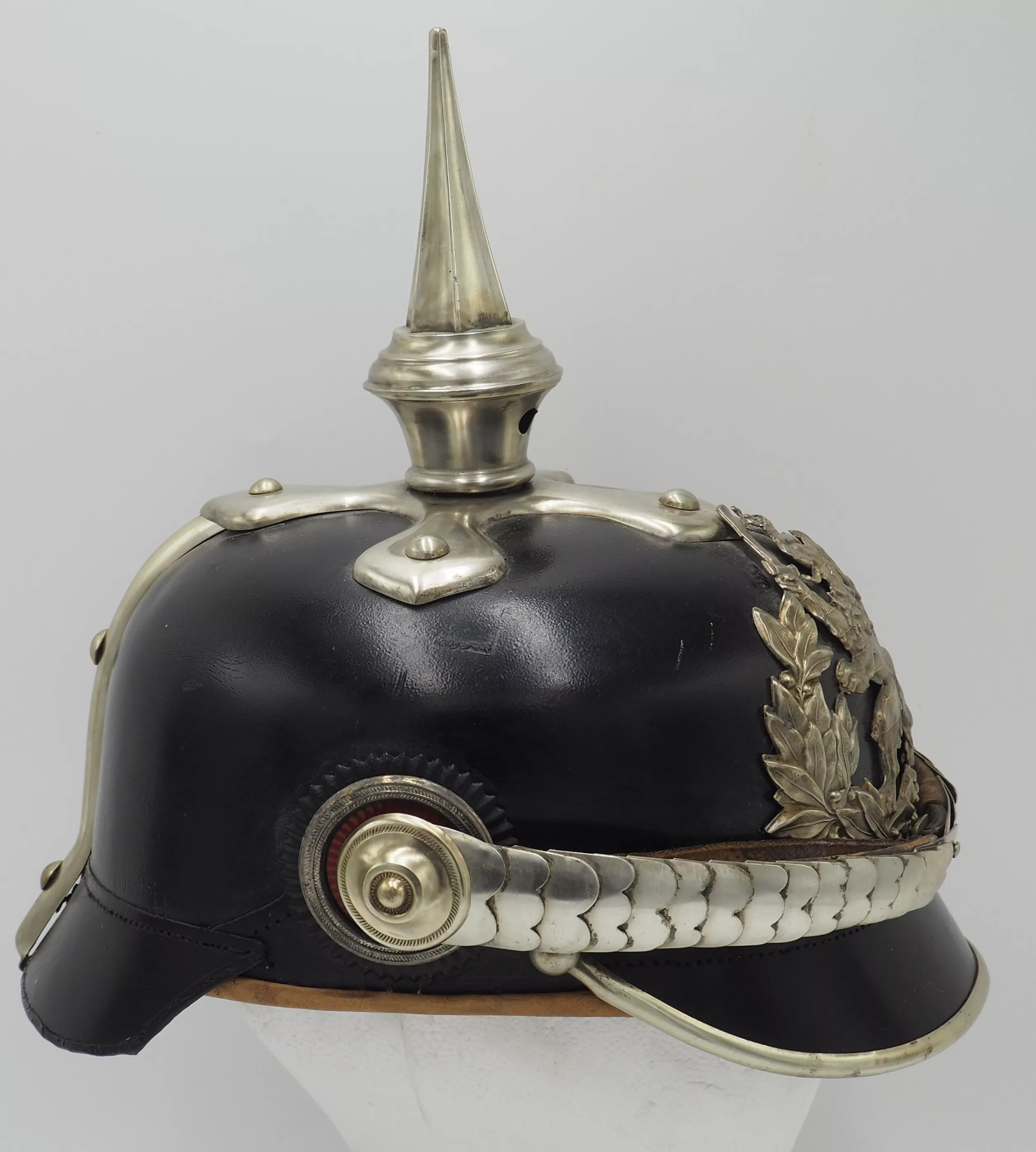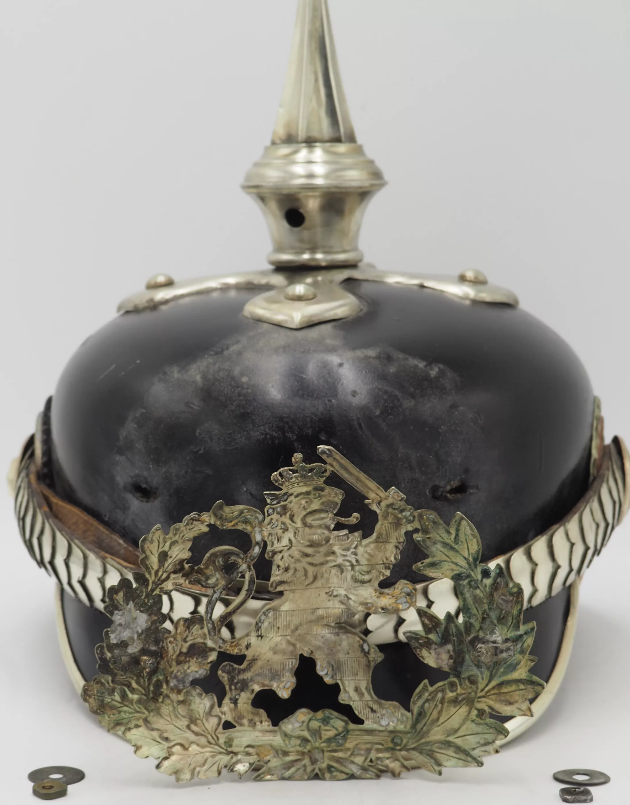 Silver metal trim is very shiny but has been left uncleaned. The frontplate is the wreathed Hessen Lion in silver metal wreath. Hessen style cross base mounted with silver domed retainers. Unique tall Hessen style fluted spike. Rounded silver chinscales on silver rosettes. Impressive and Rare Elite regimental helmet. This helmet will be nearly impossible to upgrade.