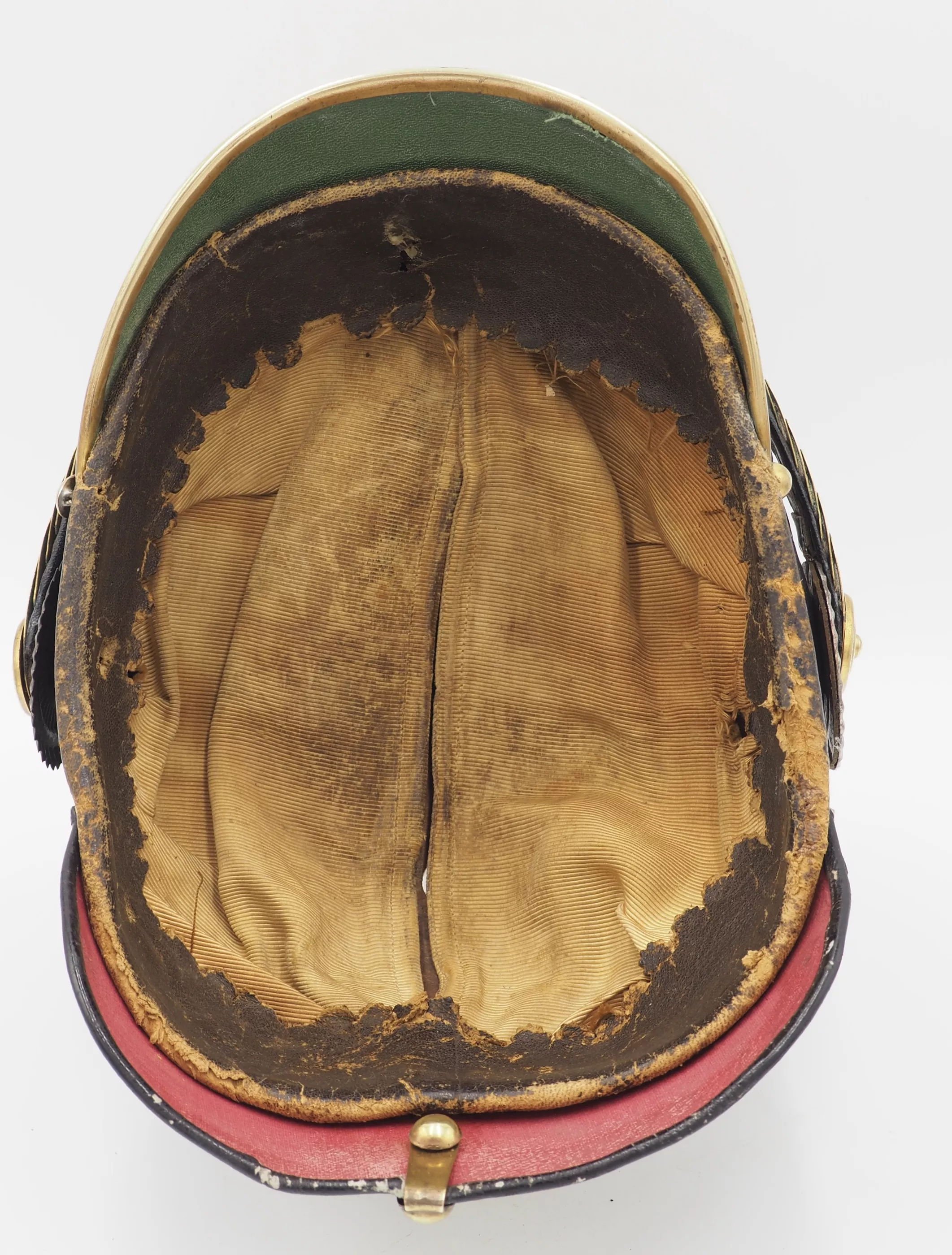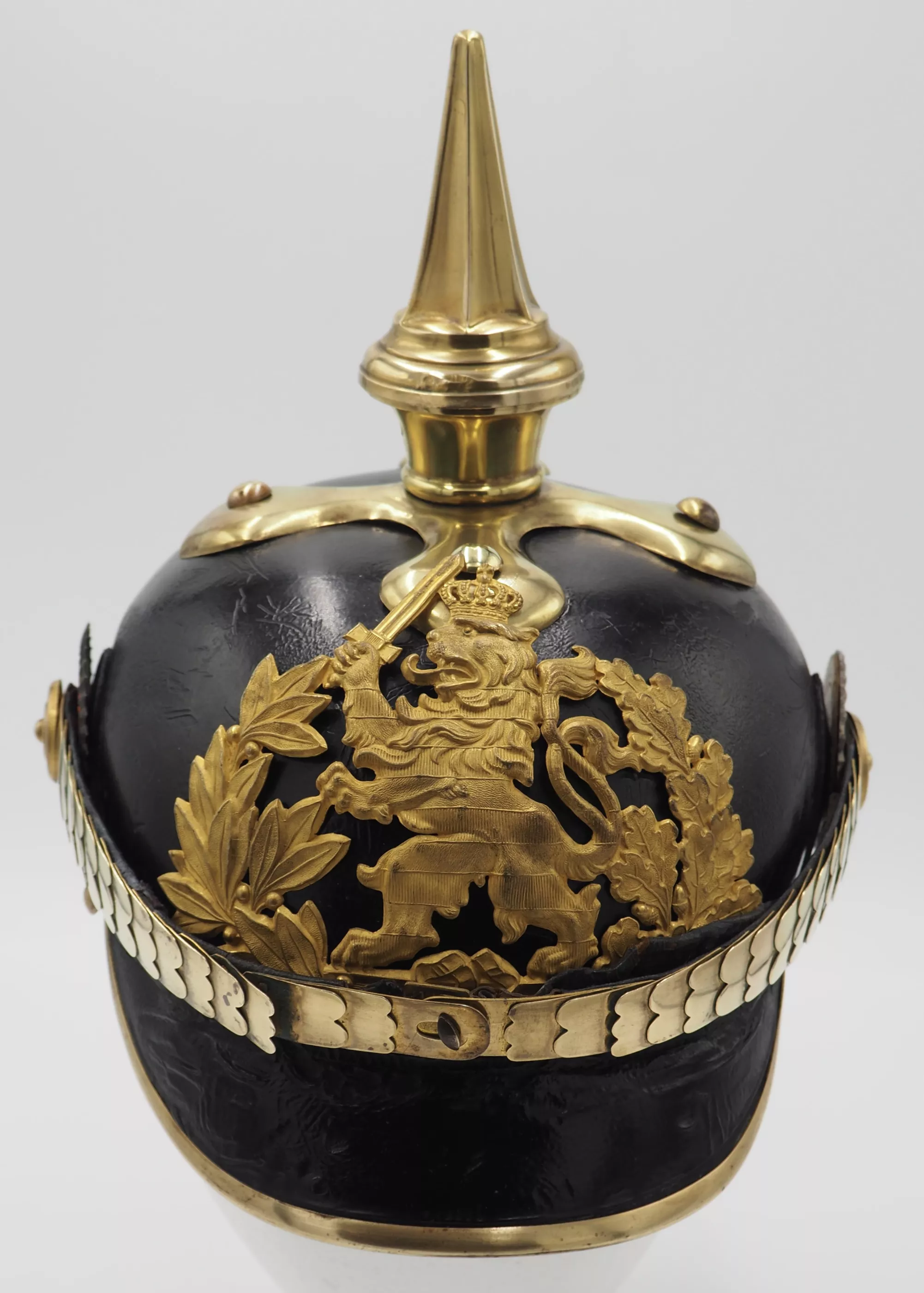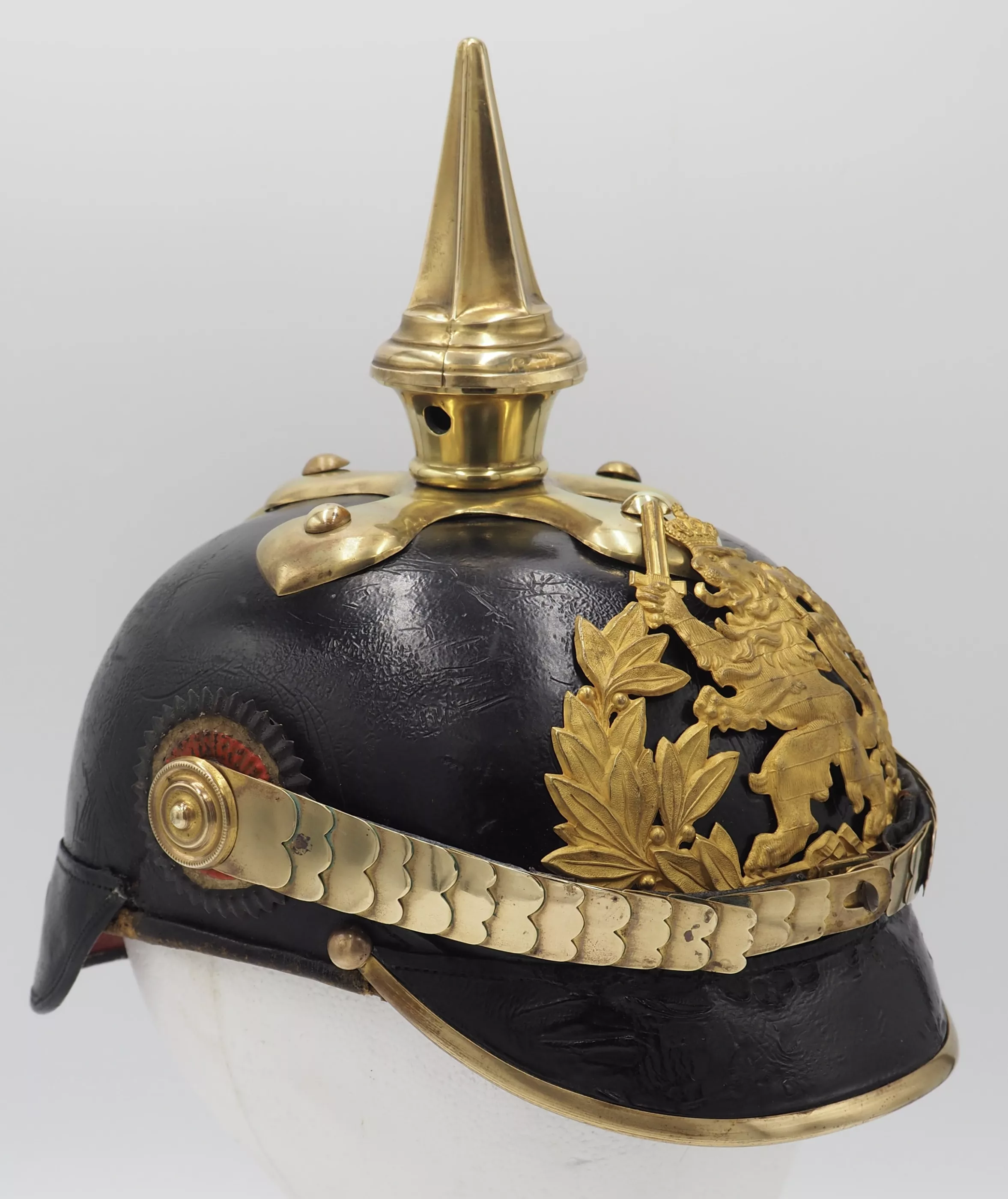 Hessen Line Regiment NCO Model 1897. Fine Private Purchase - officer quality helmet. Black lacquered leather helmet body with gilded brass trim. Exterior leather finish excellent for age with no lacquer loss. Visor stitching is firm. The metal trim was gently cleaned by owner but not detractive. No extra holes in the helmet body. Interior has leather sweat leather and silk headliner. The sweat leather has some scuffs and silk headliner shows and is dirty (see photo)