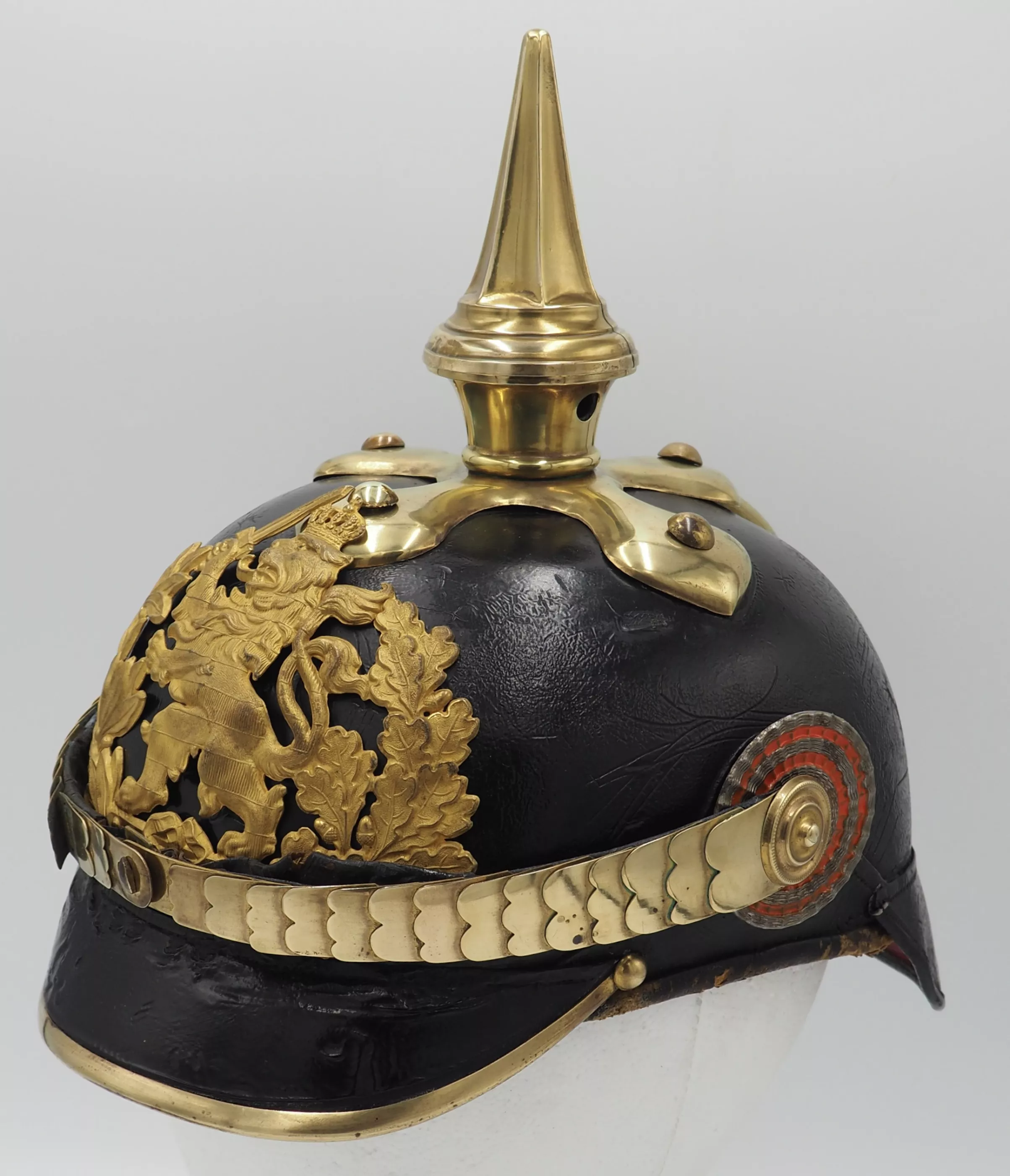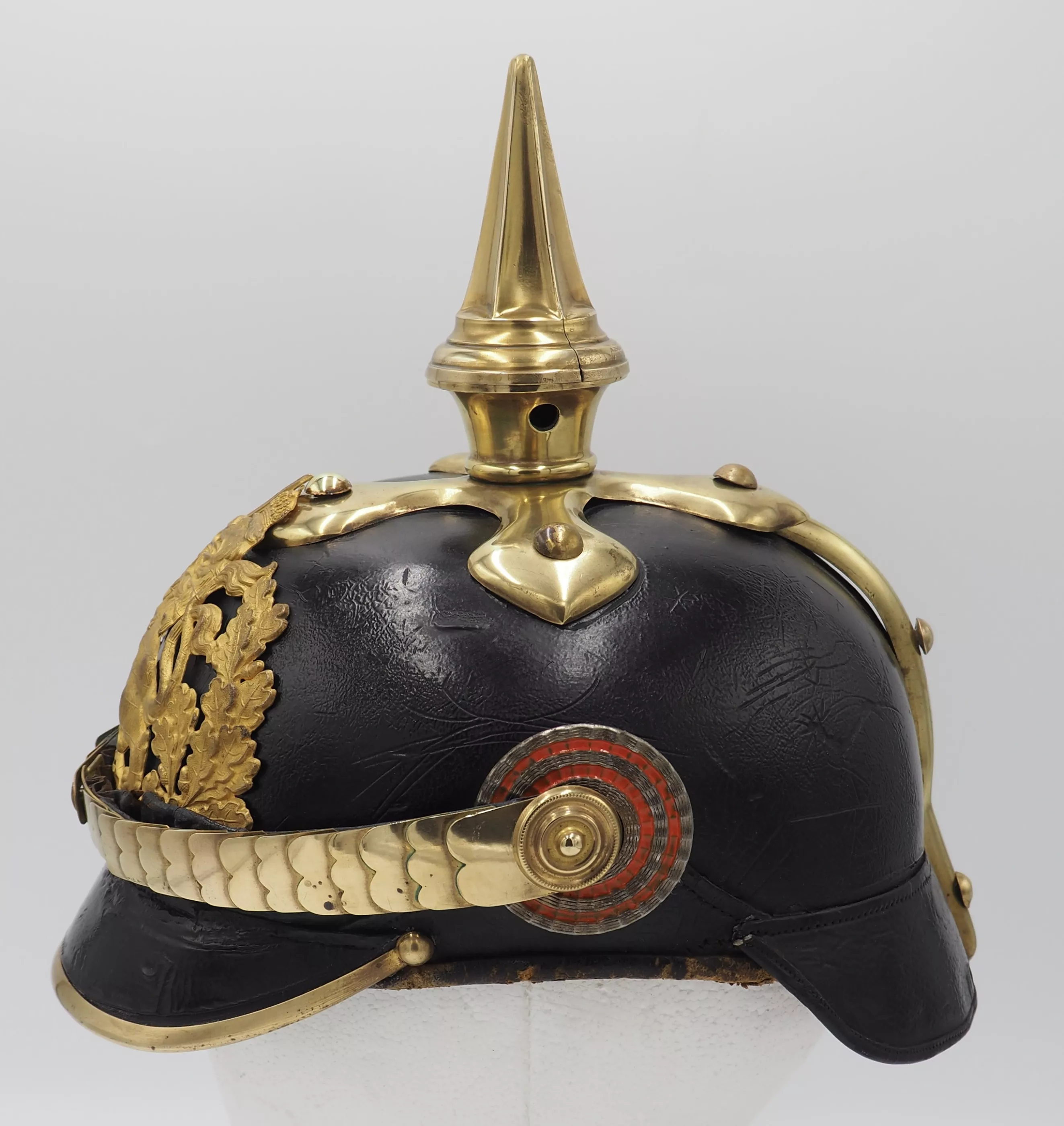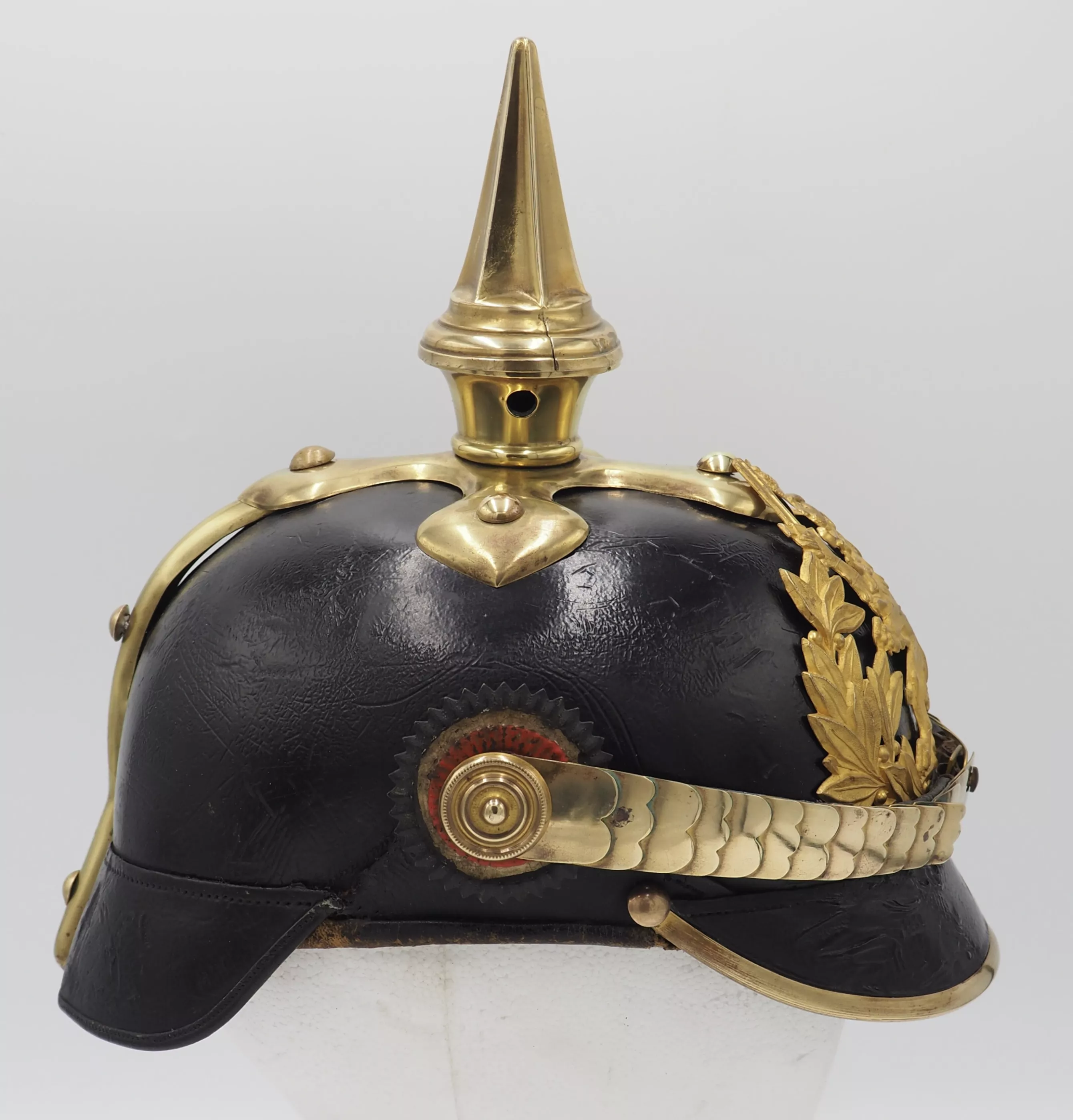 Hessen Line Regiment NCO Model 1897. Fine Private Purchase - officer quality helmet. Black lacquered leather helmet body with gilded brass trim. Exterior leather finish excellent for age with no lacquer loss. Visor stitching is firm. The metal trim was gently cleaned by owner but not detractive. No extra holes in the helmet body. Interior has leather sweat leather and silk headliner. The sweat leather has some scuffs and silk headliner shows and is dirty (see photo)