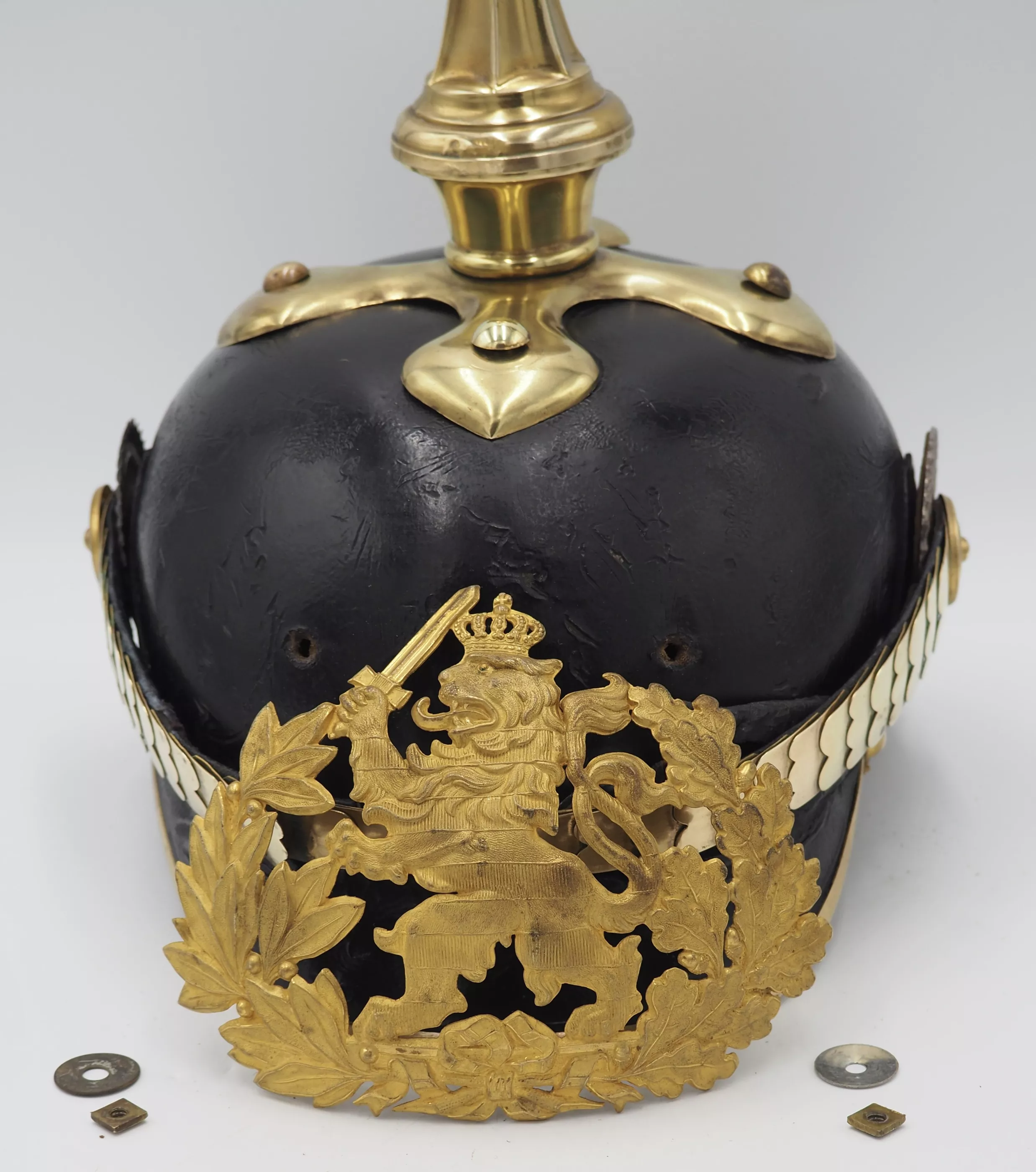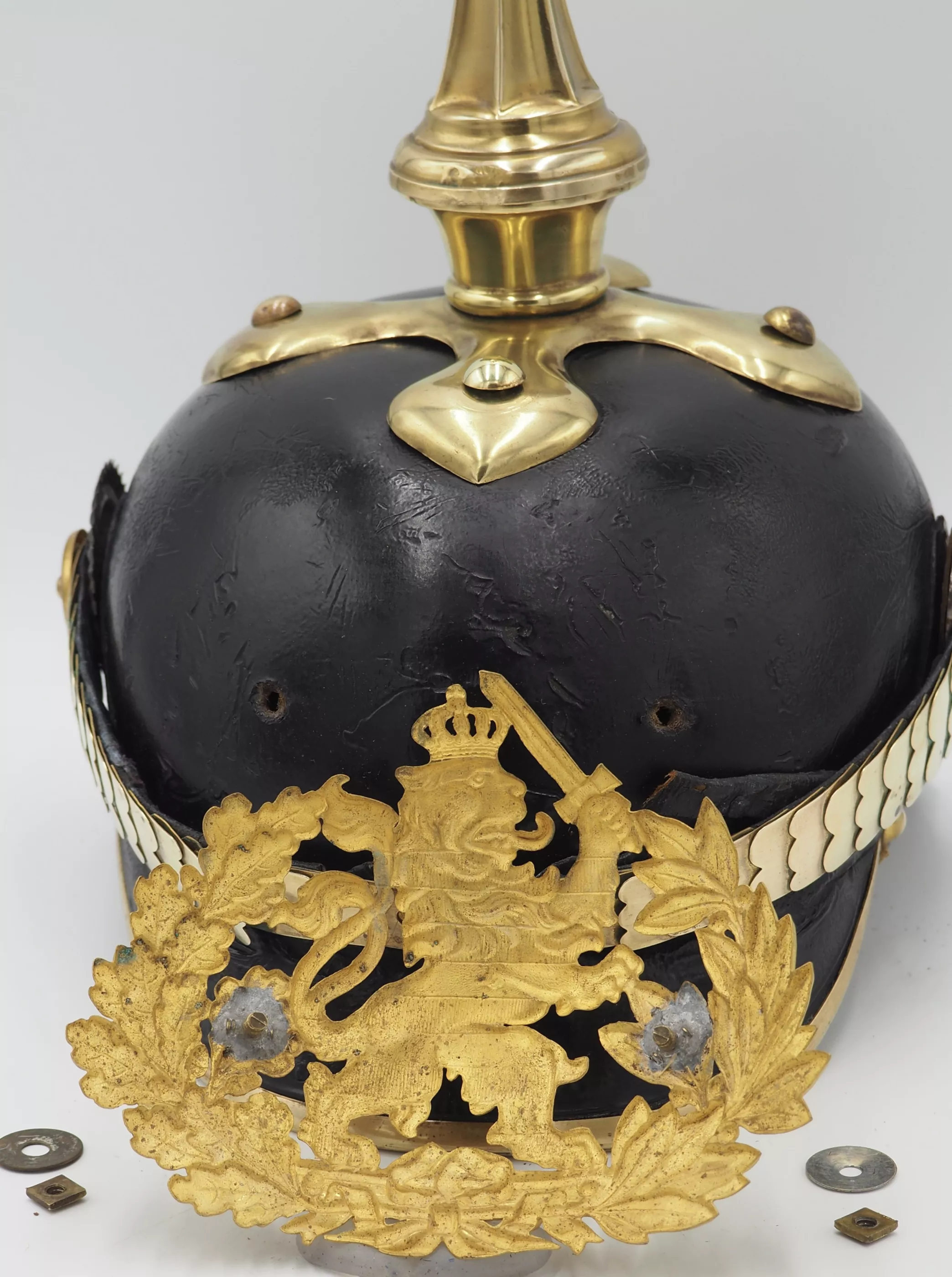 The helmet has an equal sided crossed spiked base with no officer ornamentation around base. Hessen style fluted spike that is removable. Rounded front visor trim. The finely gilded frontplate is the Hessen Lion holding an upward sword. The frontplate is held to the helmet body with screw attachments. There are NO extra holes in the helmet body. The backspine is the traditional Hessen style with rivet on the spine. Rounded chinscales on rosettes. NCO Reich and Hessen cockades. BEAUTIFUL helmet. Nice traditional Hessen private purchase NCO helmet. BARGAIN priced.