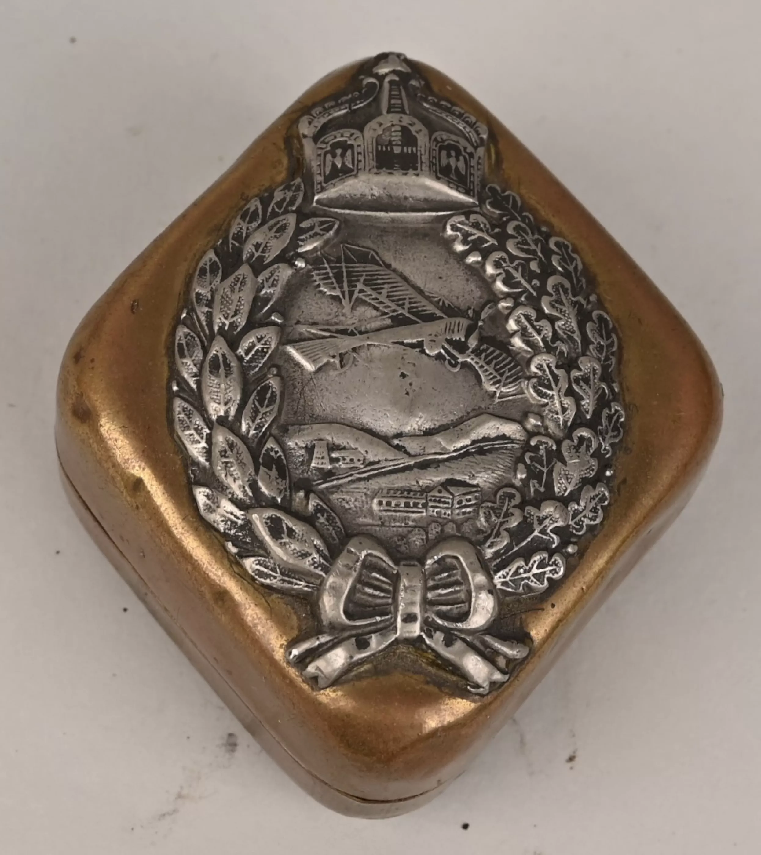 Stamped brass lined in brown leather. Top of the lid has the Flugzeugführer Abzeichen (Badge) in silver soldered to it. The bottom bears the Markings "I.FL 2ST. 7K. AACHEN 1917". very unusual souvenir.