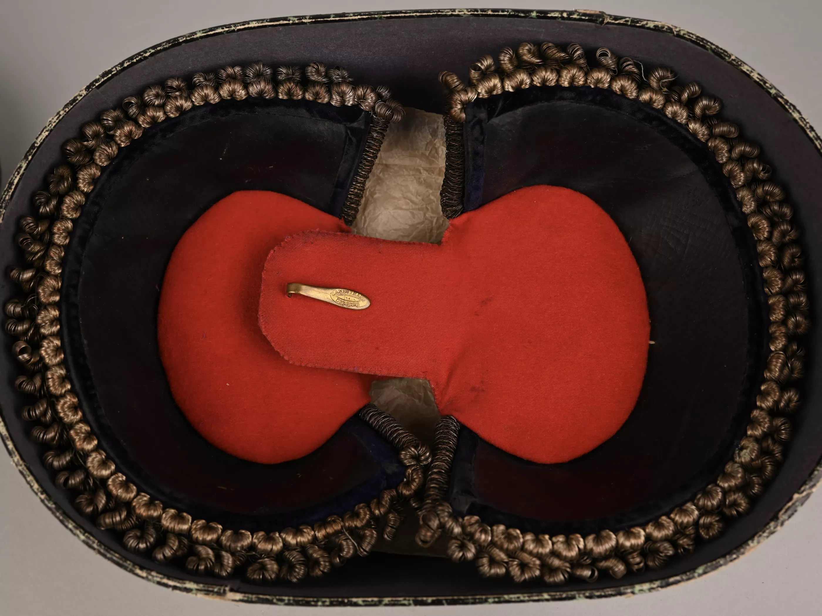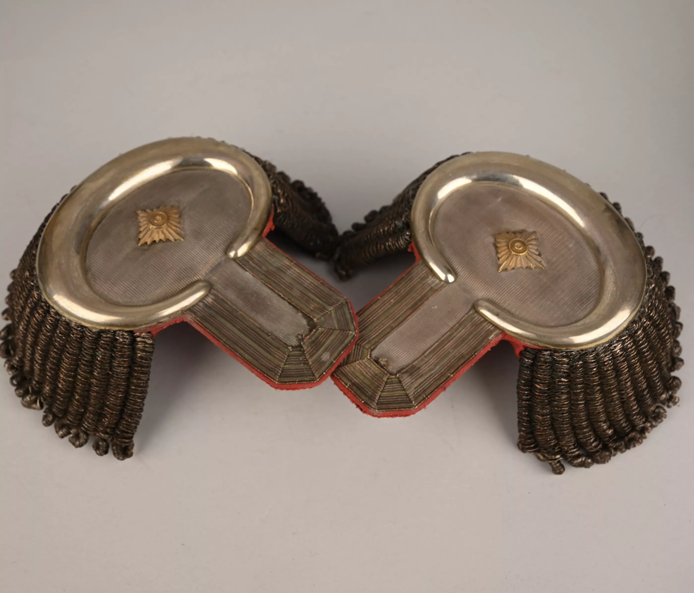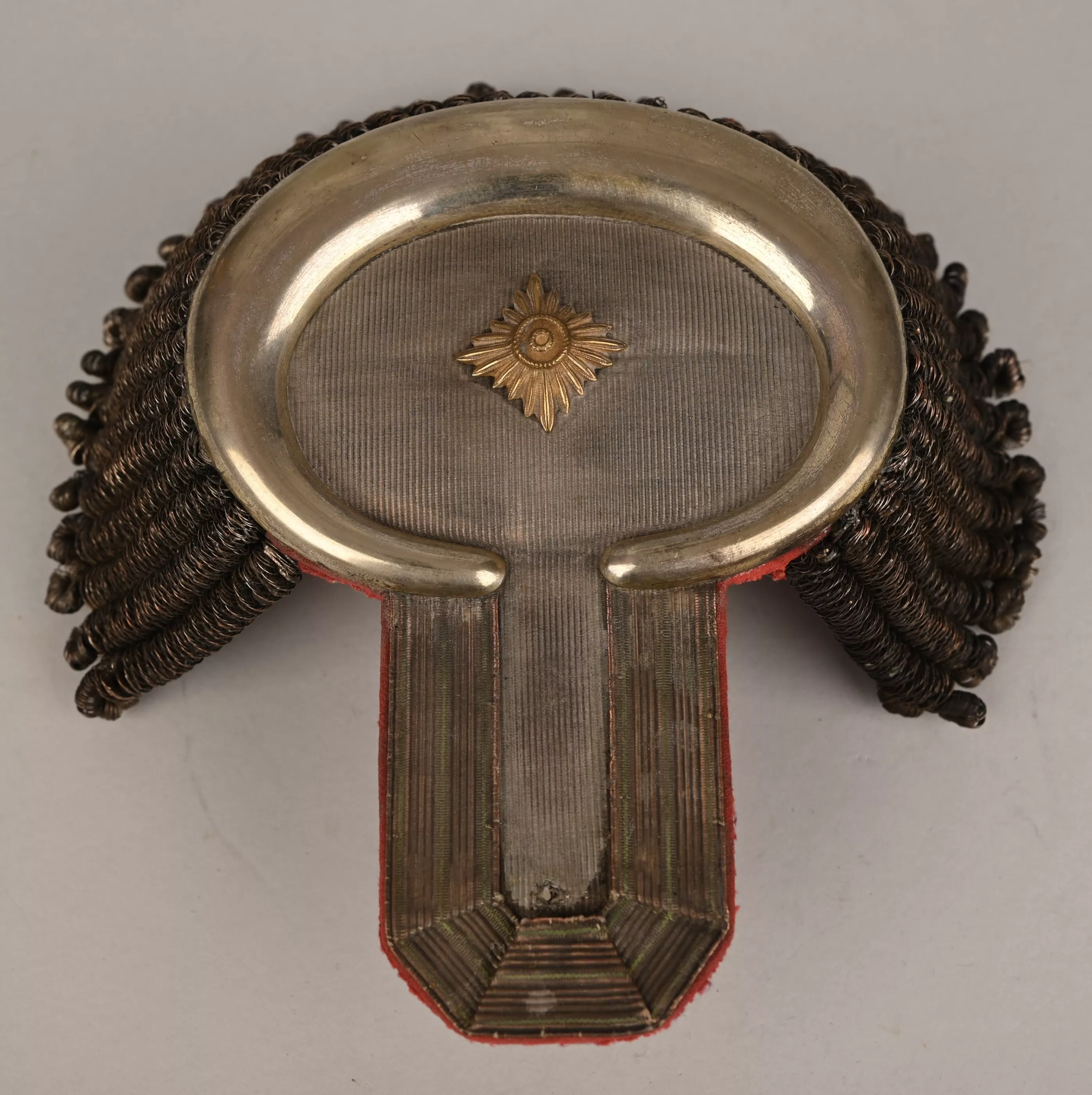 Superb Saxon Generals pair of parade Epaulets. Again these are always extremely rare. Plain Silver mesh bases with silvered half moon metal ends. Padded Generals bright red underlay below with typical Black and Purple Velvet leather stiffener and support, showing light wear. Maker marked "CA. Westmann Dresden". One gold Pip for the Rank. These epaulettes are in good / very good condition. A rare pair of Lieutnant General Officers rank of parade epaulets.
