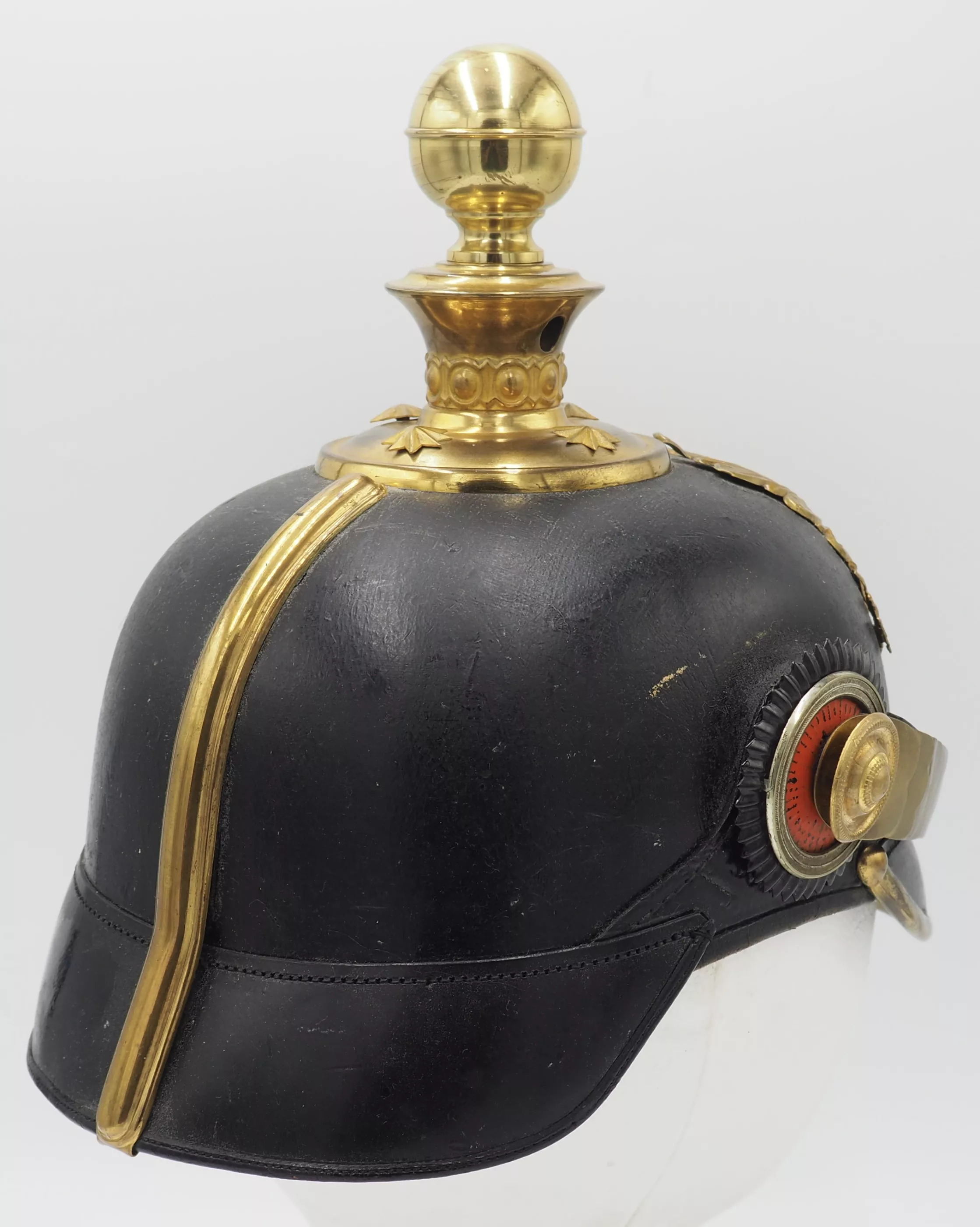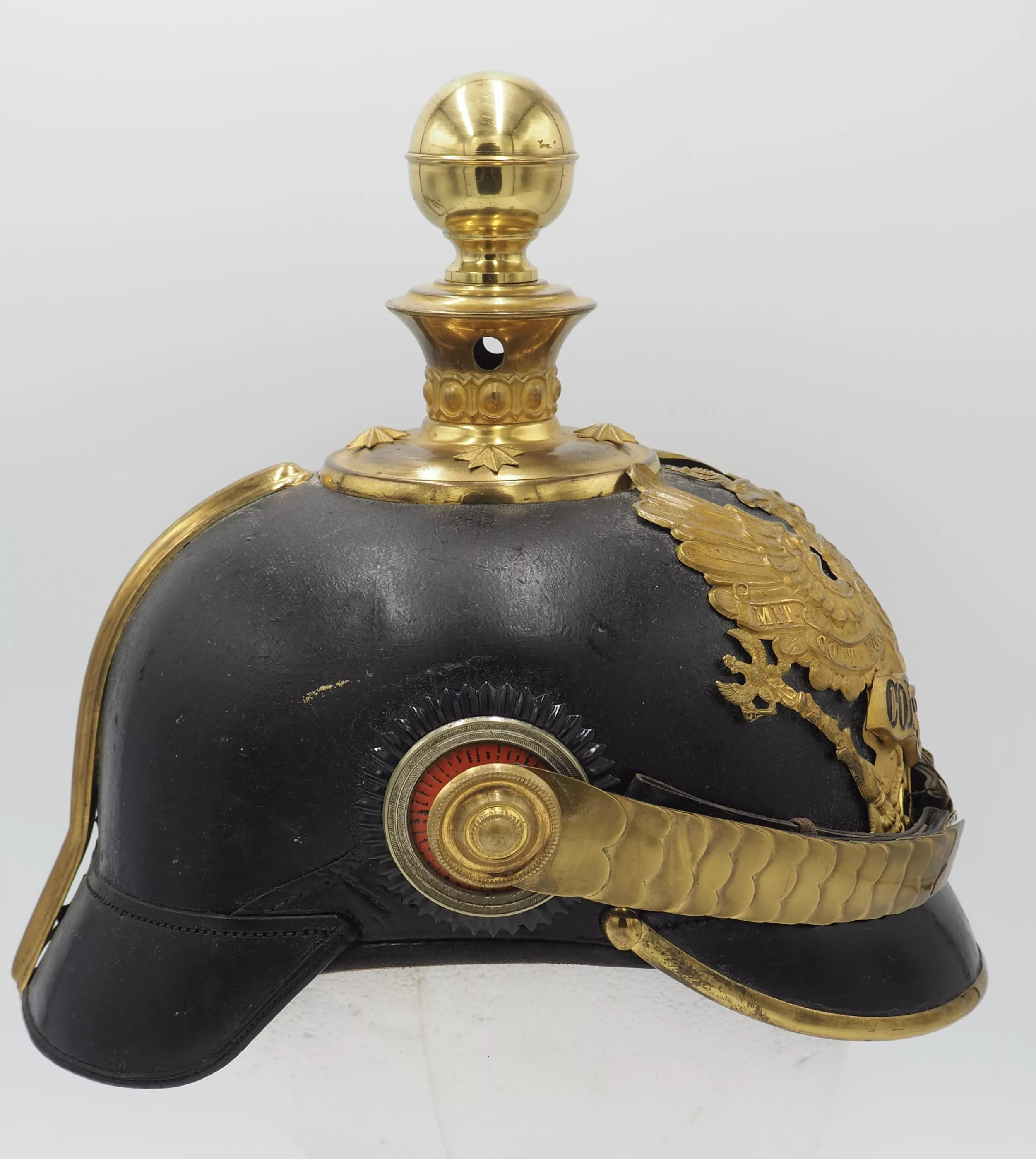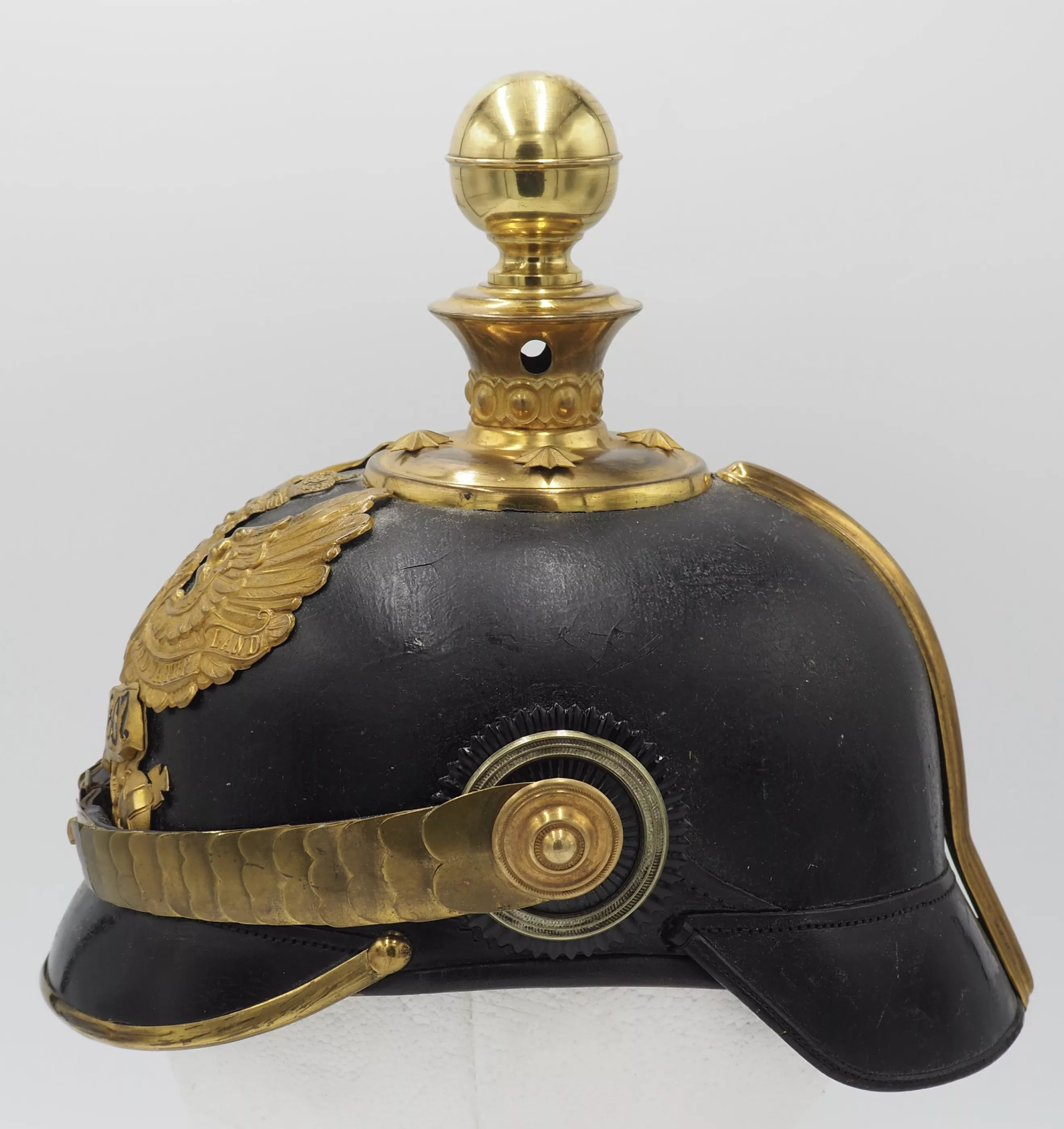 Round spike base with star retainers. Artillery ball finial that is removable. Rounded chinscales on rosettes. Officer Reichs and Prussian cockades. This is an EXTREMELY rare helmet. Wonderful and 100% original piece. Amazing condition. Price discounted due to damage to frontplate.